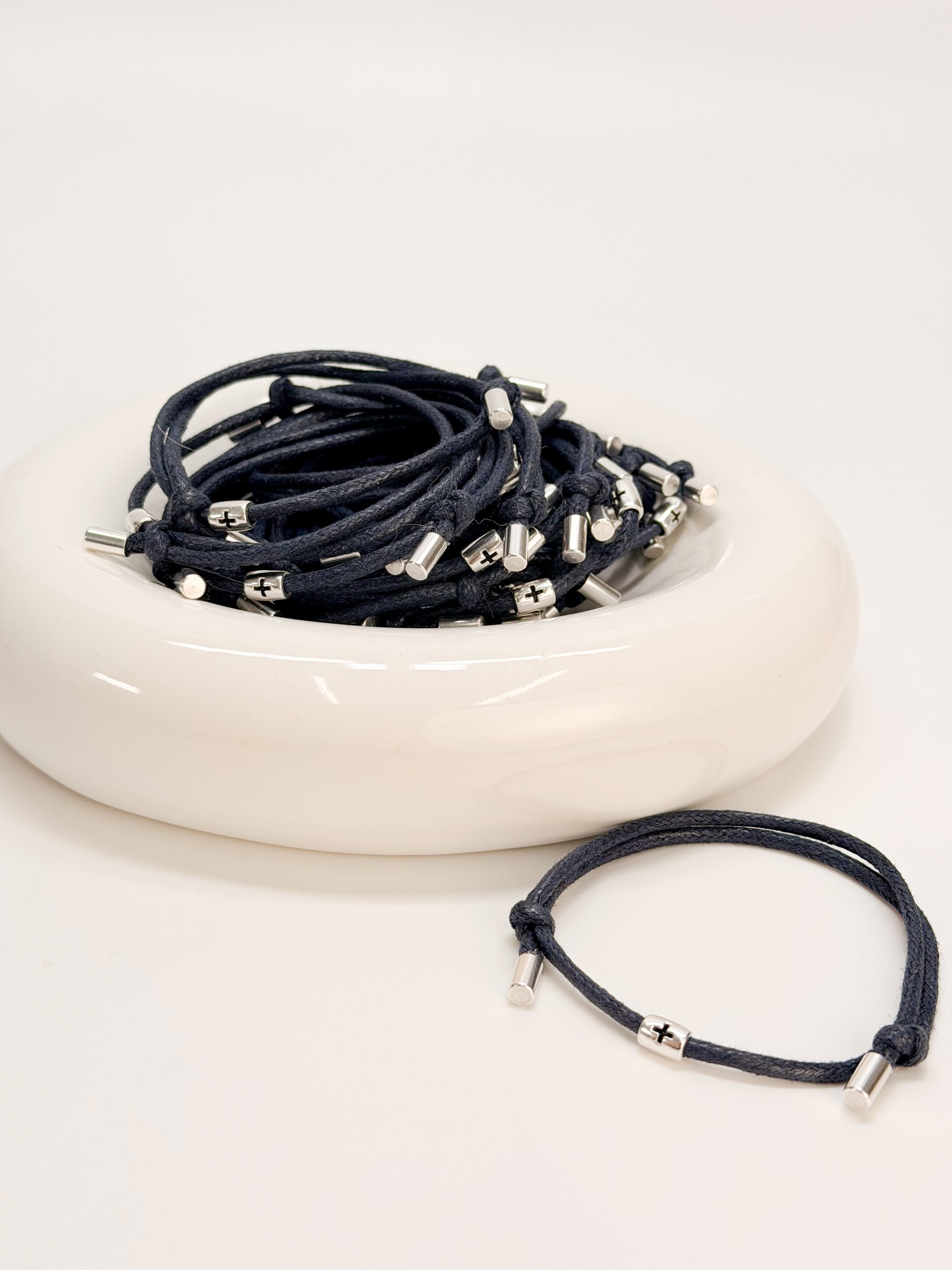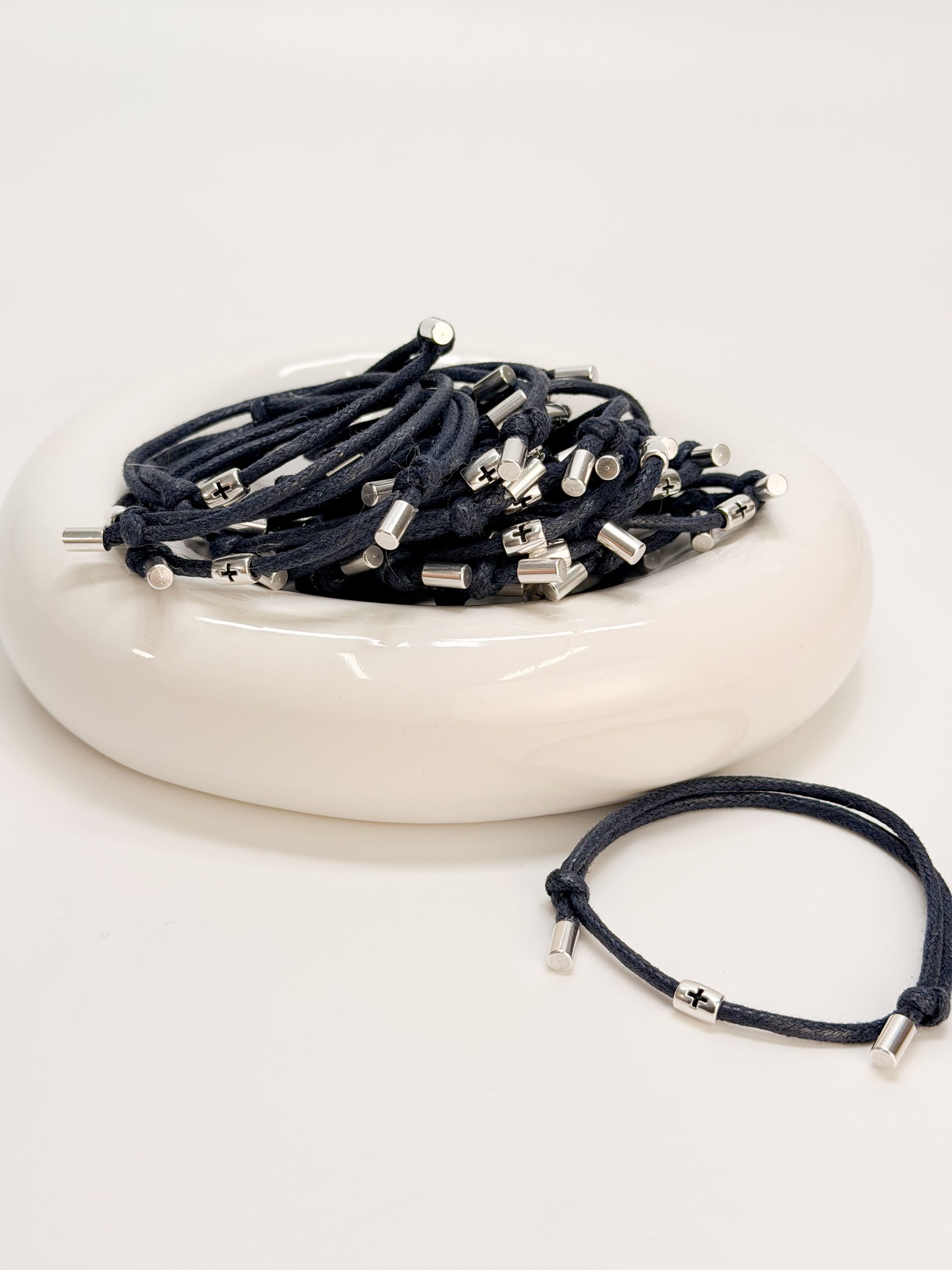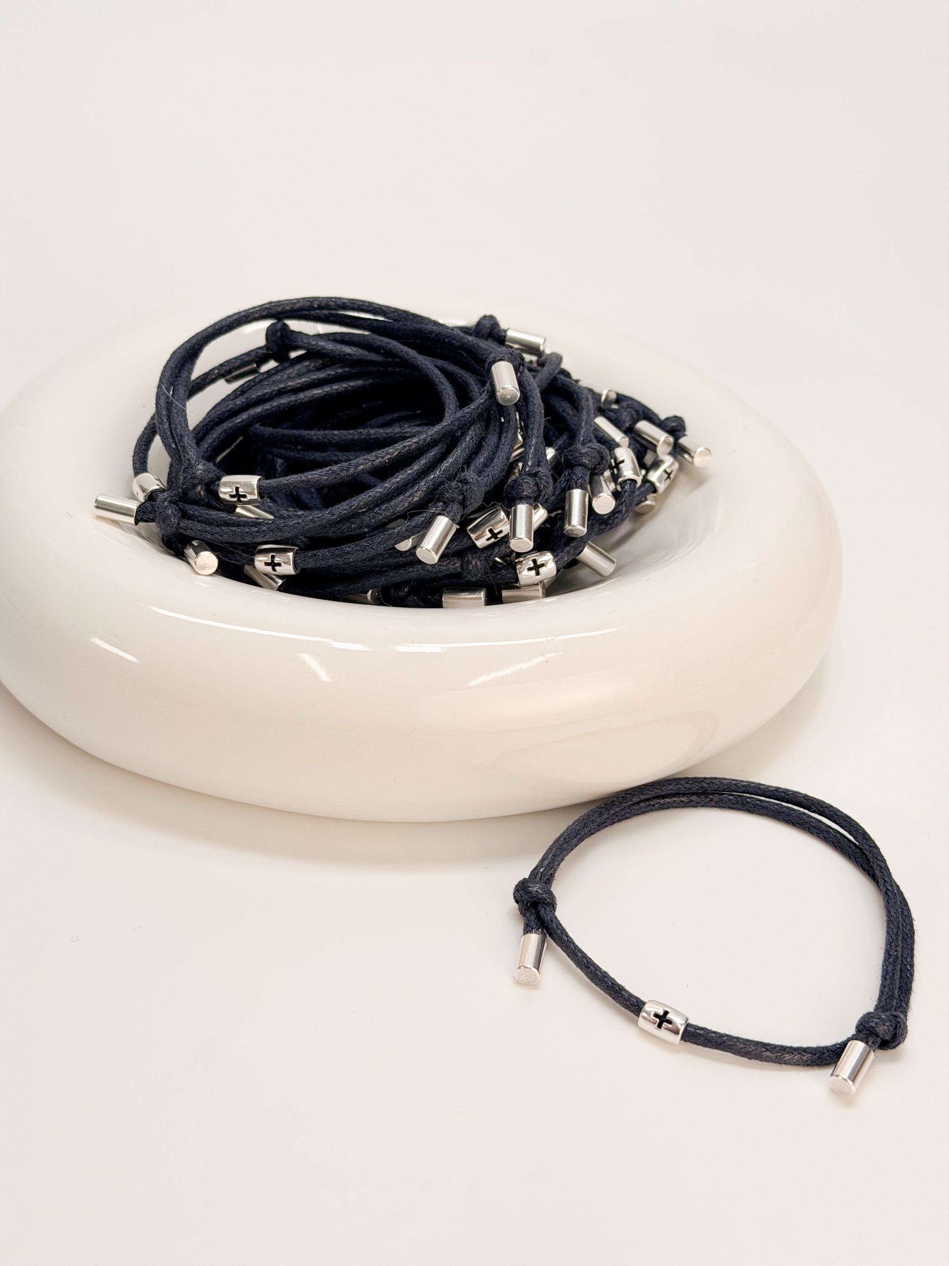 Μαρτυρικό βραχιόλι με μπλε κορδόνι,σταυρό και τάπες σε ασημι απόχρωση.