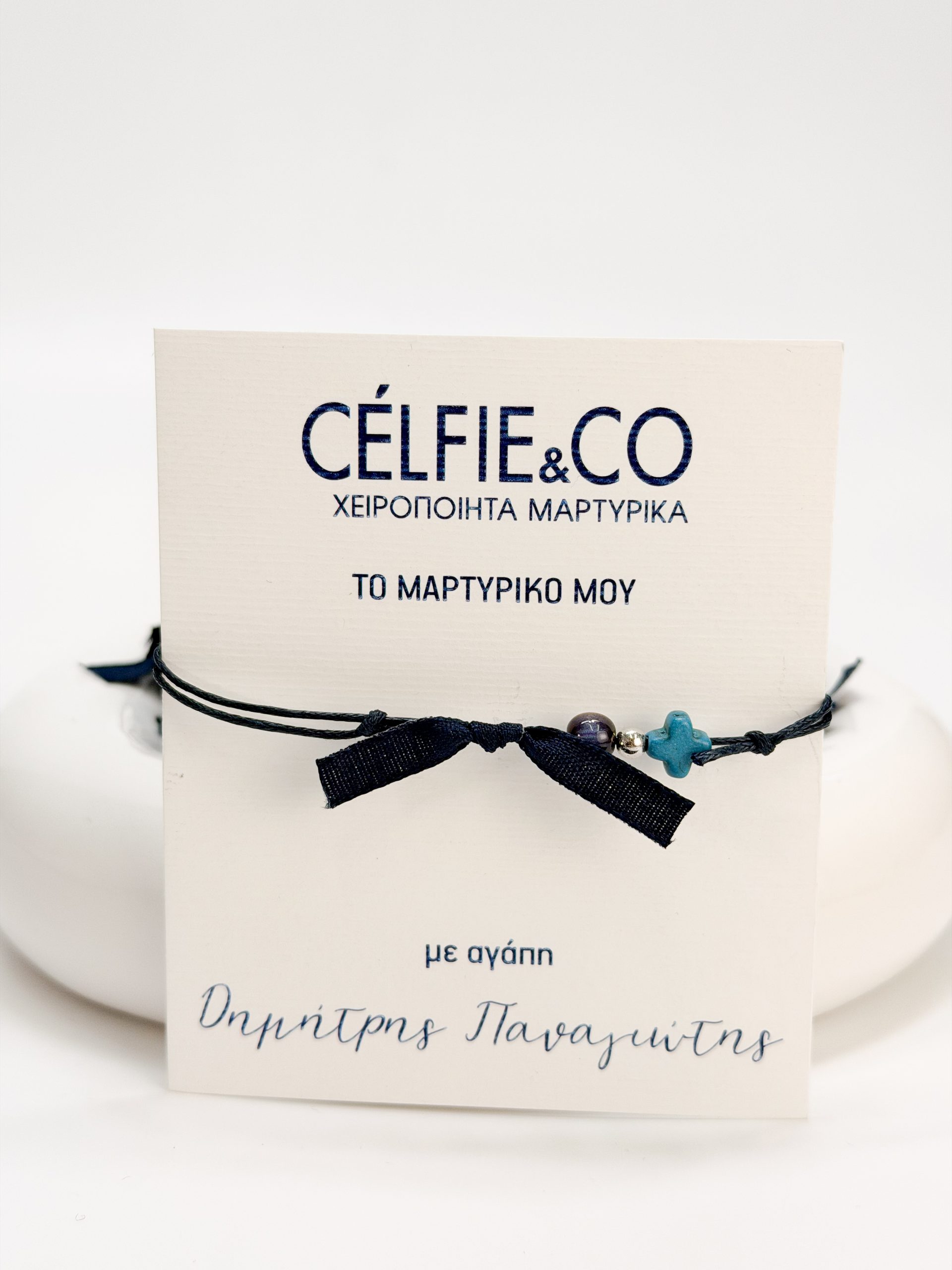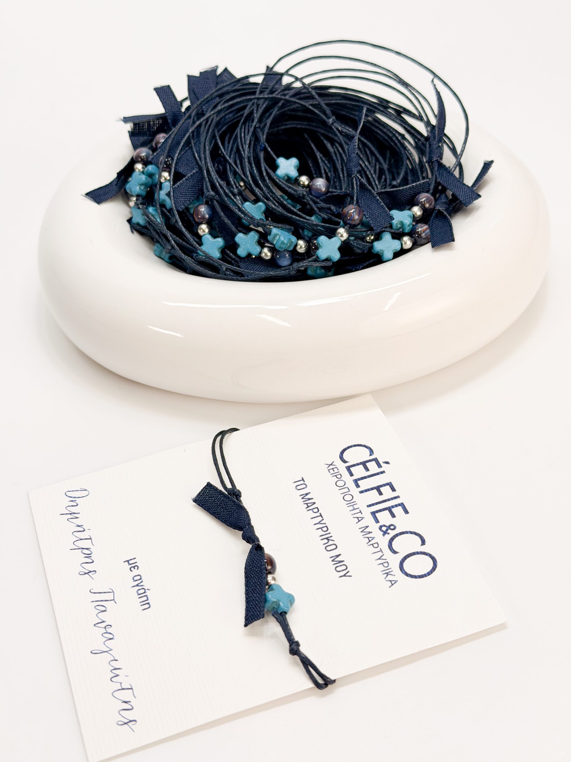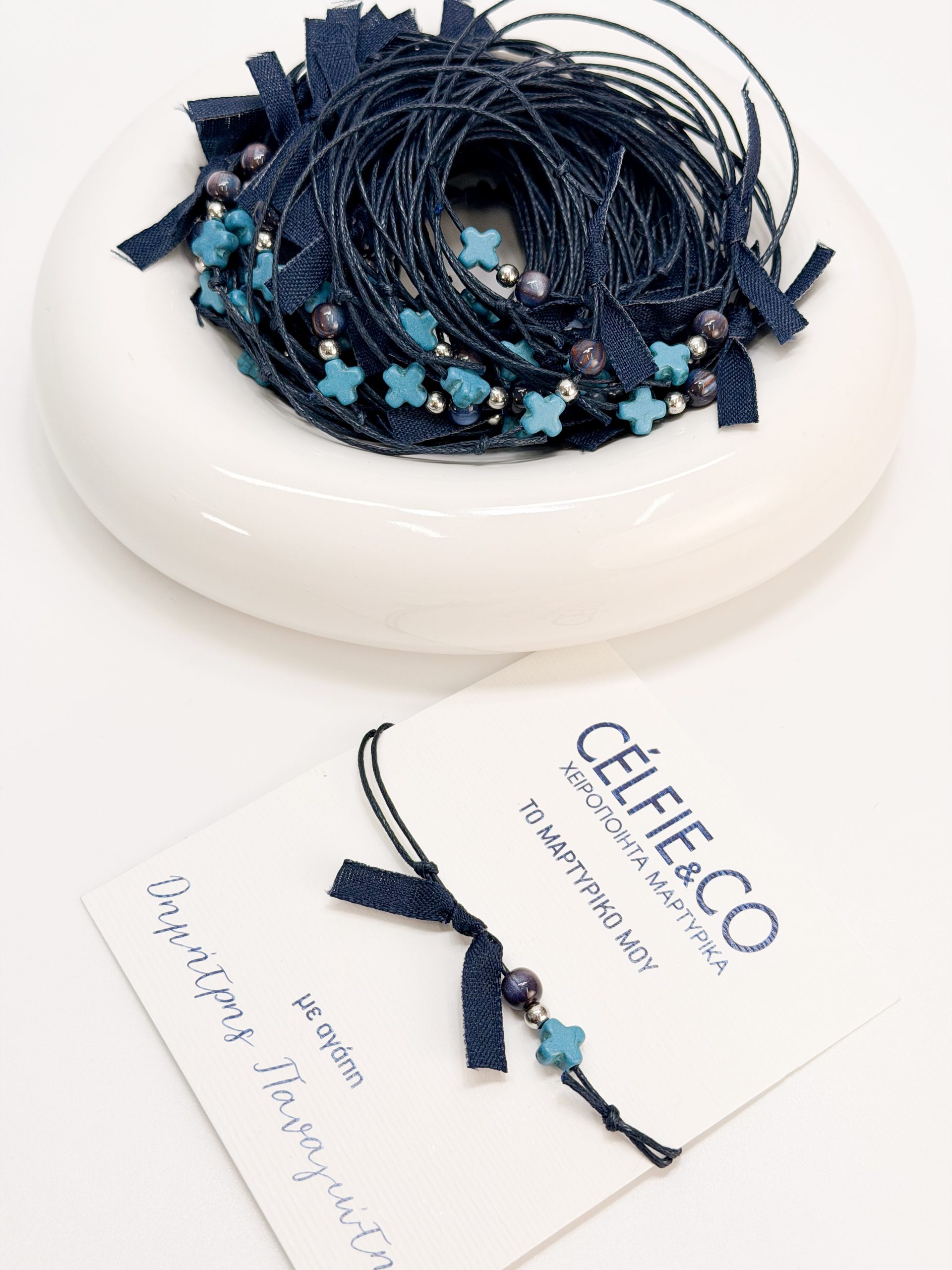 Μαρτυρικό βραχιόλι,με μπλε κορδόνι και φιογκάκι,χαολίτη σταυρό,ασημί χάντρα και μπλε χάντρα.