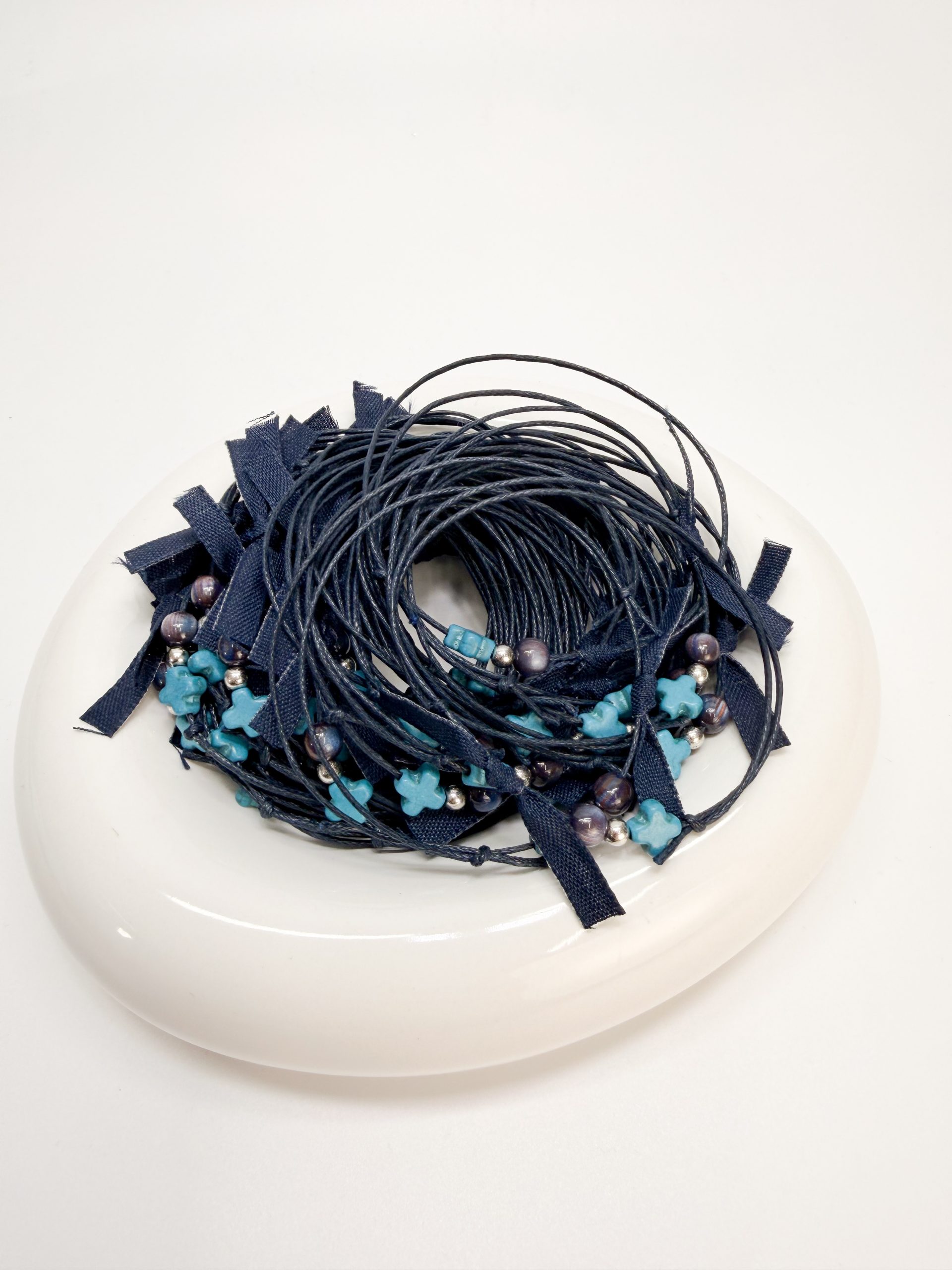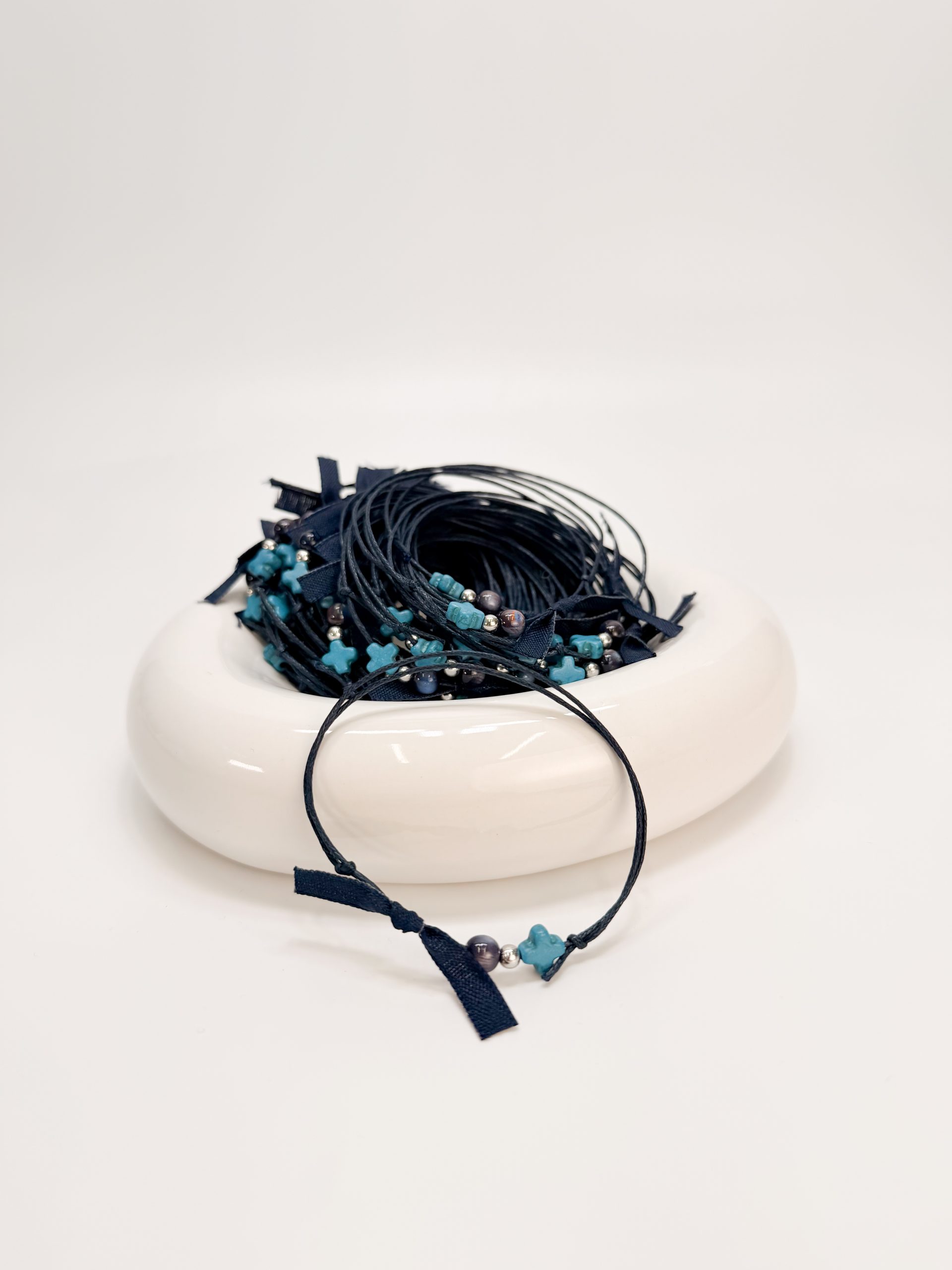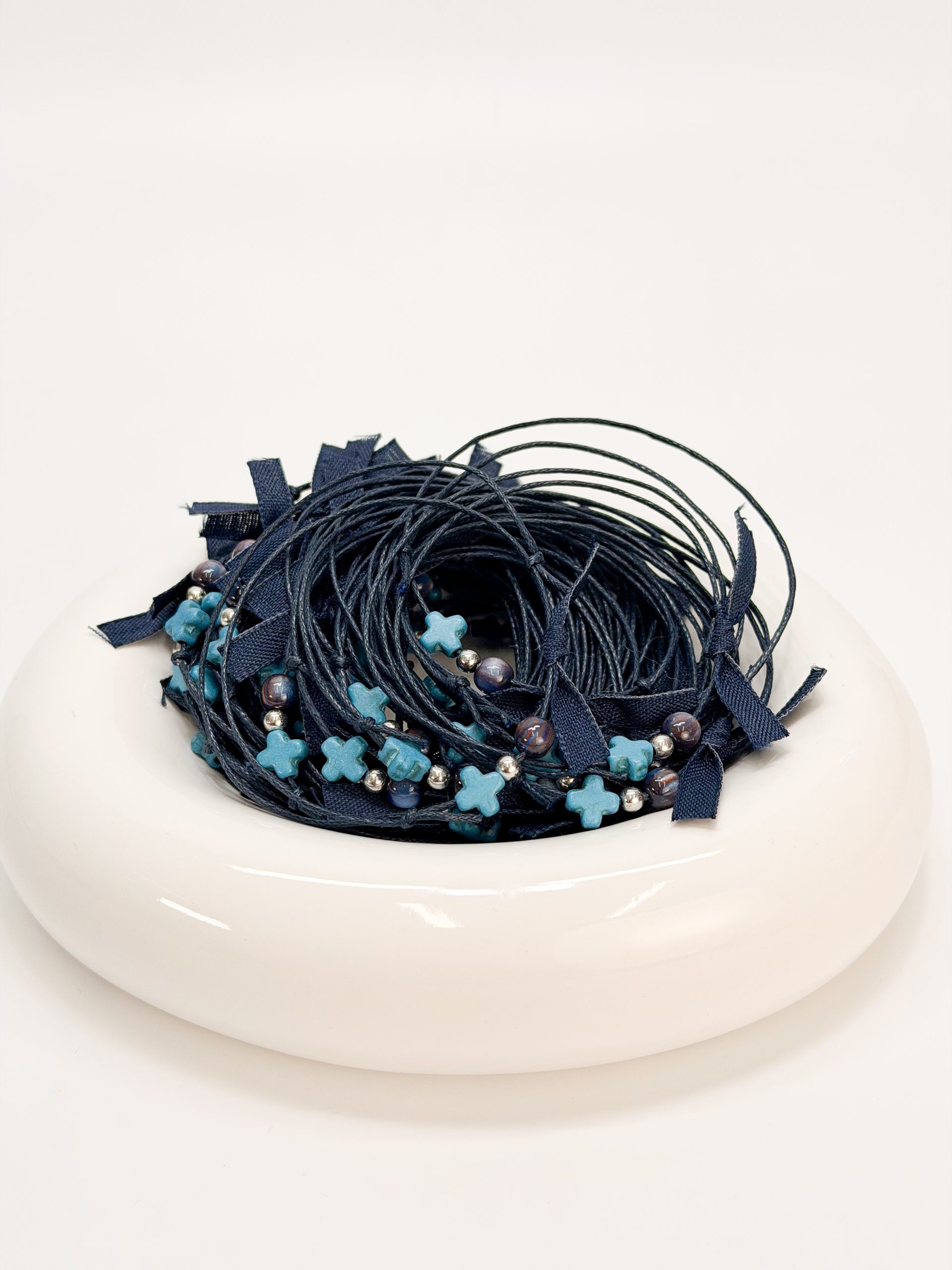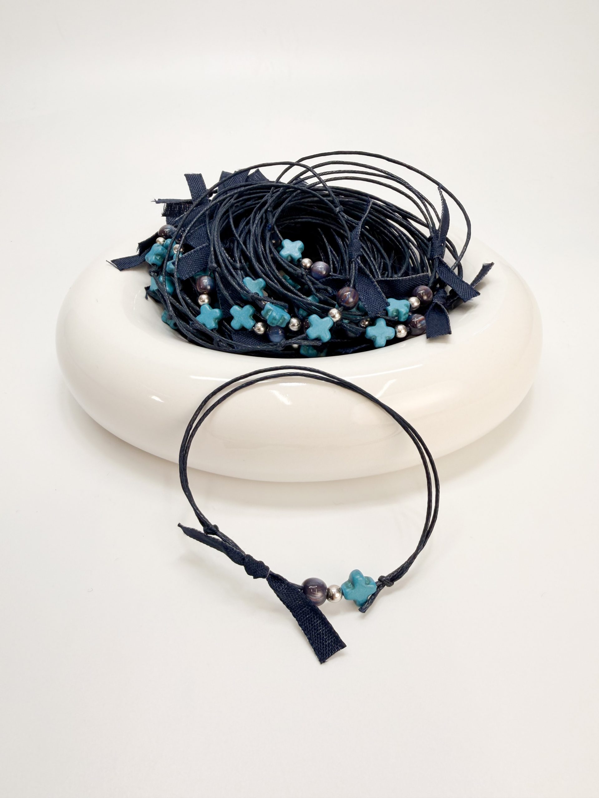 Μαρτυρικό βραχιόλι,με μπλε κορδόνι και φιογκάκι,χαολίτη σταυρό,ασημί χάντρα και μπλε χάντρα.
