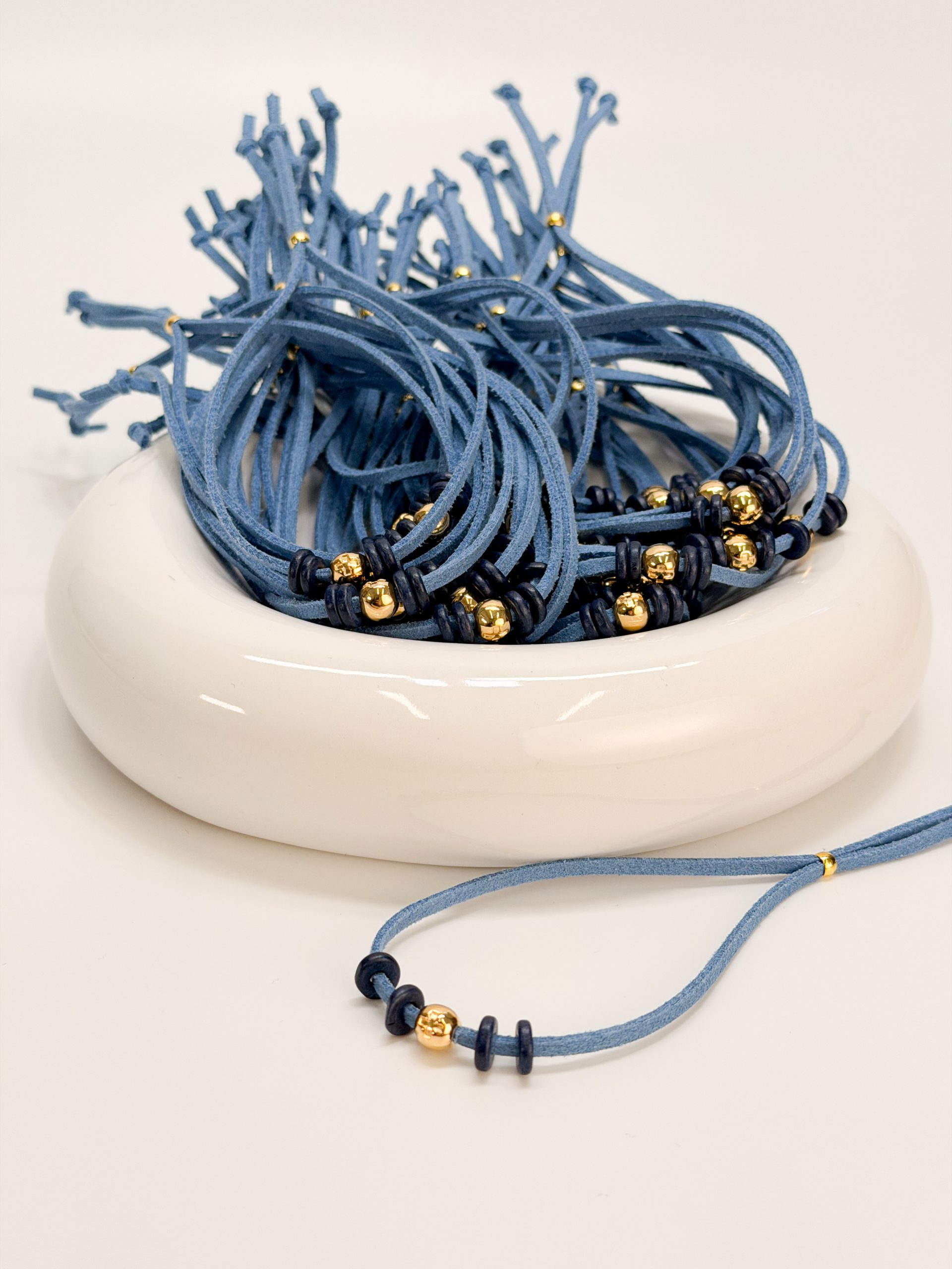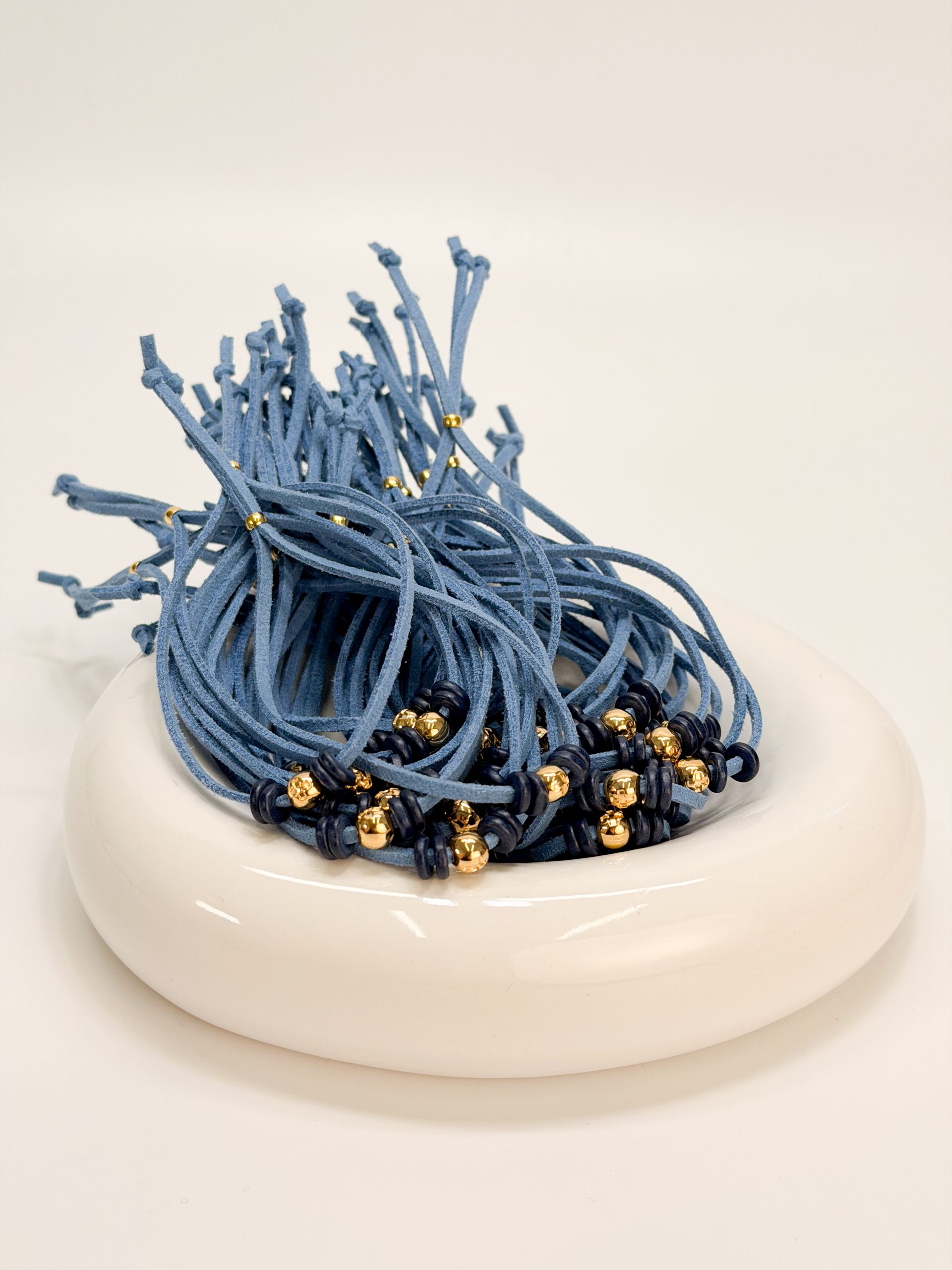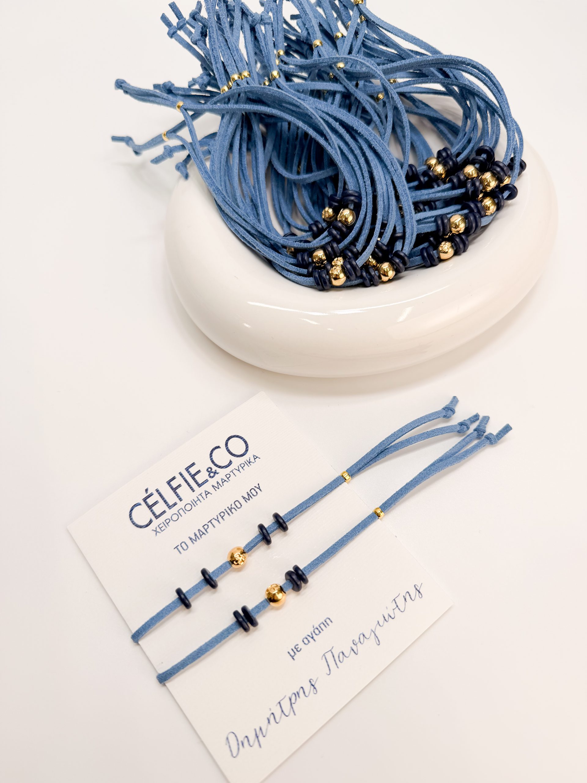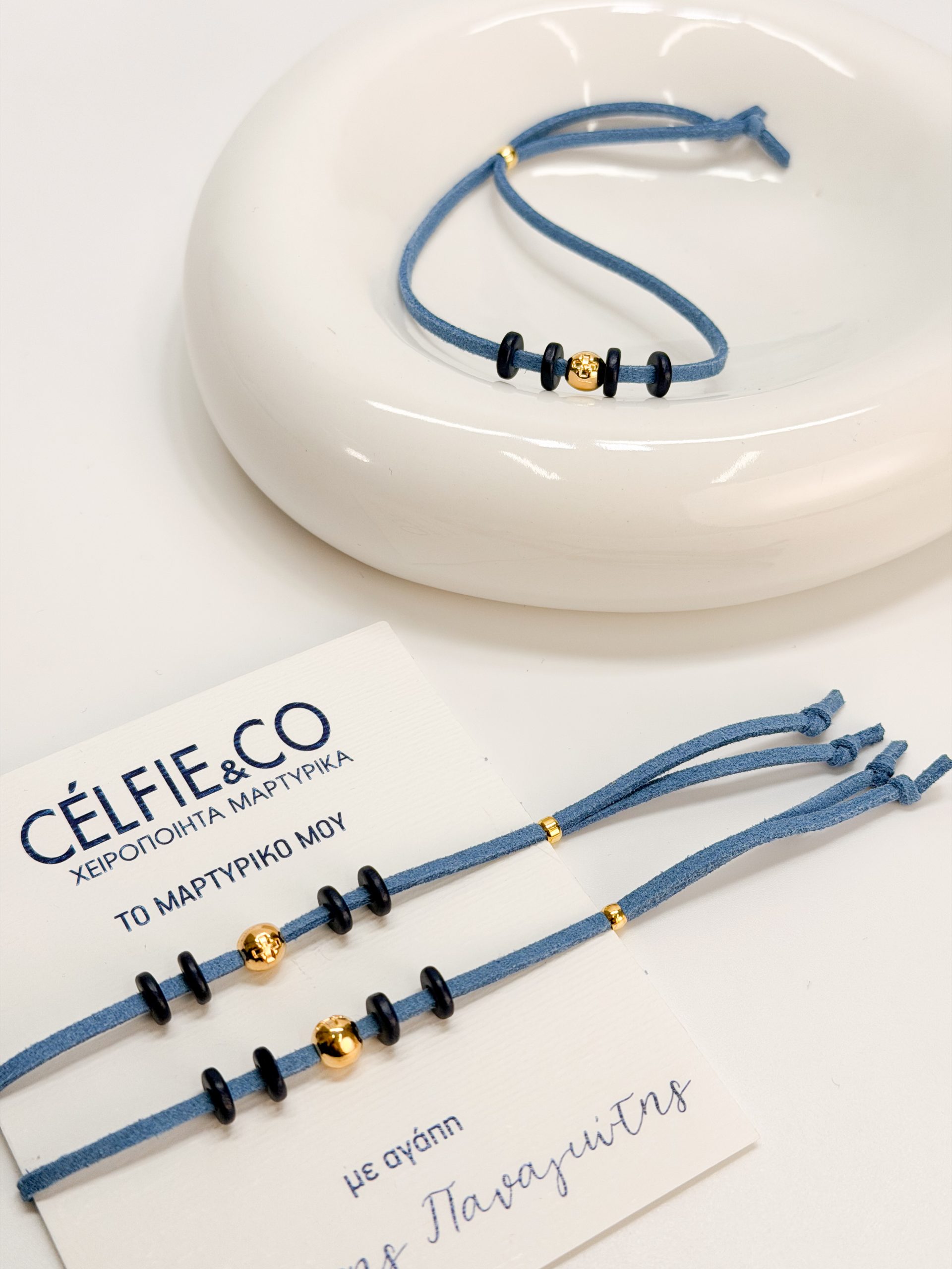 Μαρτυρικό βραχιόλι με μπλε ραφ σουετ κορδόνι,επιχρυσωμένο σταυρό και κεραμικές ροδέλες.