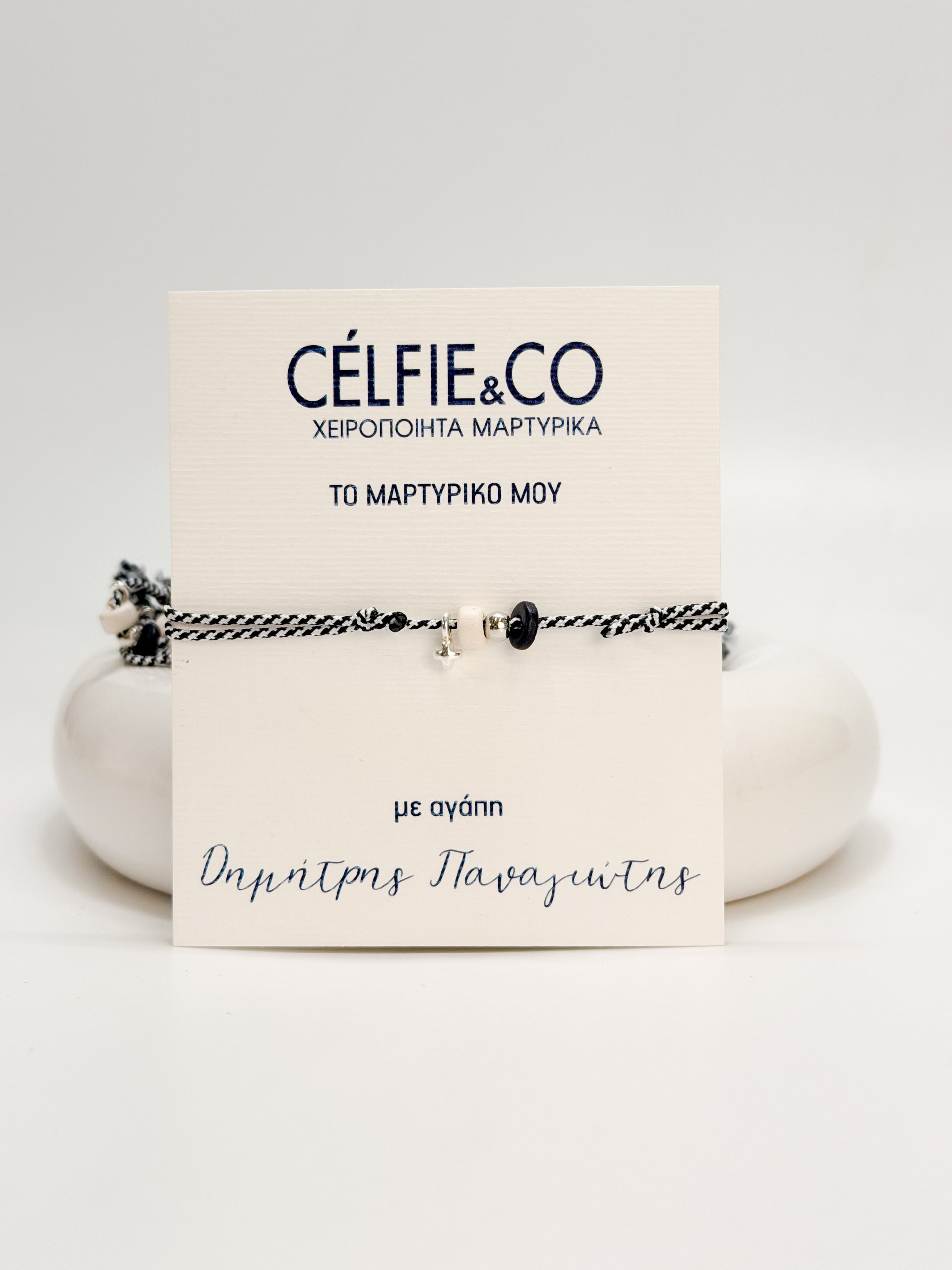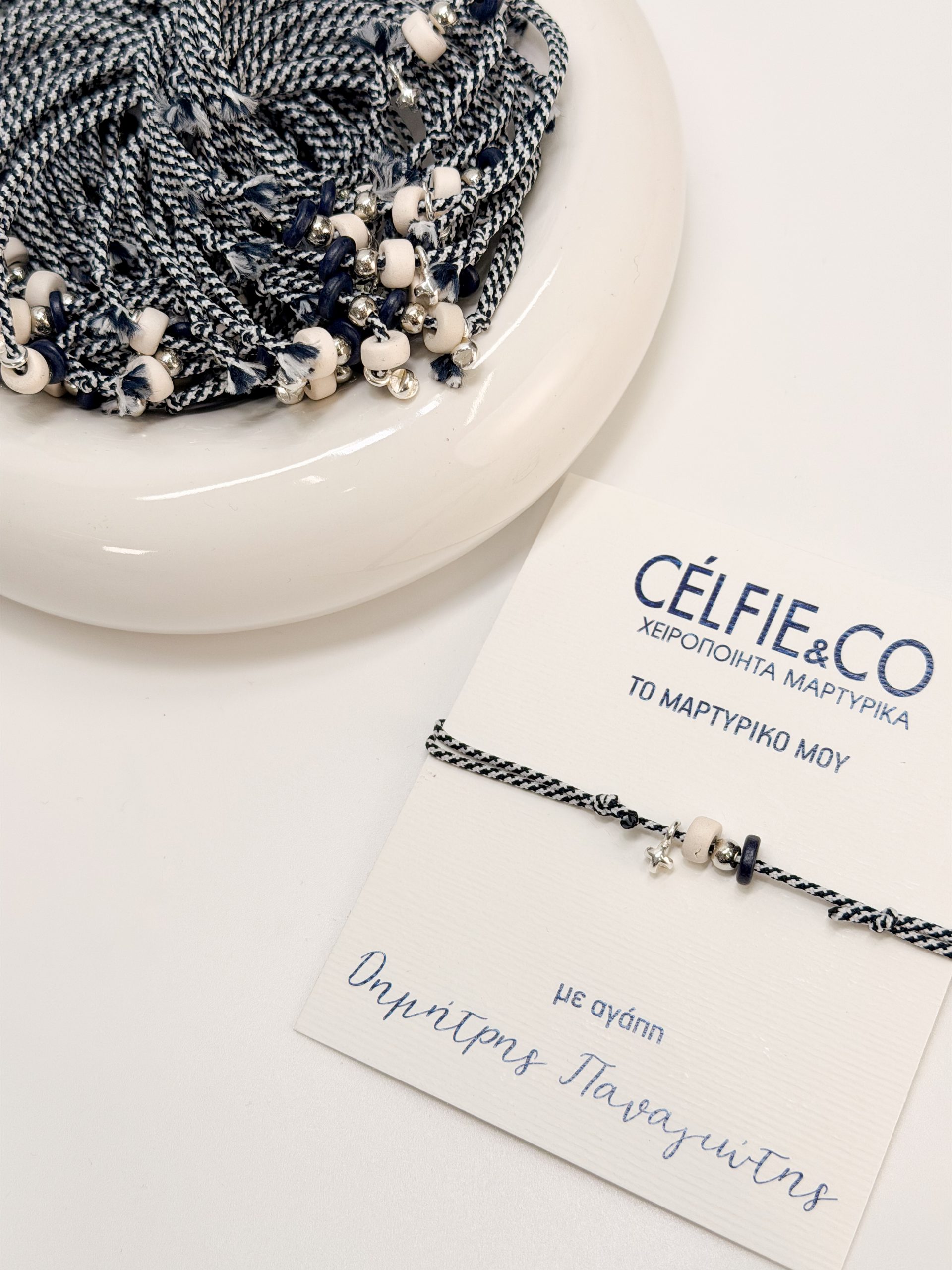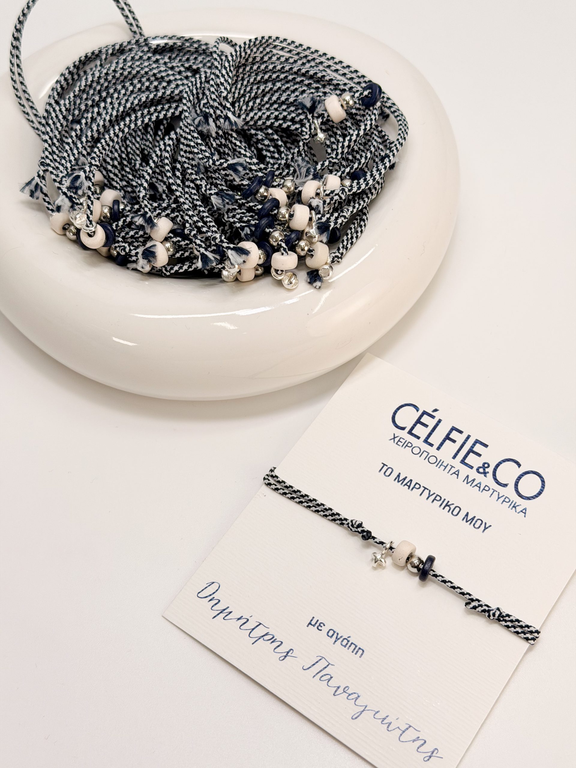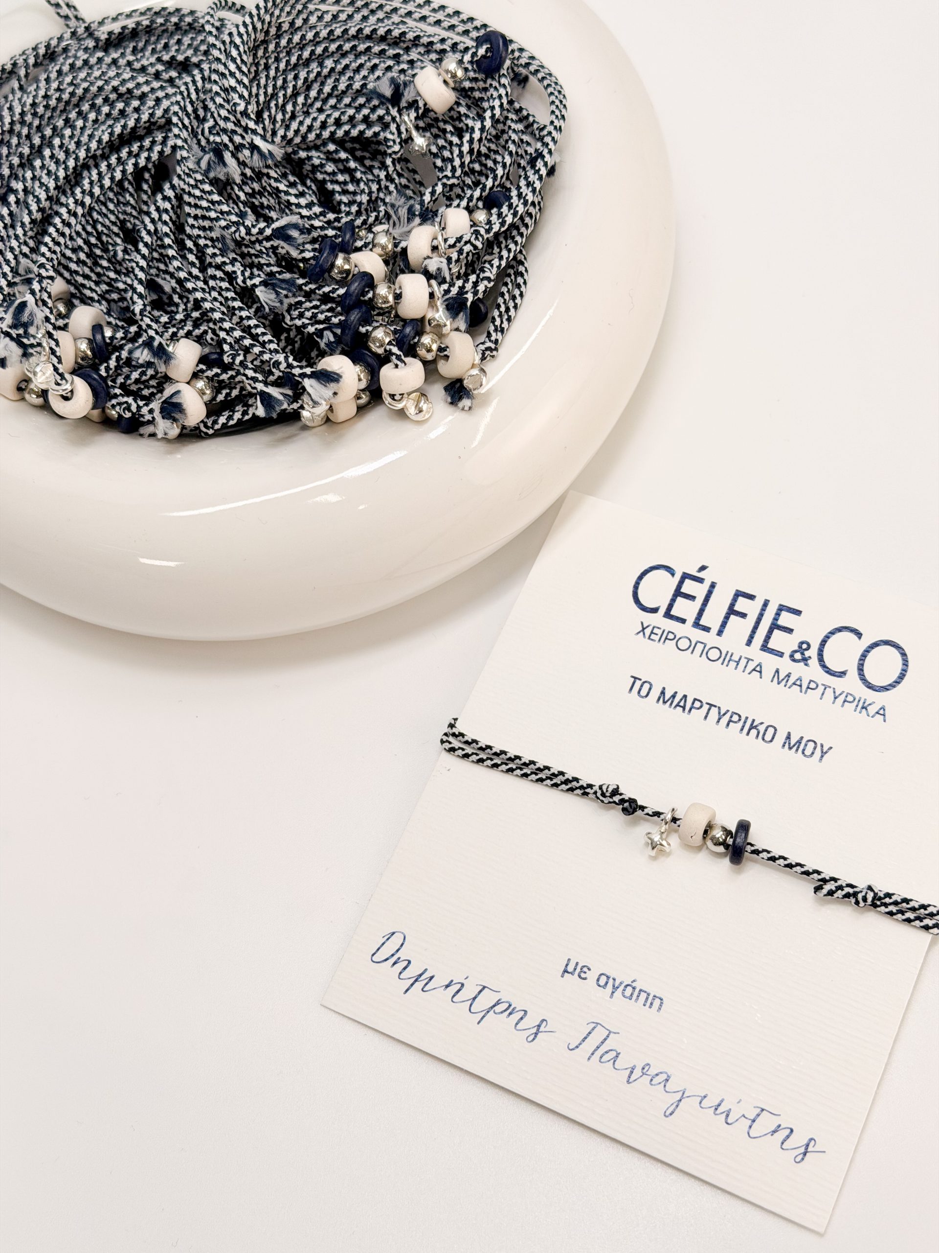 Μαρτυρικό βραχιόλι με δίχρωμο κορδόνι μπλε σκούρο και άσπρο,κεραμικές χάντρες,σταυρό και χάντρα σε ασημί απόχρωση.