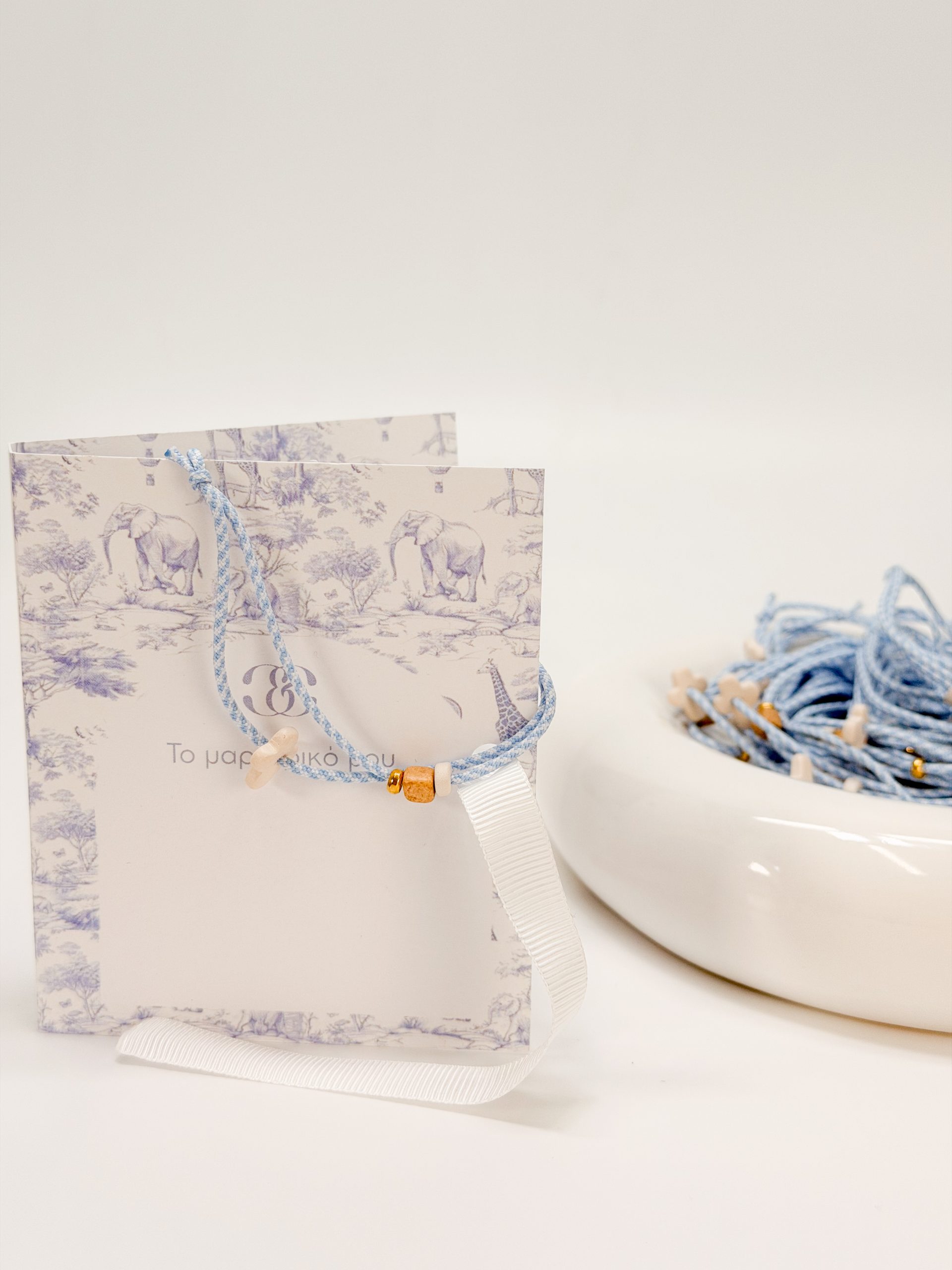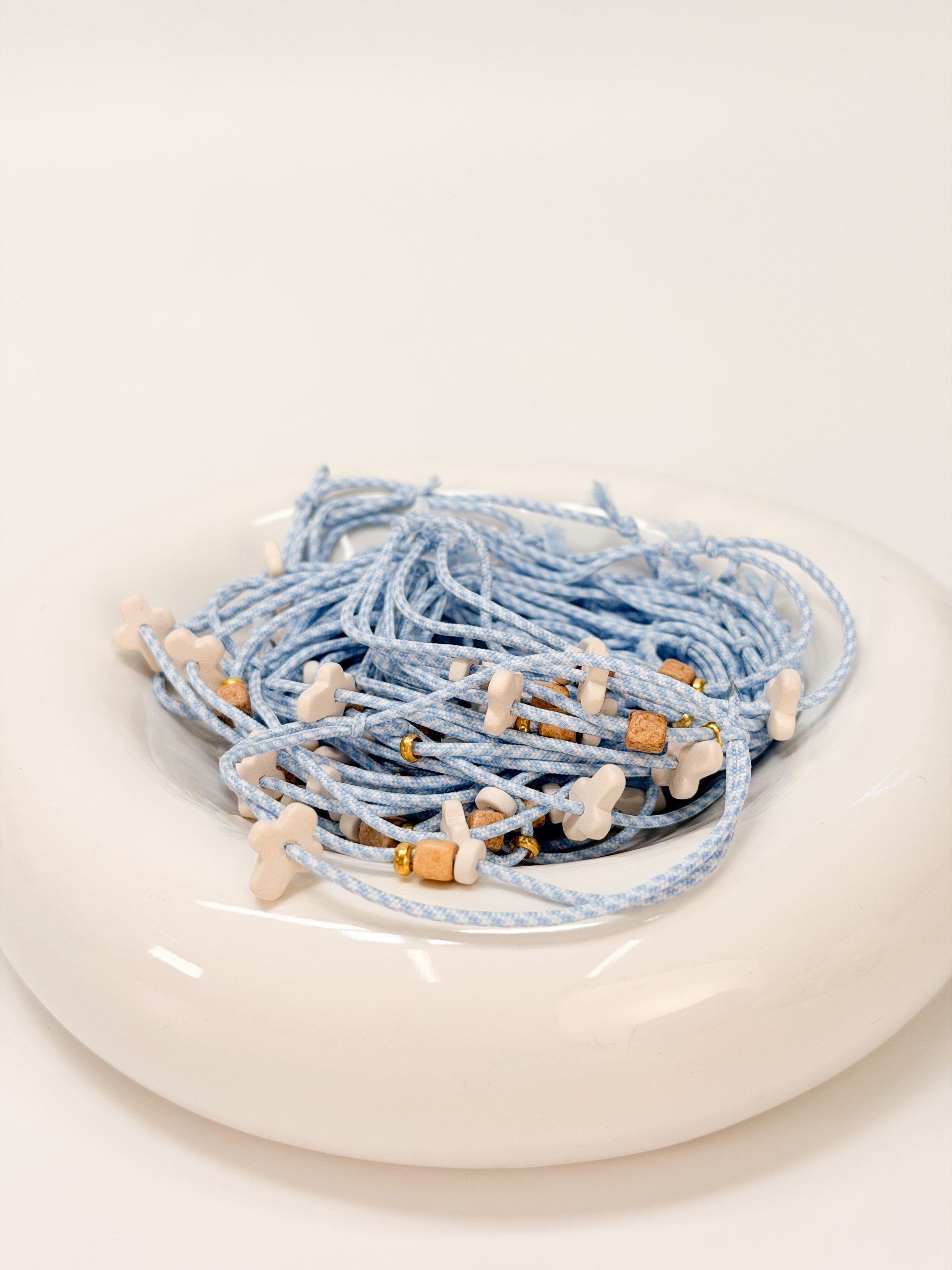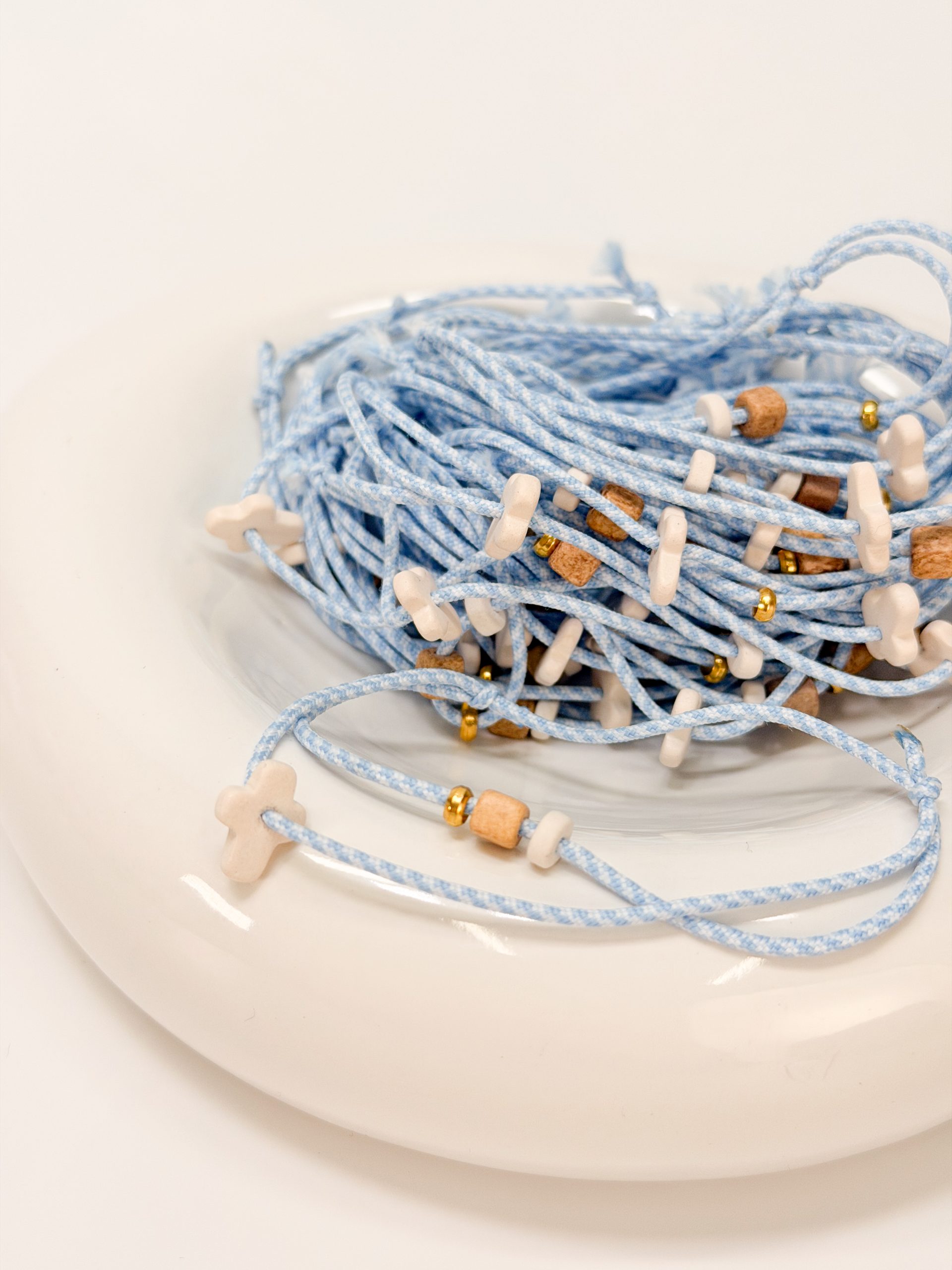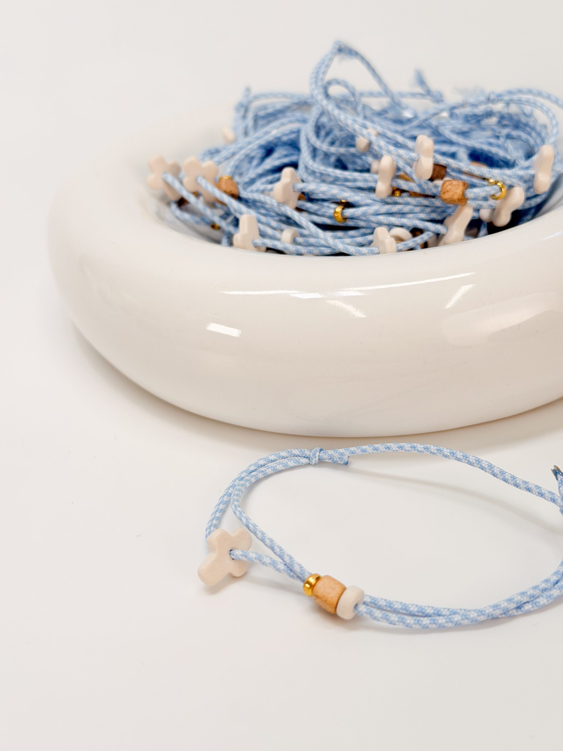 Μαρτυρικό βραχιόλι με δίχρωμο κορδόνι σε απόχρωση λευκό-γαλάζιο,μπεζ κεραμικό κυβάκια,λευκή ροδέλα και κεραμικό σταυρό.