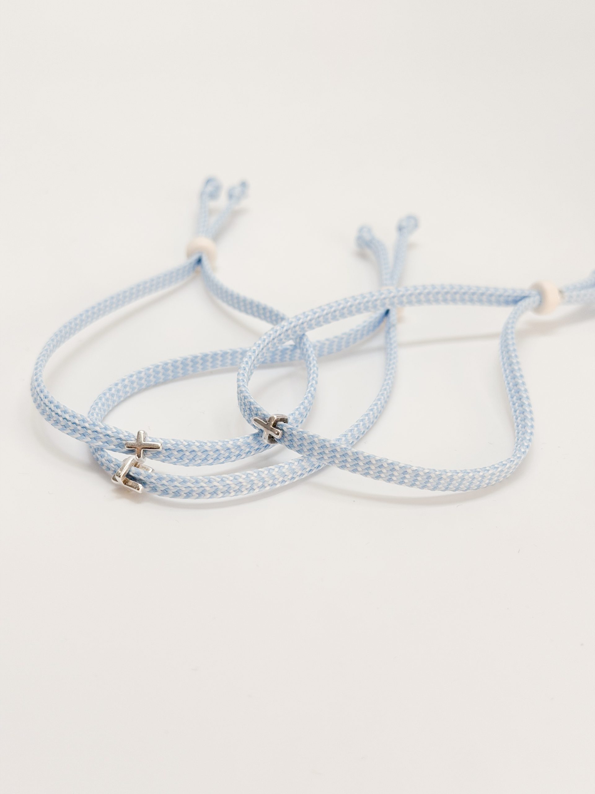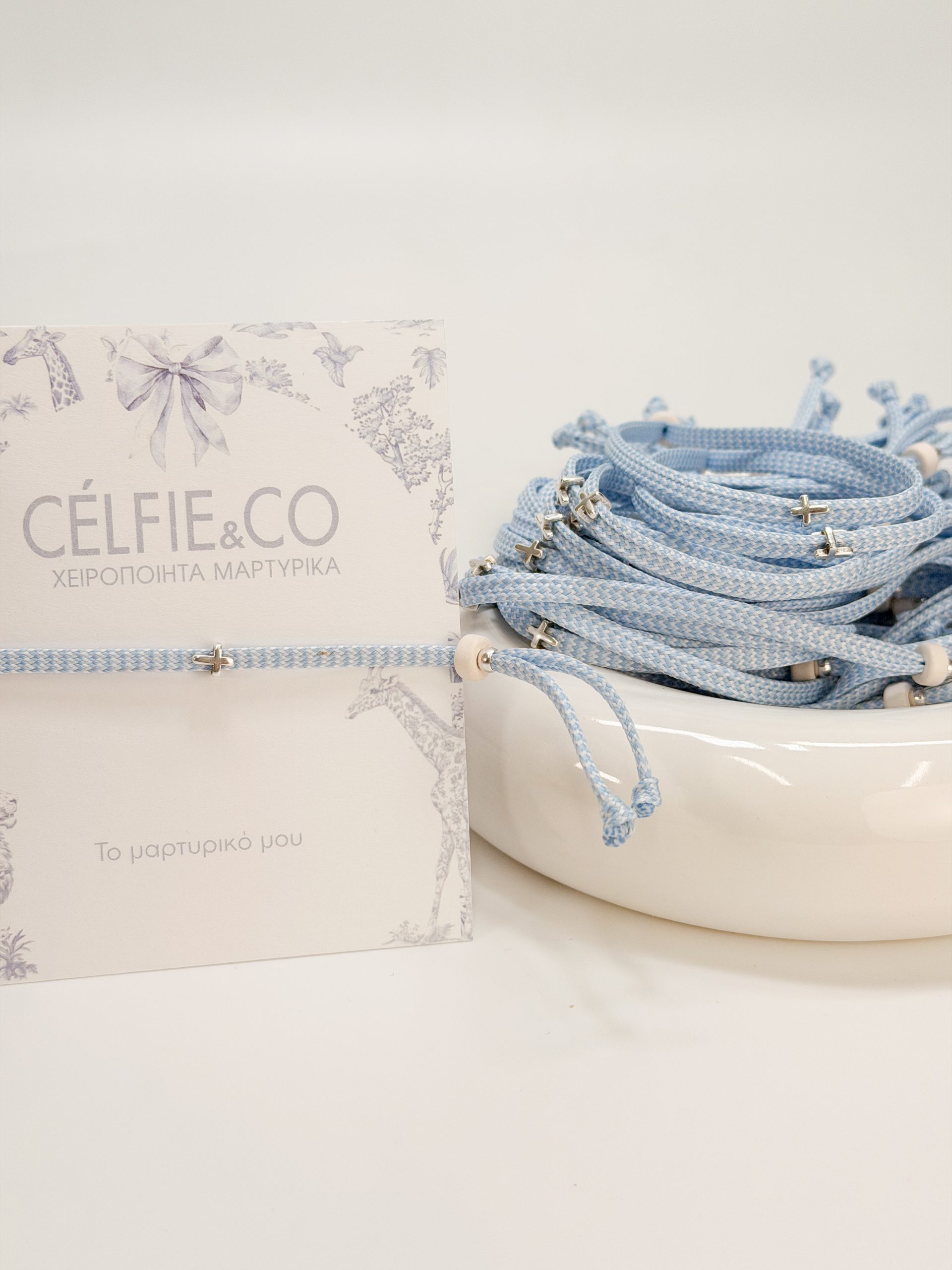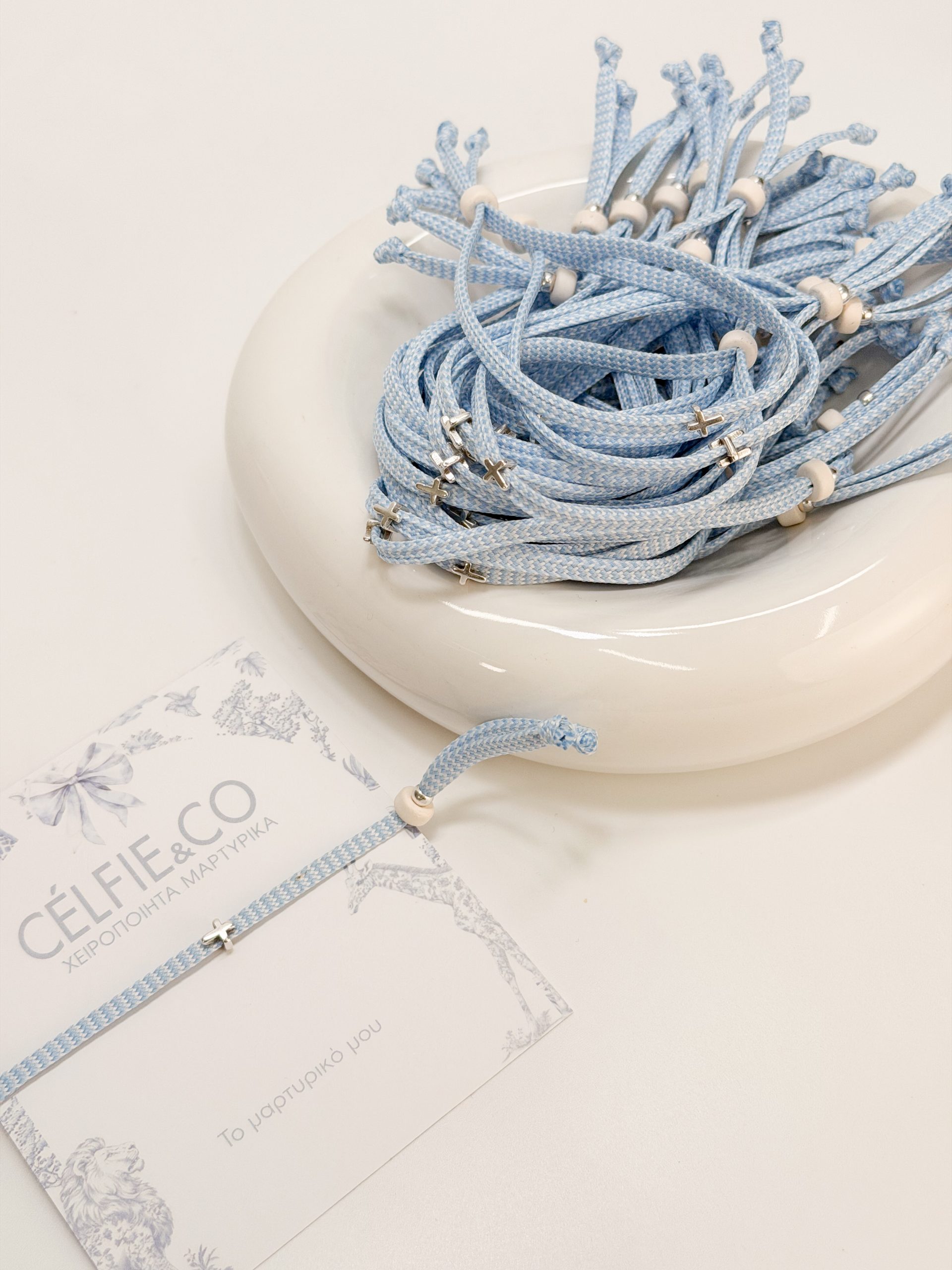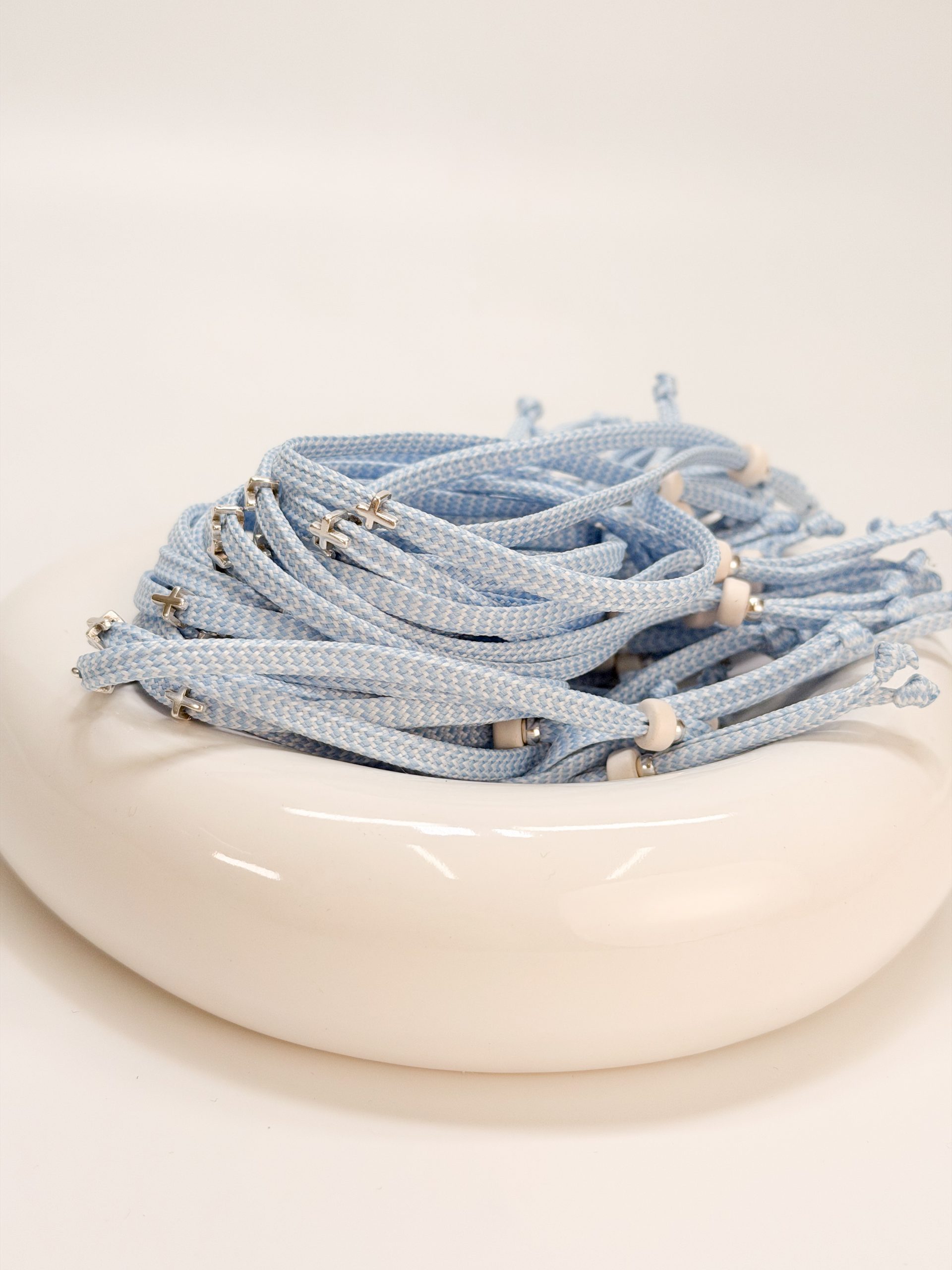 Μαρτυρικό βραχιόλι με δίχρωμο γαλάζιο,άσπρο κορδόνι παπουτσιού,λευκή κεραμική ροδέλα,σταυρό και χάντρα σε ασημί απόχρωση.
