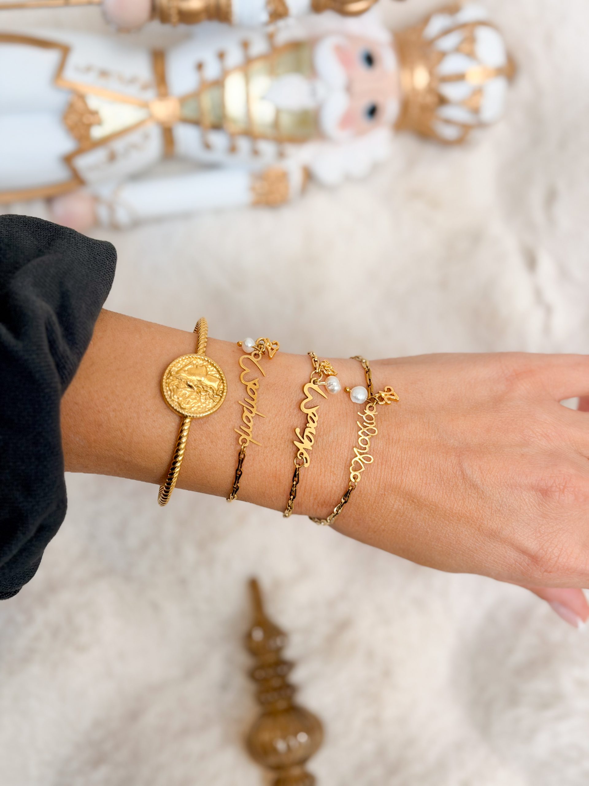Βραχιολάκι με ατσάλινη επιγραφή μαμά, νονά,γιαγιά με μαργαριτάρι.