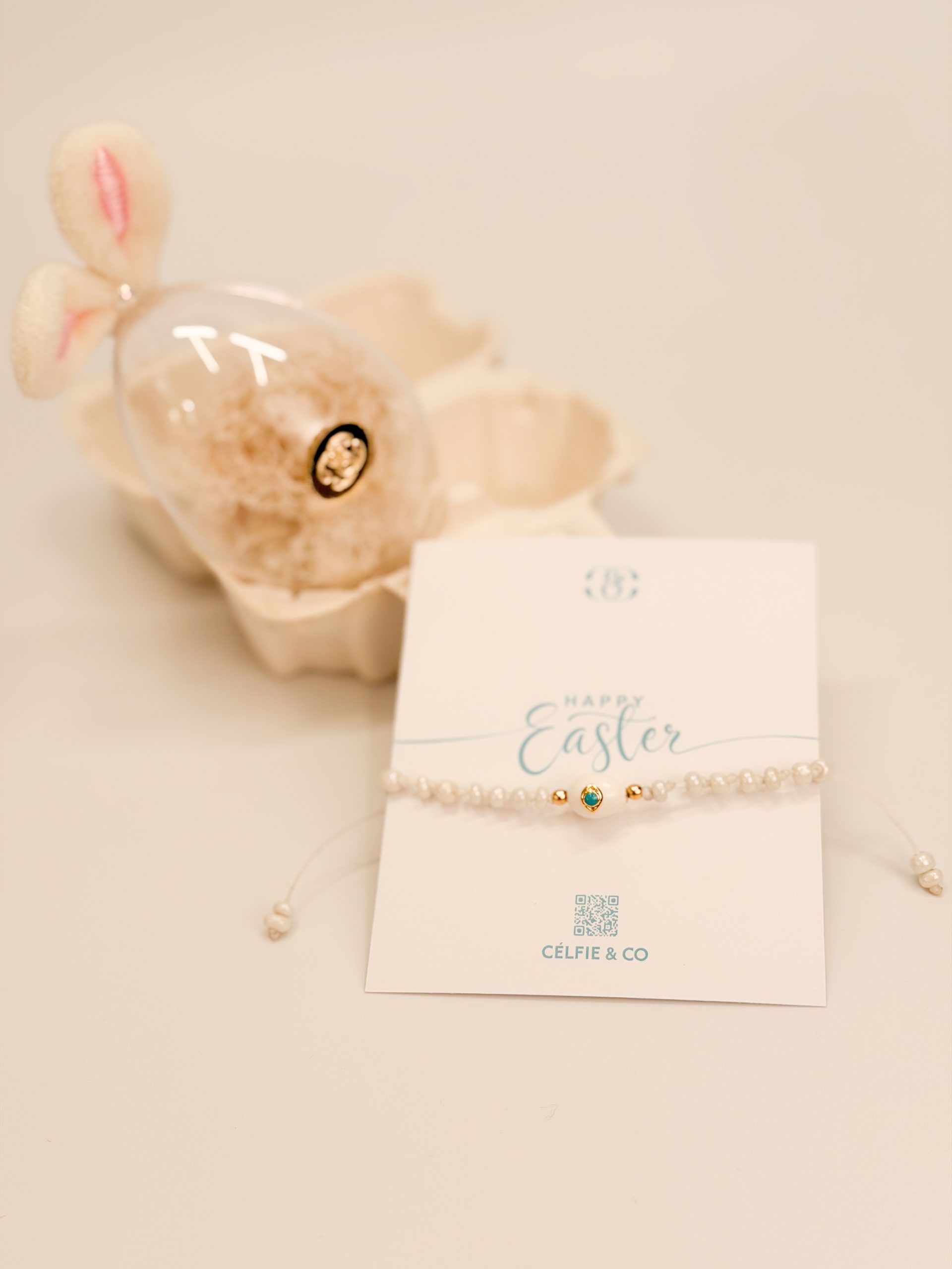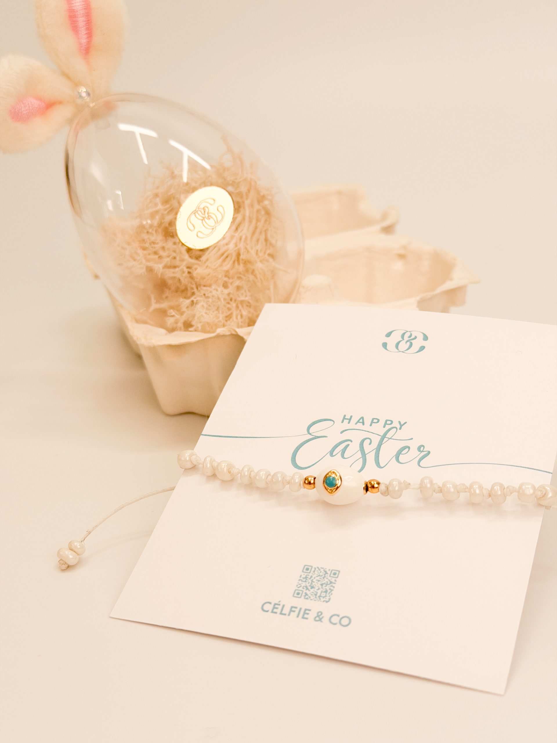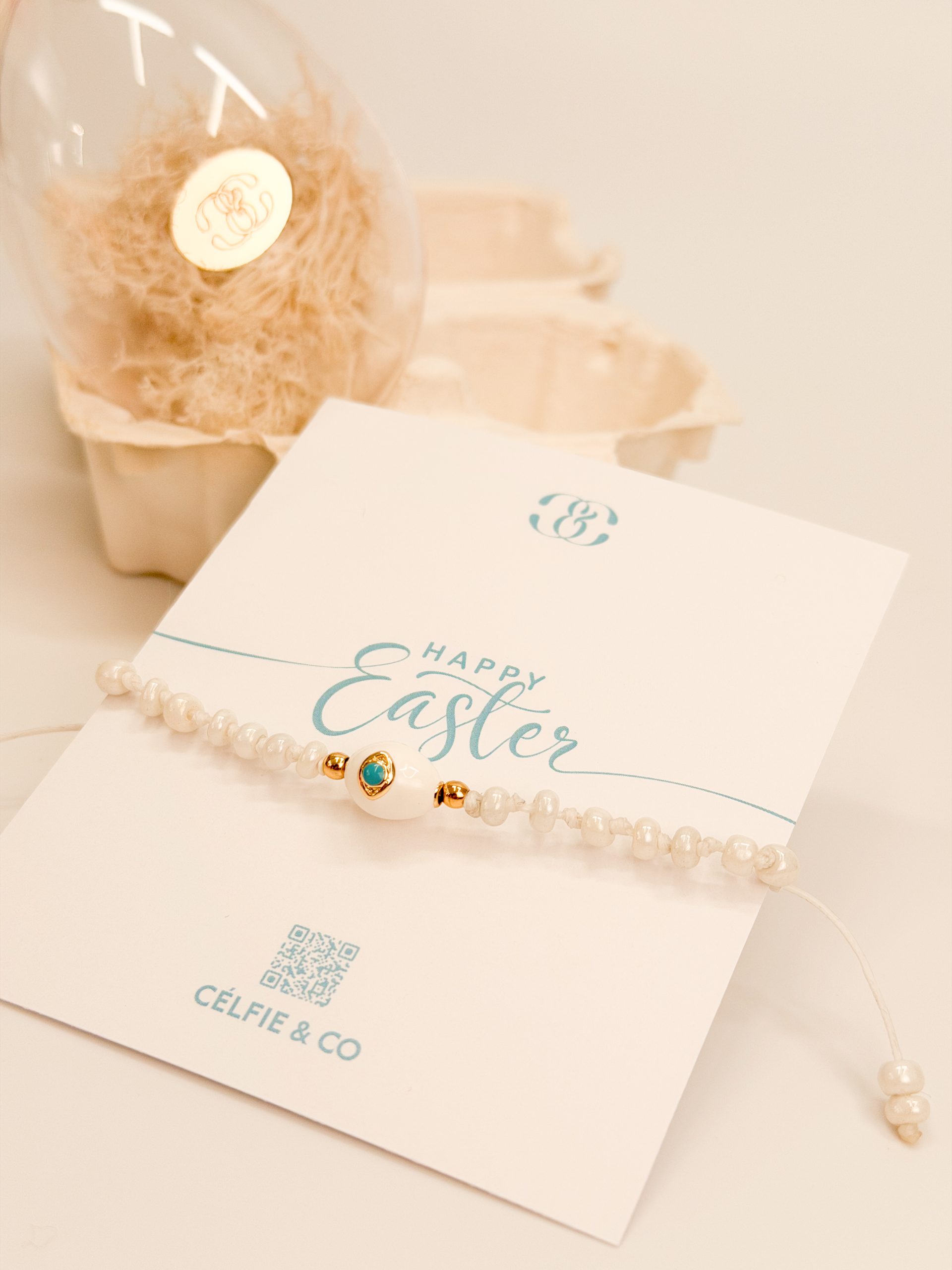 Βραχιολάκι με μπρούτζινο μοτιφ αυγού κι λευκές χάντρες.