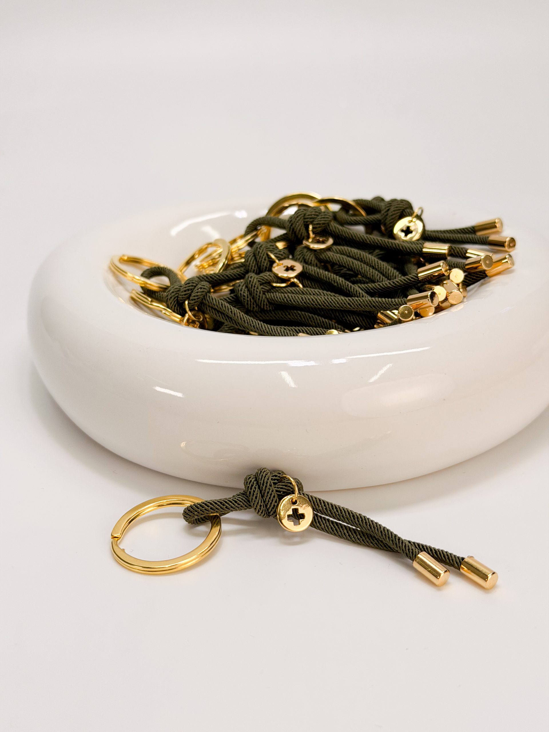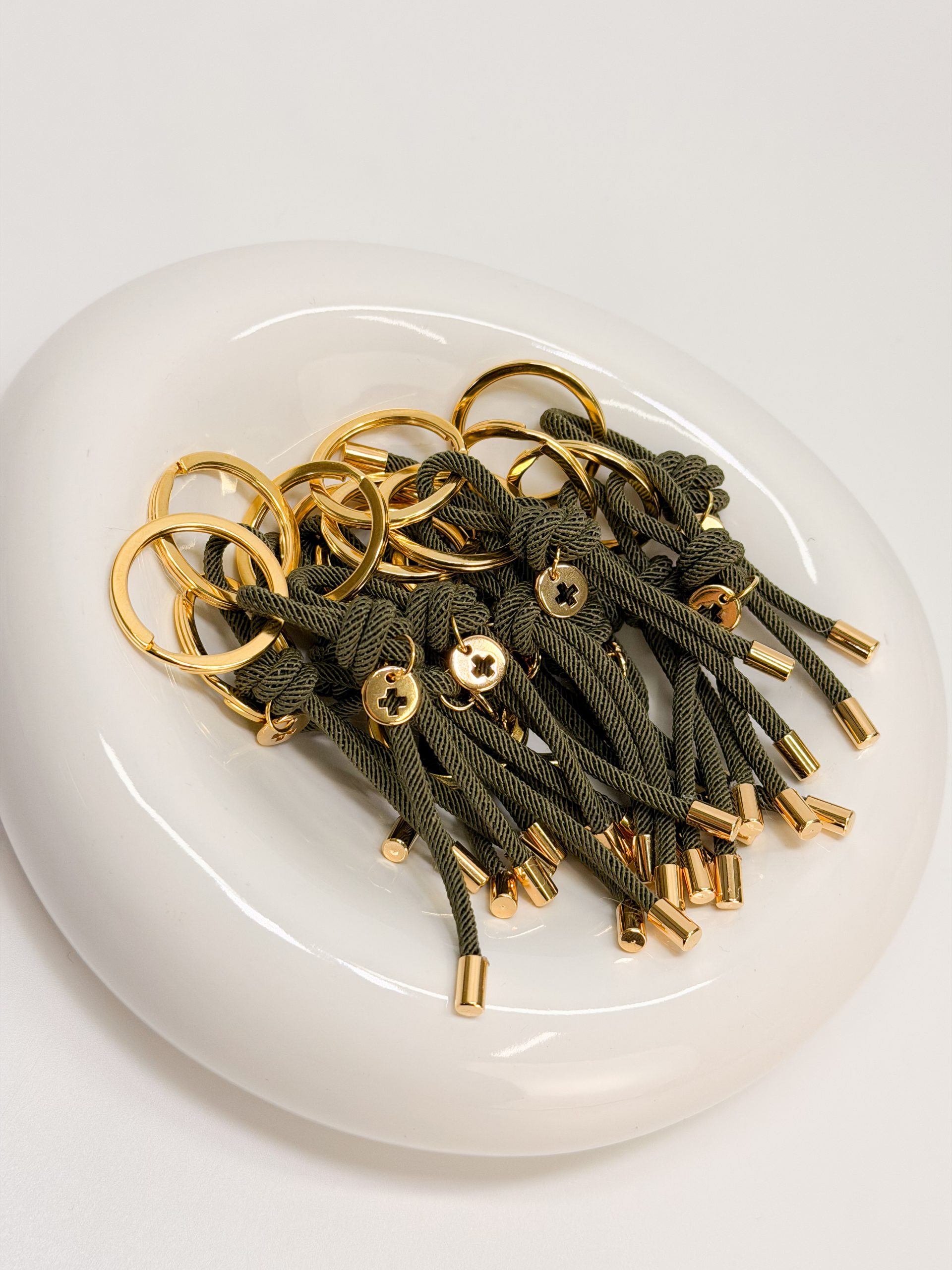Μαρτυρικό μπρελοκ με χακί κορδόνι,επιχρυσωμένο σταυρό και τάπες.