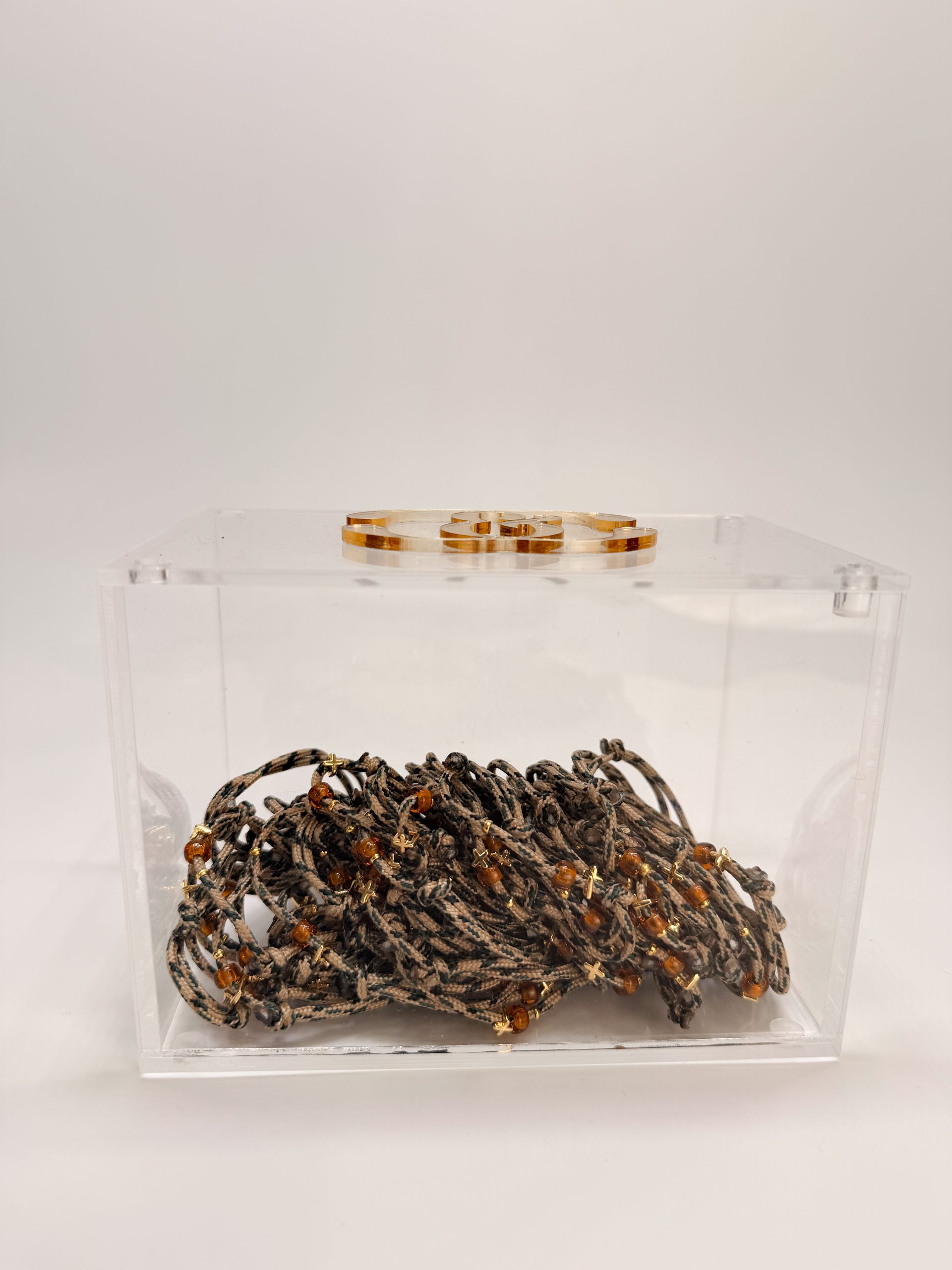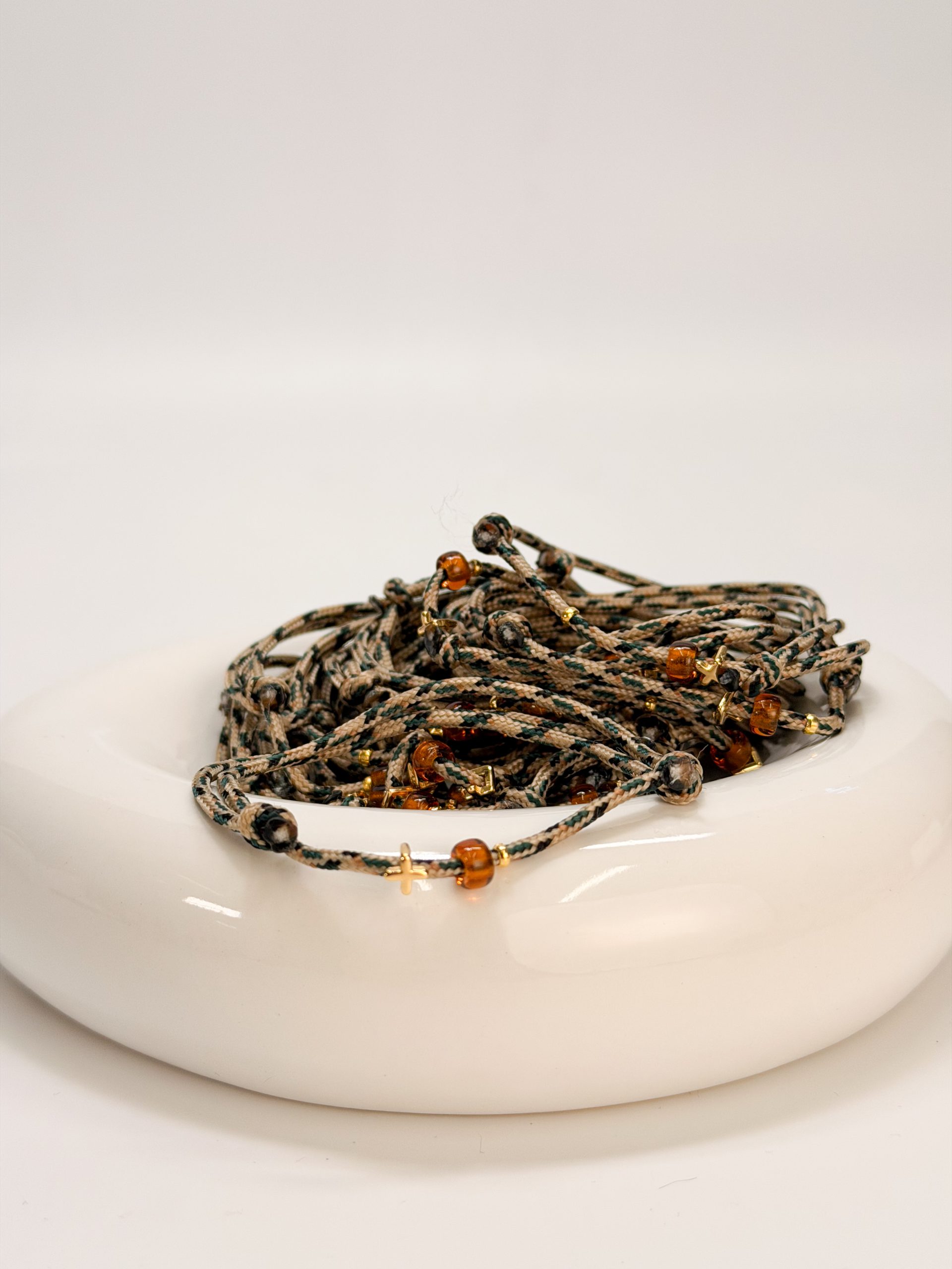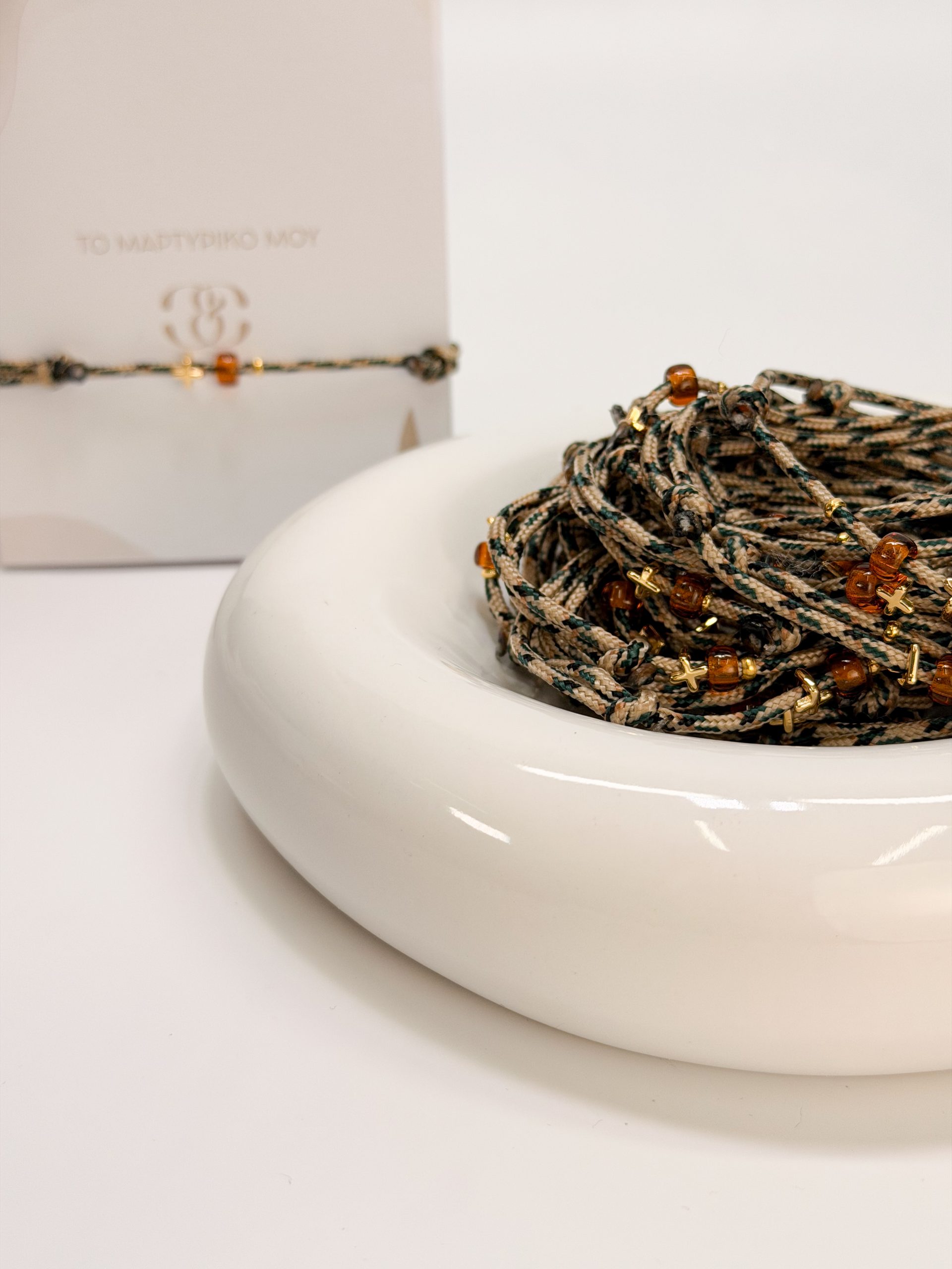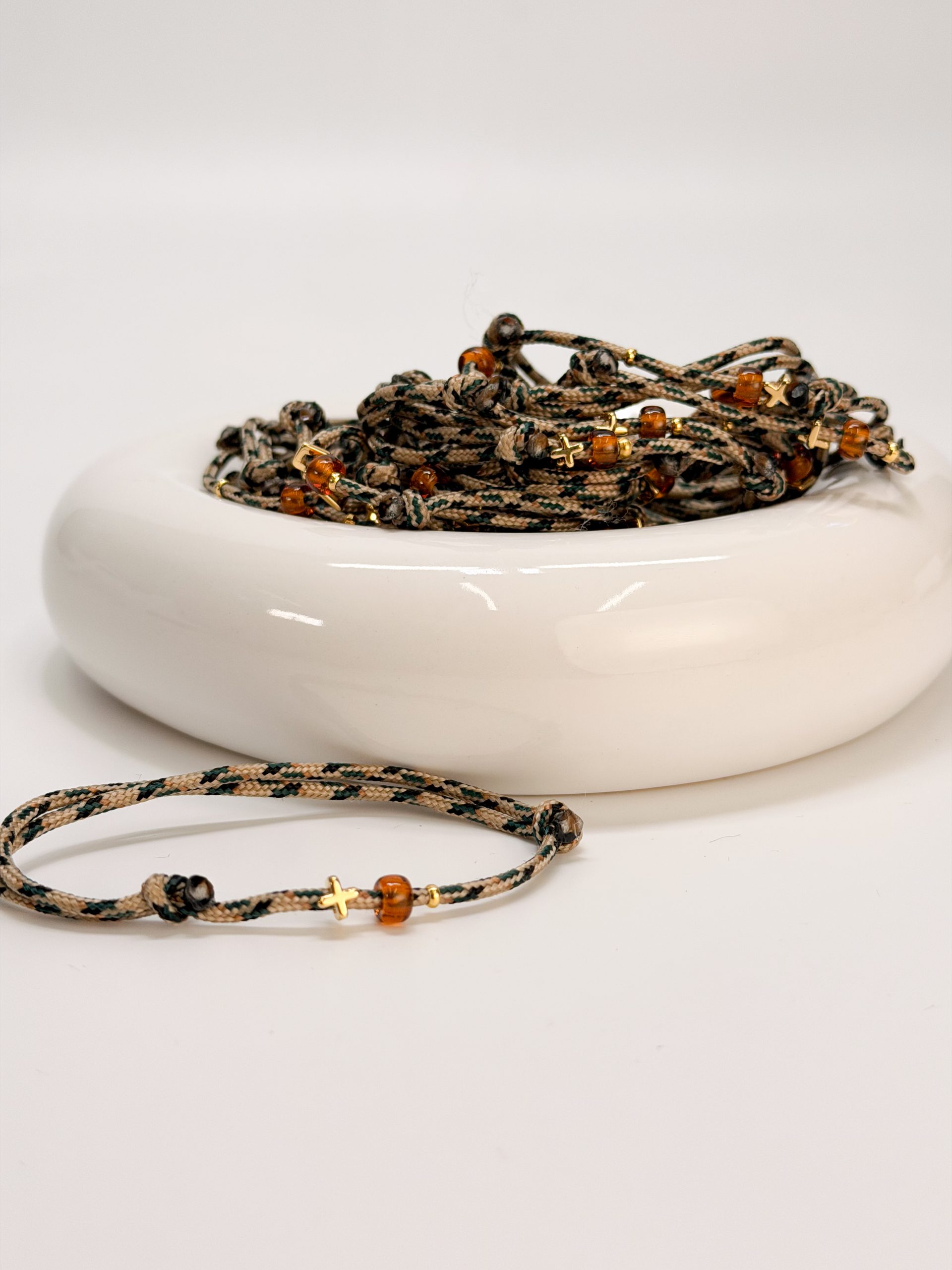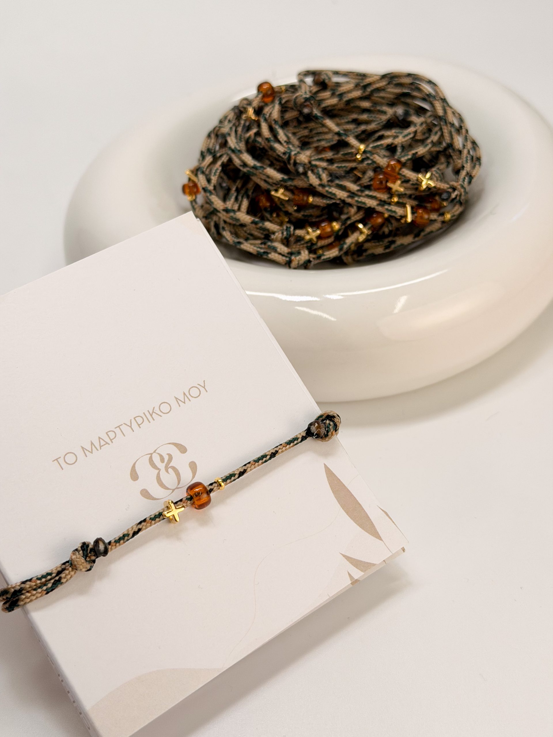 Μαρτυρικό βραχιόλι με κορδόνι σε 3 αποχρώσεις,καφέ ακρυλική χάντρα και επιχρυσωμένο σταυρό.