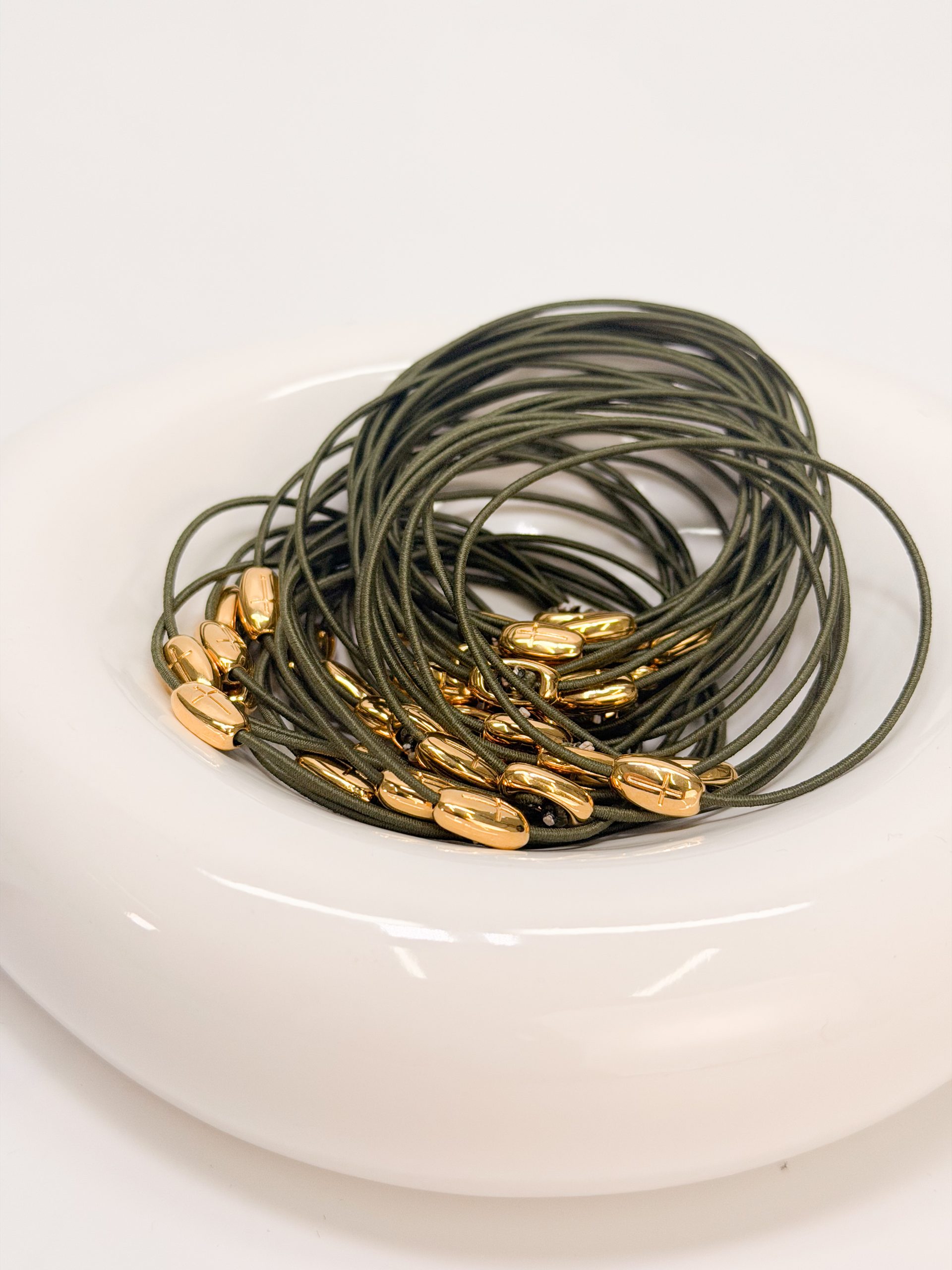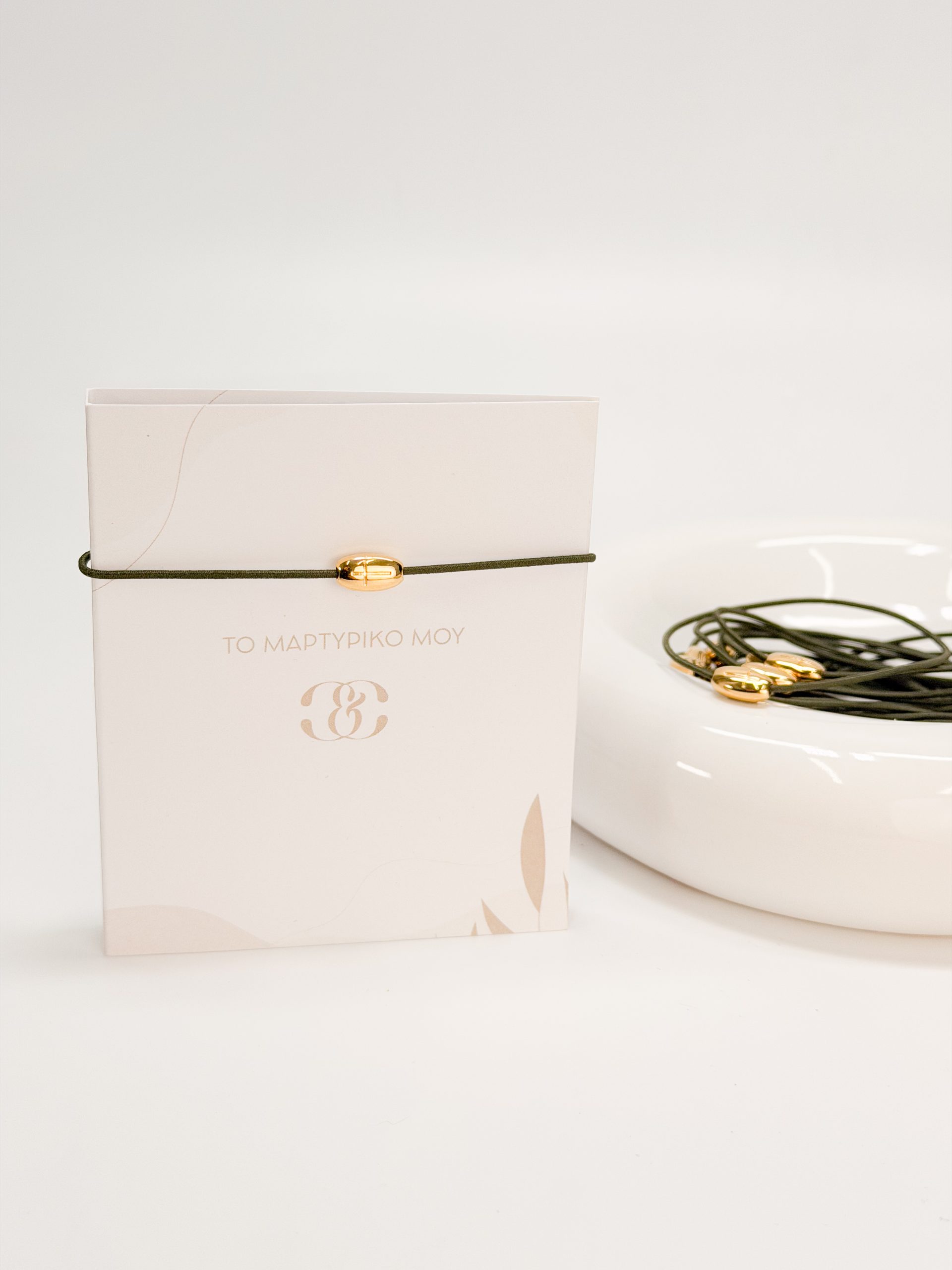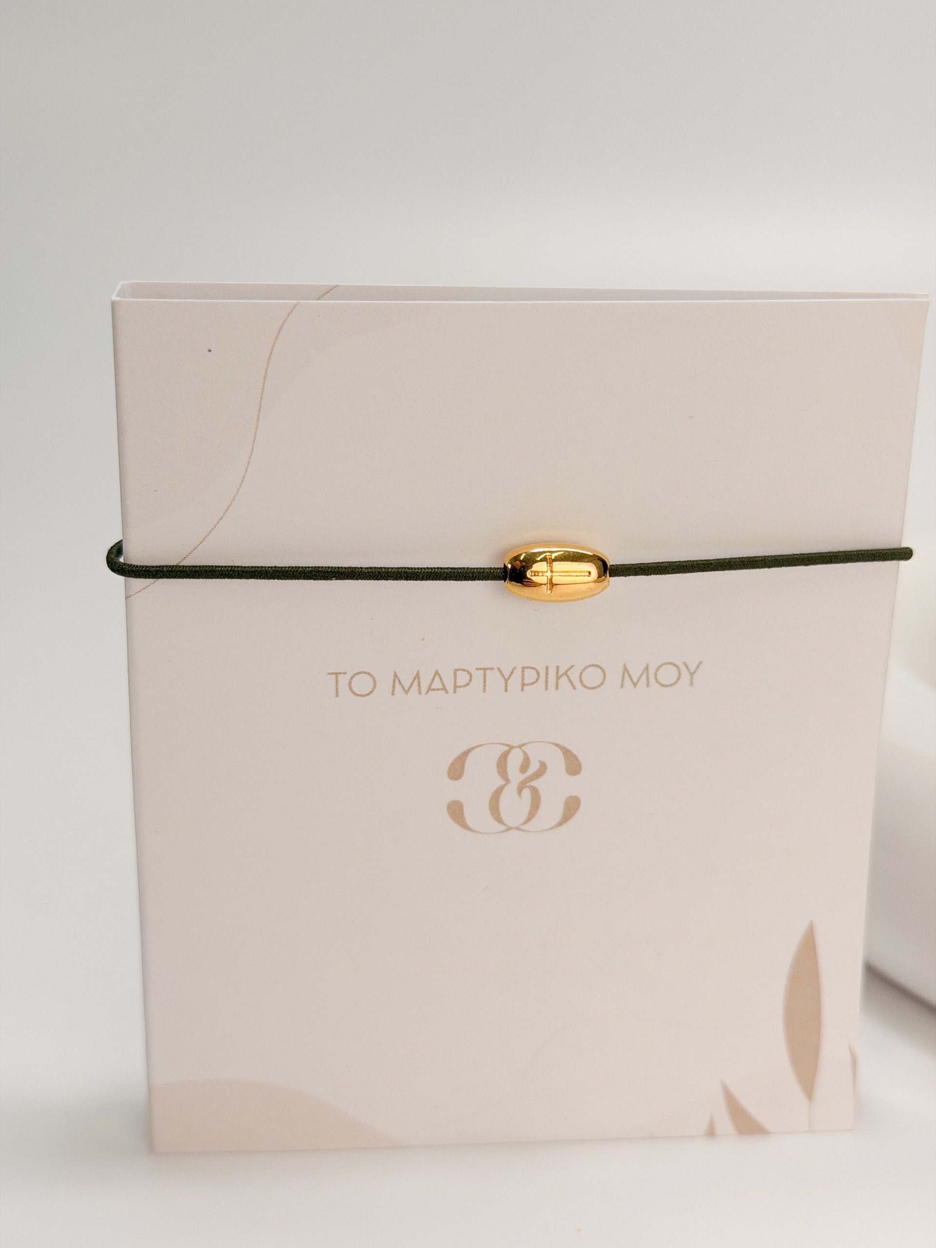 Μαρτυρικό βραχιόλι με ελαστικό κορδόνι σε χακί και επιχρυσωμένο σταυρό.