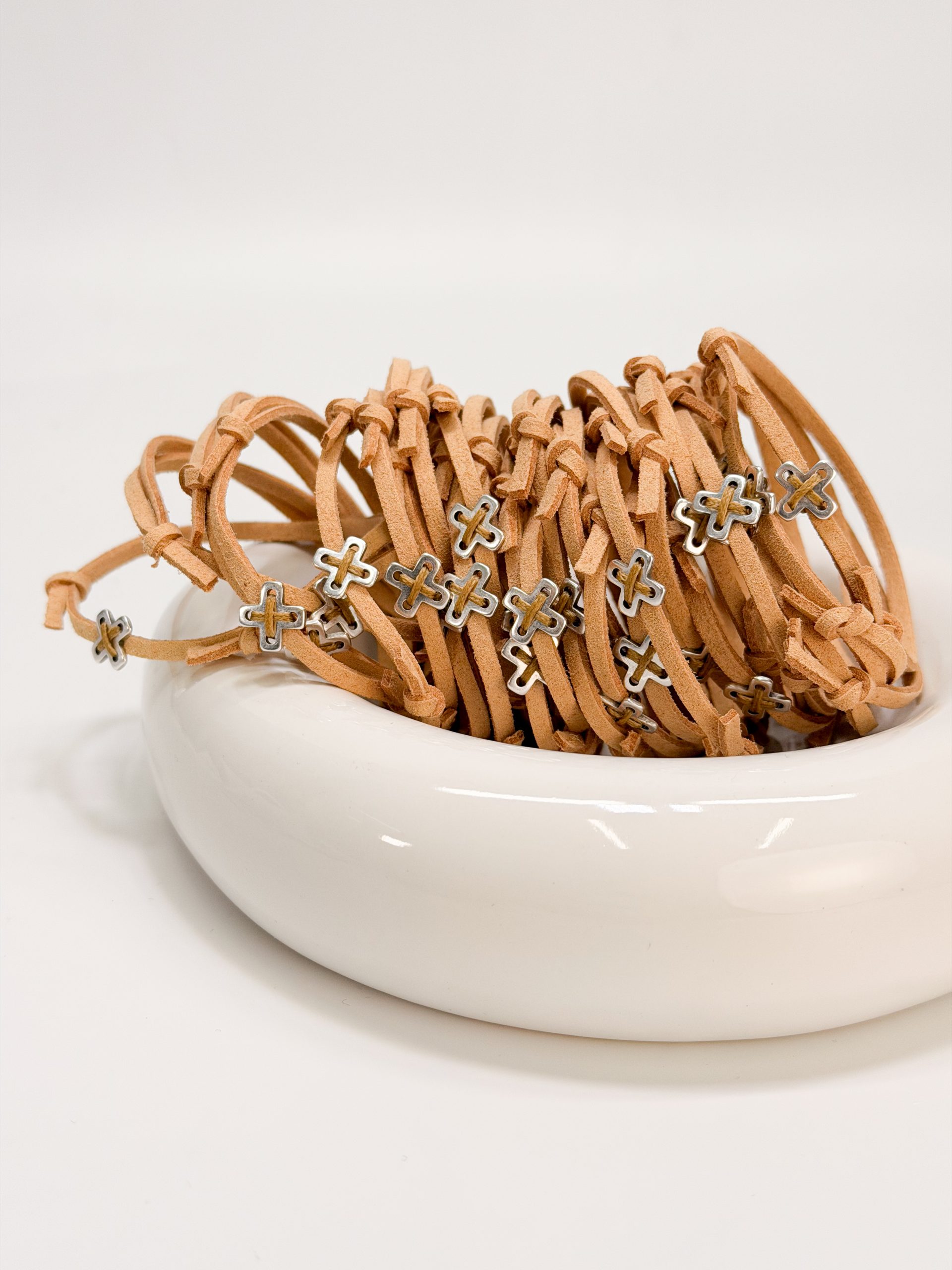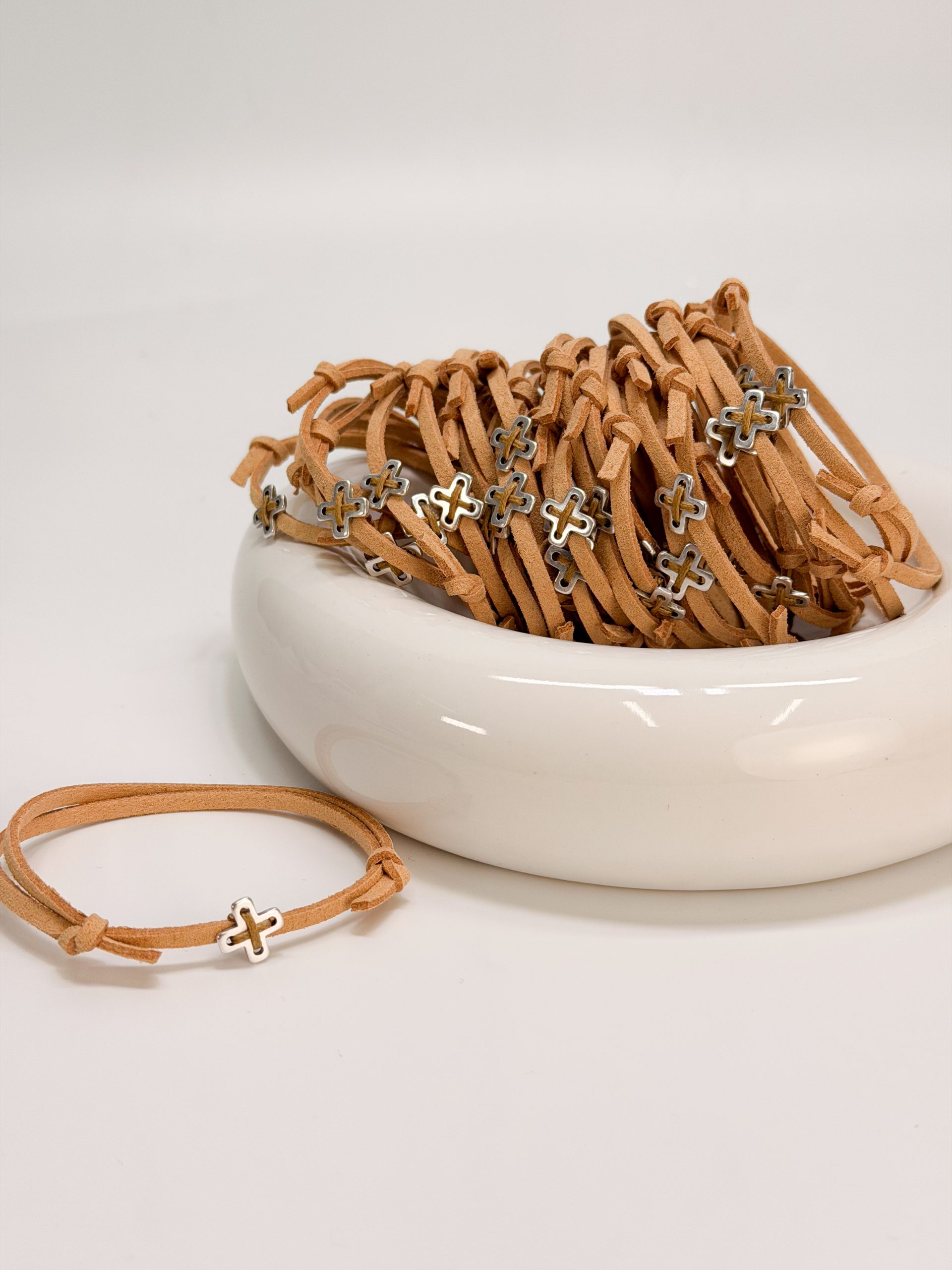 Μαρτυρικό βραχιόλι με μπεζ σουετ κορδόνι,κεντητό σταυρό σε ασημί απόχρωση.