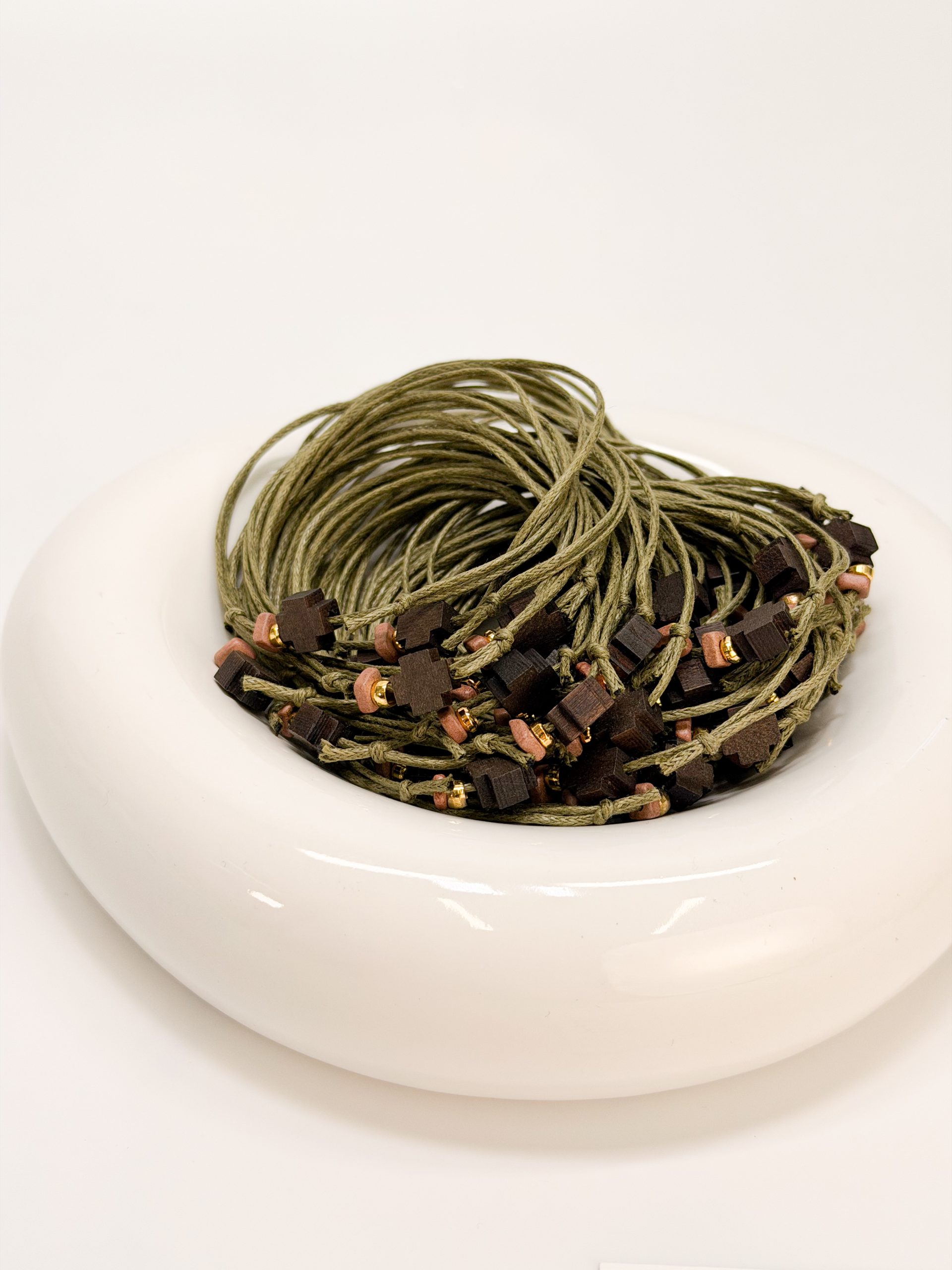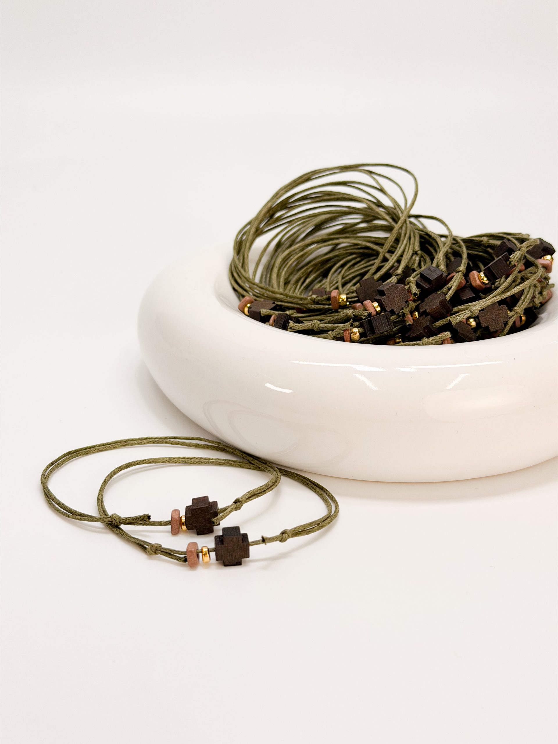 Μαρτυρικό βραχιόλι με λαδί κορδόνι,καφέ ξύλινο σταυρό και κεραμική ροδέλα.