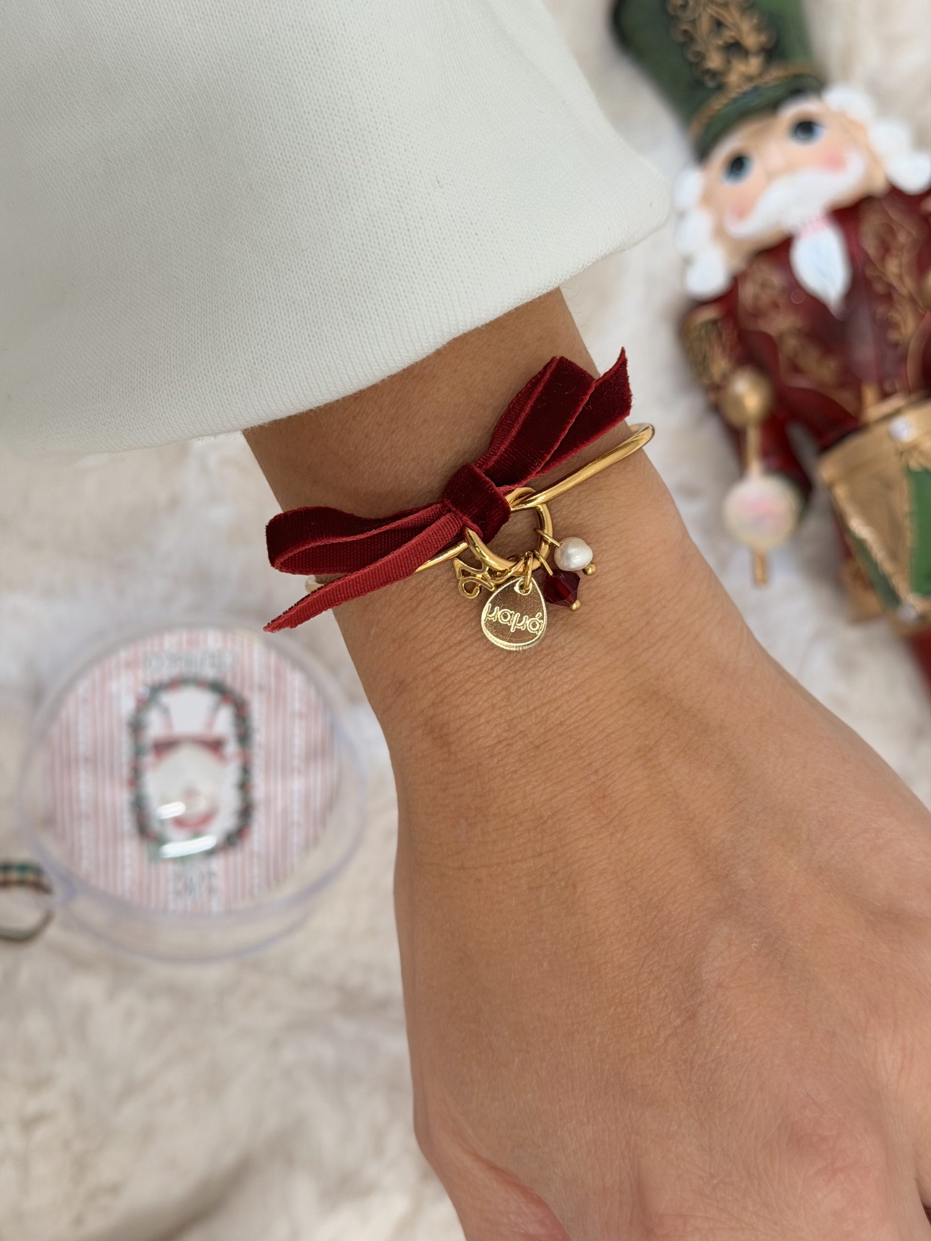 Μπρασελέ επιχρυσωμένο με μπορντώ βελούδινο φιογκάκι,μοτιφ 26,μαργαριτάρι,κρυσταλλάκι σε μαμά και σε νονά.Το μοτιφ της γιαγιάς είναι χρυσή πλέξιγκλας καρδιά πιο στρογγυλεμένη.