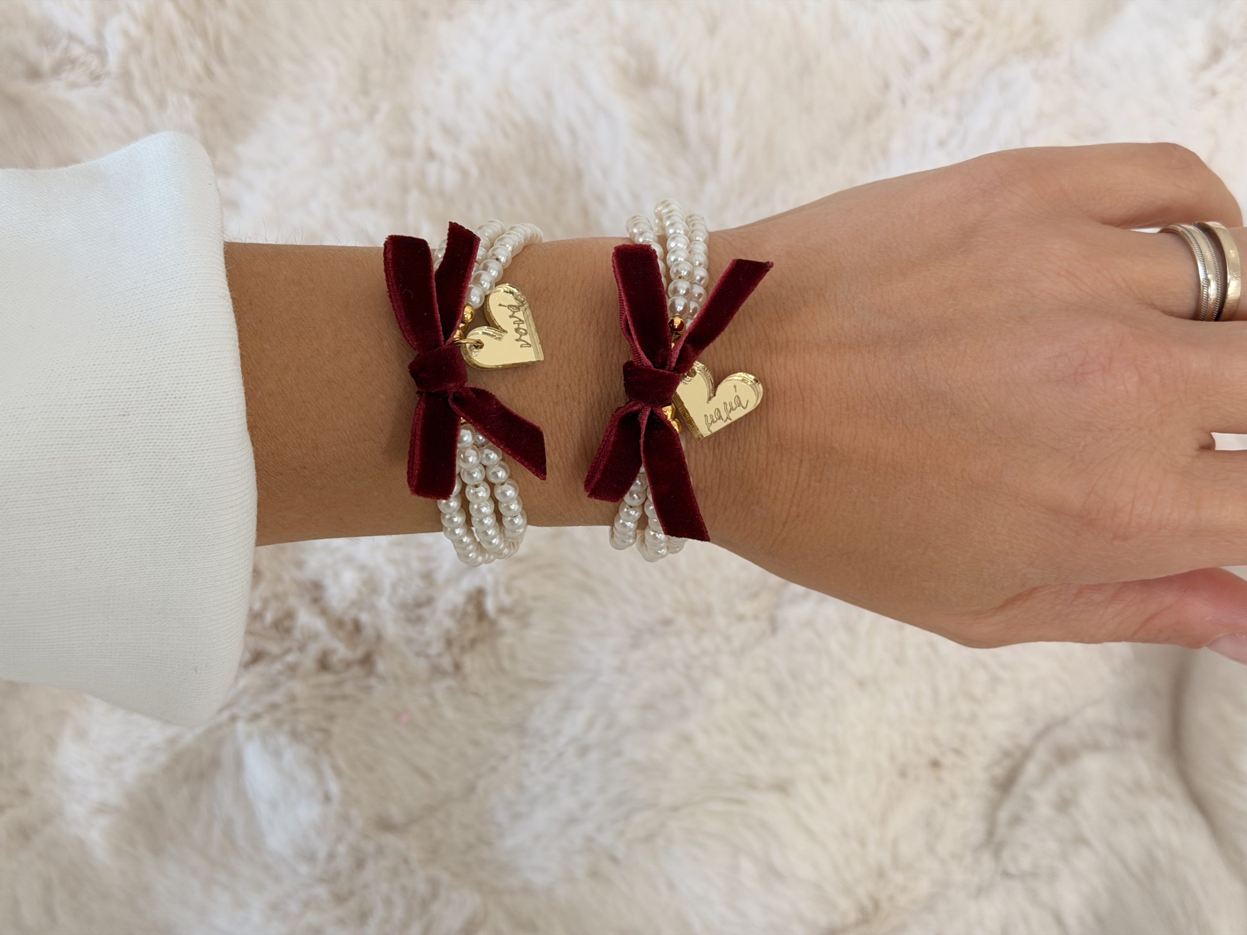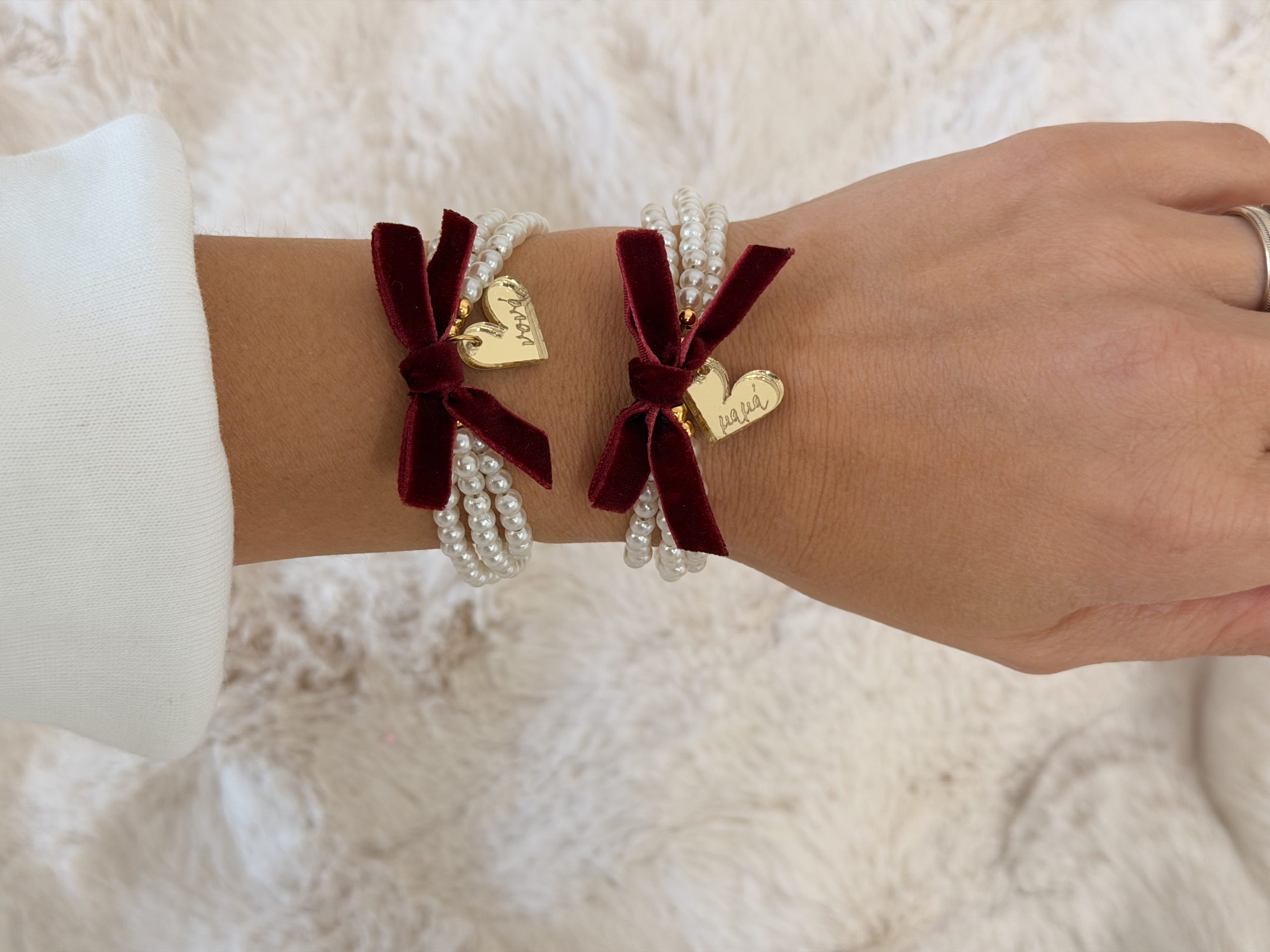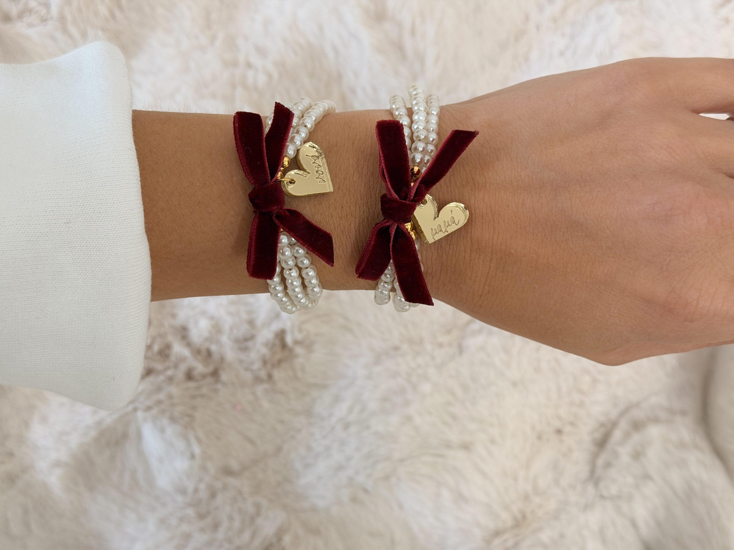 Βραχιολάκι με πέρλες,μπορντώ φιογκάκι,μοτιφ 26 και μοτιφ μαμά,νονά και γιαγιά σε πλεξιγκλας χρυσή καρδιά.Το γιαγιά βγαίνει σε πιο στρογγυλεμένη καρδιά.