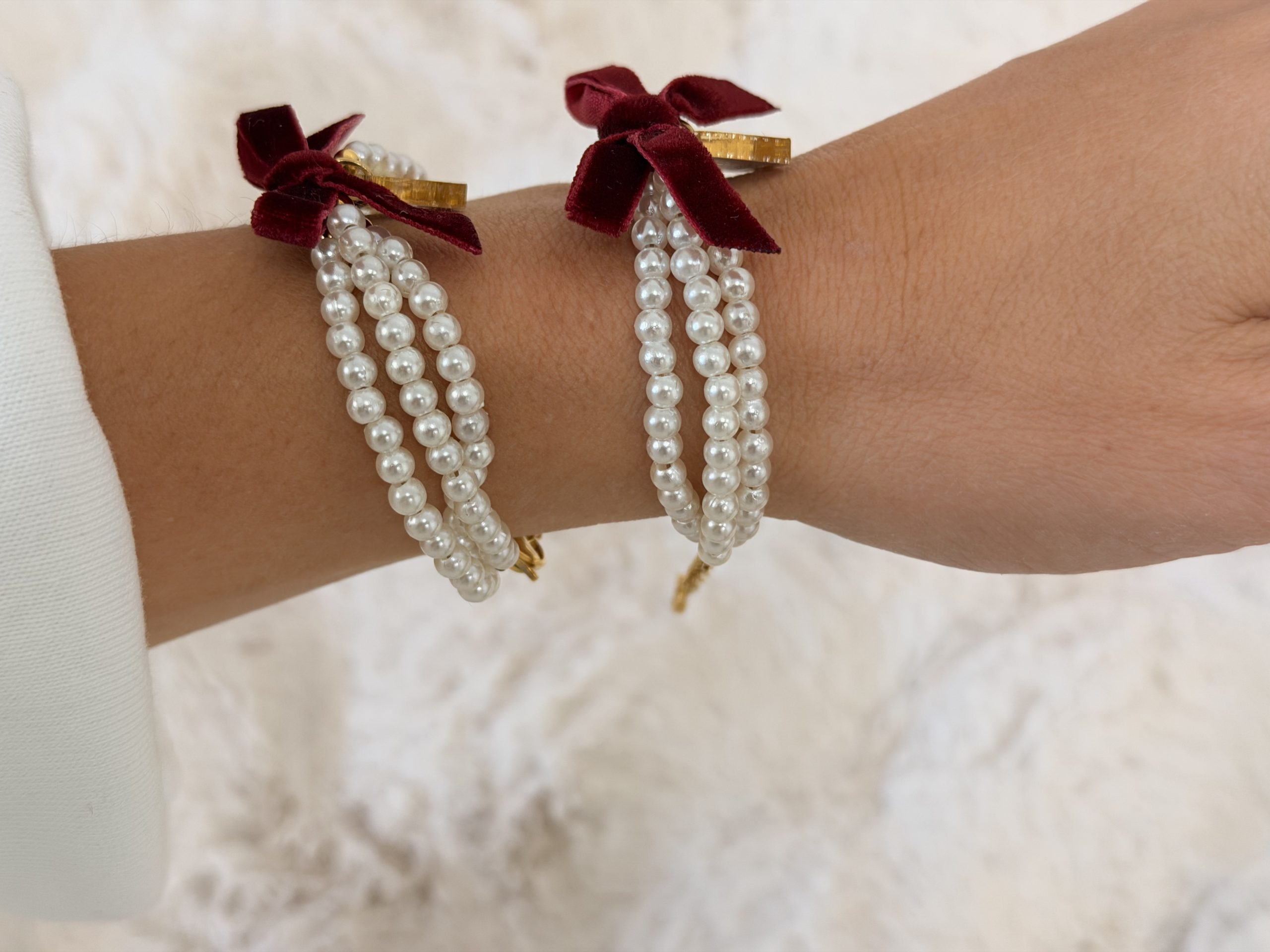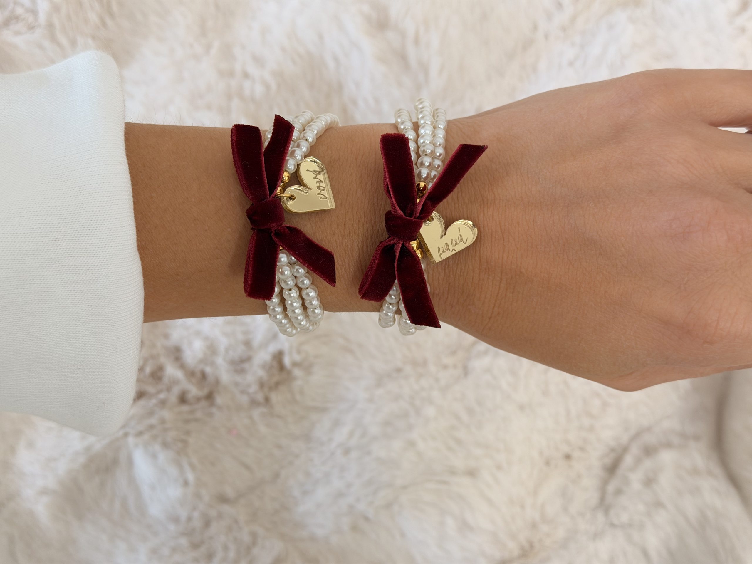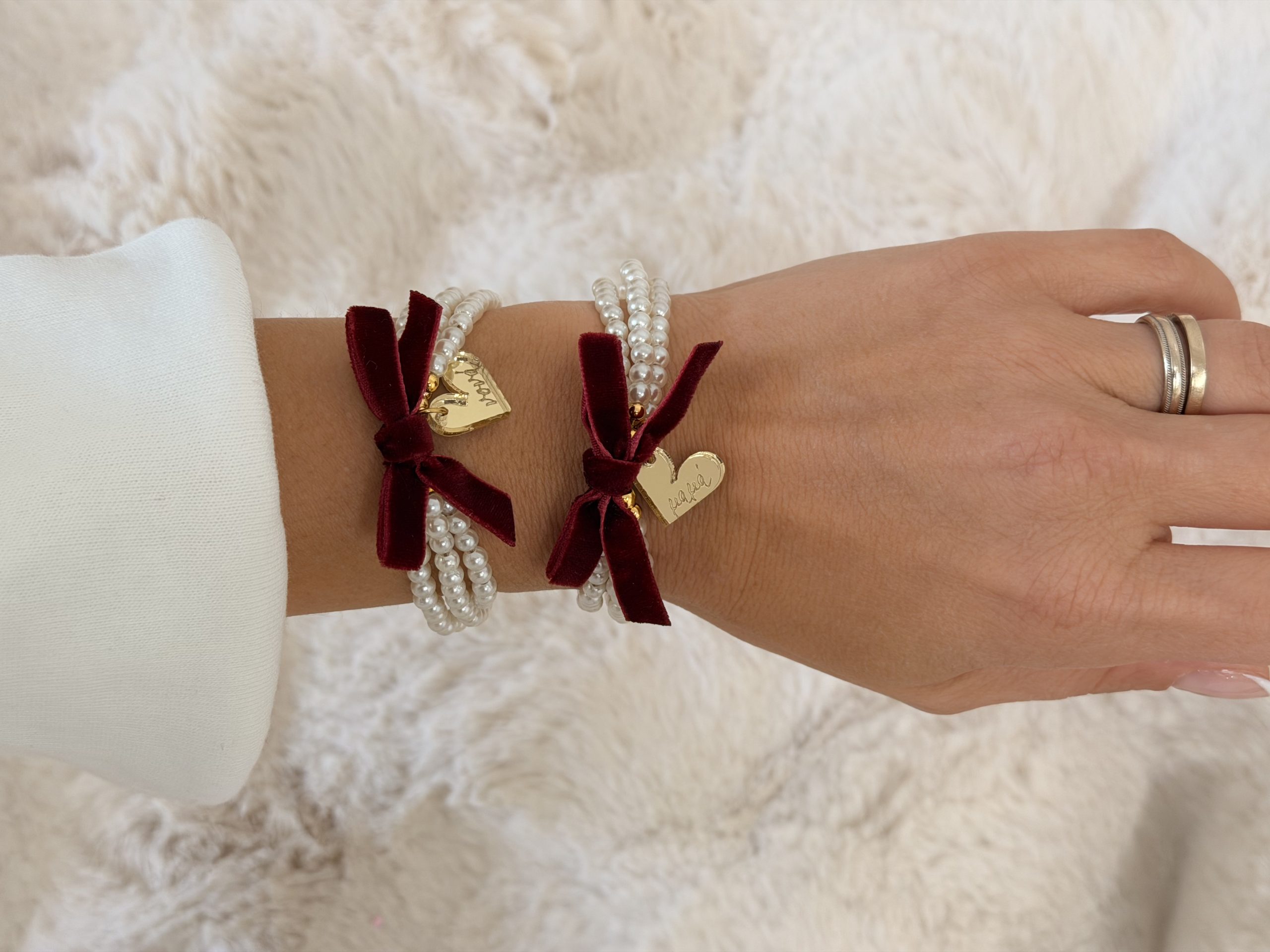 Βραχιολάκι με πέρλες,μπορντώ φιογκάκι,μοτιφ 26 και μοτιφ μαμά,νονά και γιαγιά σε πλεξιγκλας χρυσή καρδιά.Το γιαγιά βγαίνει σε πιο στρογγυλεμένη καρδιά.