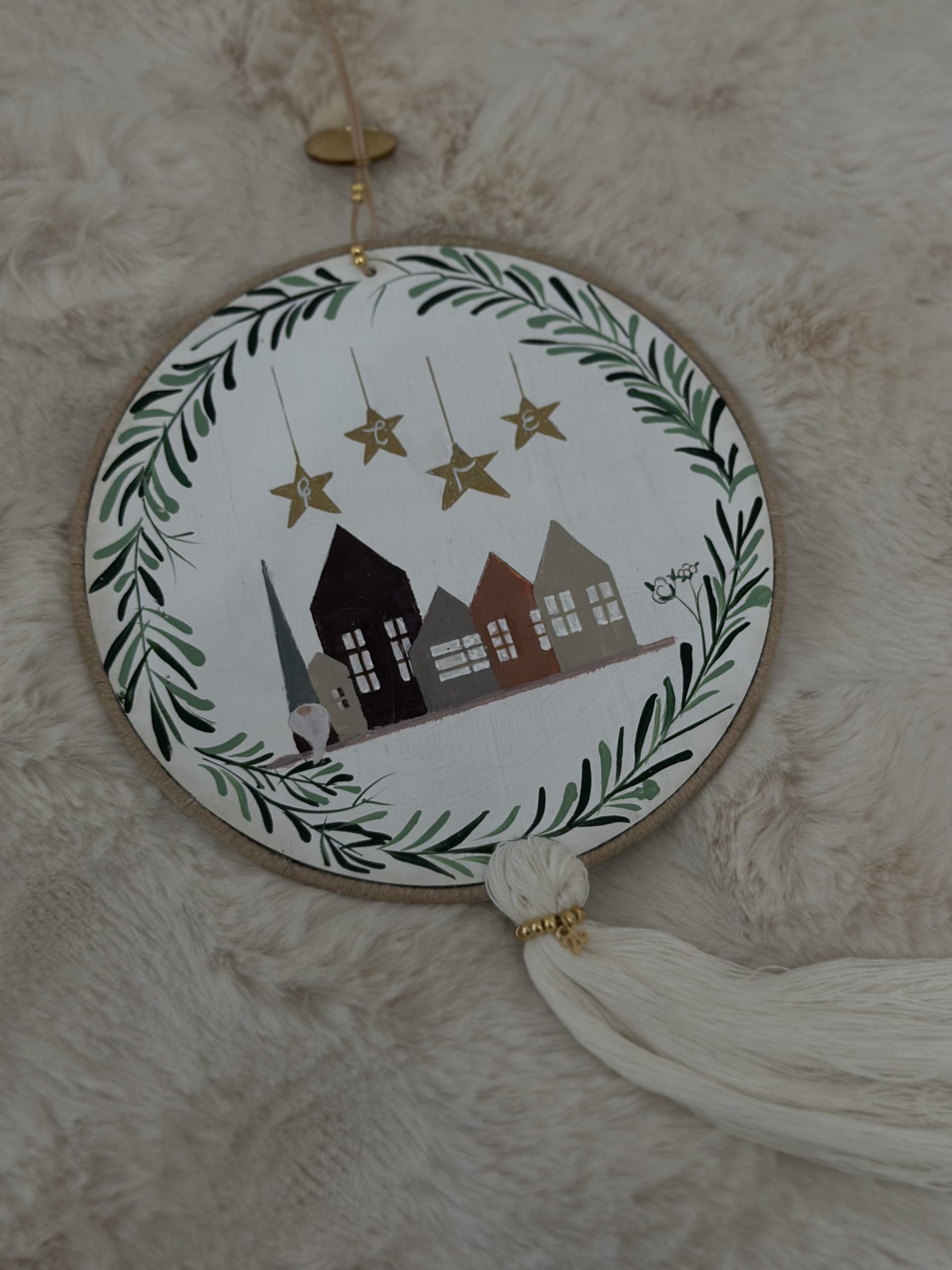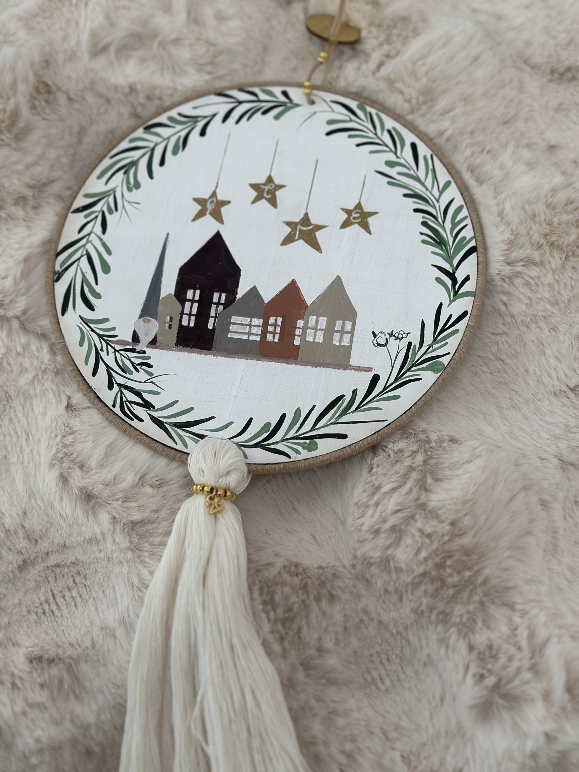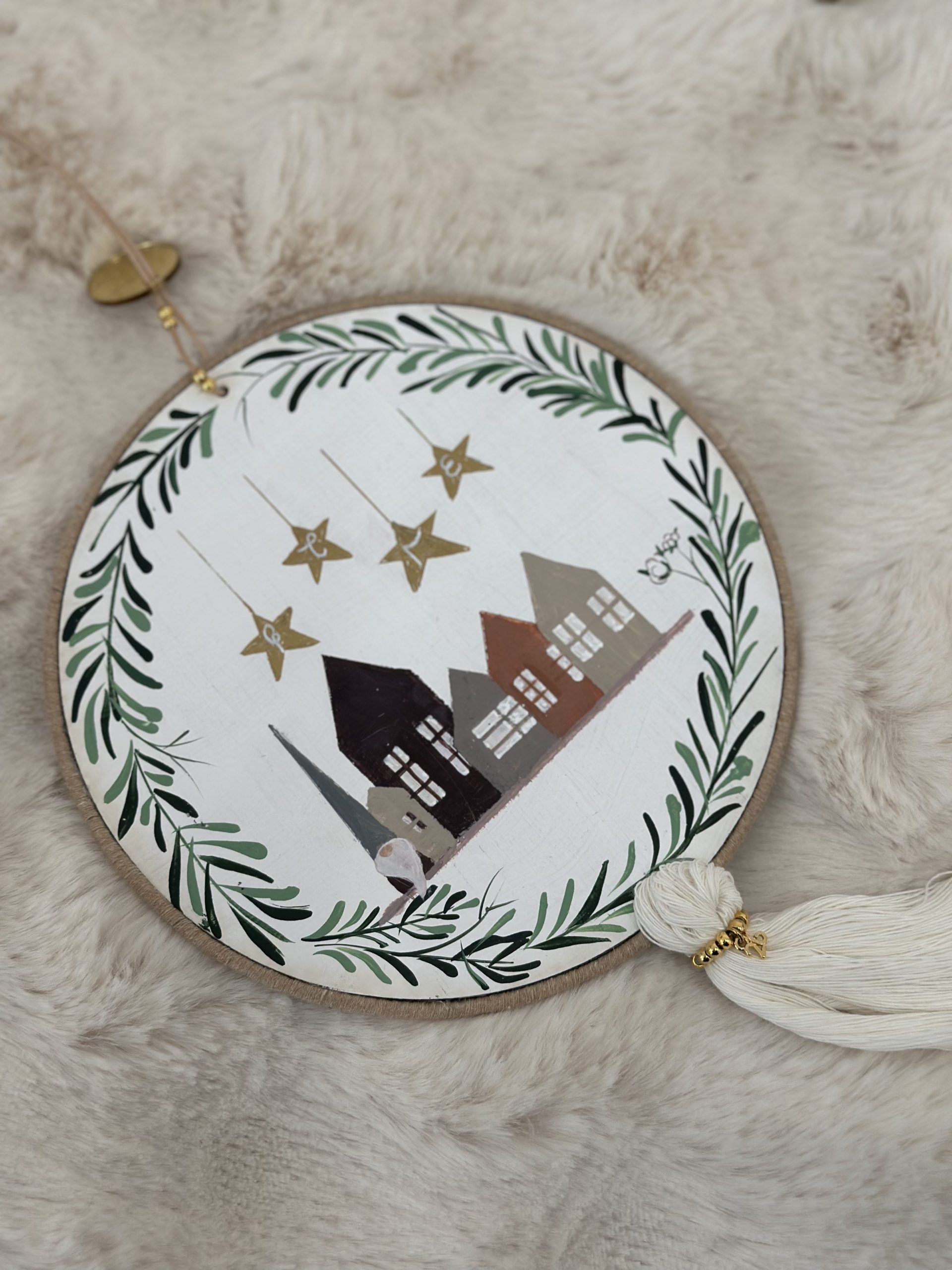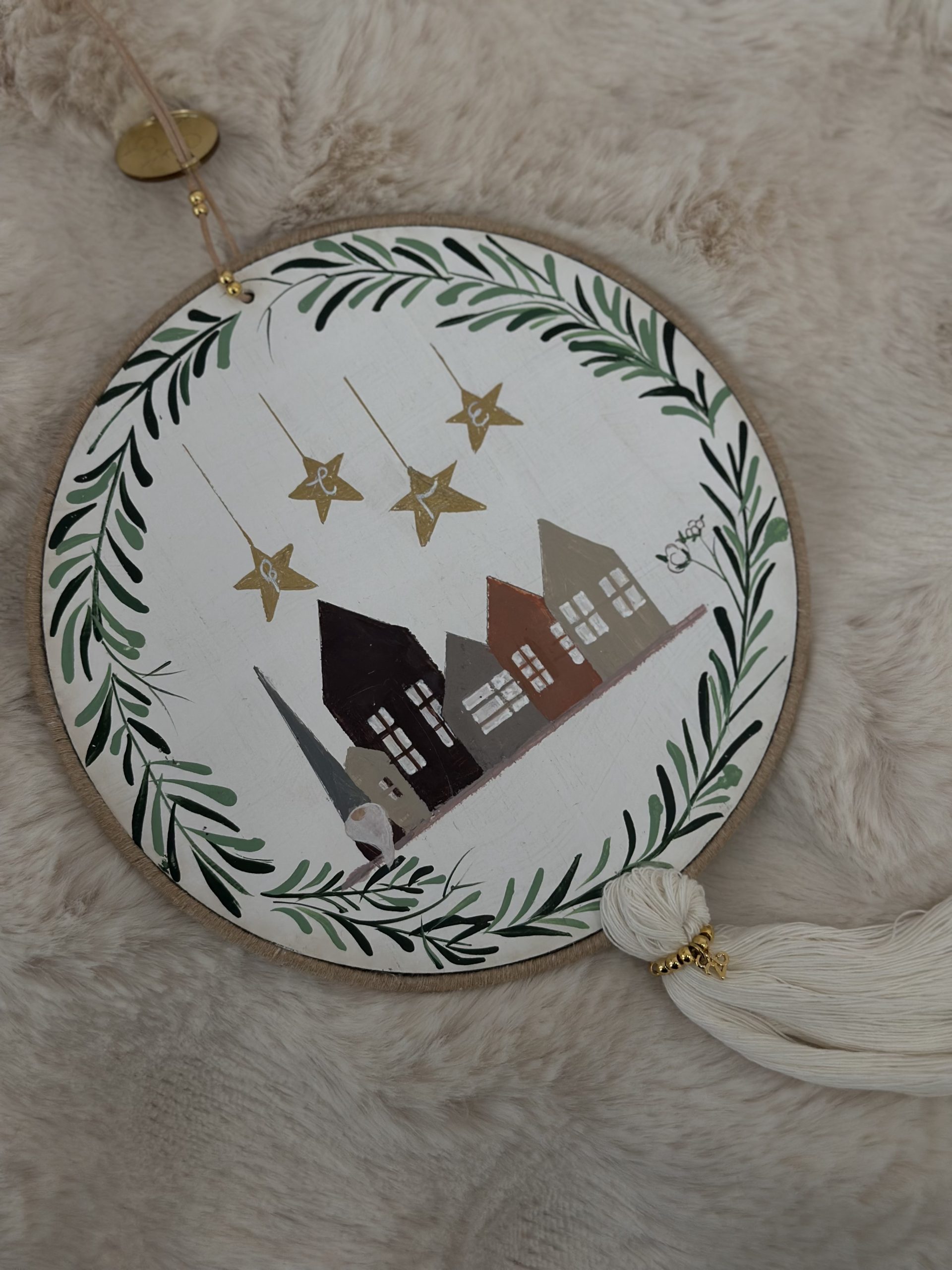 Ζωγραφιστό στολίδι με σπιτάκια .Απο εμάς χρειάζονται περίπου 7 εργάσιμες.Μπορείτε να μας γράψετε στις παρατηρήσεις τα μονογράμματα που επιθυμείτε να γραφτούν.Για να ξεκινήσει η επεξεργασία θα χρειαστούμε μια προκαταβολή.