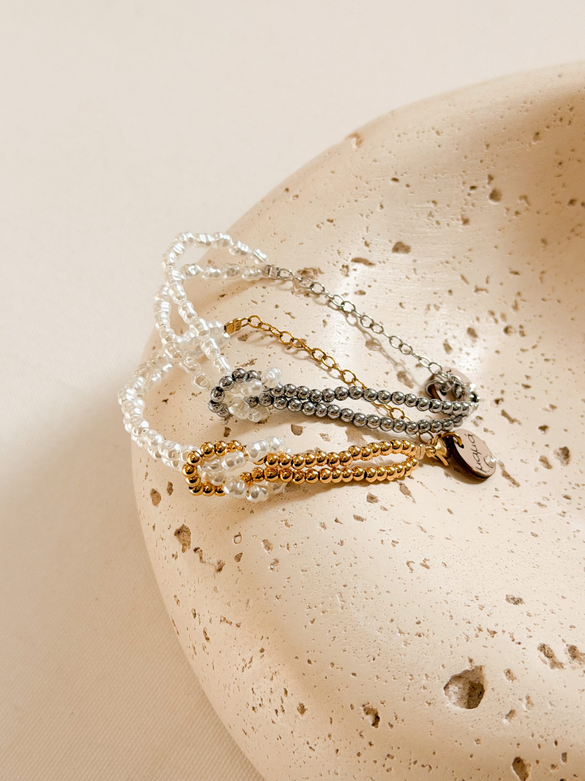 Βραχιολάκι κόμπο με πέρλες και χάντρες σε χρυσή,ασημί απόχρωση για την μαμά,νονά,αδερφή,θεία,γιαγιά,κουμπάρα.Το μοτιφ θεία,αδερφή και κουμπάρα βγαίνει σε ροζ ξύλινη καρδιά.Το μοτιφ της γιαγιάς βγαίνει σε χρυσό ξύλινο αστέρι.