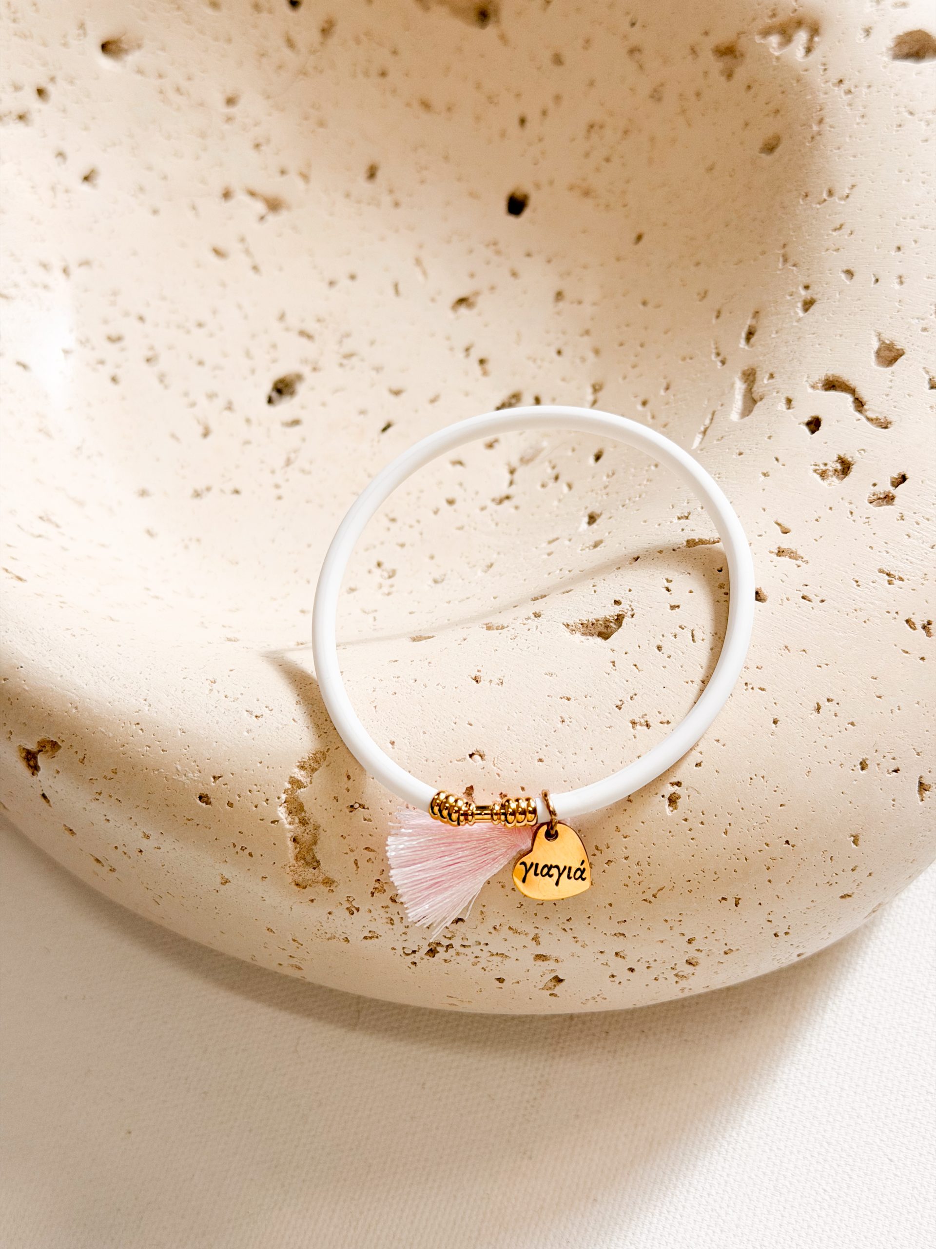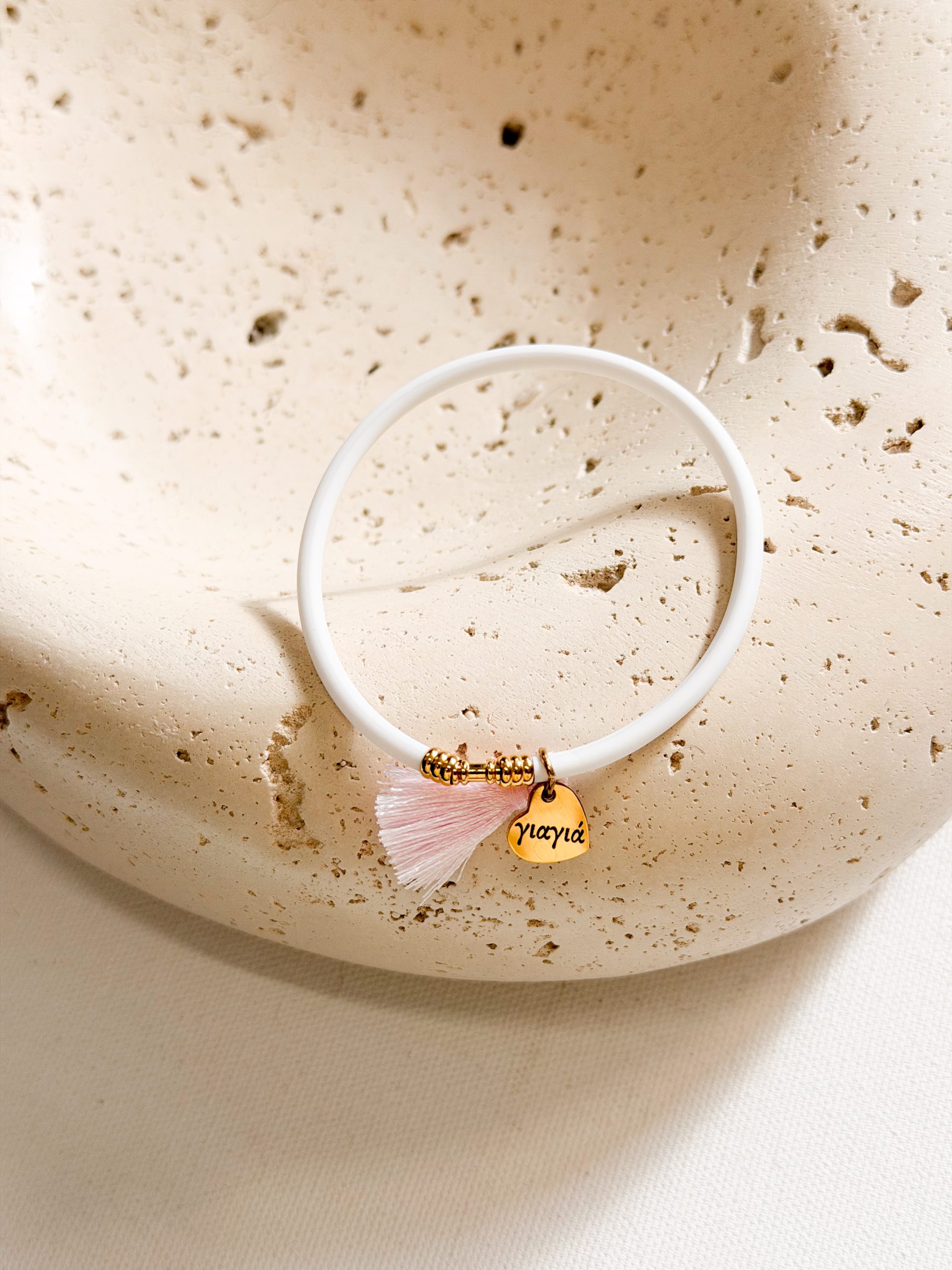 Βραχιολάκι με καουτσουκ κορδόνι,ροζ φούντα και μοτιφ καρδια για την μαμά,νονά και γιαγιά.