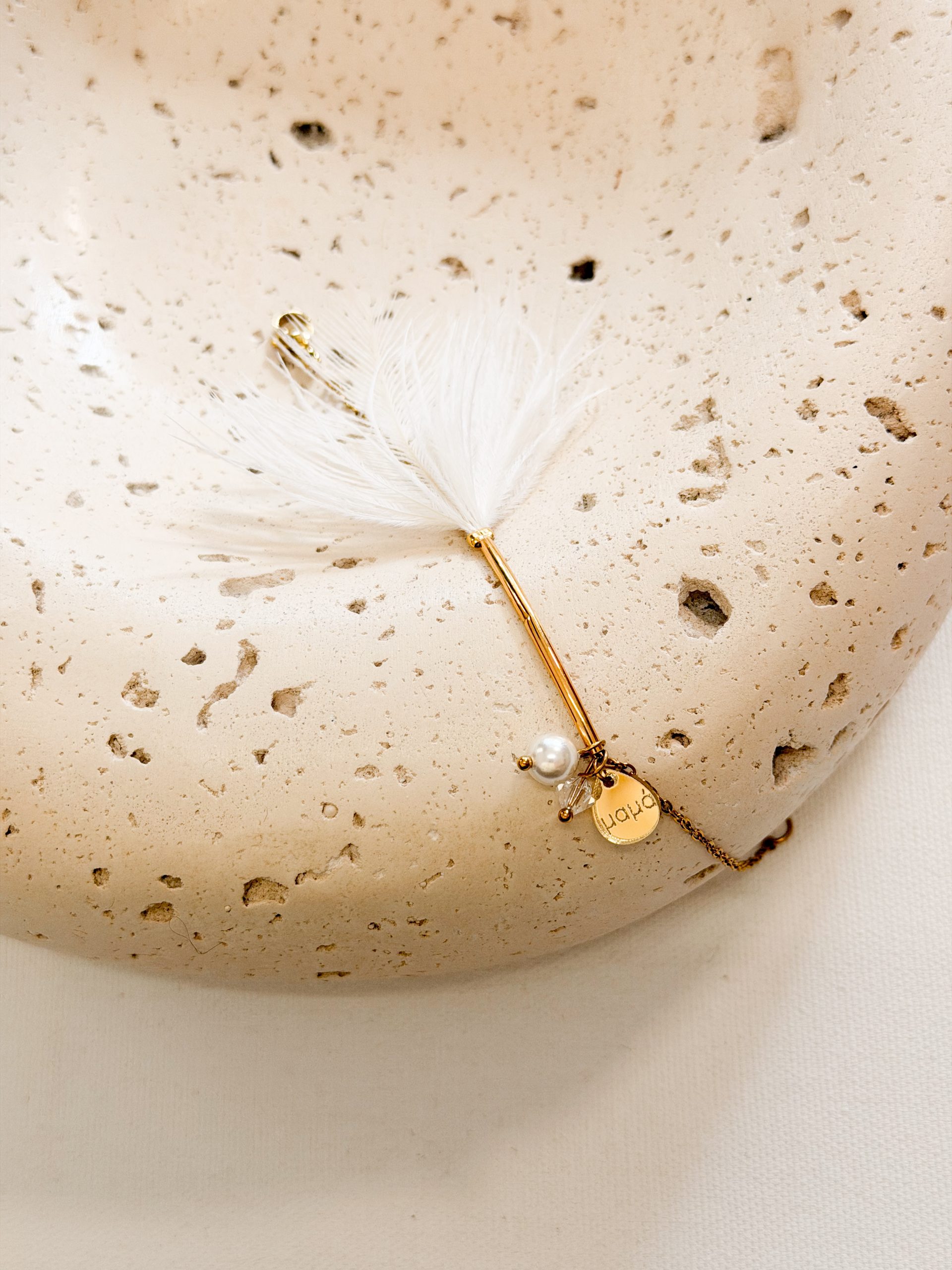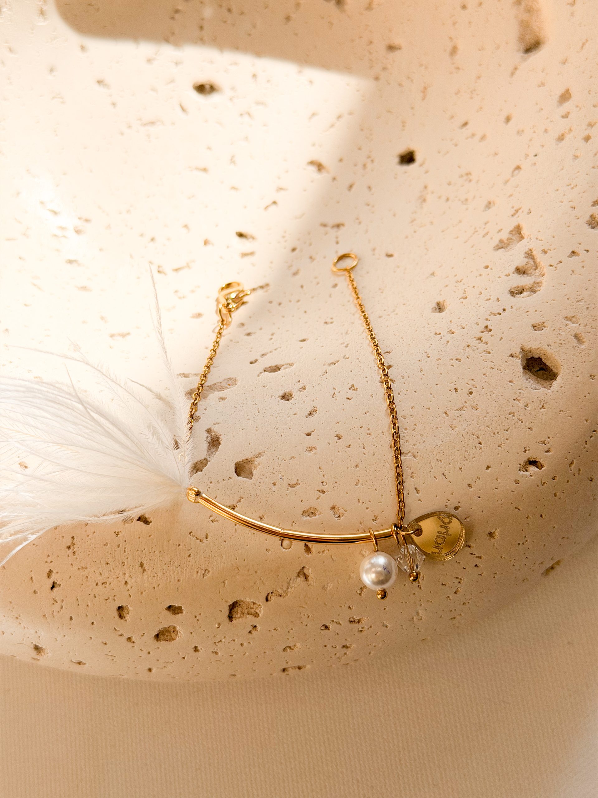 Βραχιολάκι με επιχρυσωμένο σωληνάκι,φτερό,ατσάλινη αλυσίδα και μαμά νονά πλεξιγκλας.