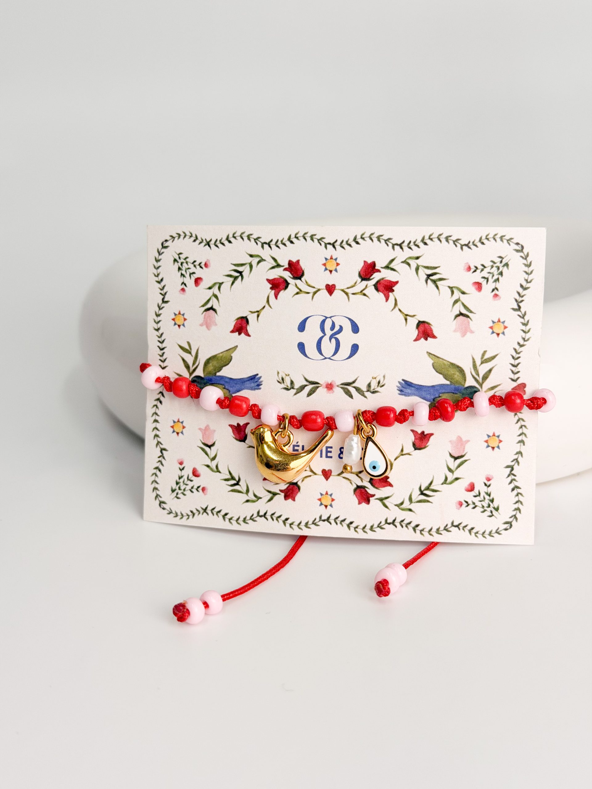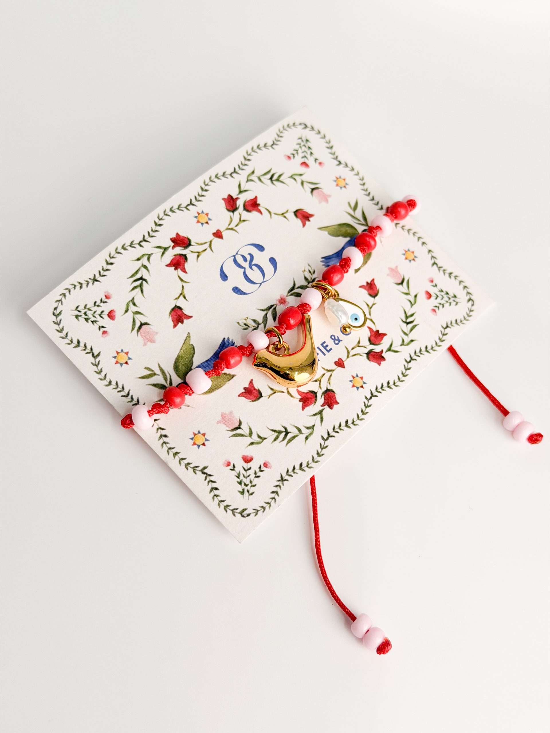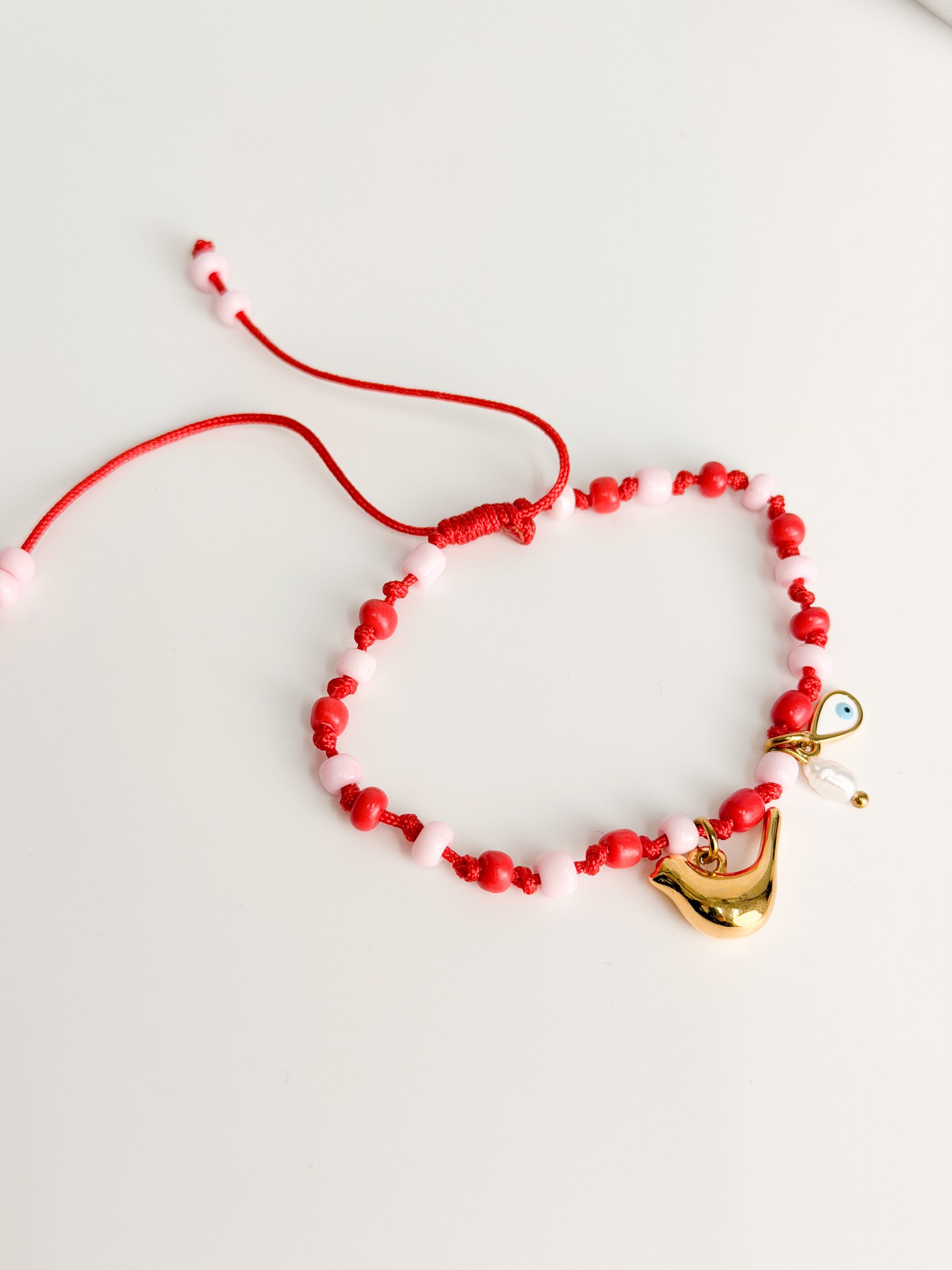 Μαρτάκι με κόκκινο σατεν κορδόνι,ροζ χάντρες και μοτιφ επιχρυσωμένο.