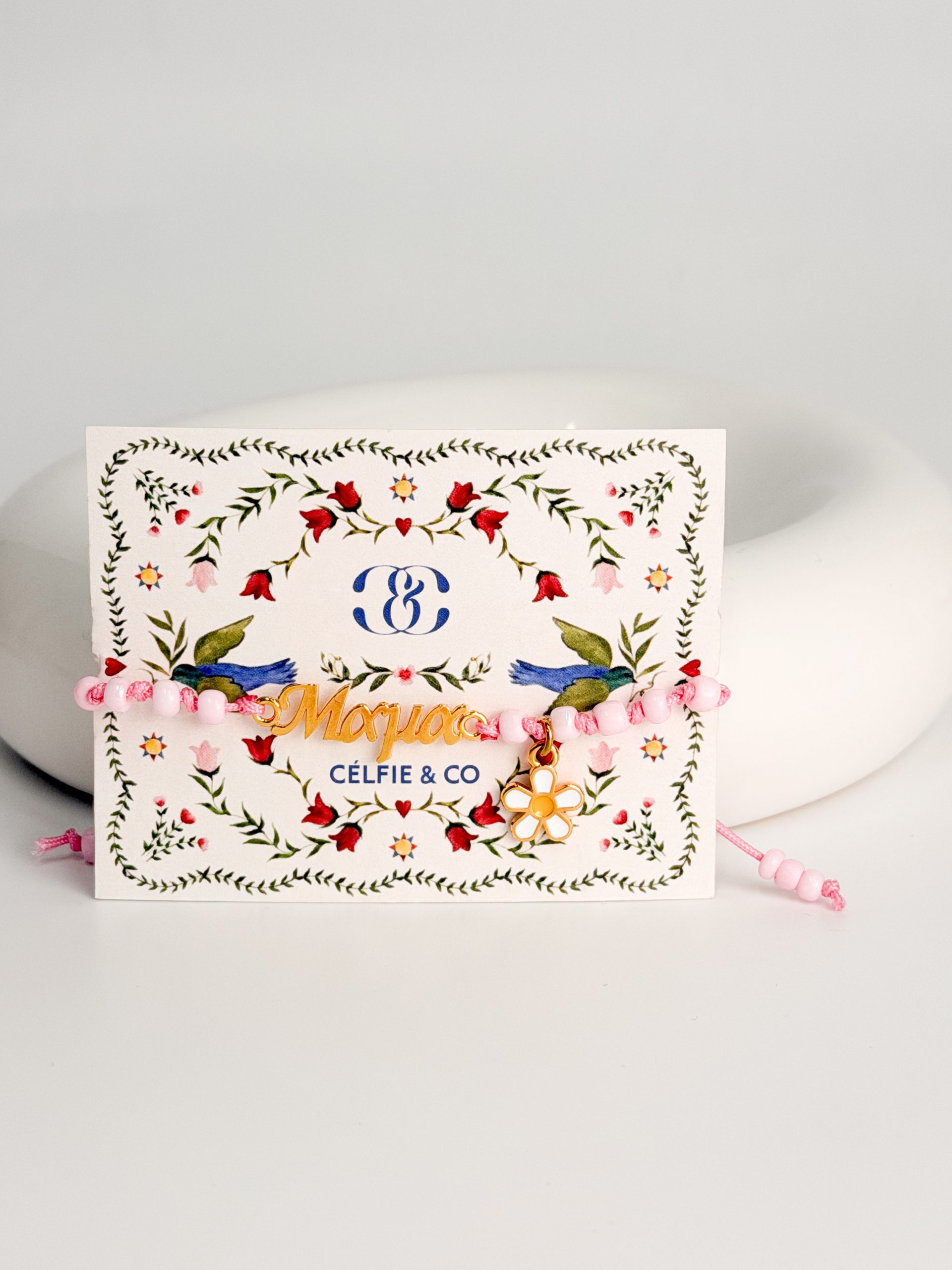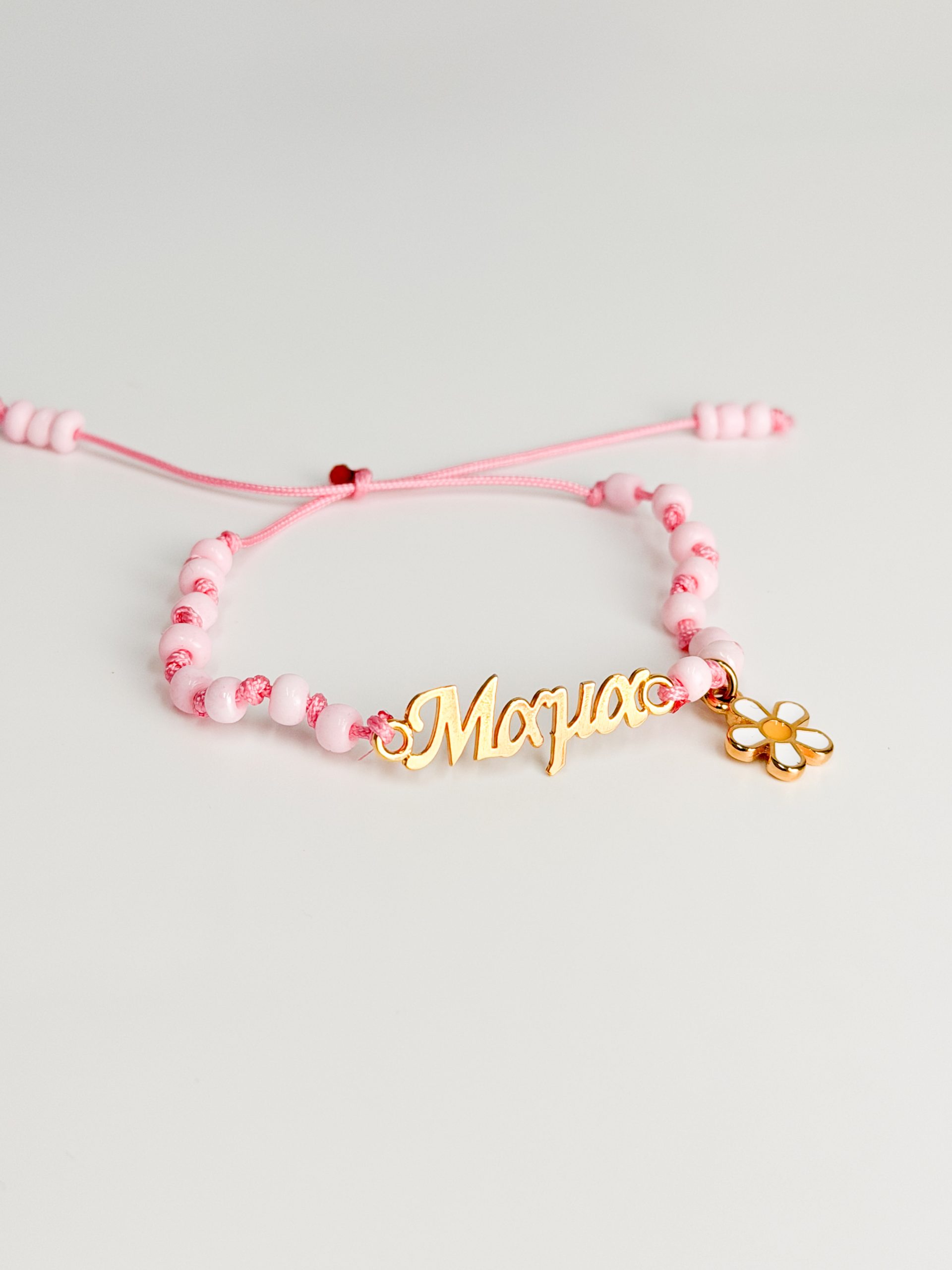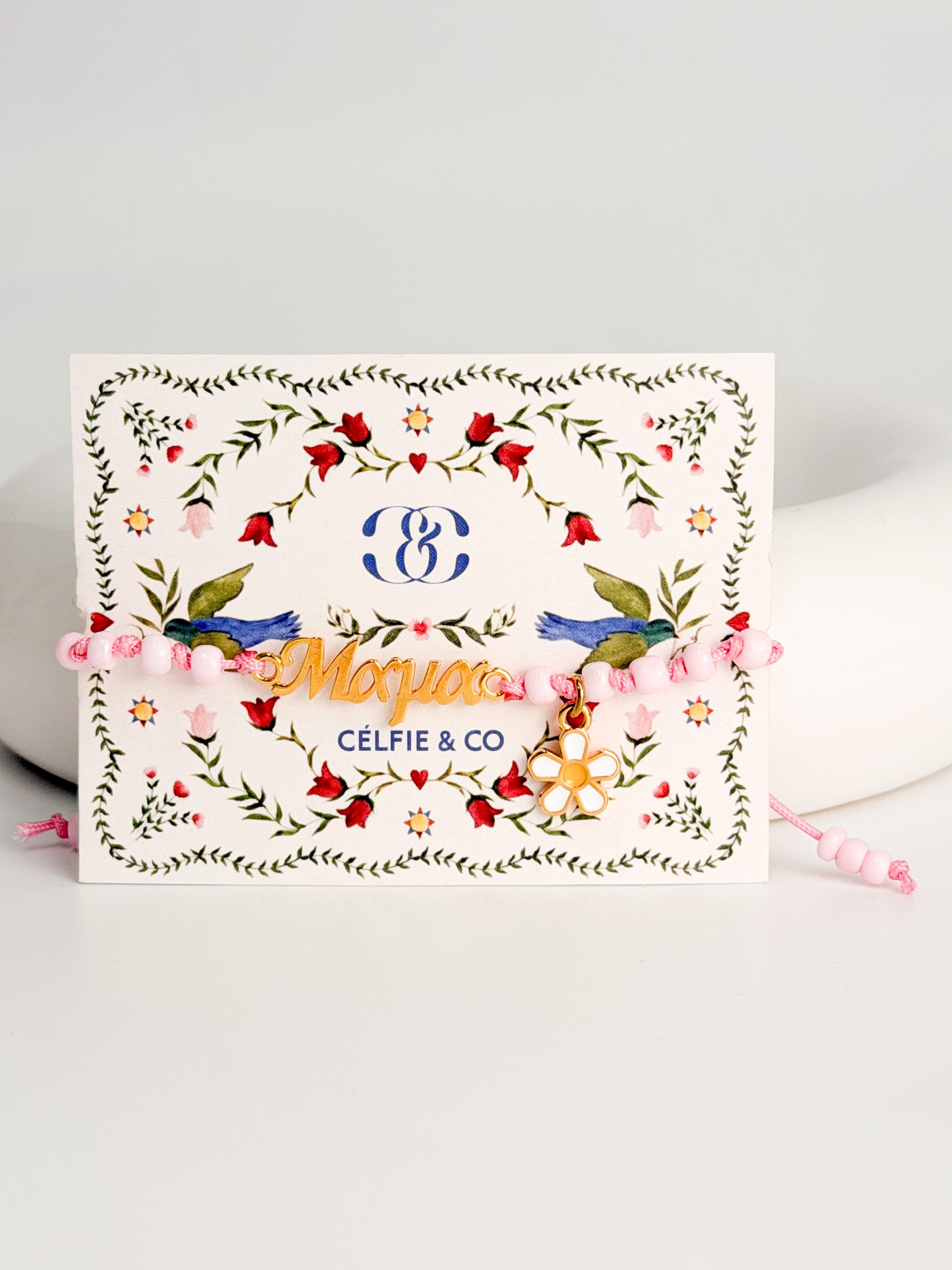 Βραχιολάκι για την μαμά,νονά,γιαγιά με επιχρυσωμένη επιγραφή,λουλουδάκι και ροζ κορδόνι με χάντρες.