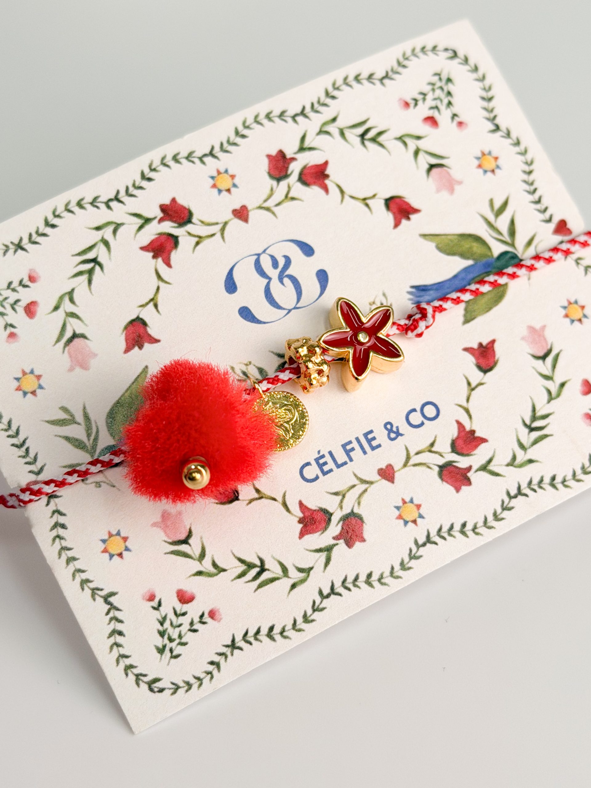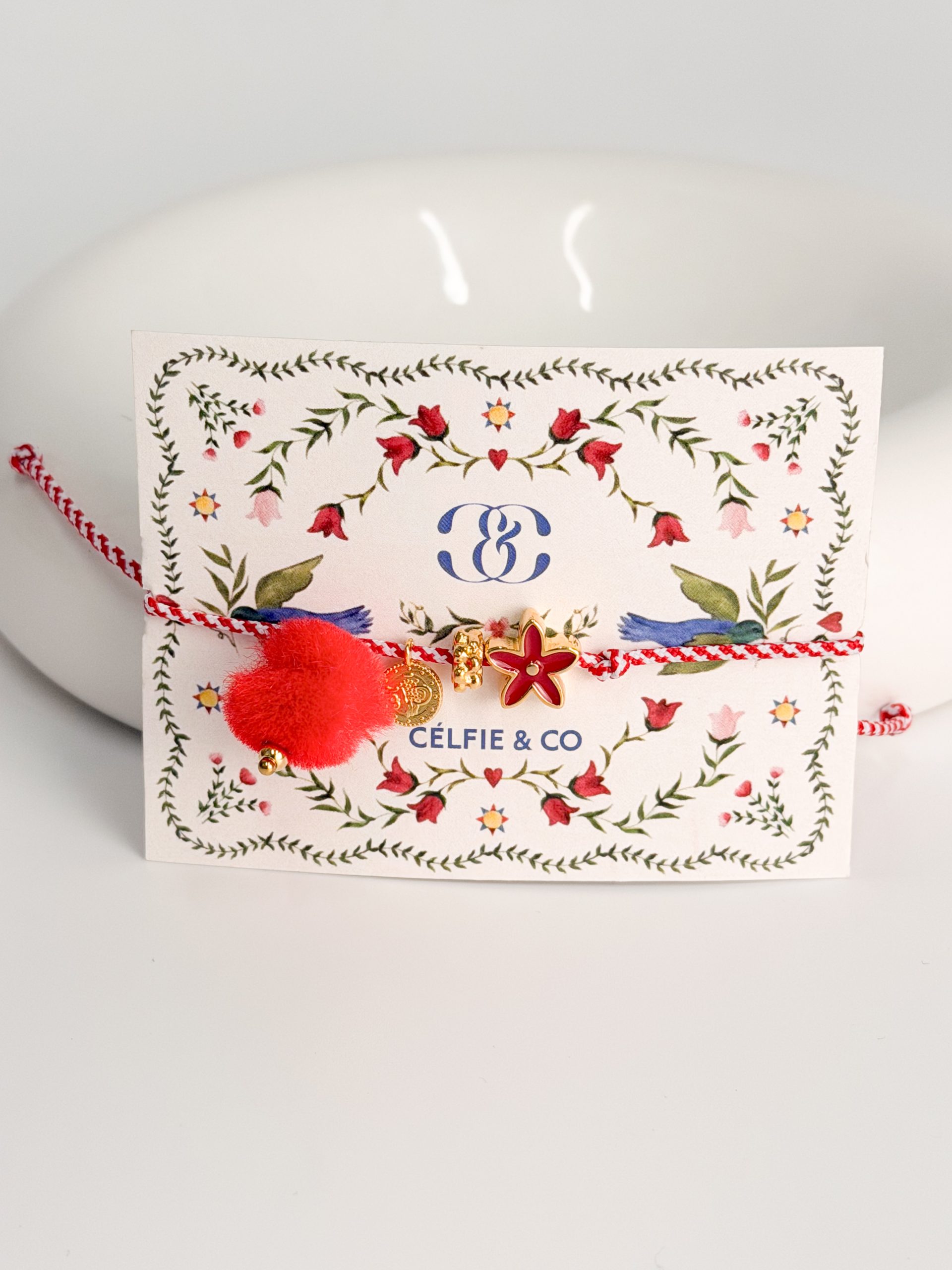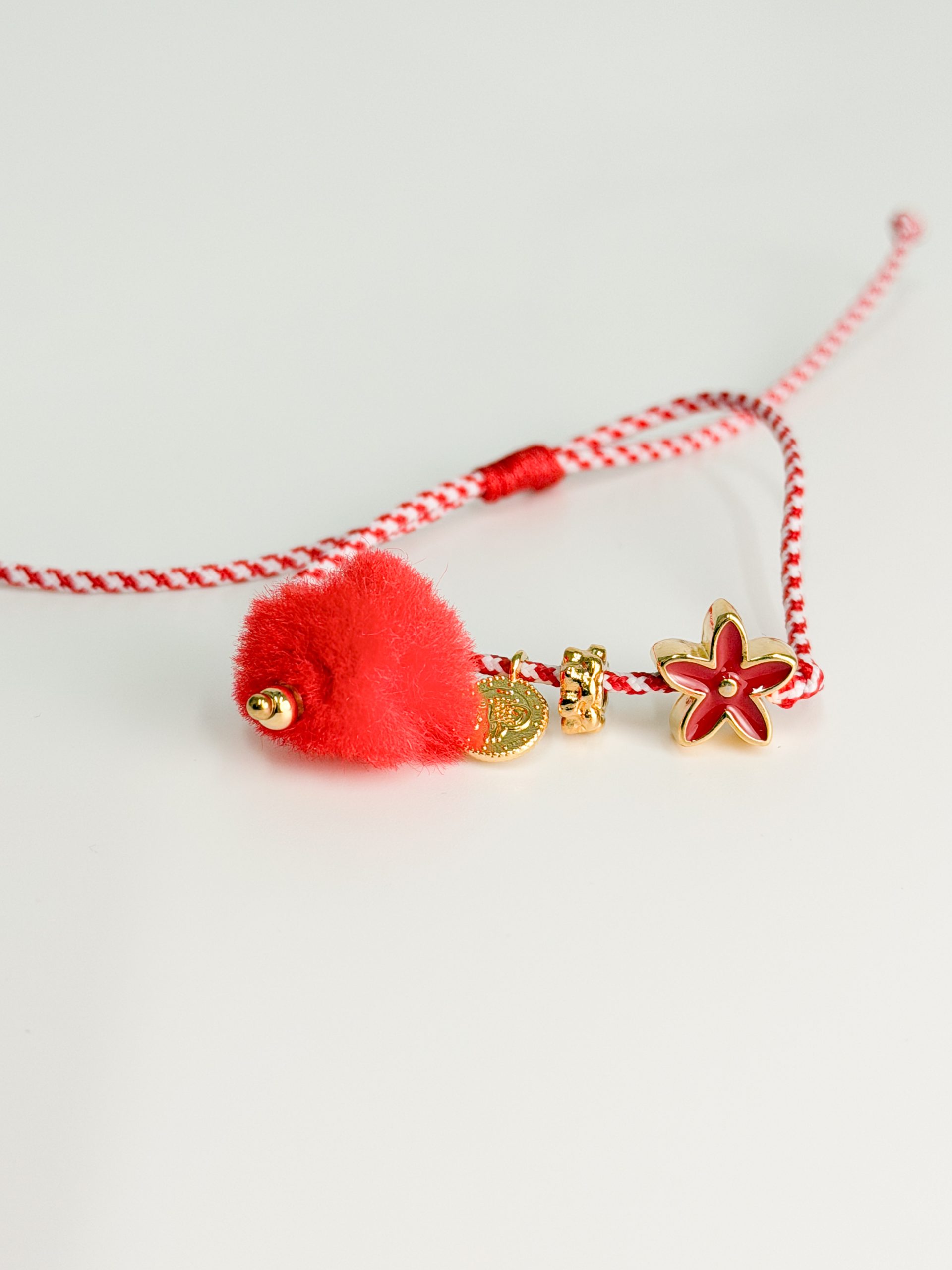 Μαρτάκι με κόκκινο πομ πομ,μοτιφ λουλούδι και επιχρυσωμένα στοιχεία.