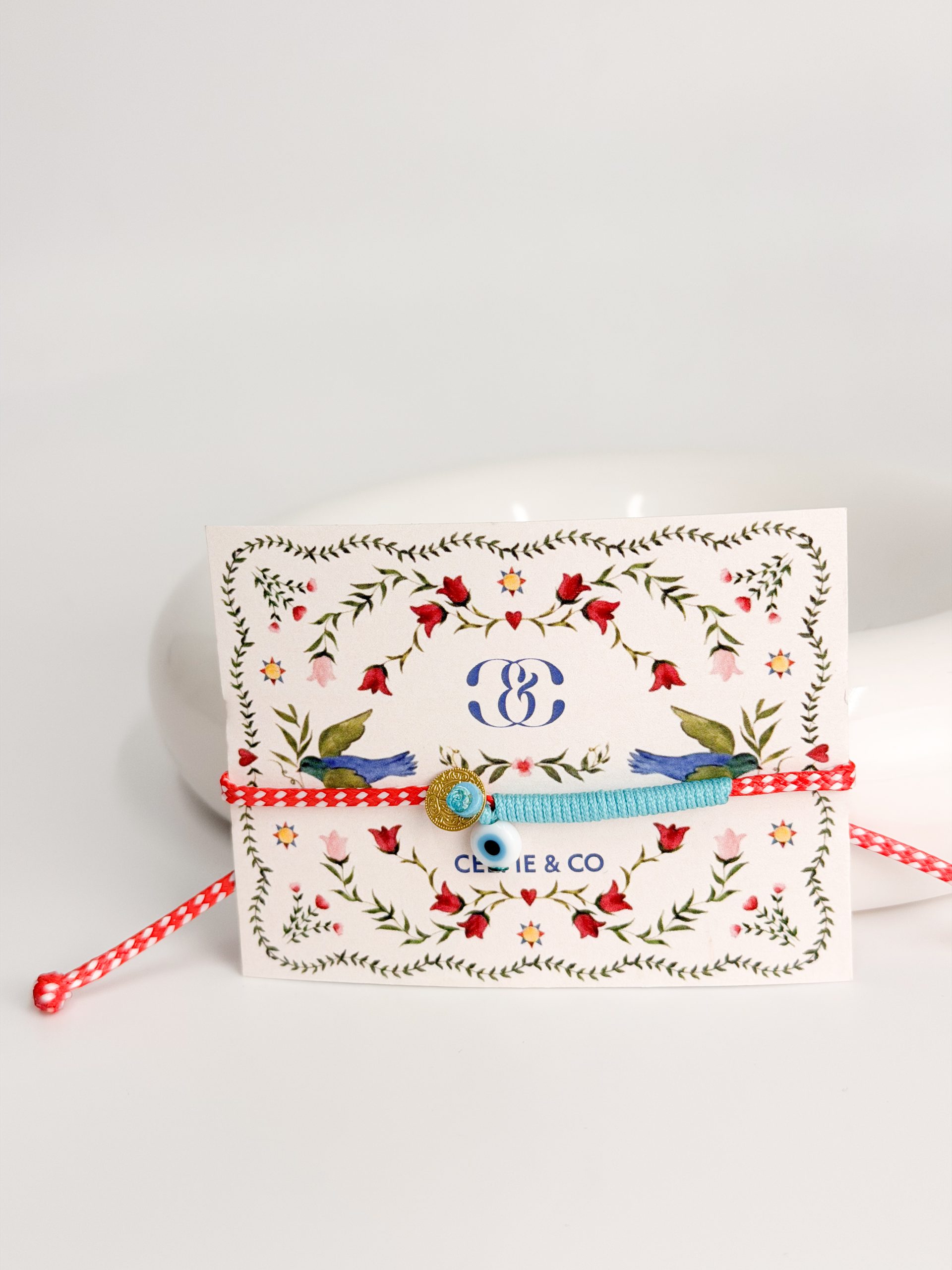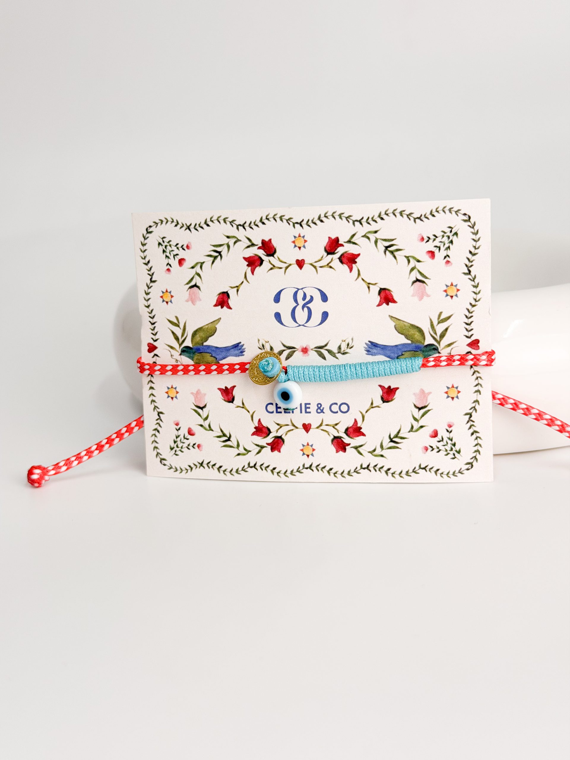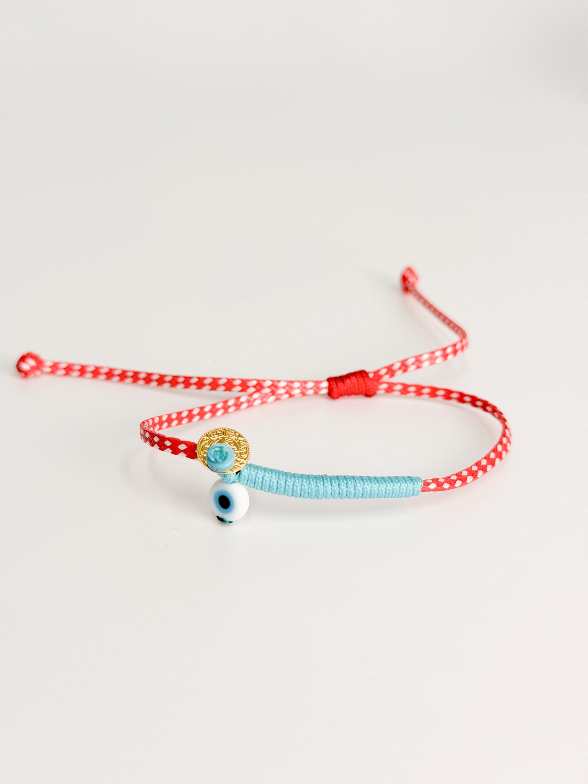Μαρτάκι με πλακε κορδόνι,γαλάζιο δέσιμο,ματάκι και φλουρί.