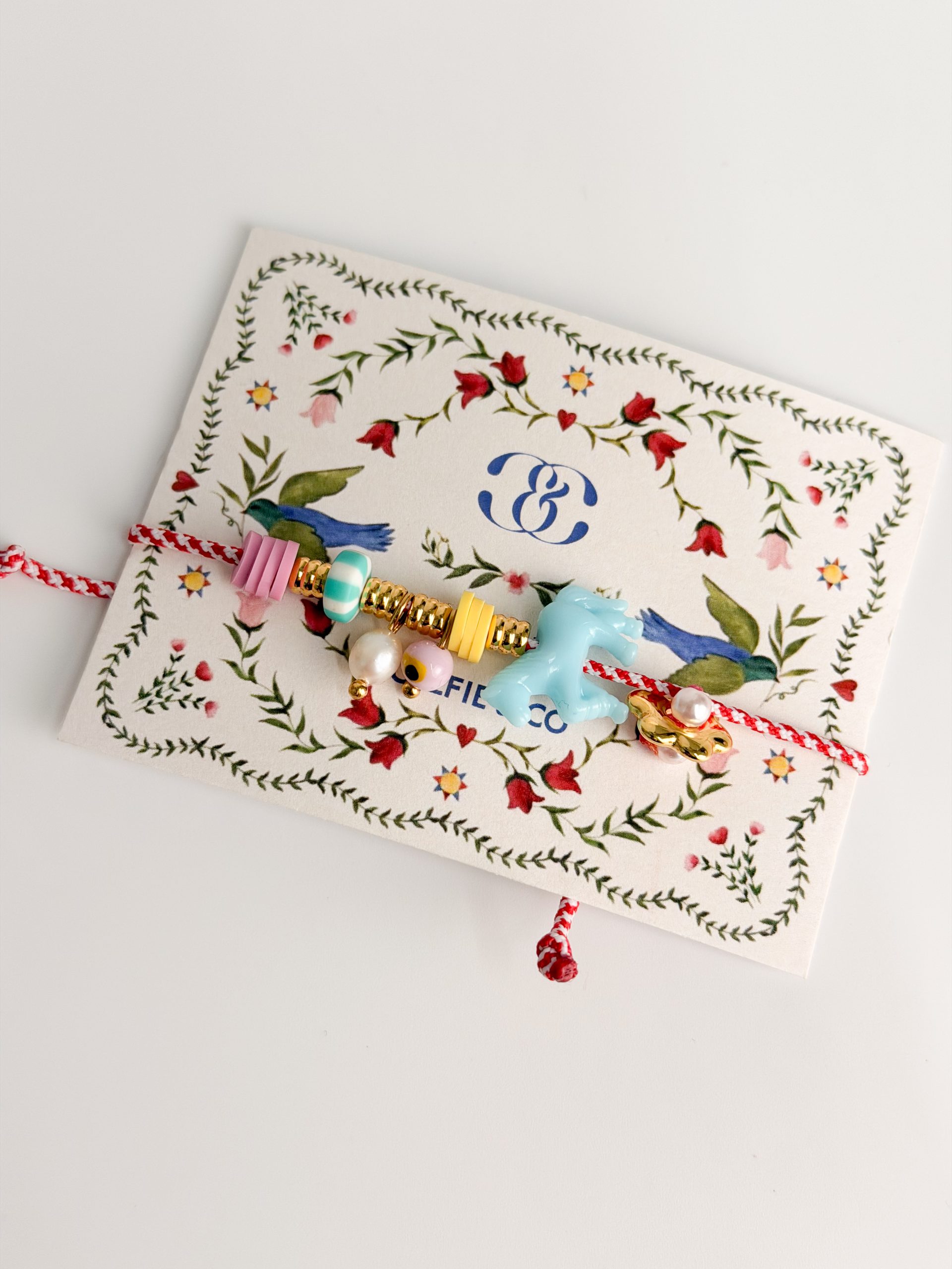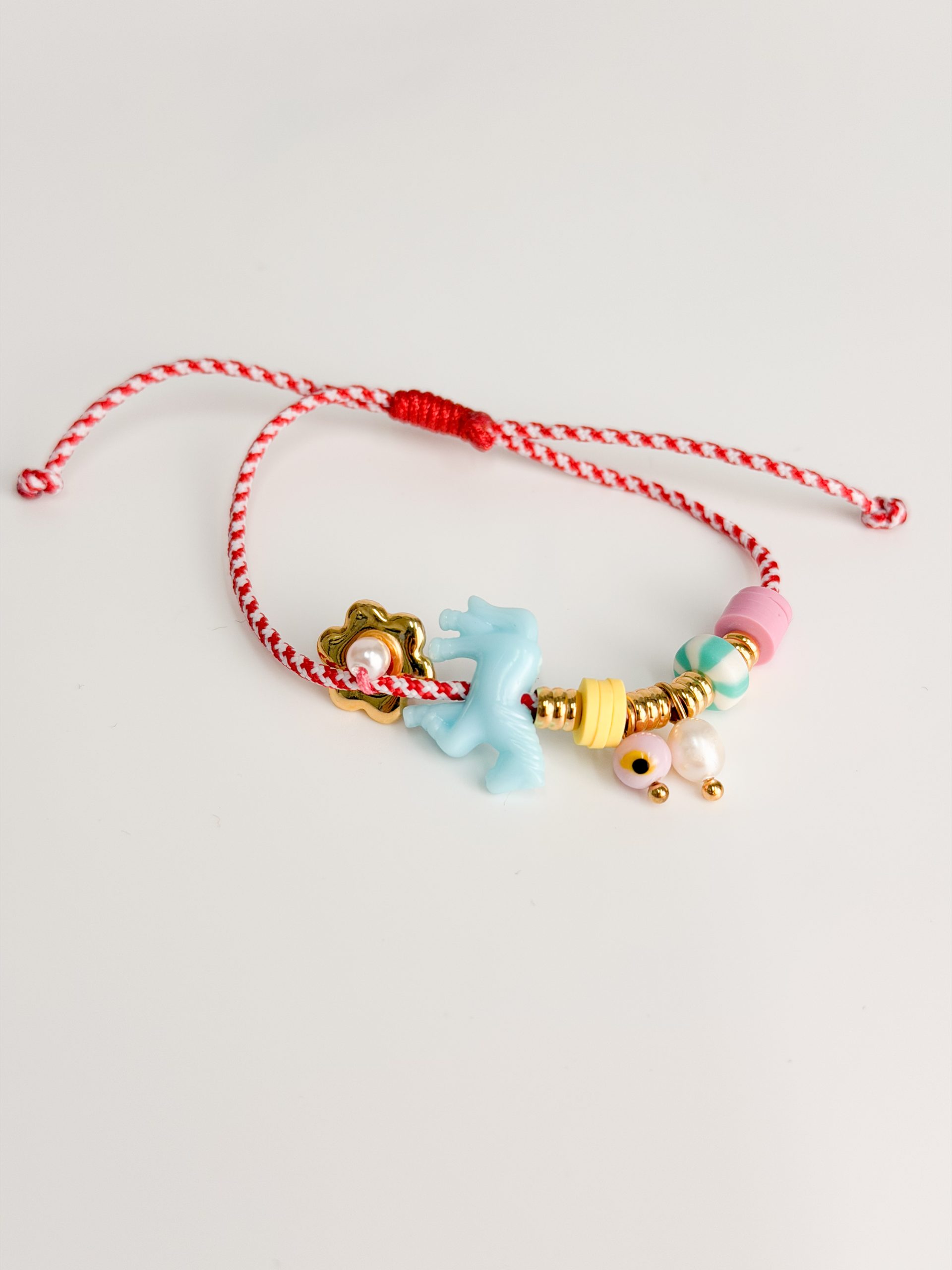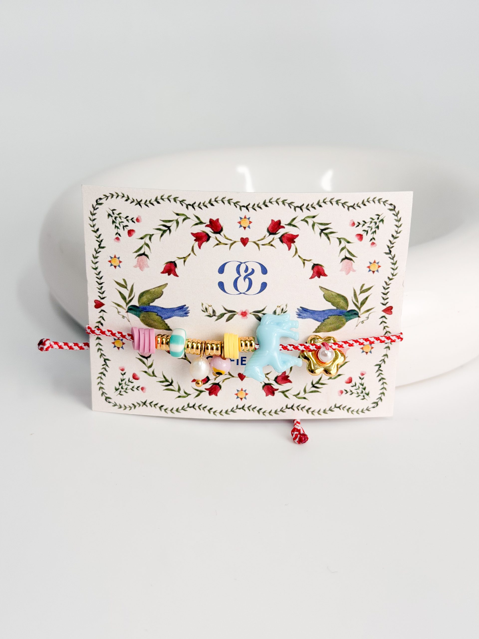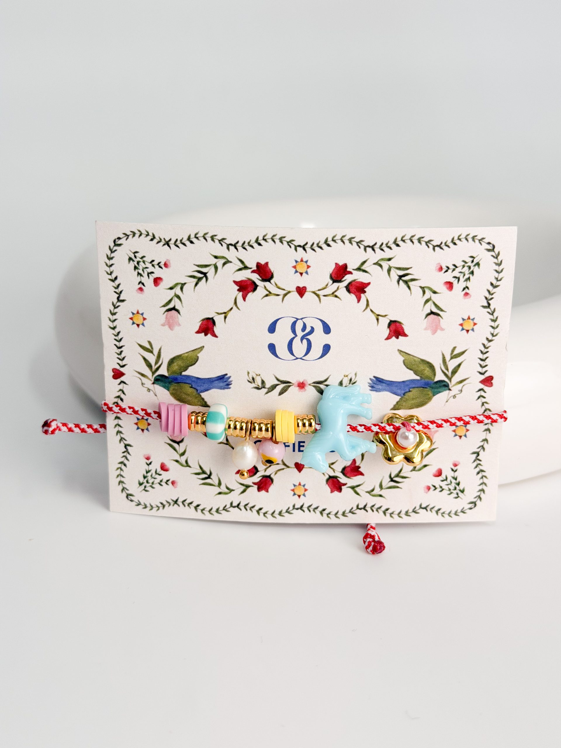 Μαρτάκι με μοτιφ άλογο,επιχρυσωμένο σταυρό,ματάκι,ροδέλες χρωματιστές και περλίτσες. Η αλλαγή στο χρώμα αναφέρεται στο αλογάκι.