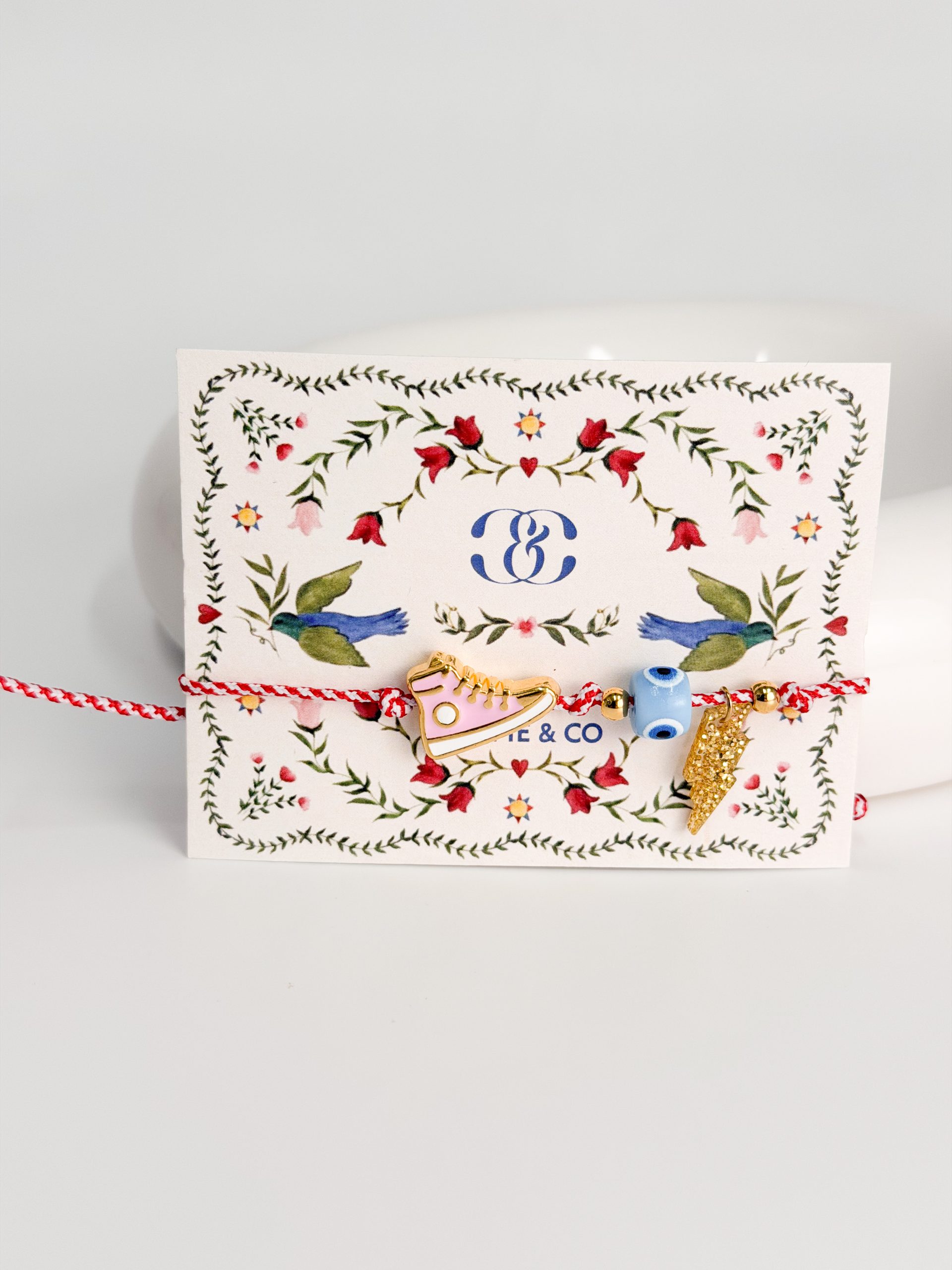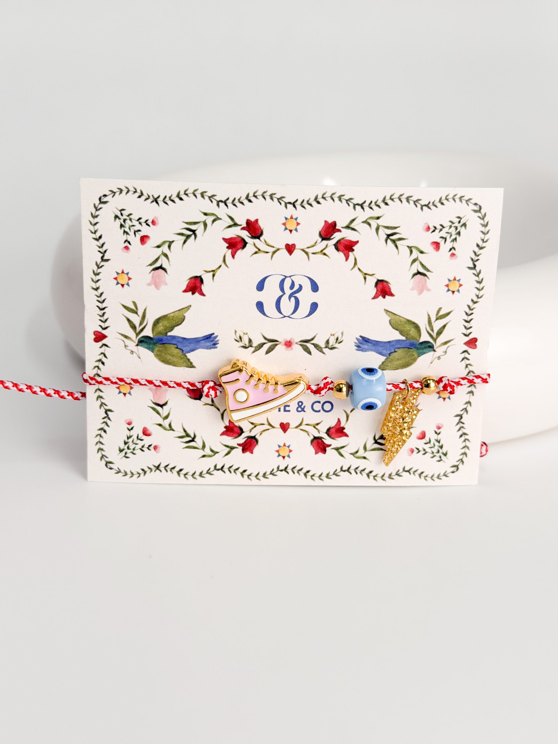 Μαρτάκι με μοτιφ αστραπή πλεξιγκλας,επιχρυσωμένο παπούτσι και ματάκι.