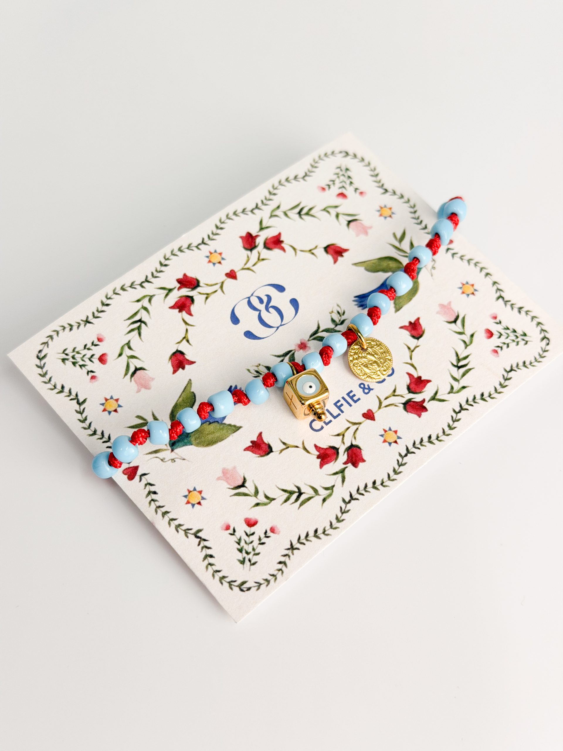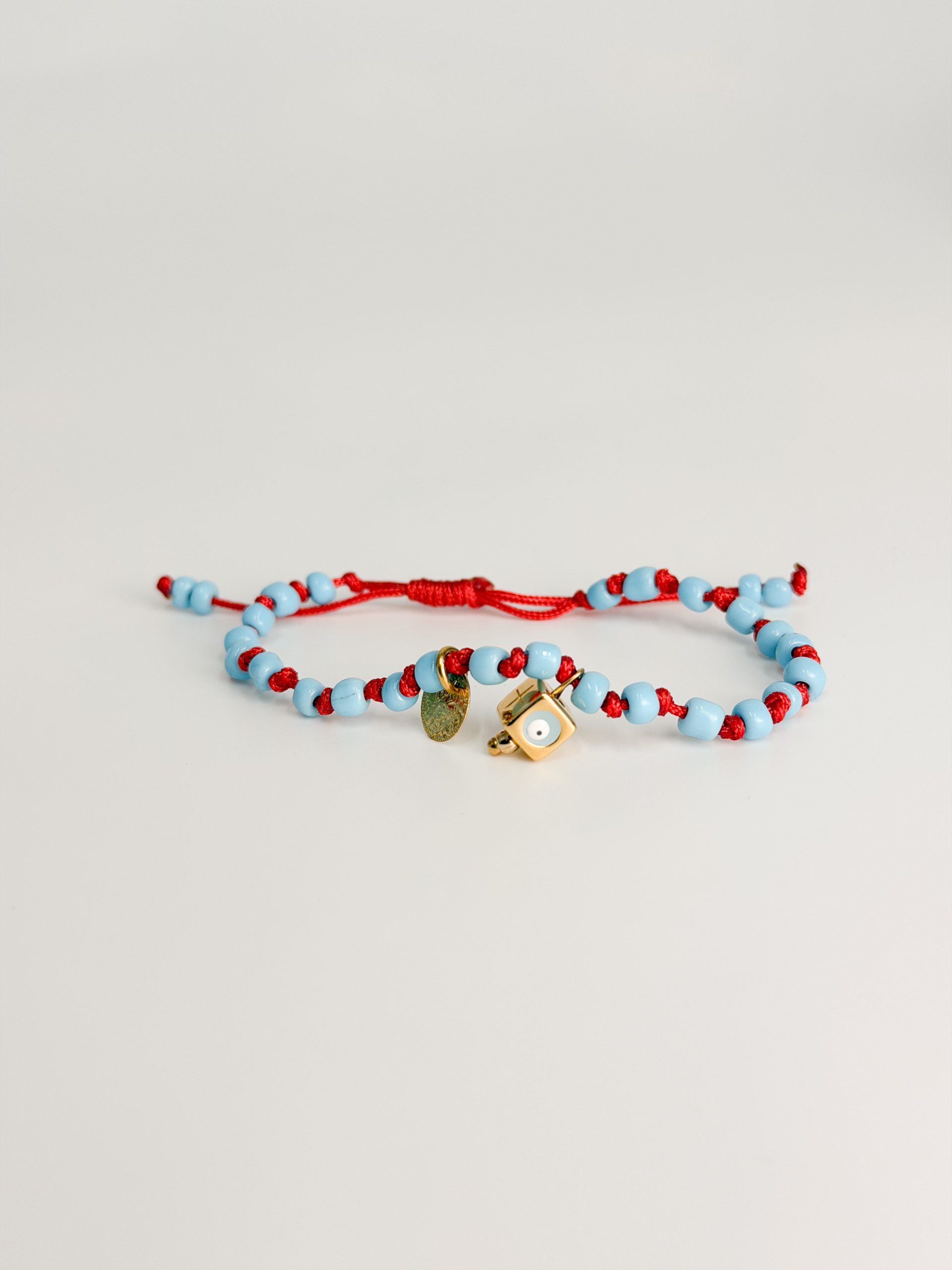 Μαρτάκι με γαλάζιες χάντρες,φλουρι,κύβο επιχρυσωμένο ματάκι και σταυρουδάκι.