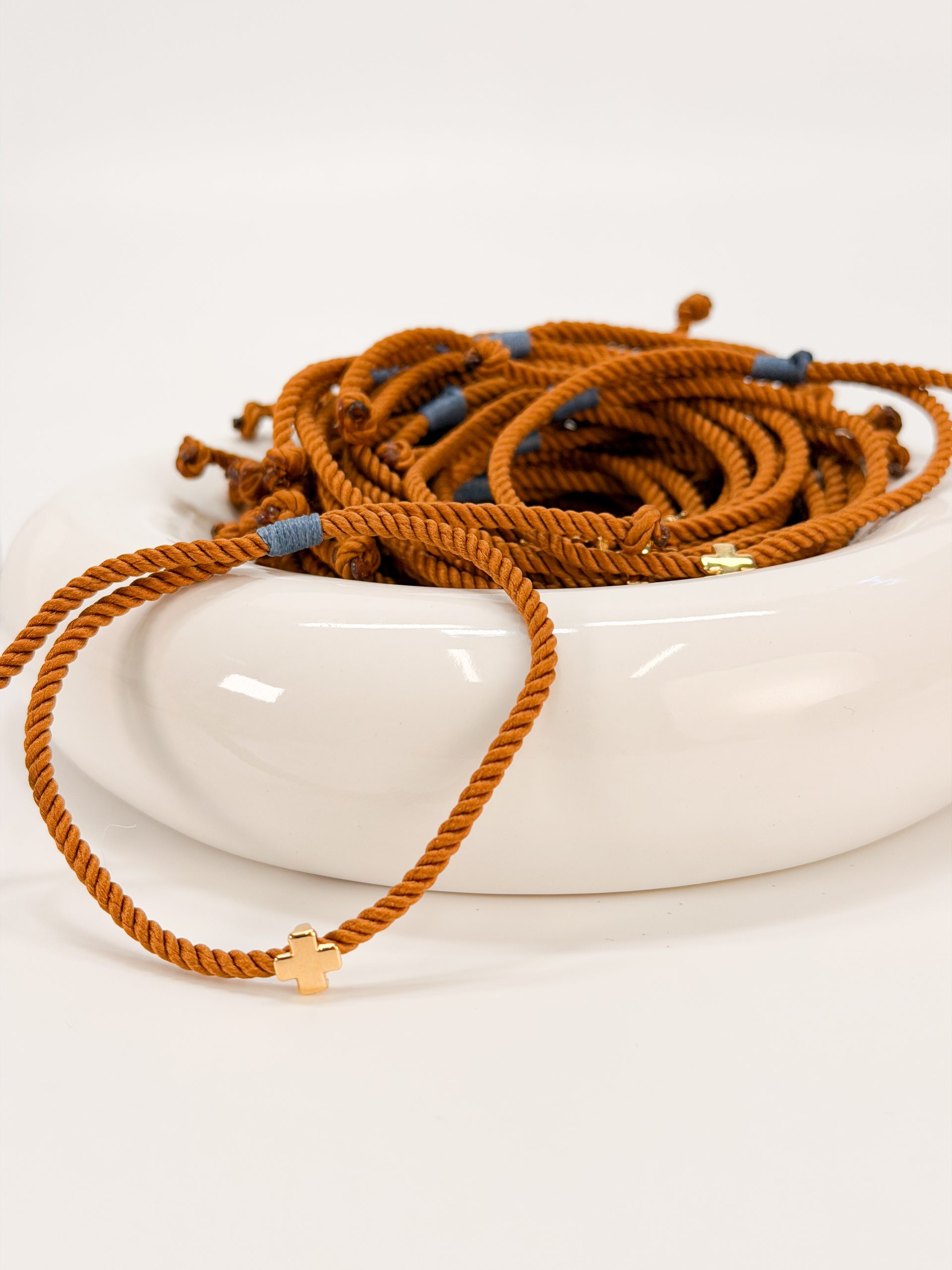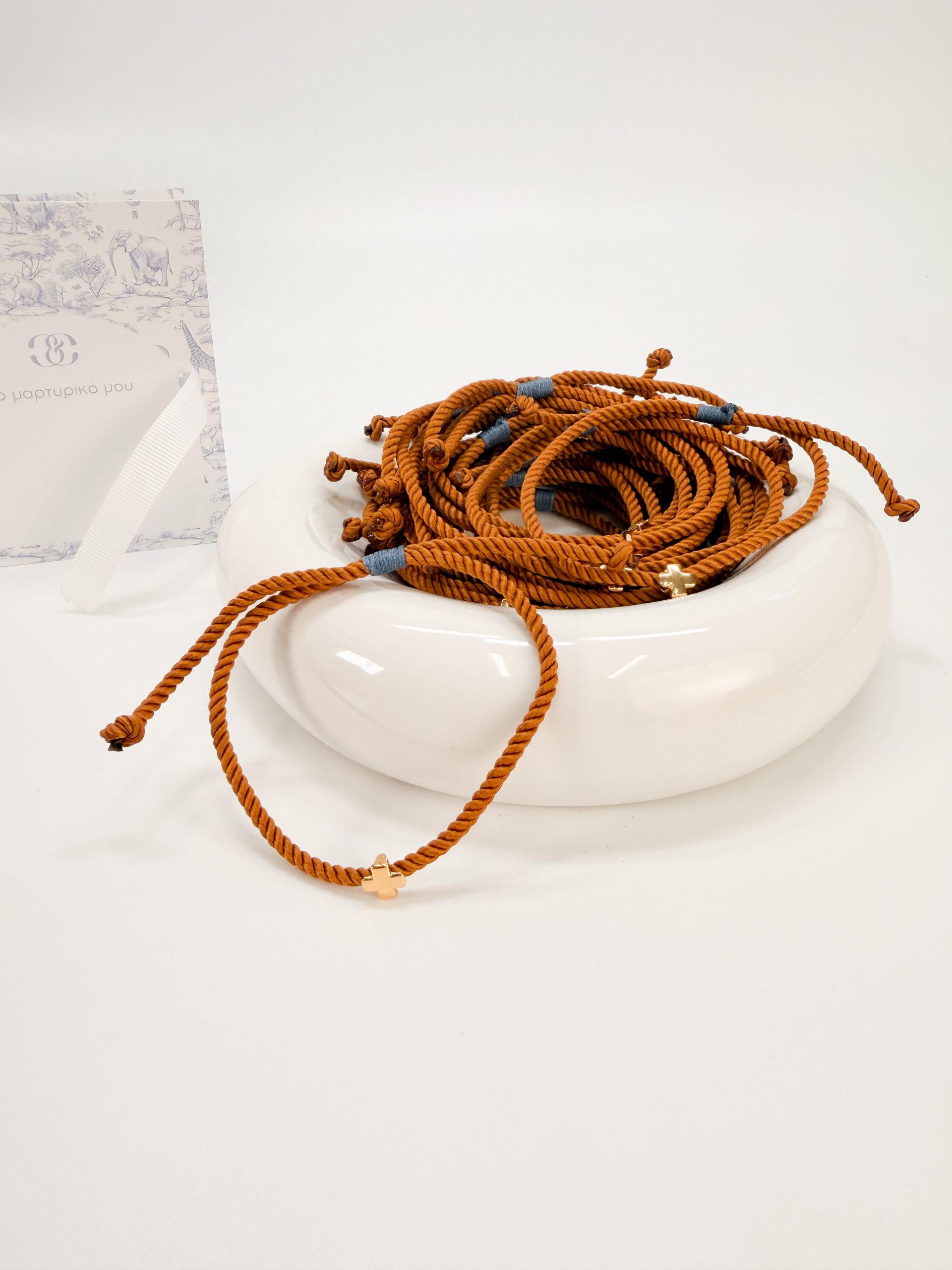 Μαρτυρικό βραχιόλι με στριφτό κορδόνι σε καφέ απόχρωση,μπλε δέσιμο και επιχρυσωμένο σταυρό.
