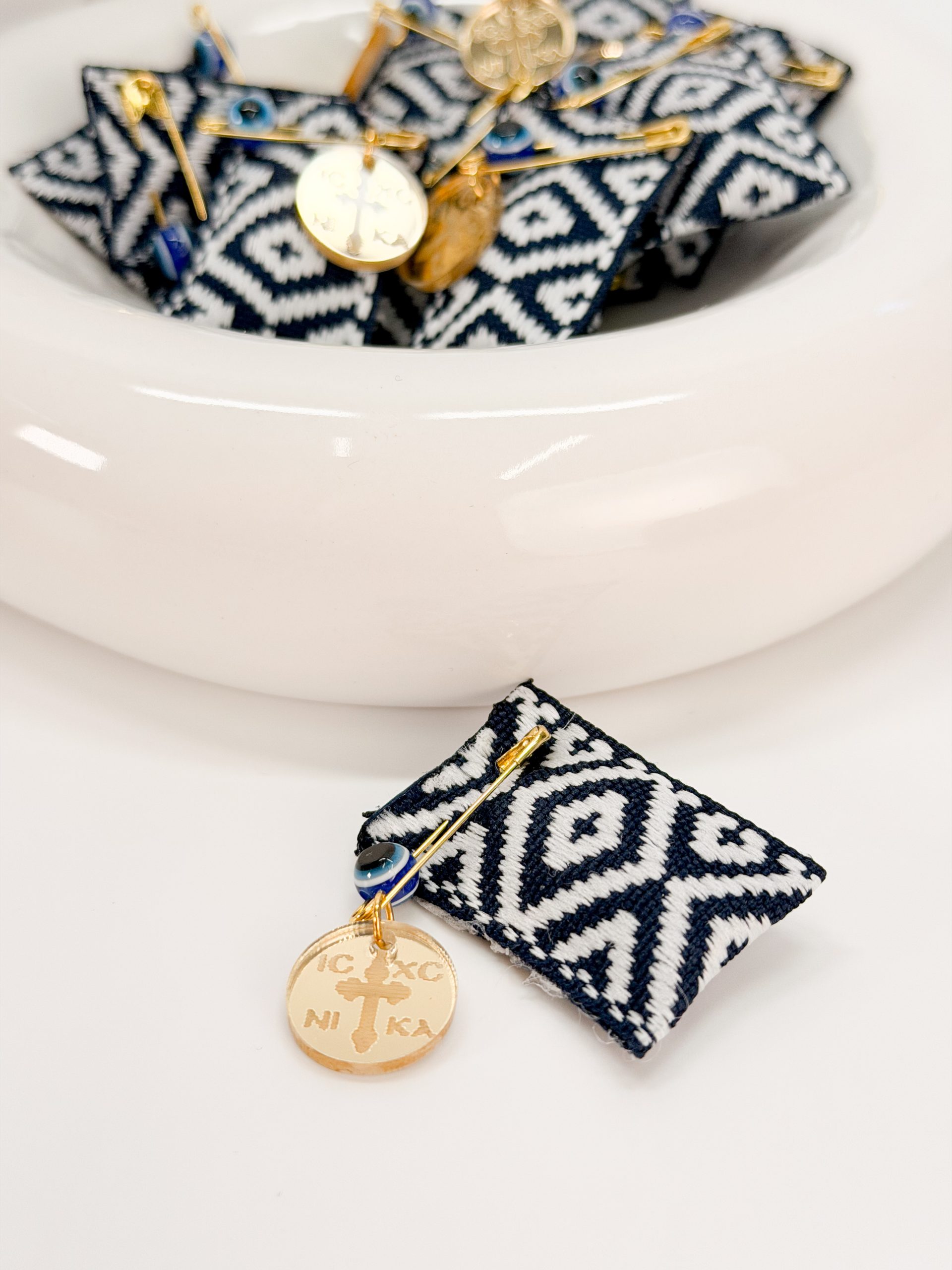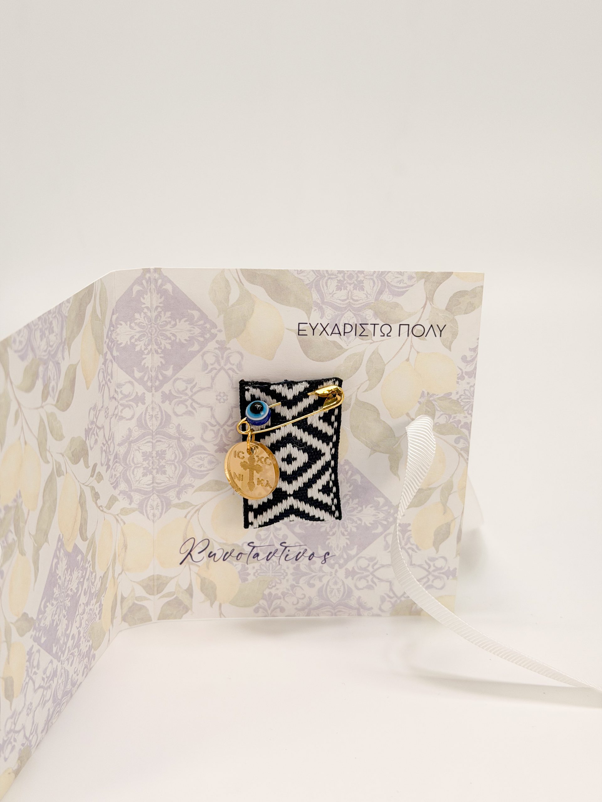 Μαρτυρικό πέτο με δίχρωμη τρέσα σε μπλε-ασπρη απόχρωση,μπλε μάτι και plexiglass σταυρό κωνσταντινάτο.