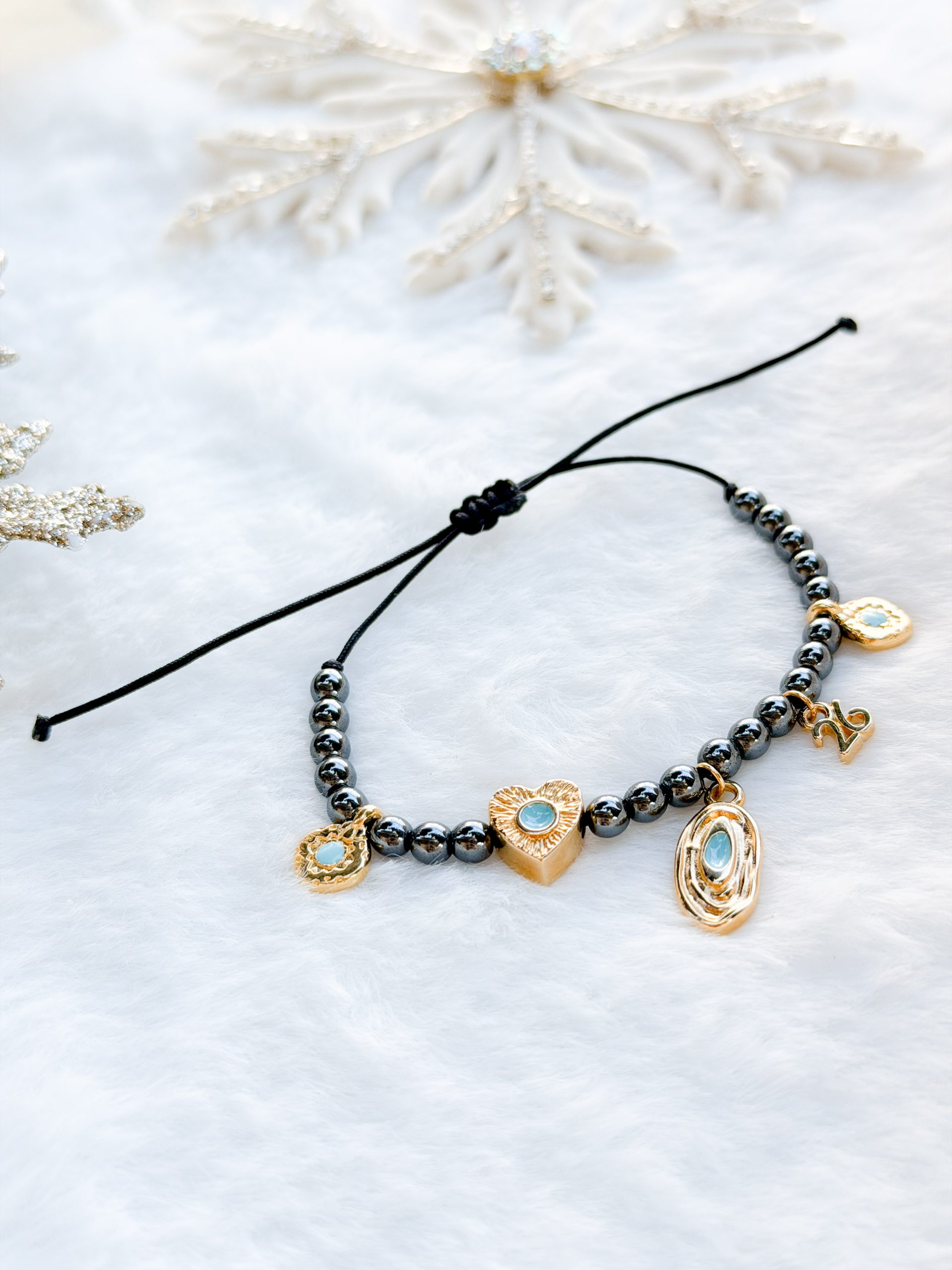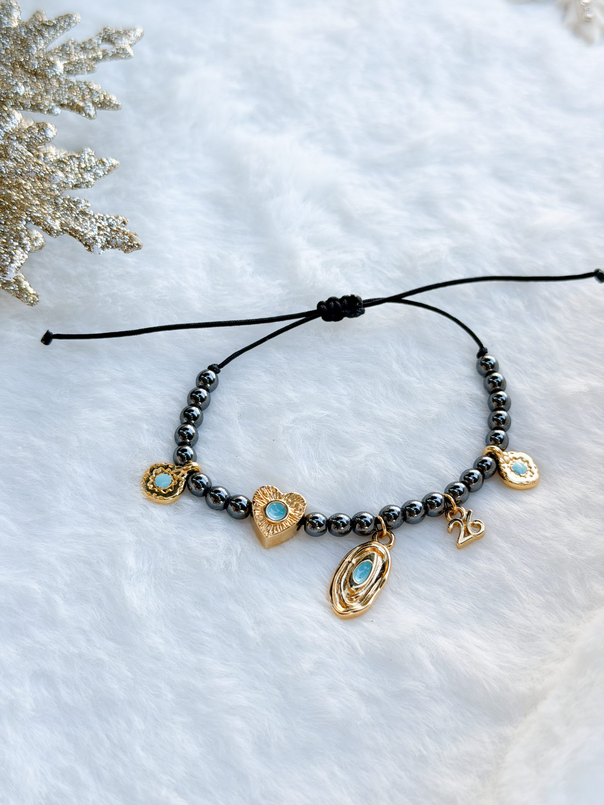 Βραχιολάκι με χάντρες αιματίτης και χρυσά επιχρυσωμένα μοτιφ.