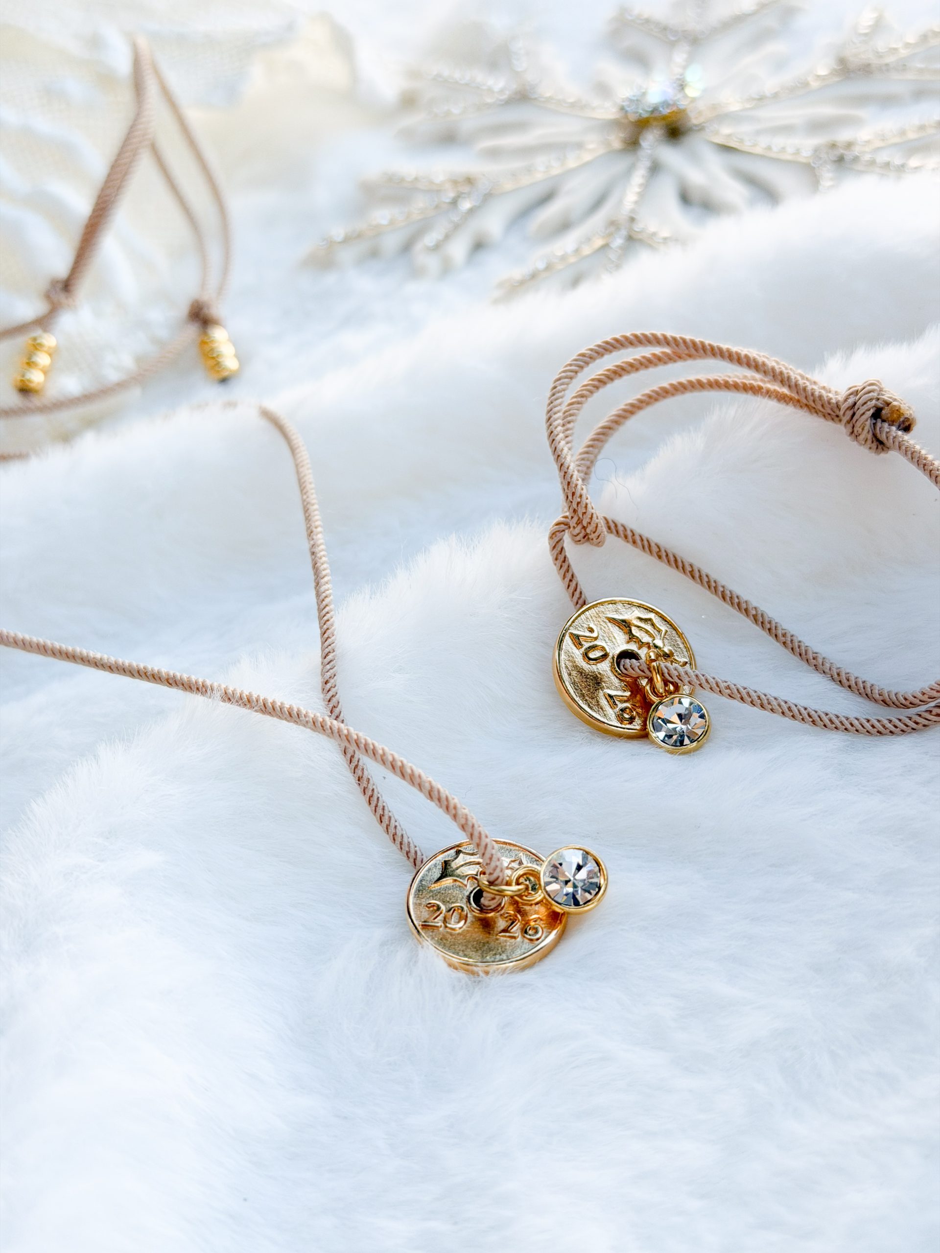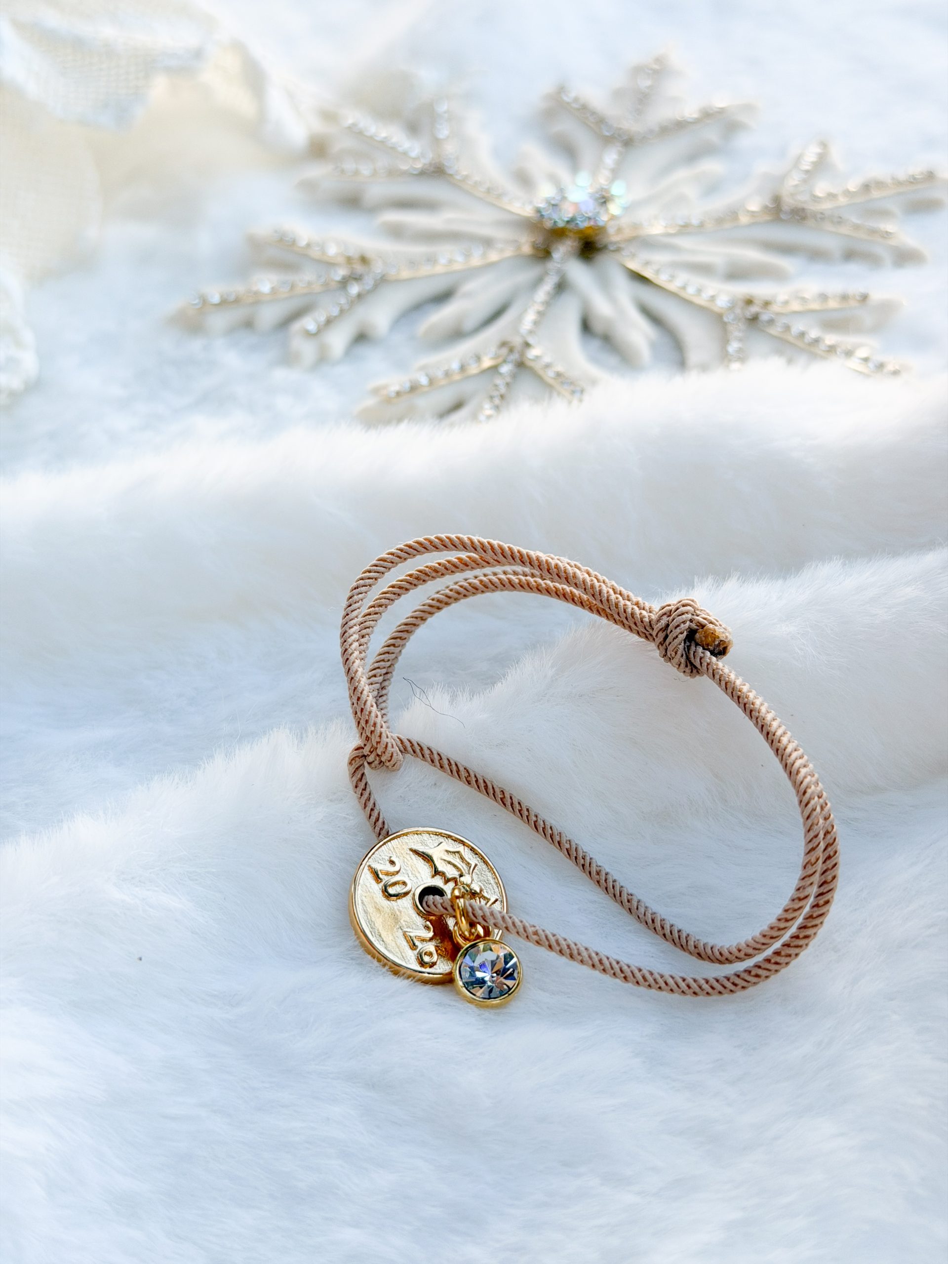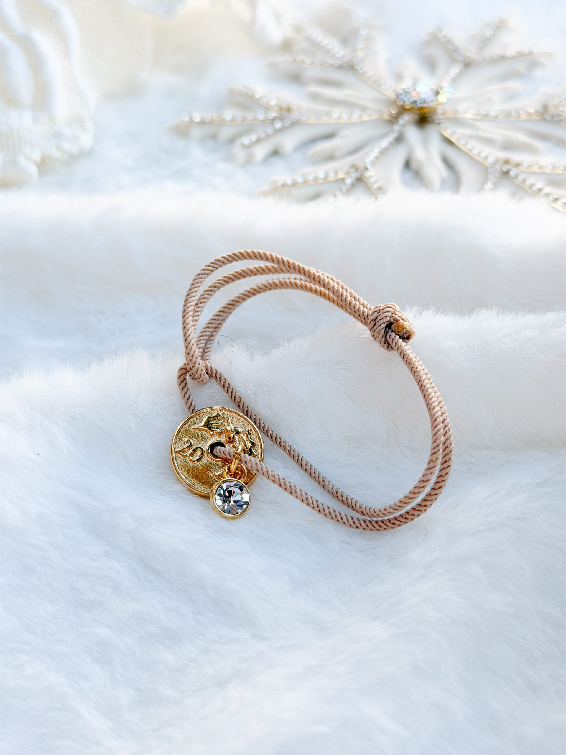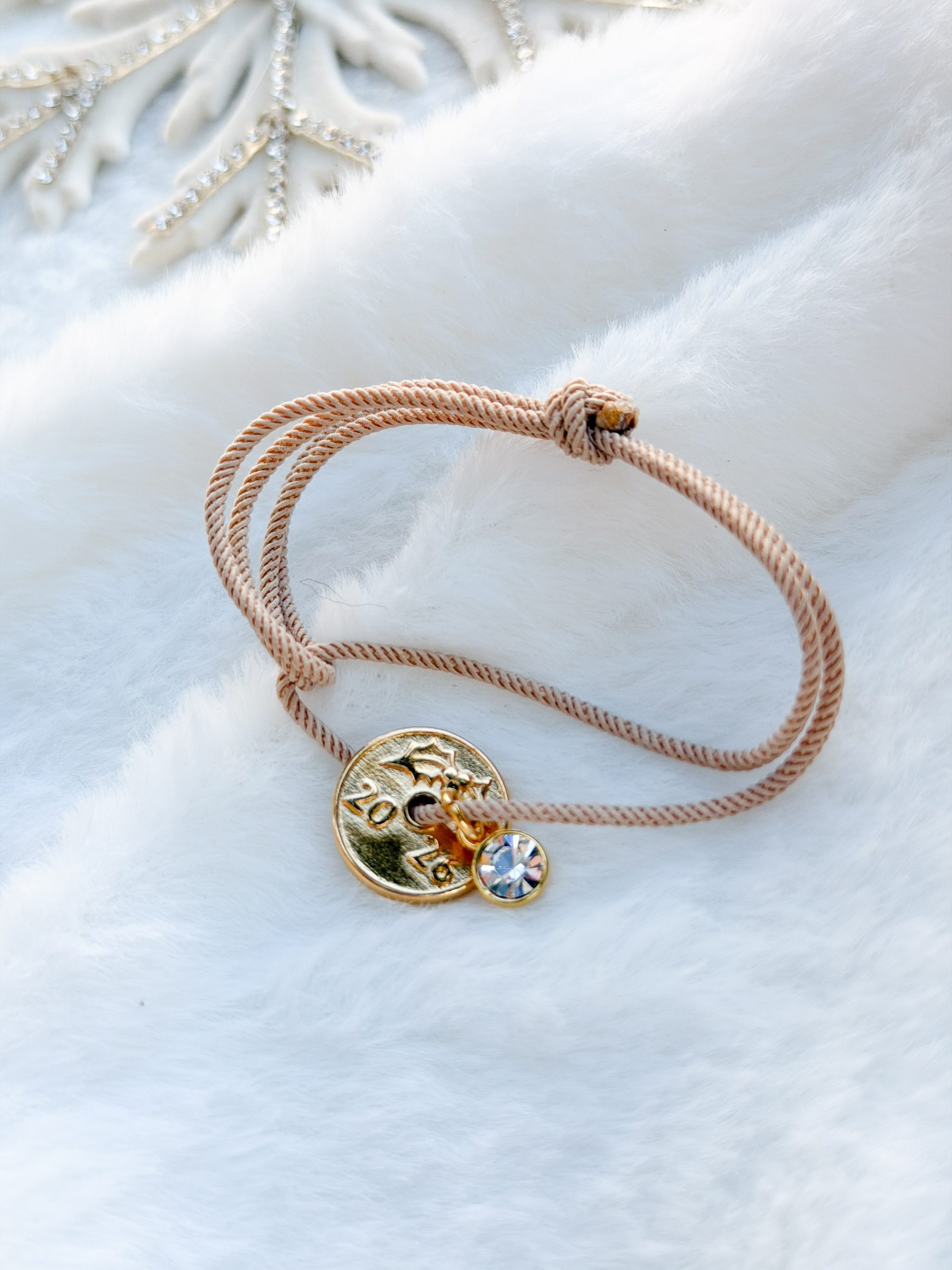 Βραχιολάκι με μπεζ στριφτο κορδόνι,φλουρί και σβαρόφσκι.