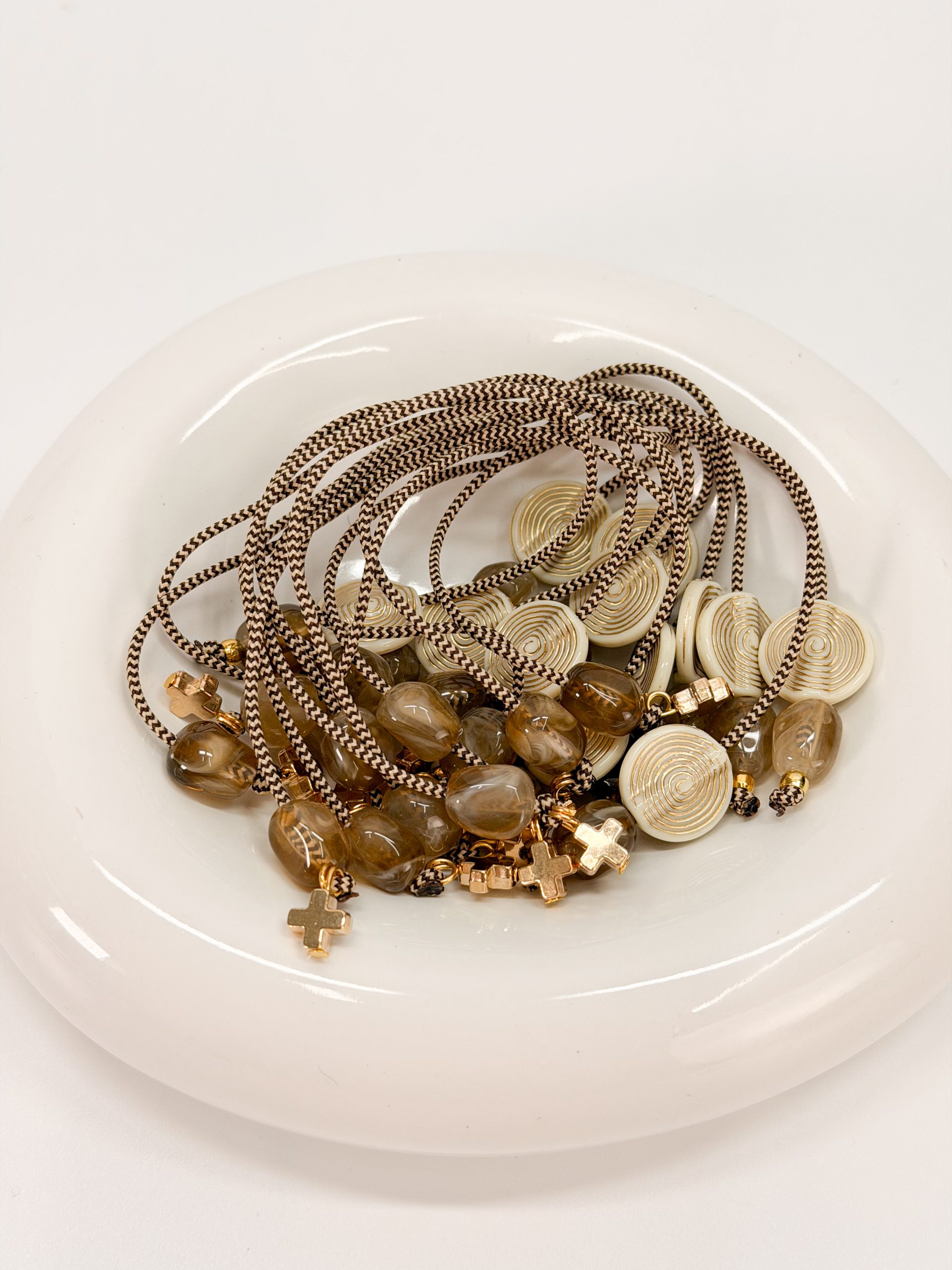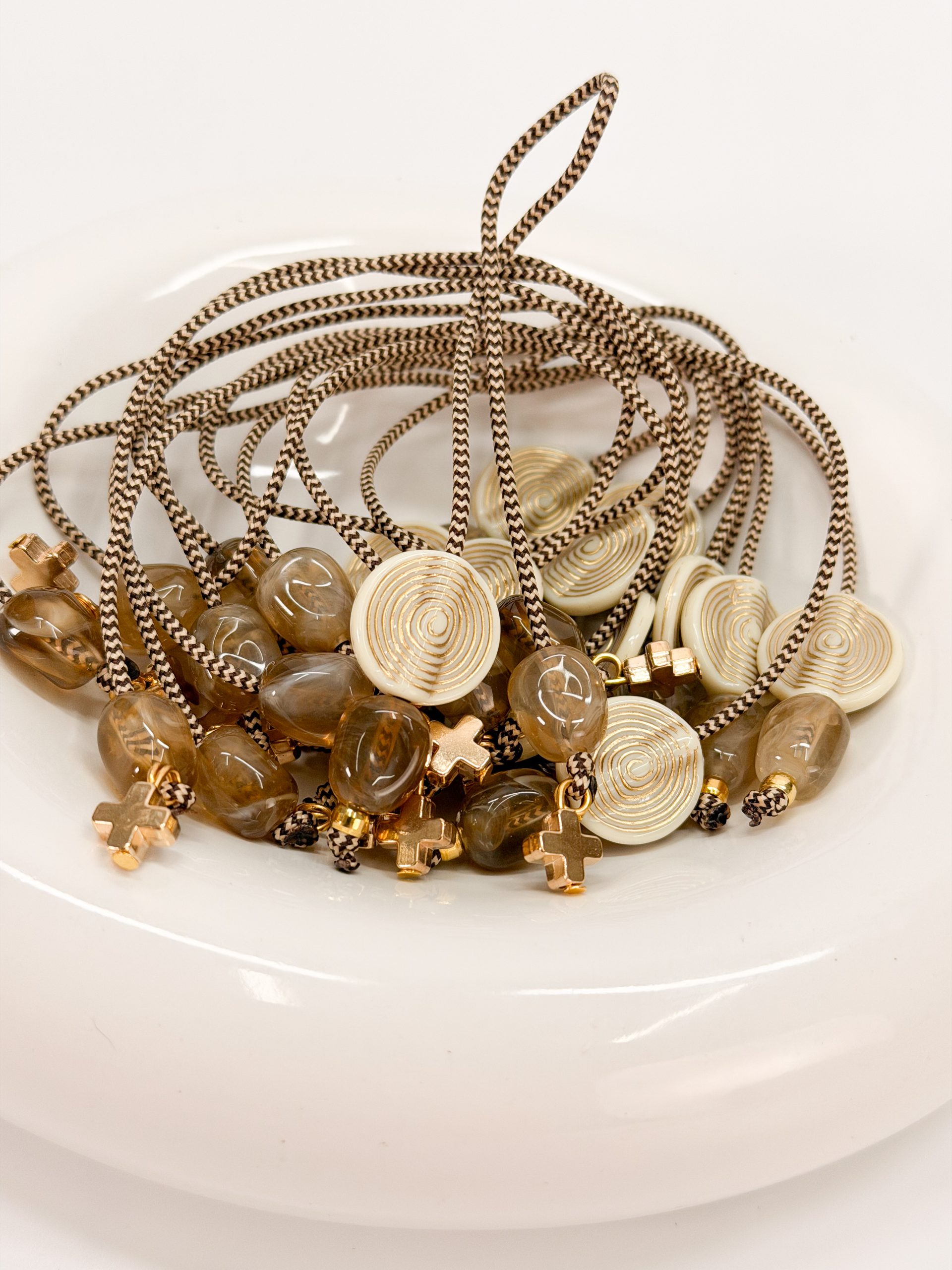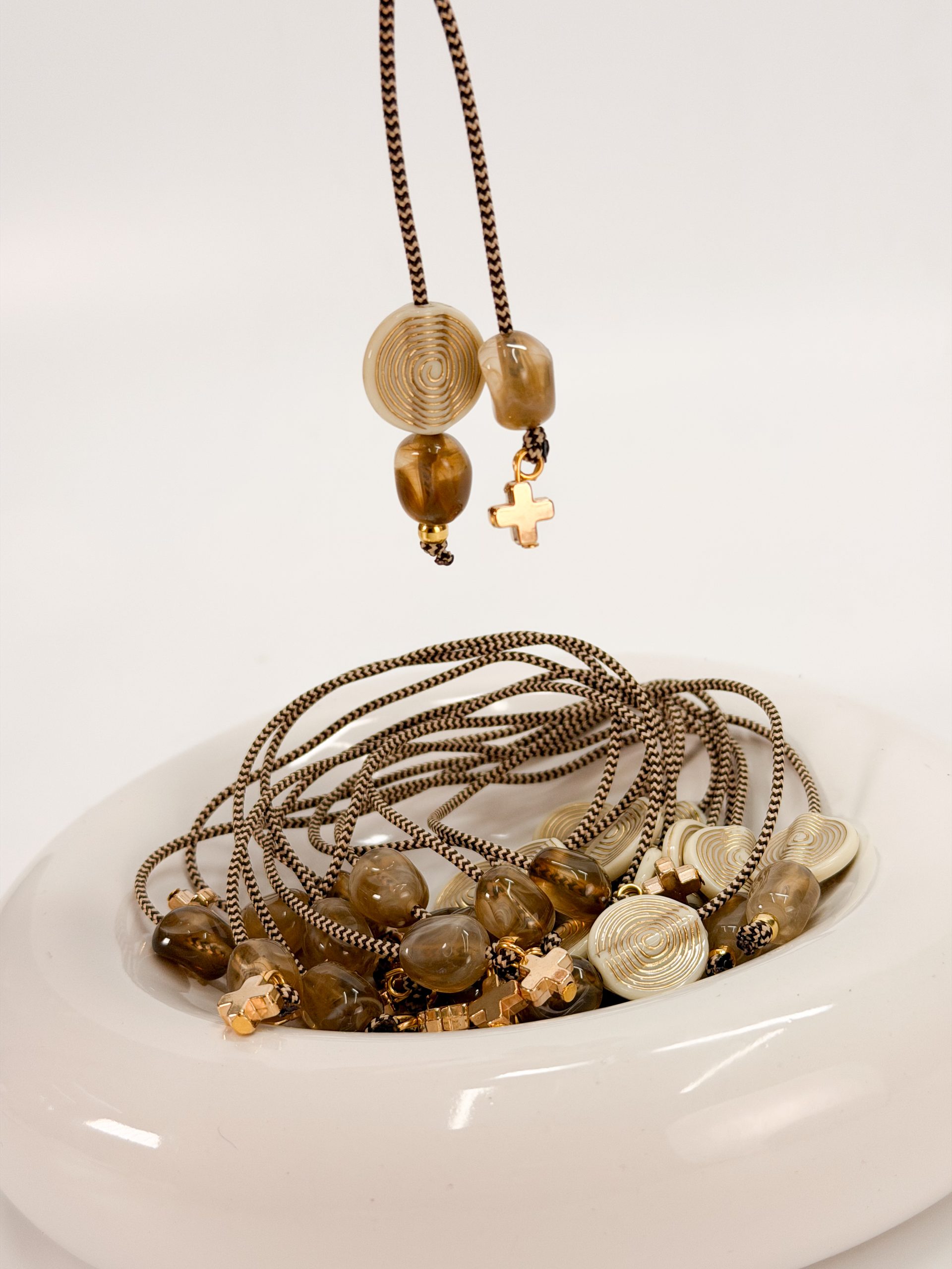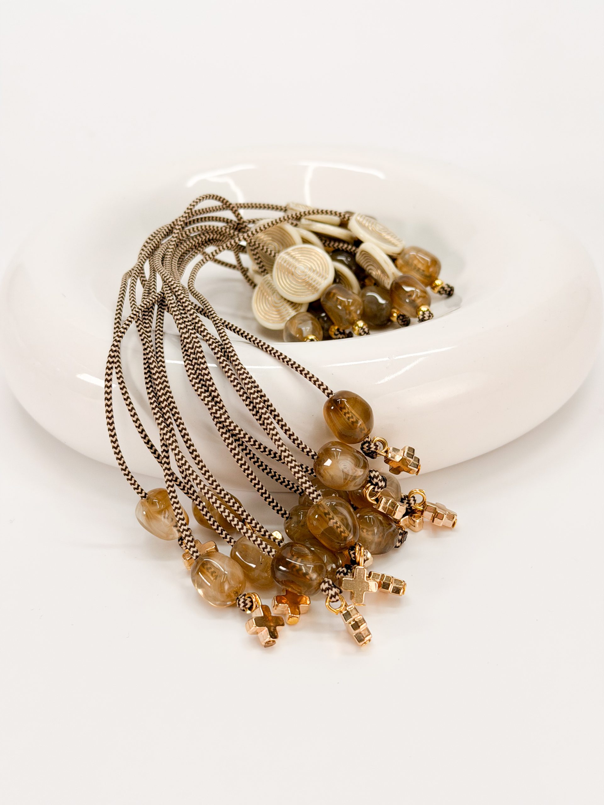 Μαρτυρικό μπεγλέρι με δίχρωμο κορδόνι,ακρυλικό σταυρό,καφέ χάντρες και μοτιφ στρογγυλό σε χρυσό άσπρο.