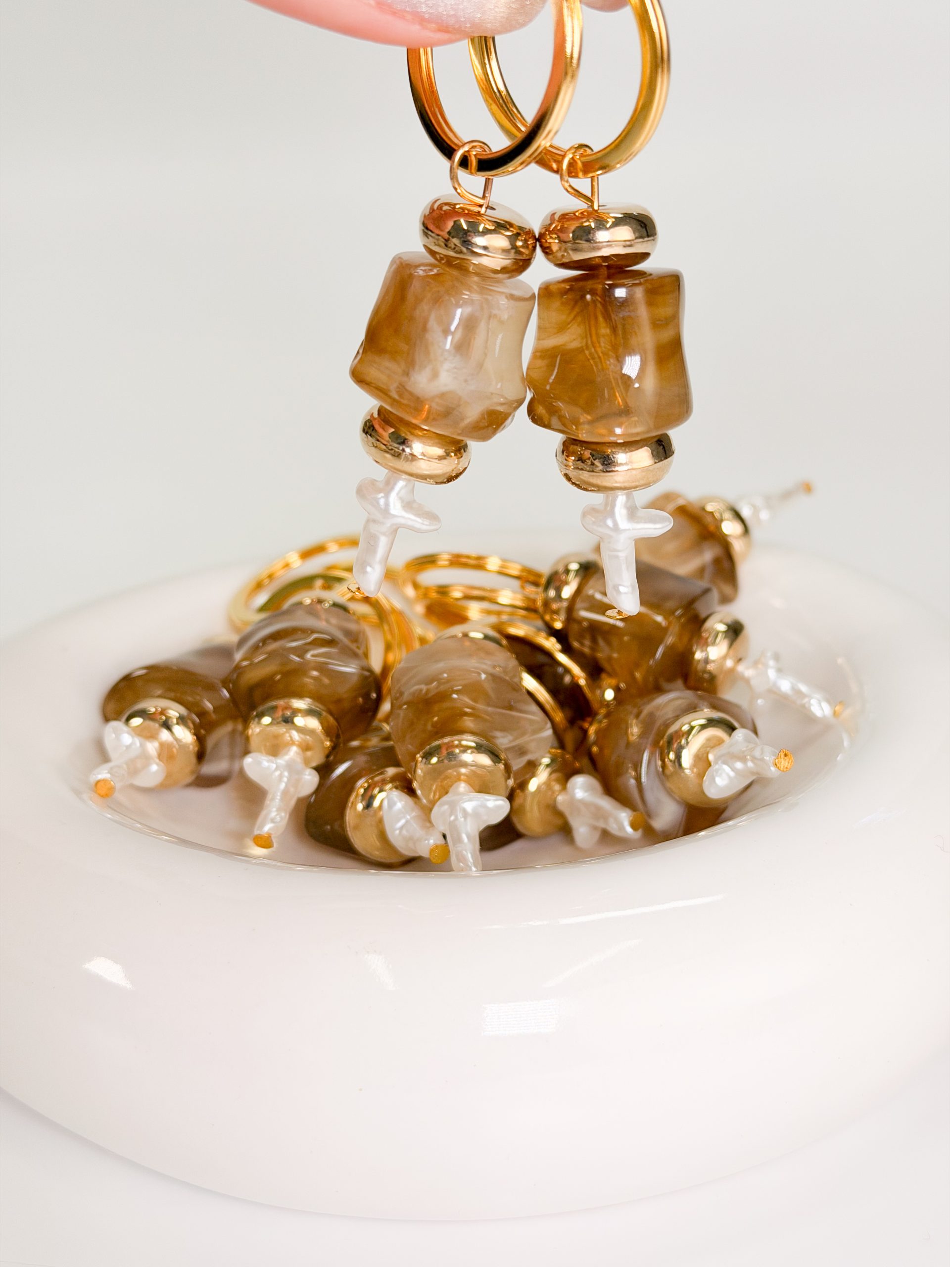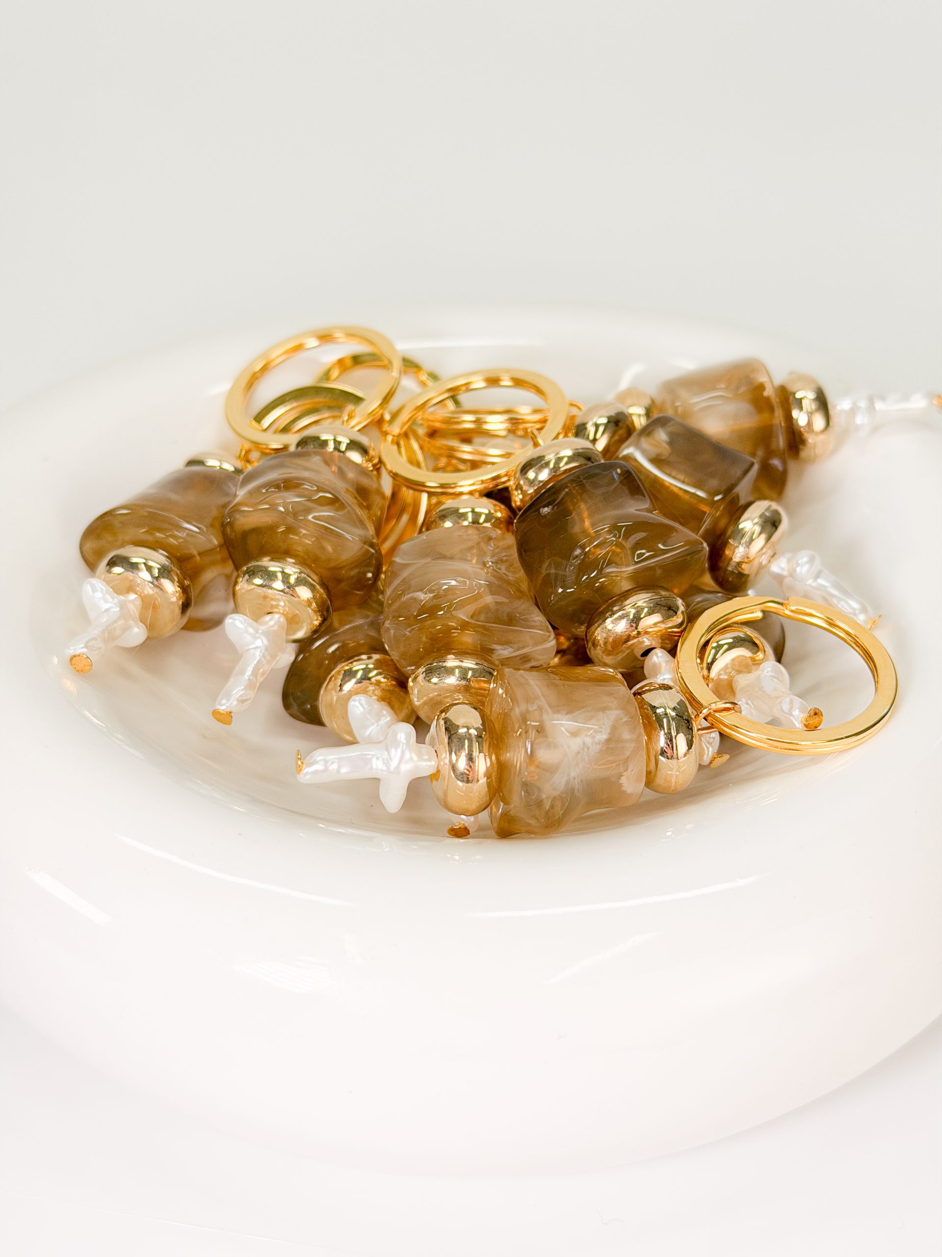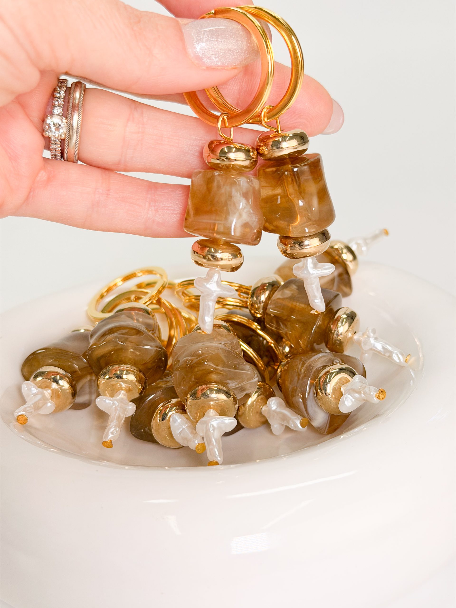 Μαρτυρικό μπρελόκ με ακρυλική μεγάλη καφέ χάντρα,μεγαλη χρυσή ροδέλα και περλέ σταυρό.
