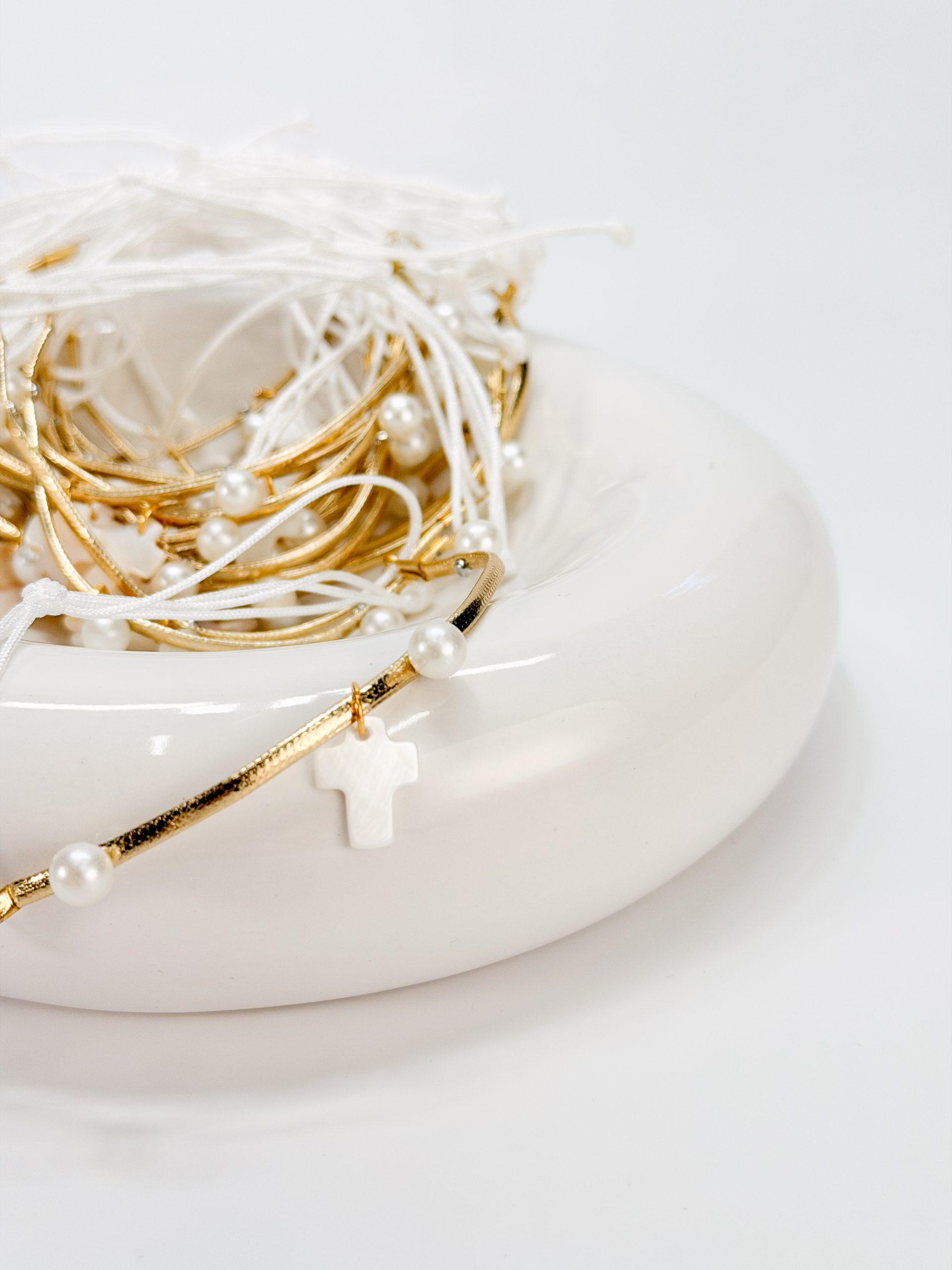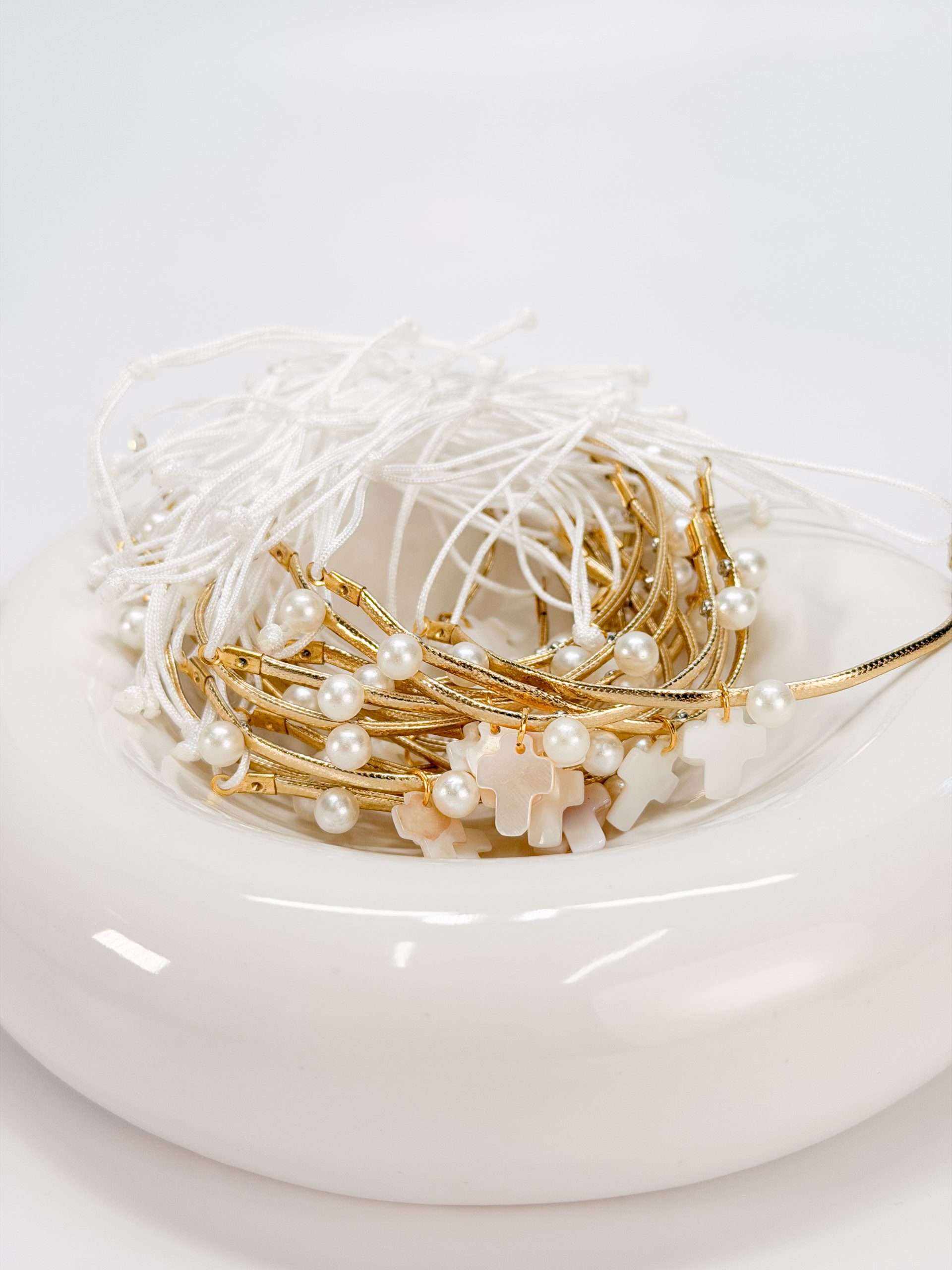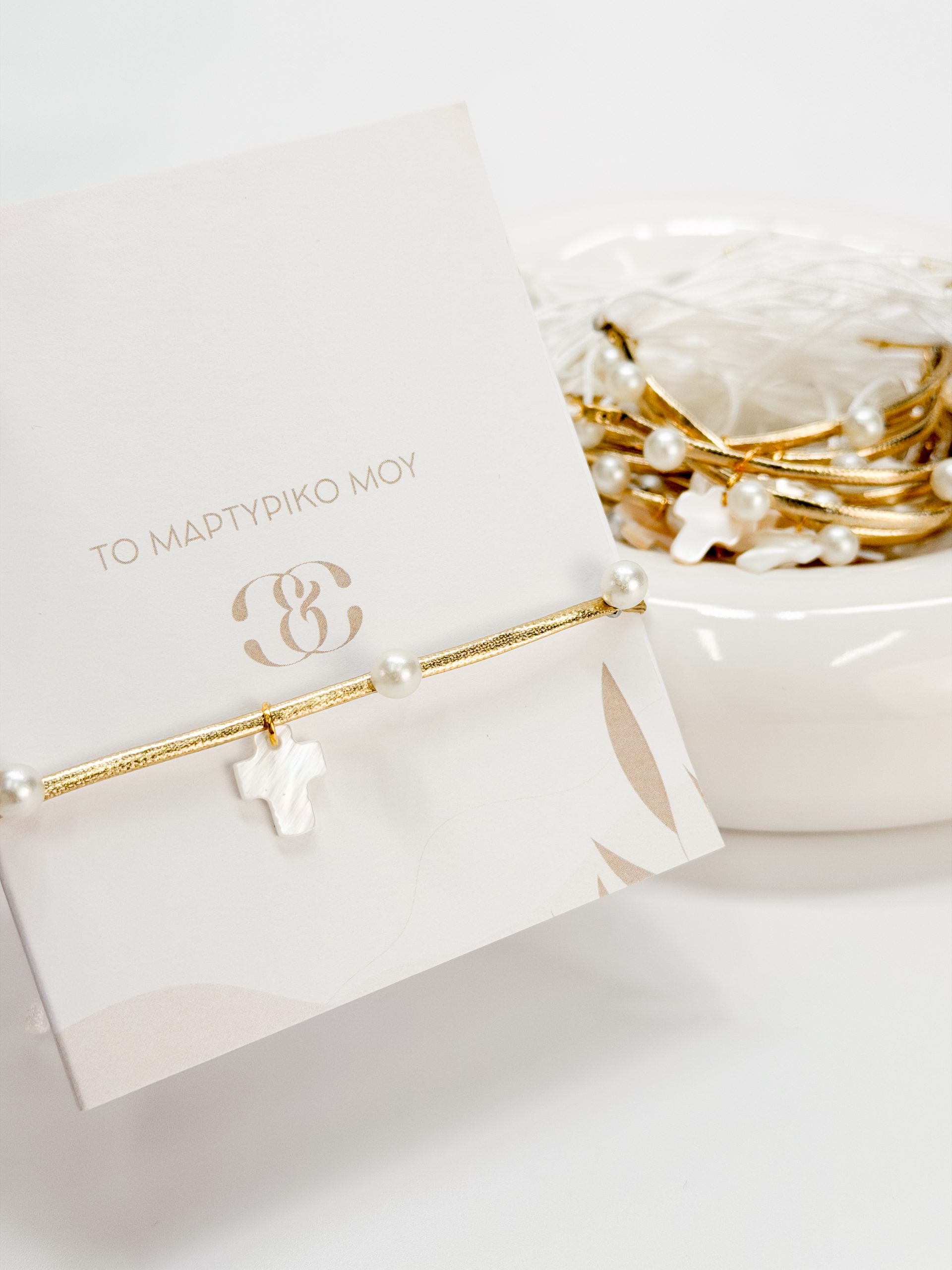 Μαρτυρικό βραχιόλι με χρυσό κορδόνι με πέρλες,φίλντισι σταυρό και λευκό σατέν δέσιμο.