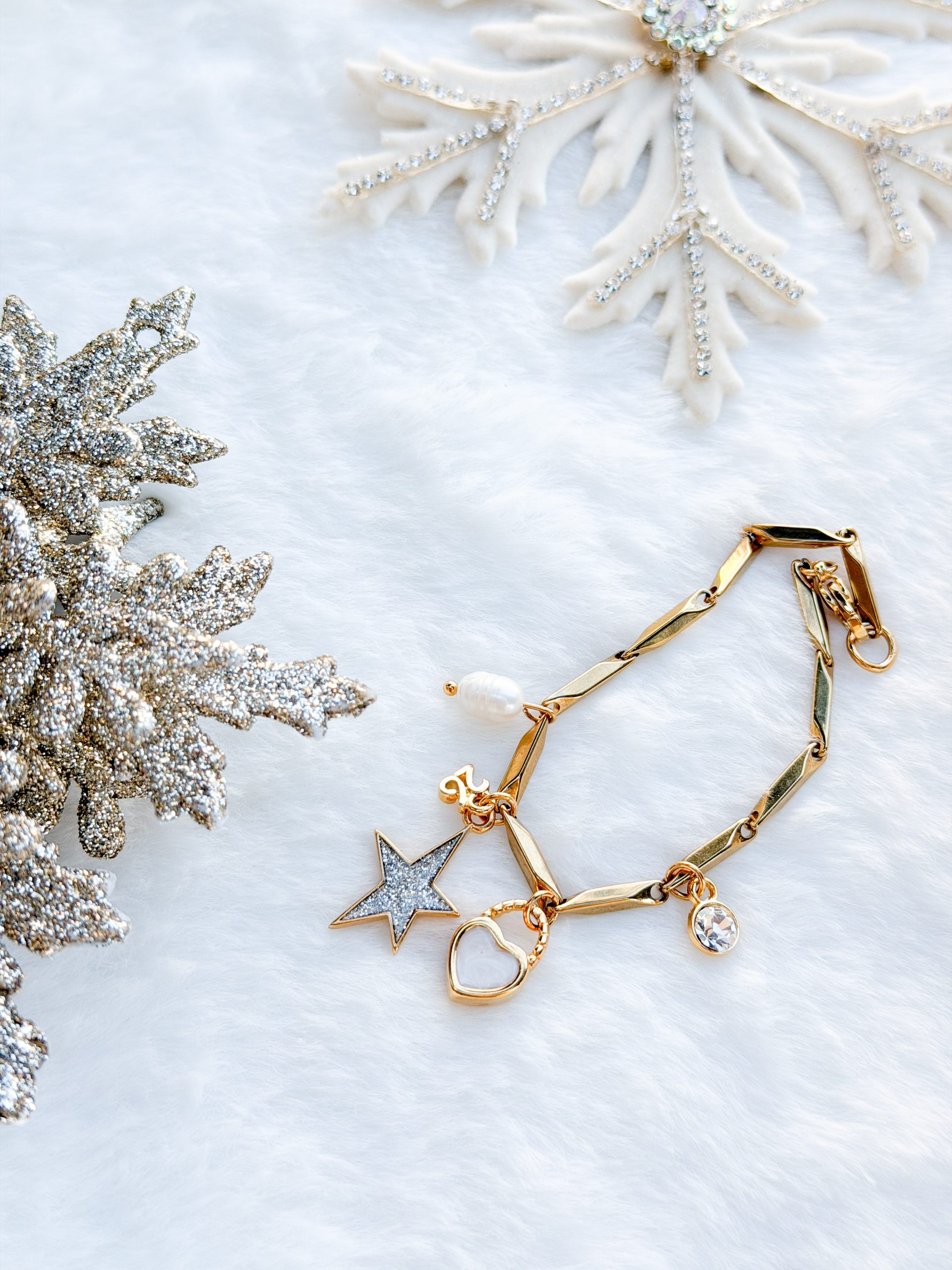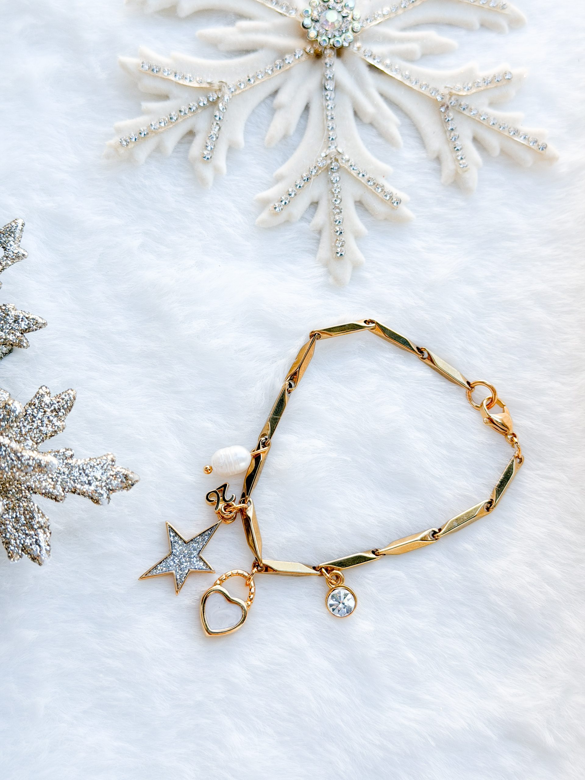 Βραχιόλι με ατσάλινη αλυσίδα ,επιχρυσωμένα μοτίφ 26,αστεράκι,καρδιά,μαργαριτάρι και σβαρόφσκι.