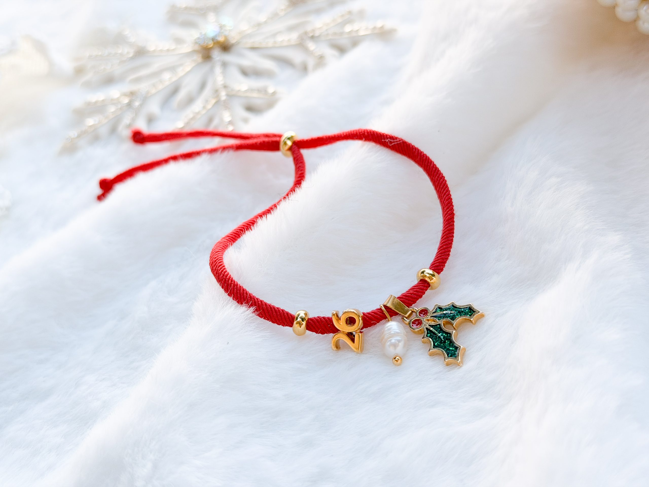 Βραχιολάκι με κόκκινο κορδόνι και επιχρυσωμένα στοιχεία κρεμαστά.