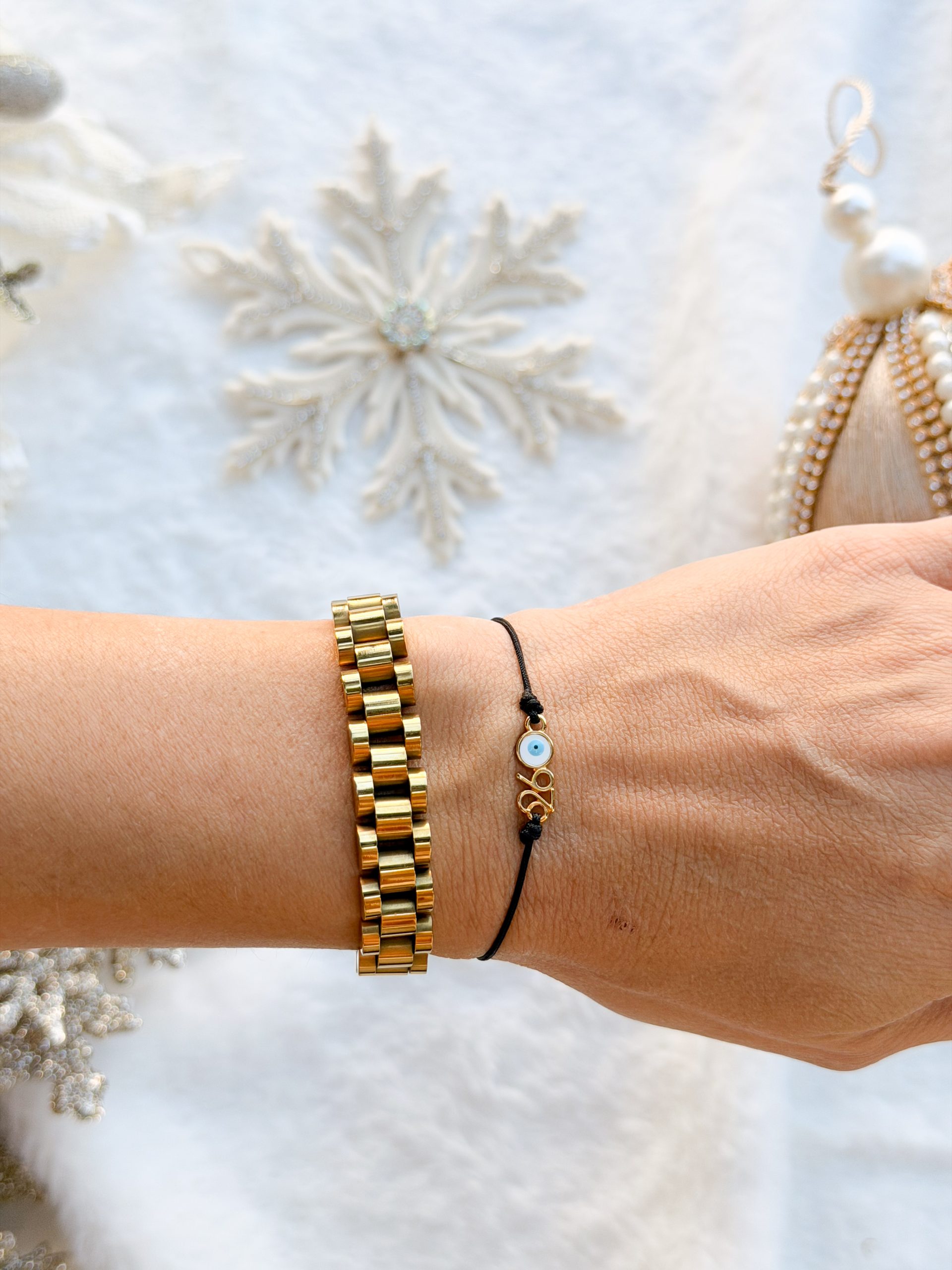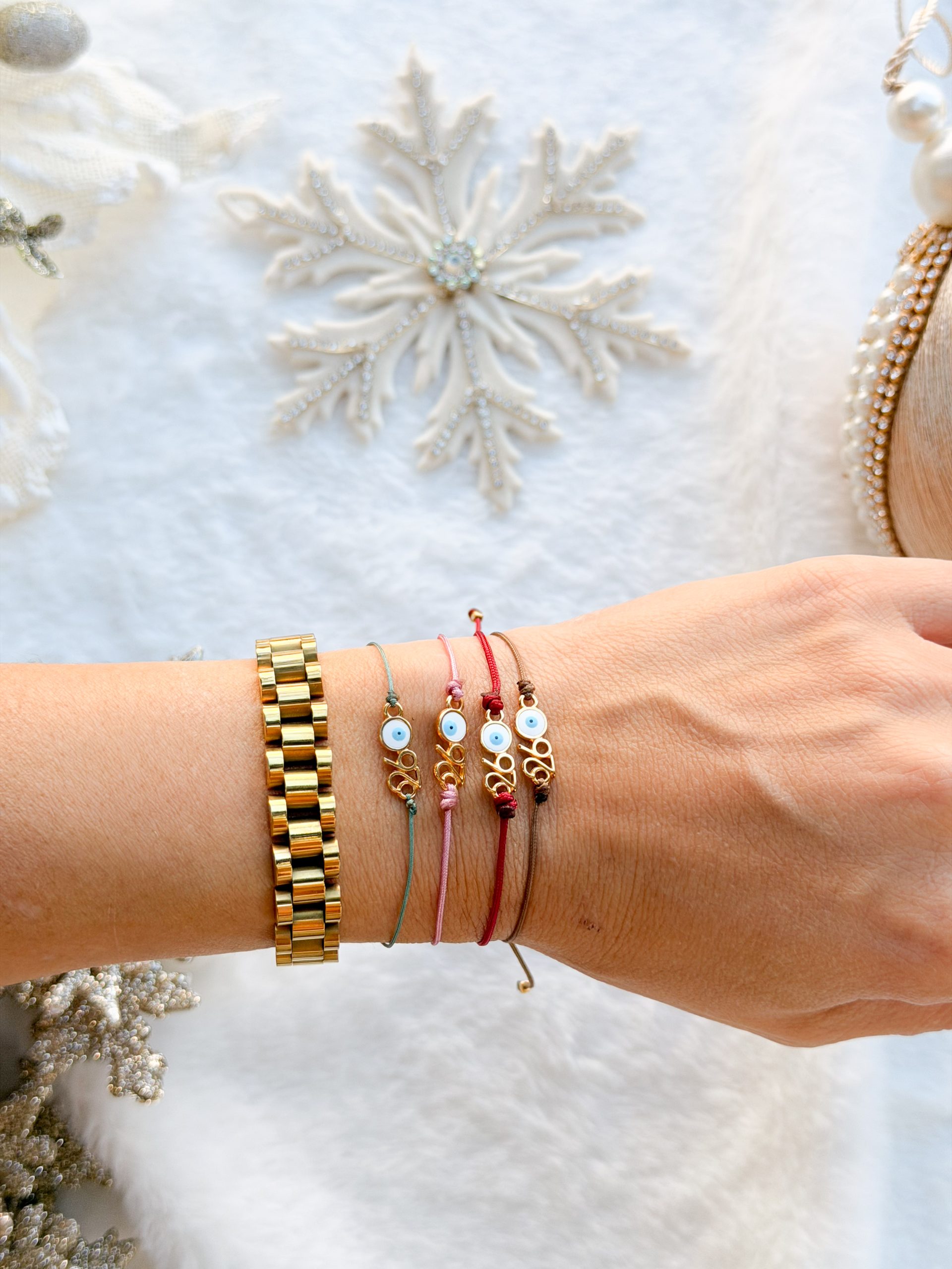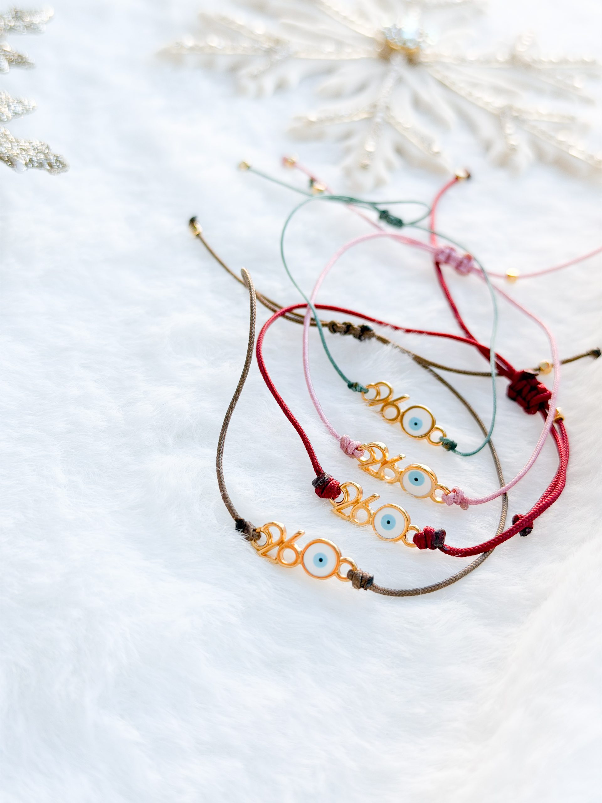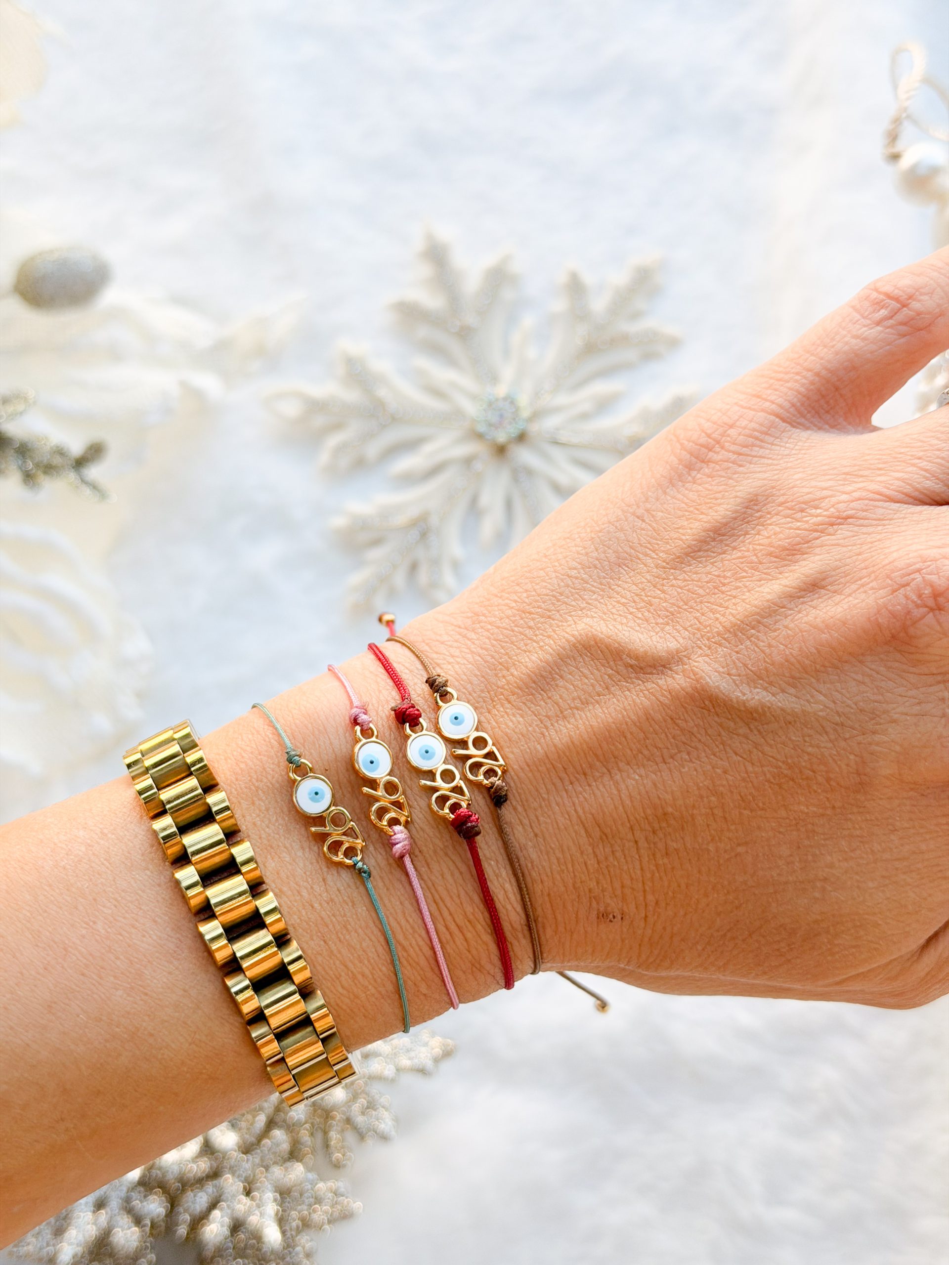 Βραχιολάκι με σατέν κορδόνι και μοτίφ 26 επιχρυσωμένο με μάτι.