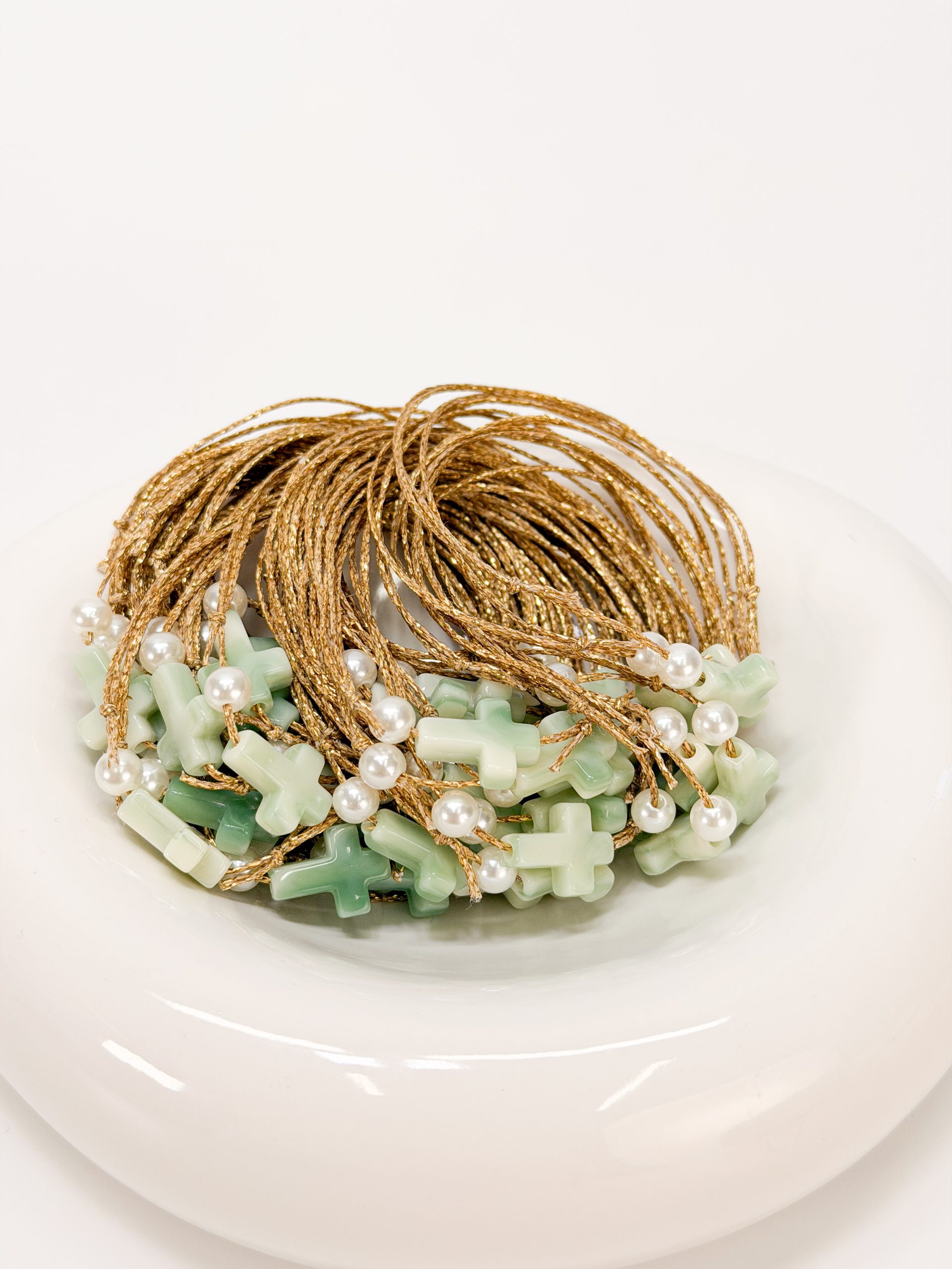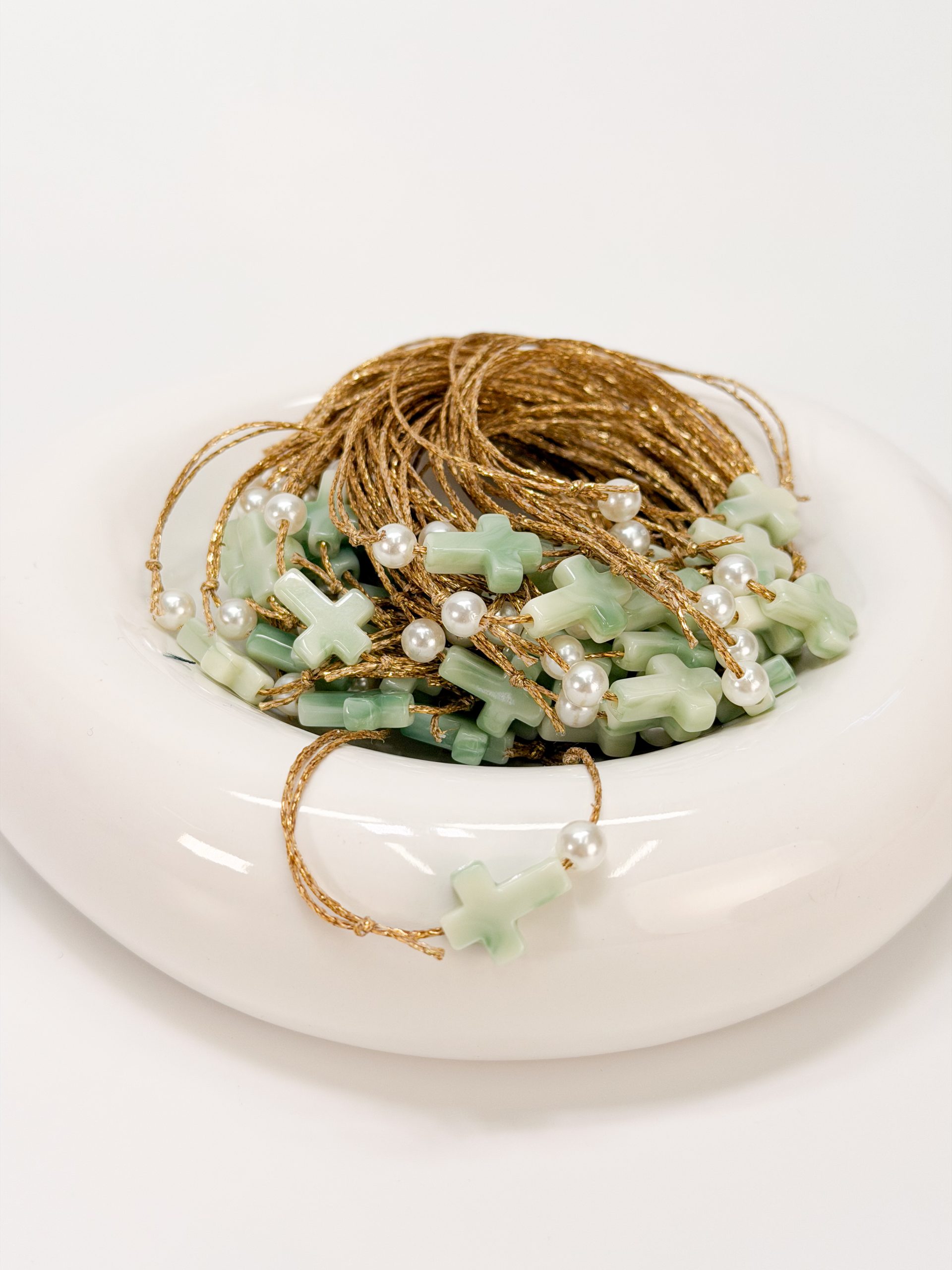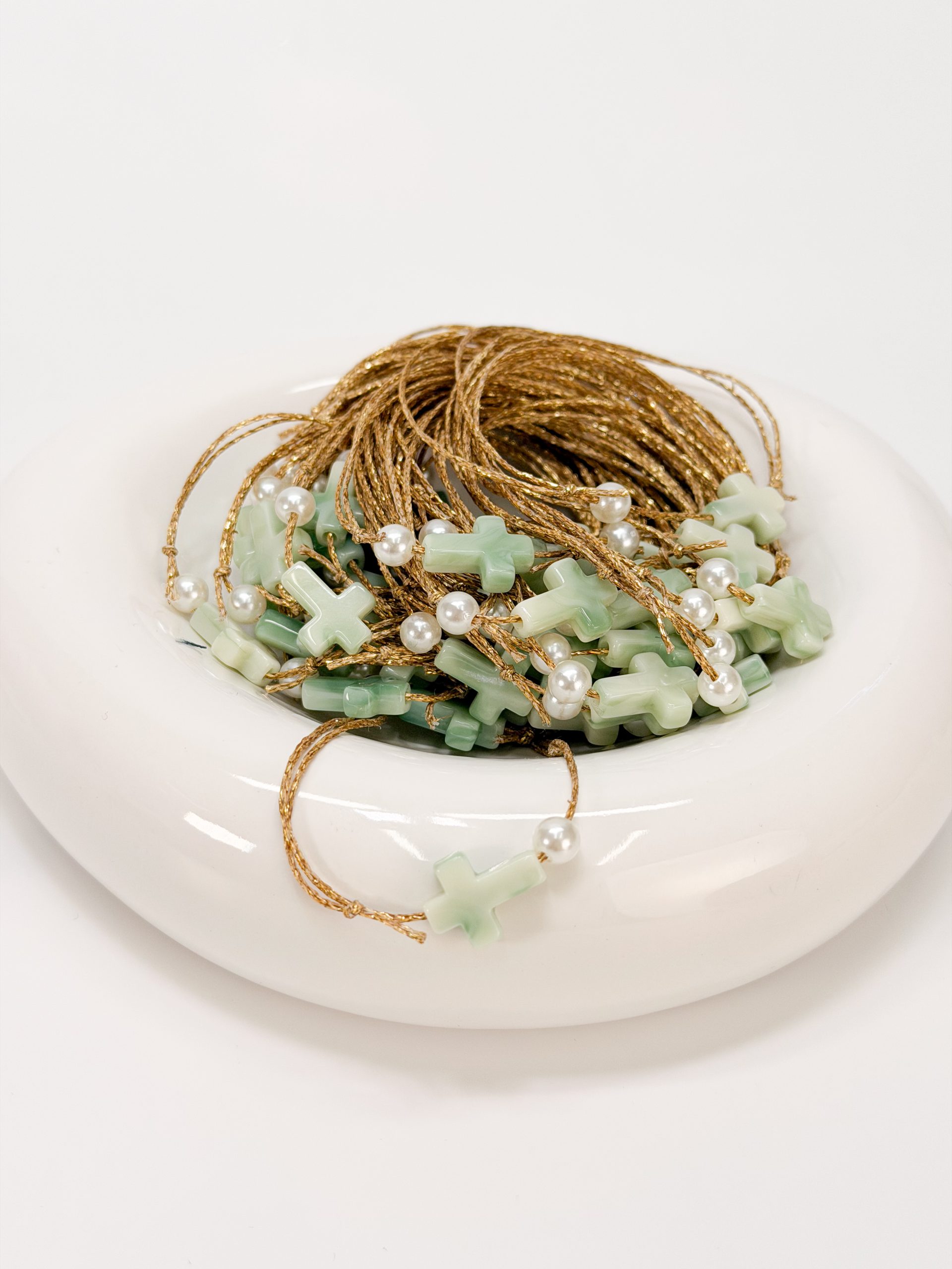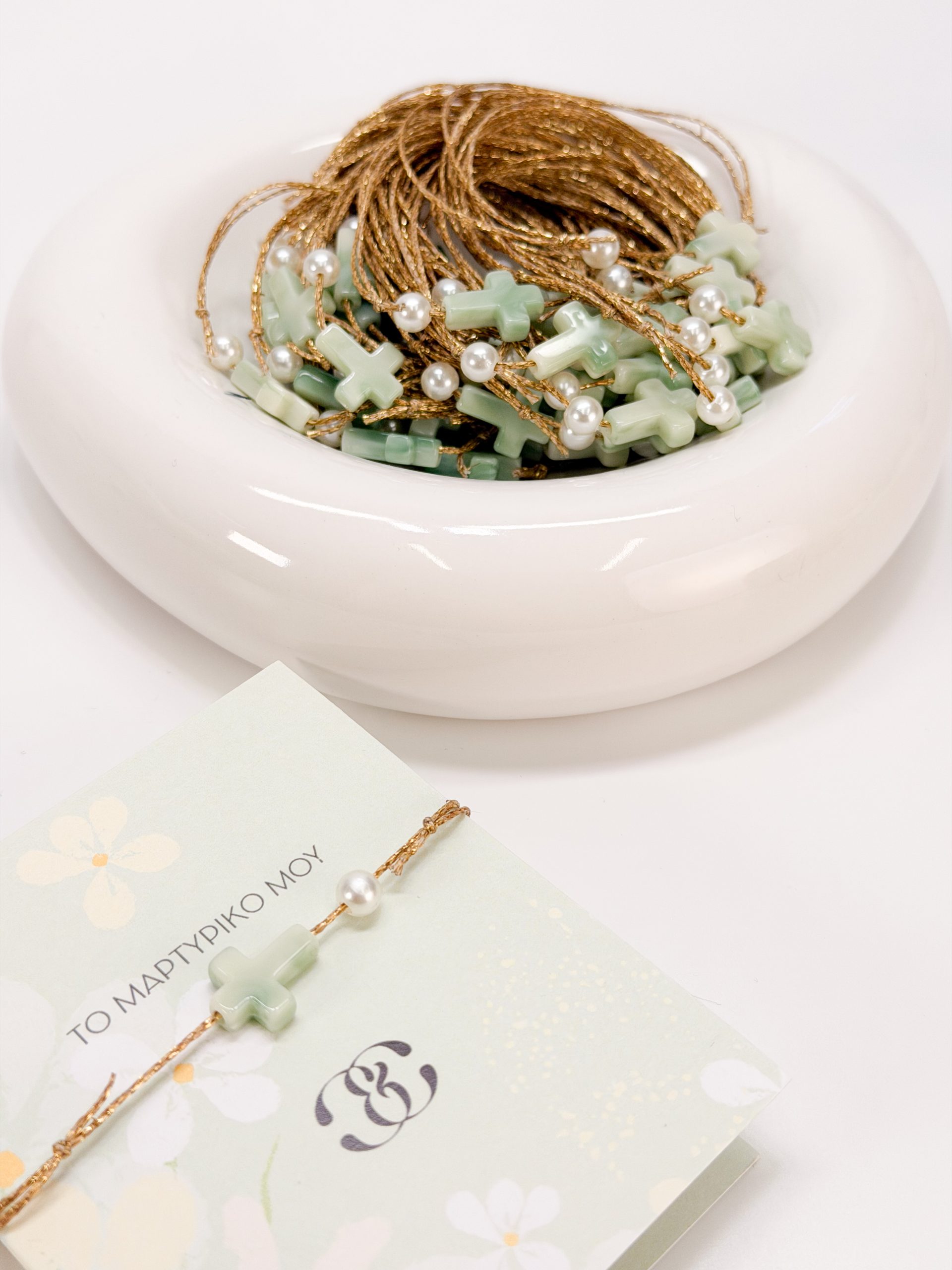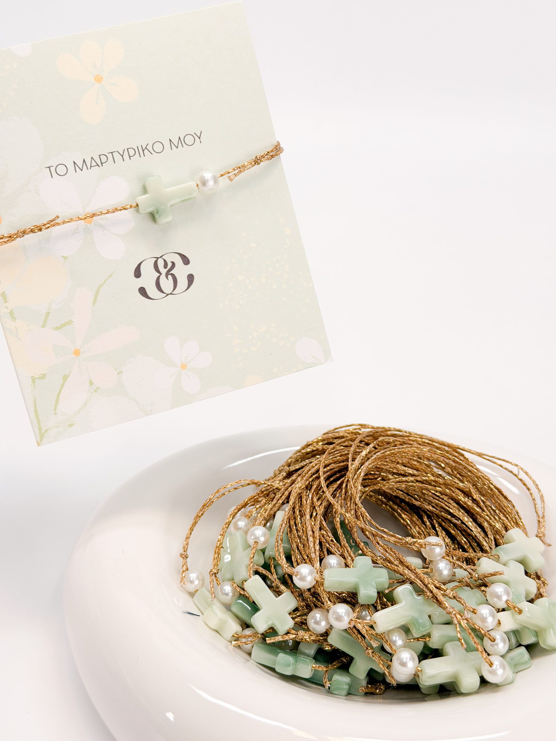 Μαρτυρικό βραχιόλι με χρυσοκλωστή,πέρλα και δίχρωμο σταυρό.