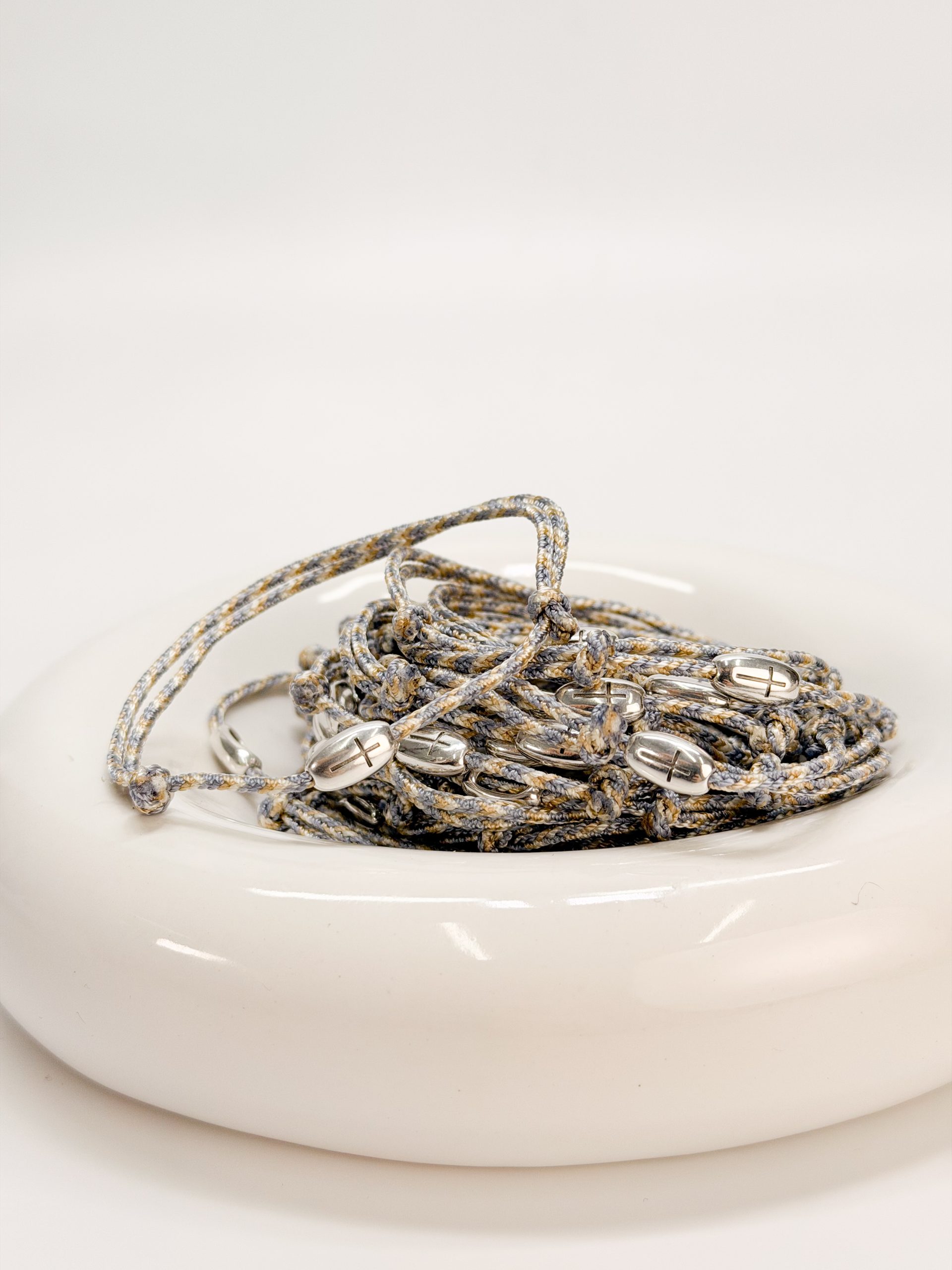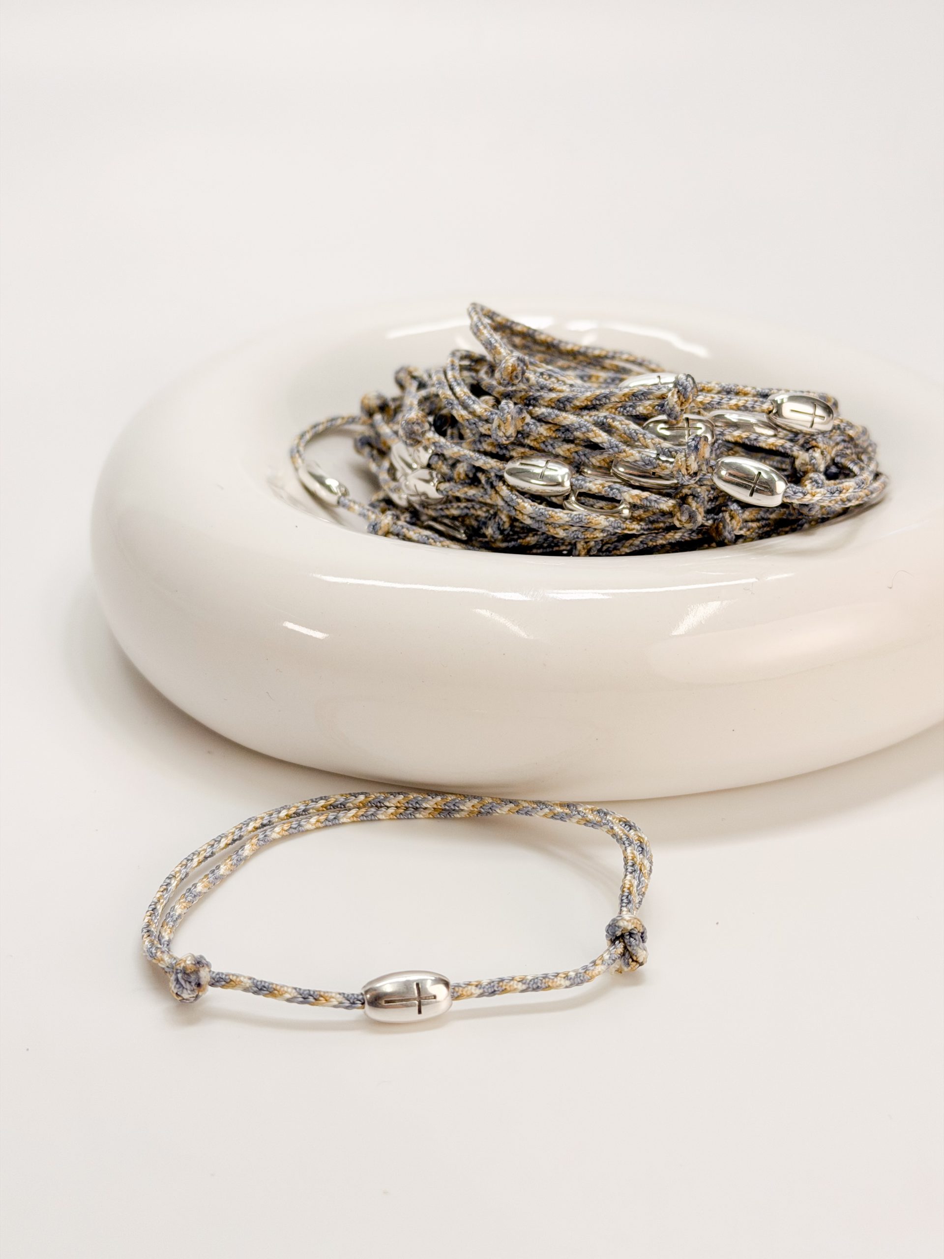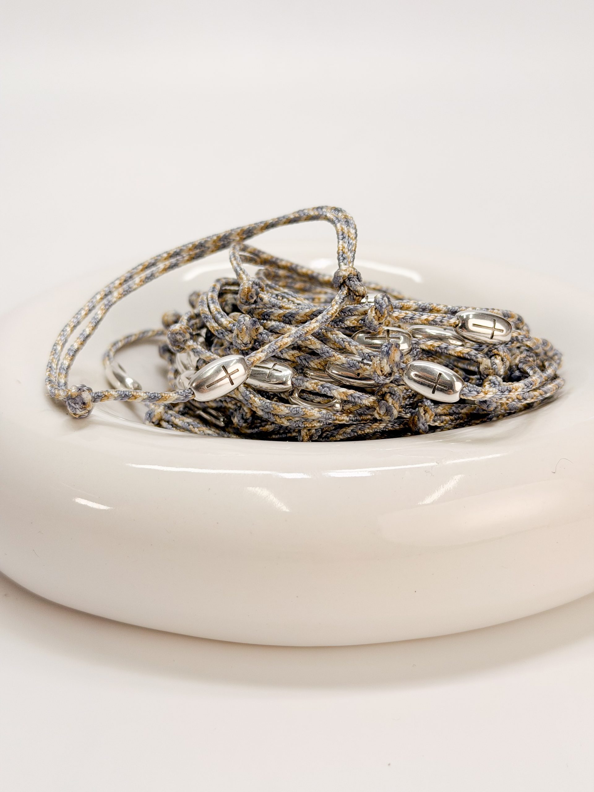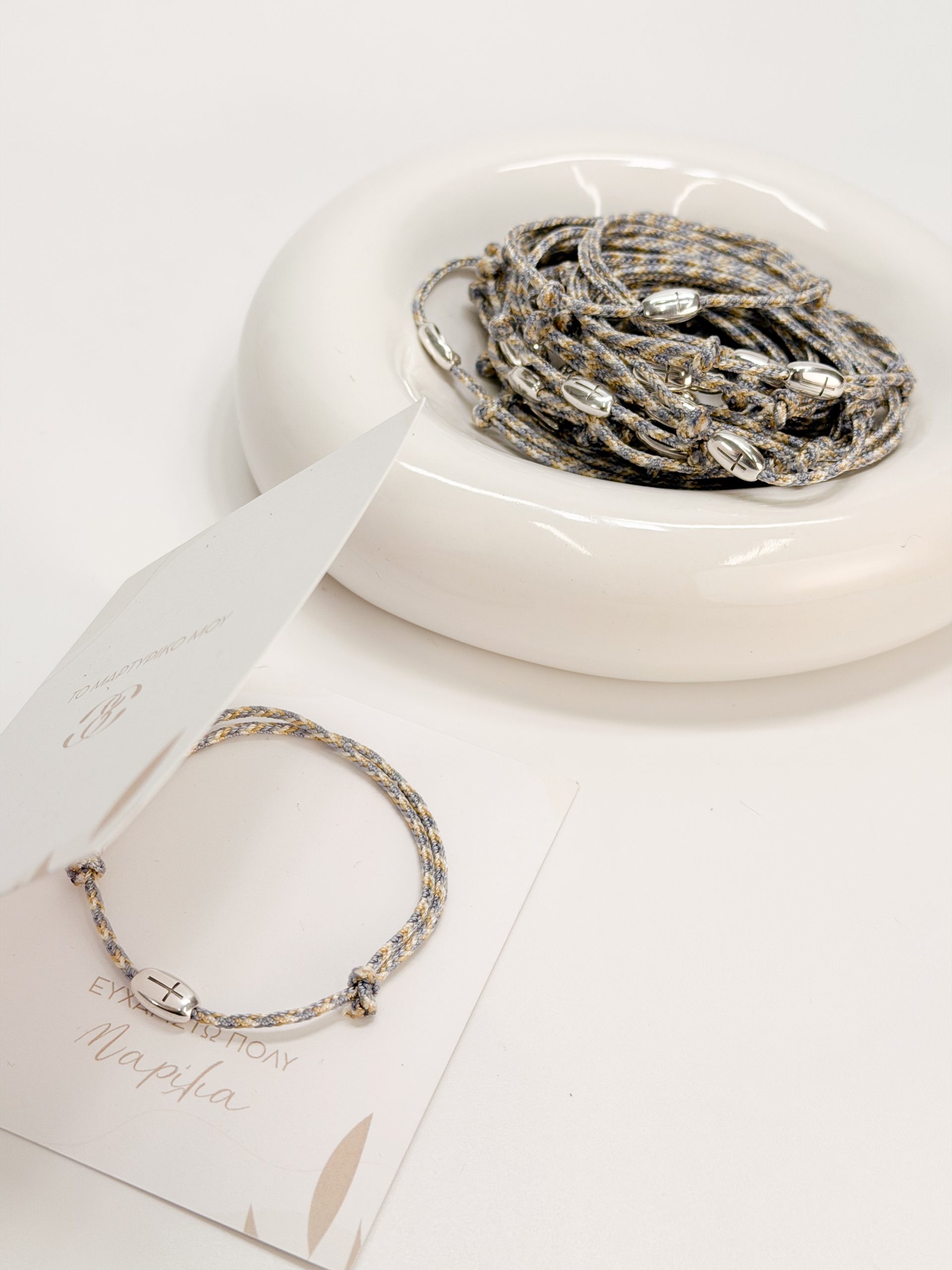 Μαρτυρικό βραχιόλι με σταυρό σε ασημί απόχρωση και κορδόνι 3 αποχρώσεων.