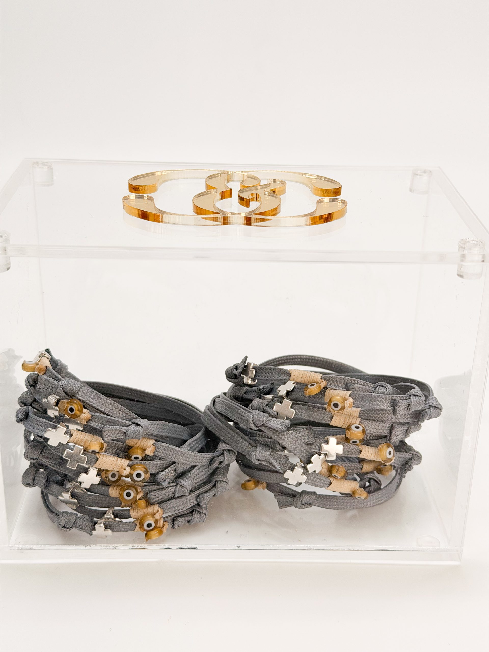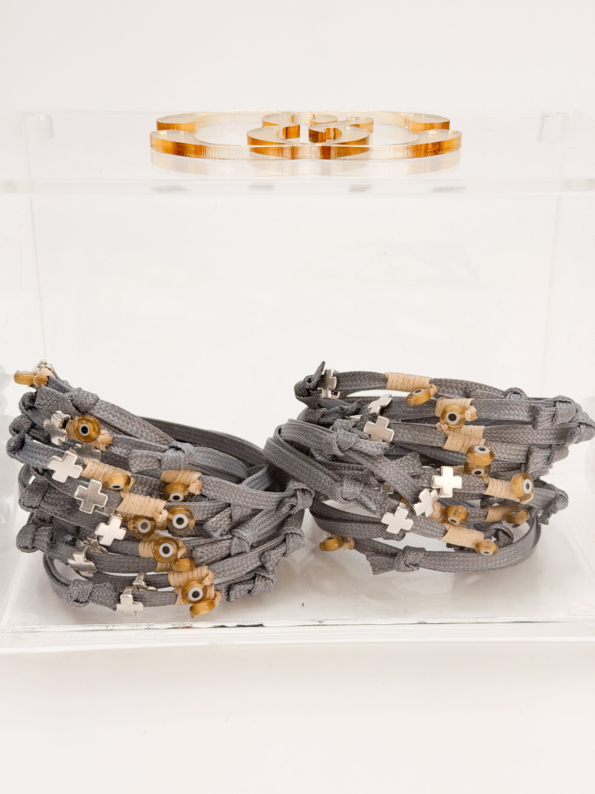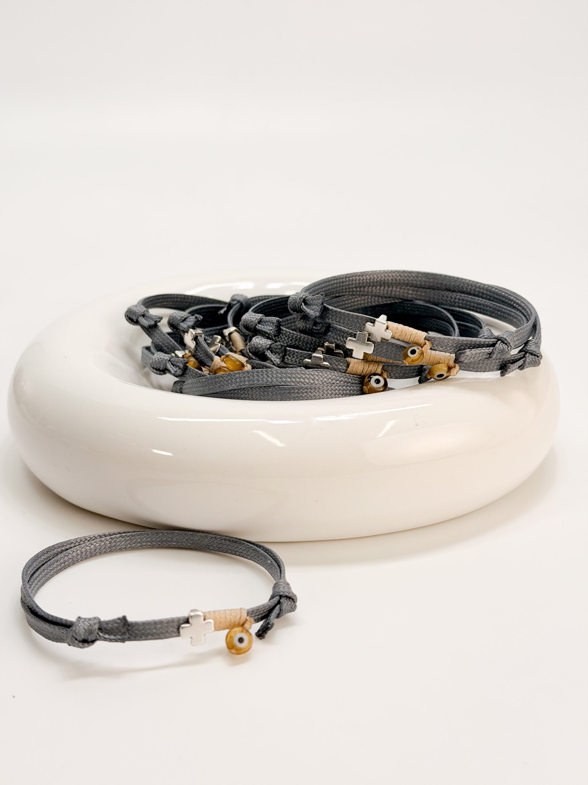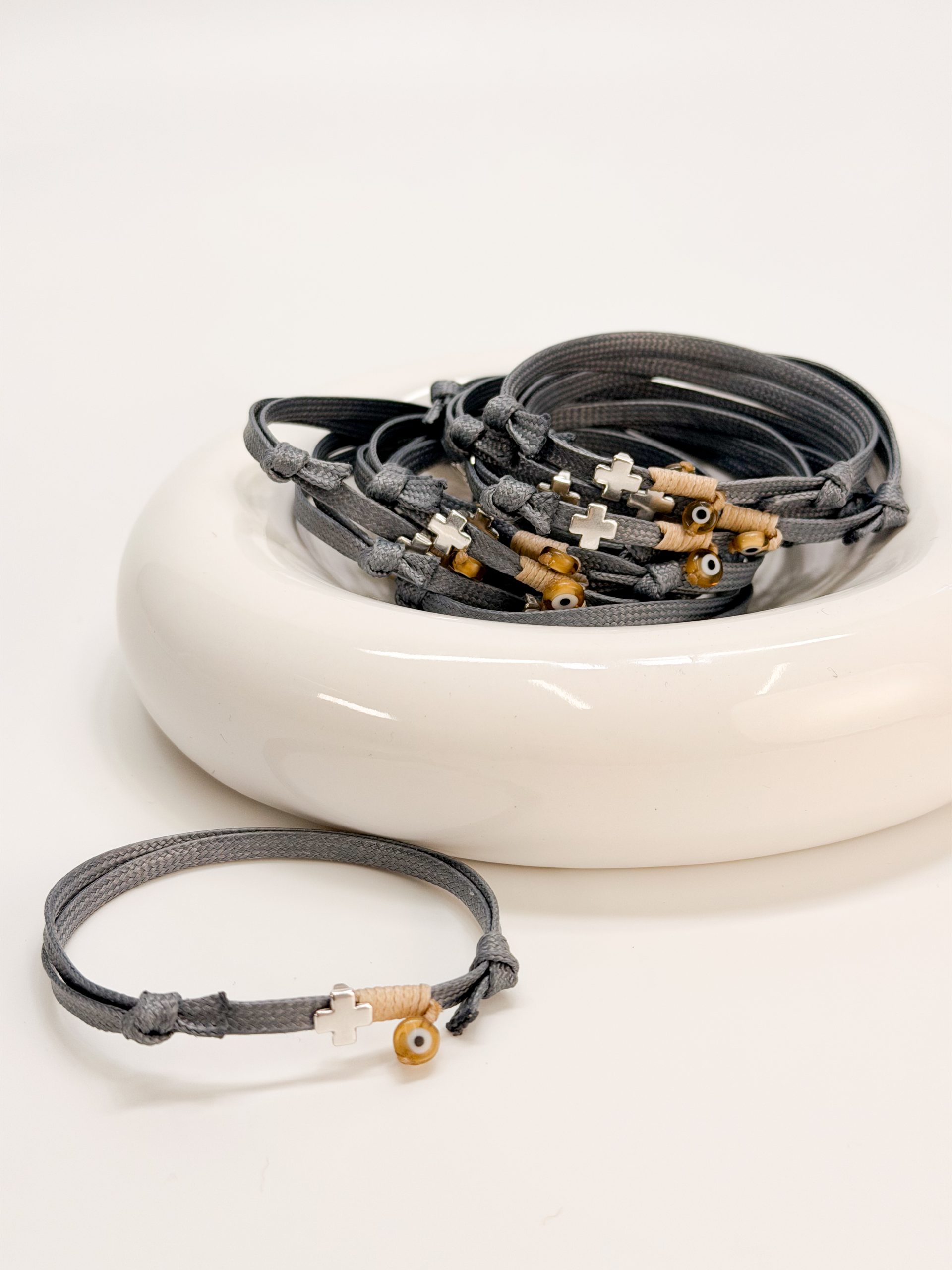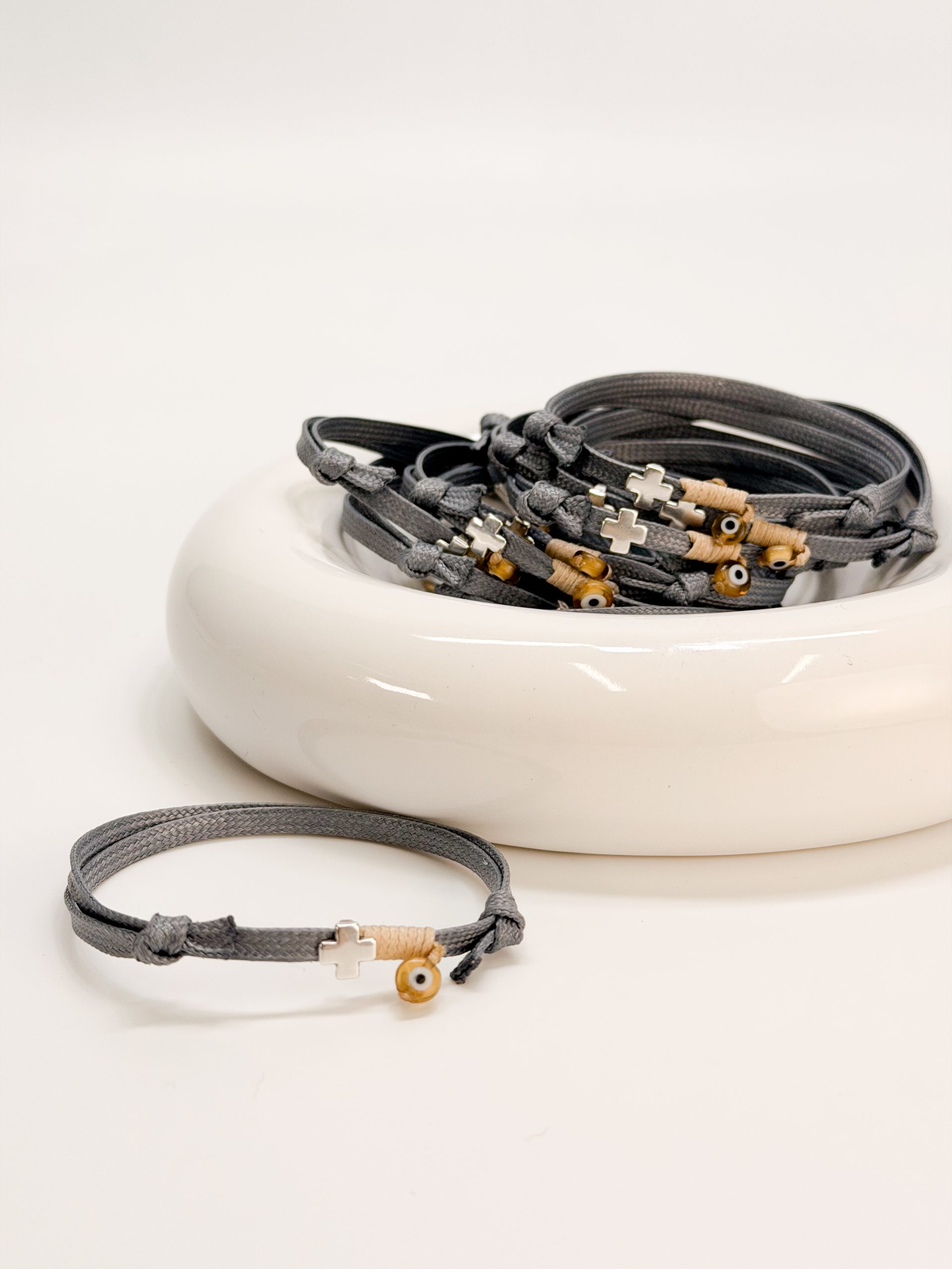 Μαρτυρικό βραχιόλι με γκρι πλακέ κορδόνι δέρμα φιδιού,σταυρό σε ασημί απόχρωση,δέσιμο και ματάκι.