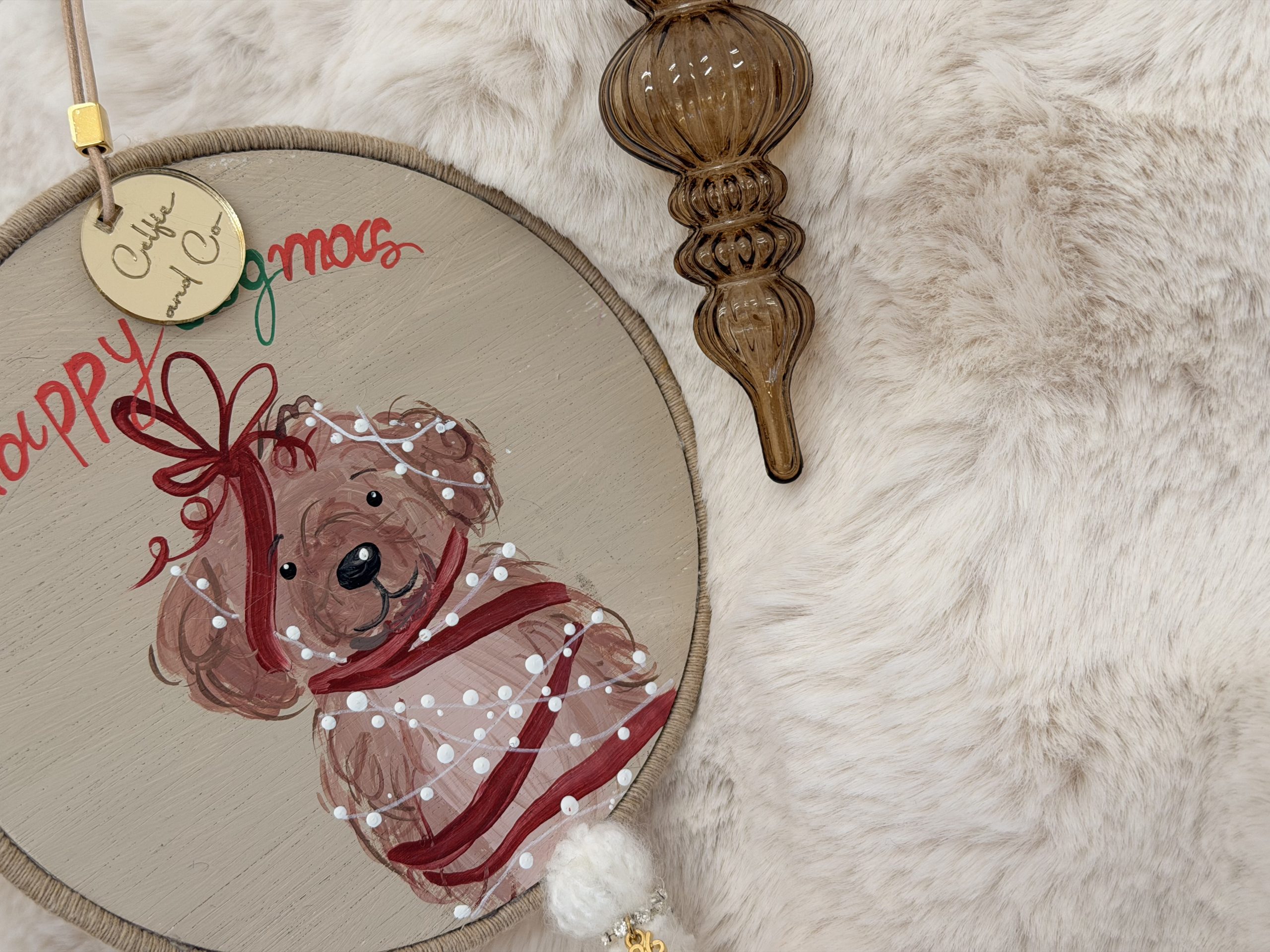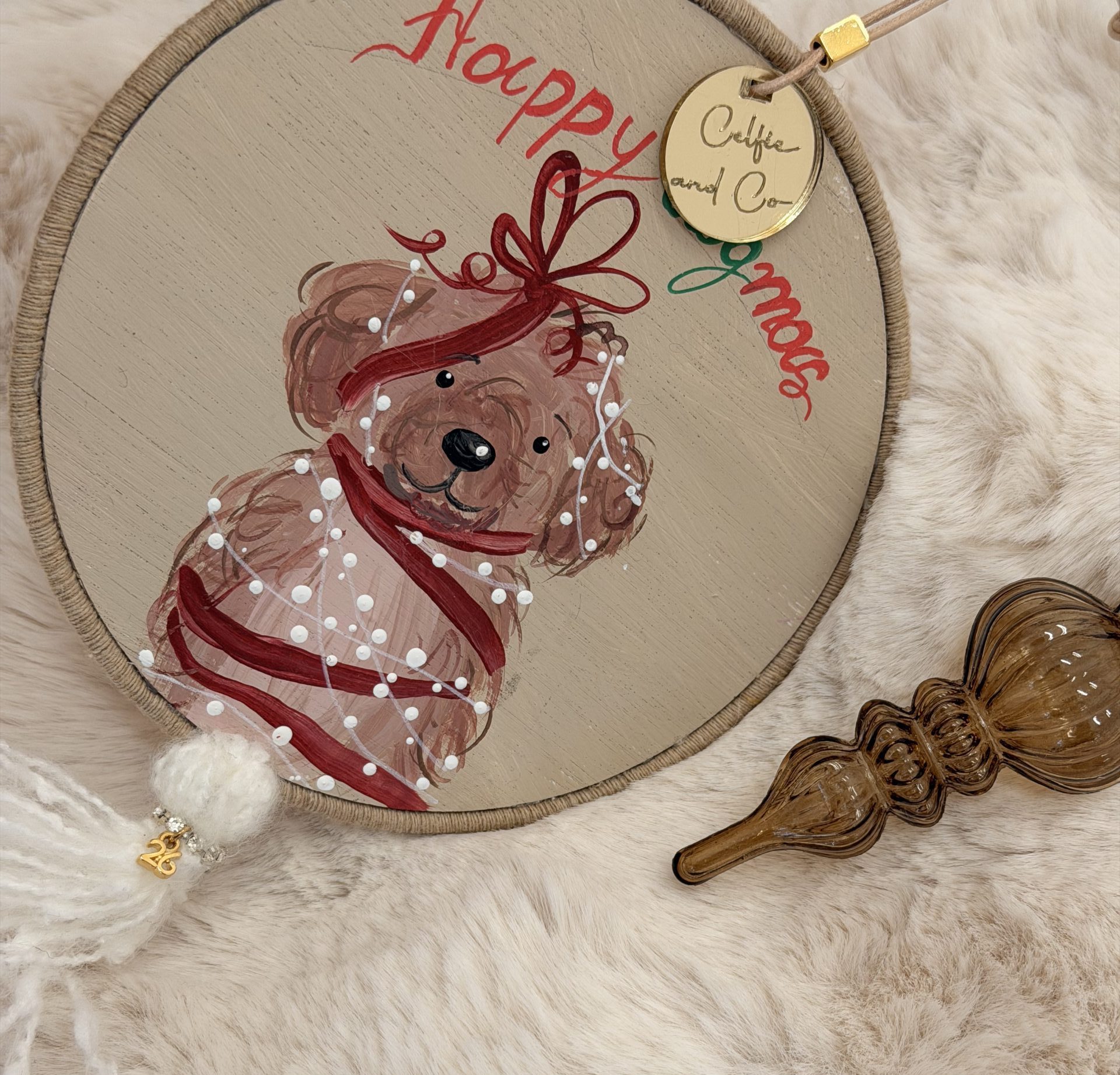 Στολιδι ζωγραφιστό με σκυλάκι να γράφει Happy Dogmas. Απο εμάς χρειάζονται περίπου 7 εργάσιμες.Μπορείτε να μας γράψετε στις παρατηρήσεις το όνομα που επιθυμείτε να γράφει.Για να ξεκινήσει η επεξεργασία θα χρειαστούμε μια προκαταβολή.