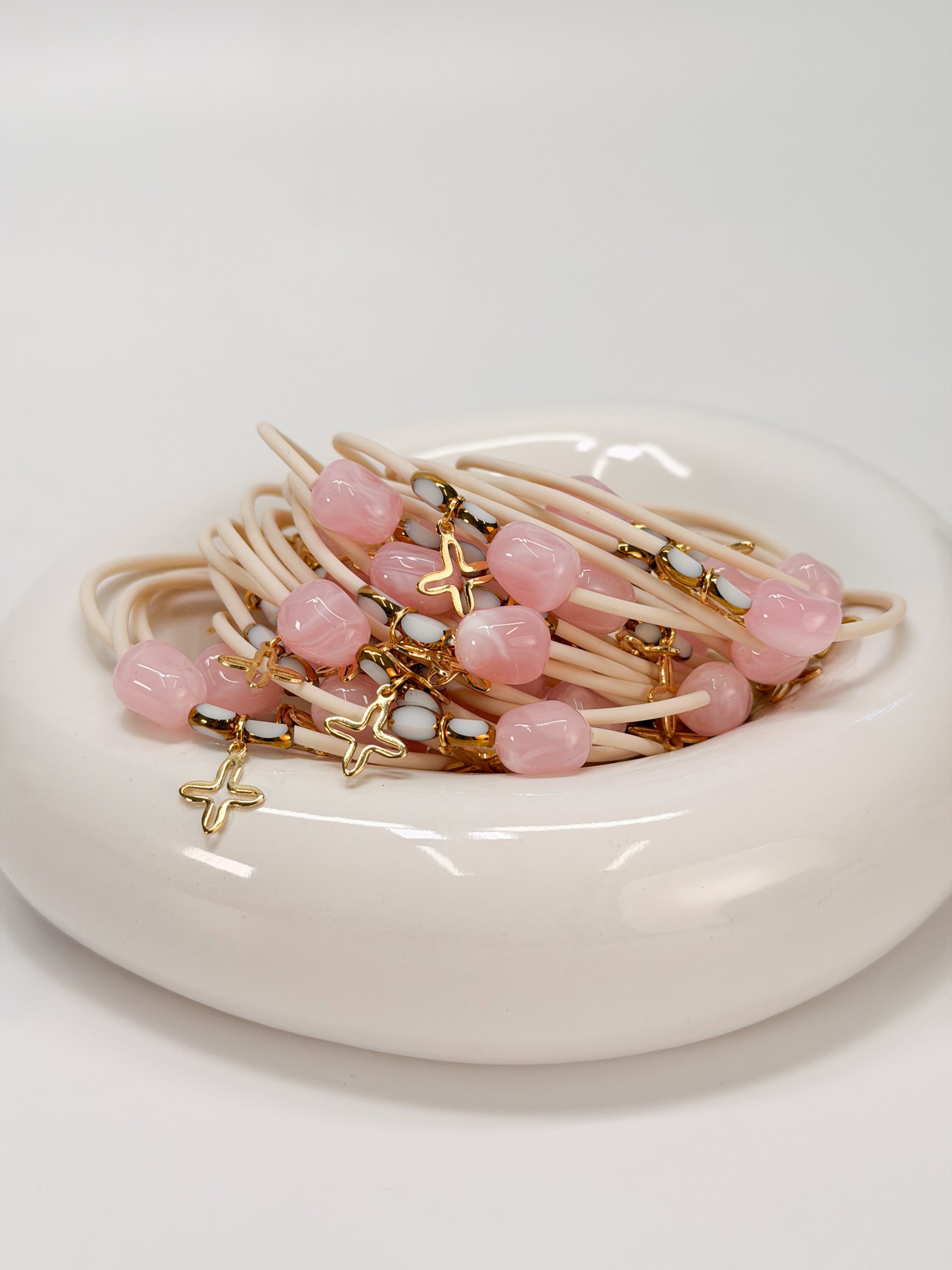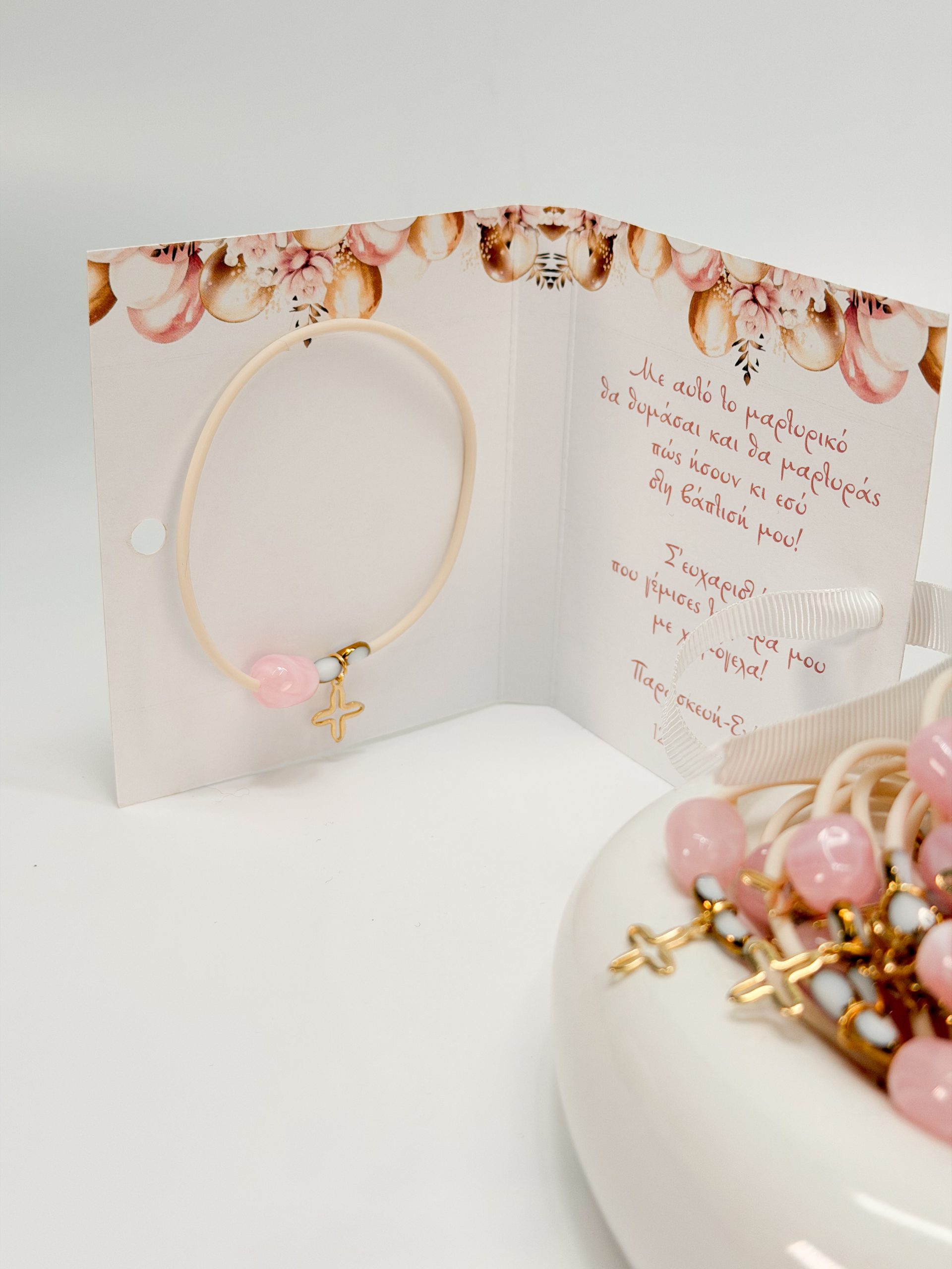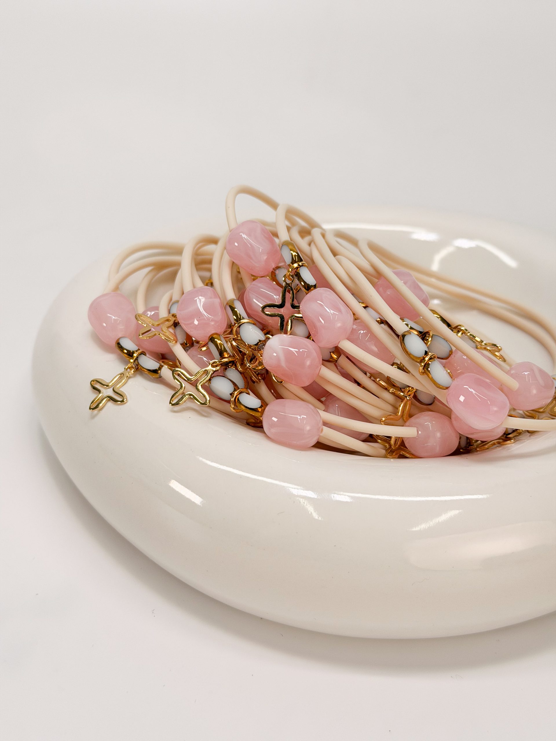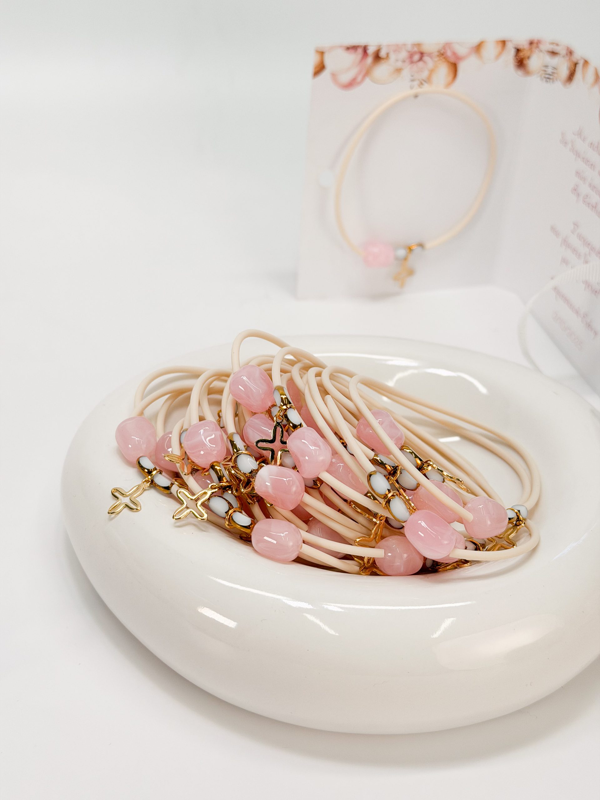 Μαρτυρικό βραχιόλι με καουτσούκ εκρού κορδόνι,ροζ ακρυλική χάντρα,stainless steel σταυρό και δίχρωμες χάντρες σε λευκή-χρυσή απόχρωση.