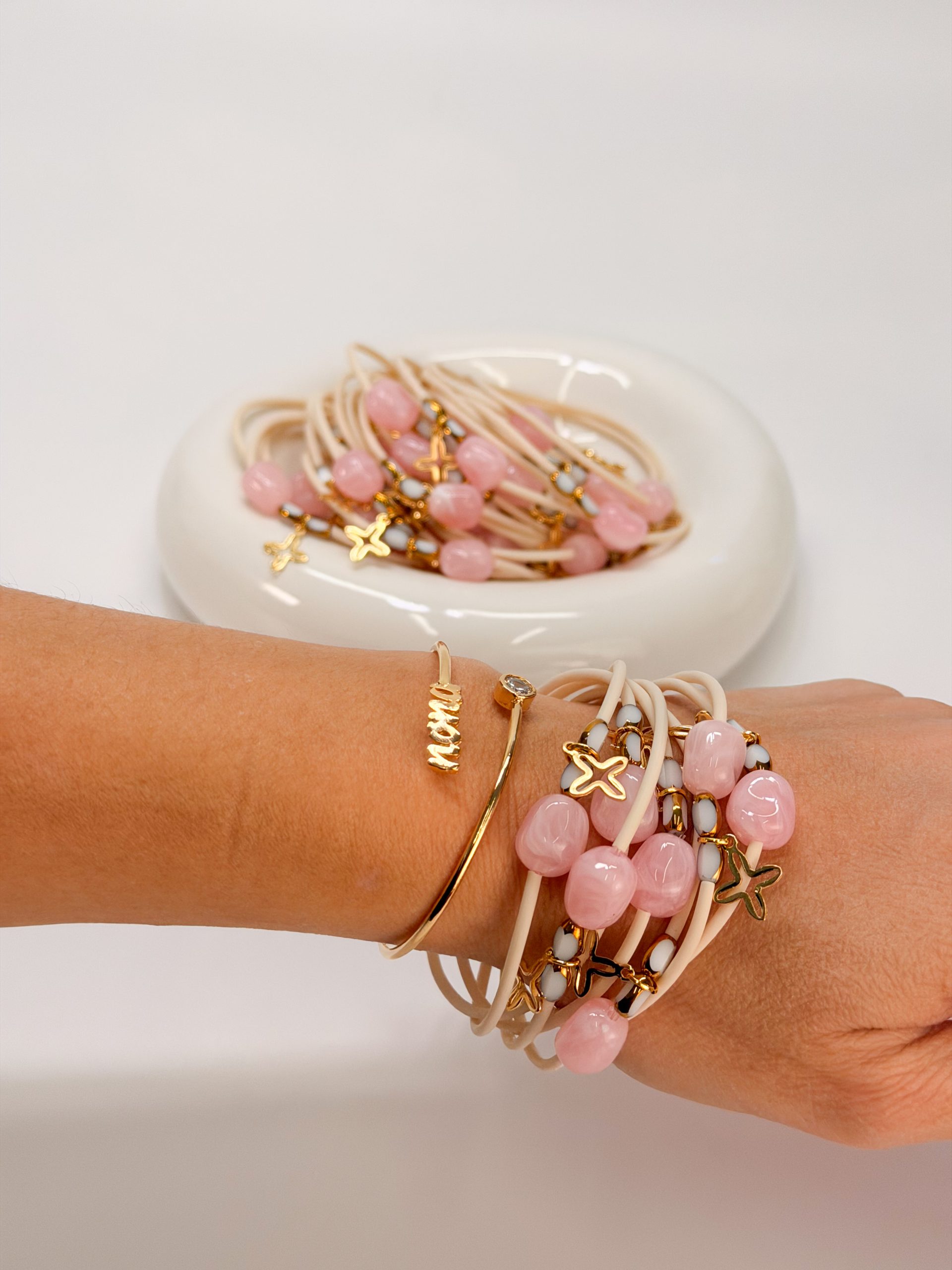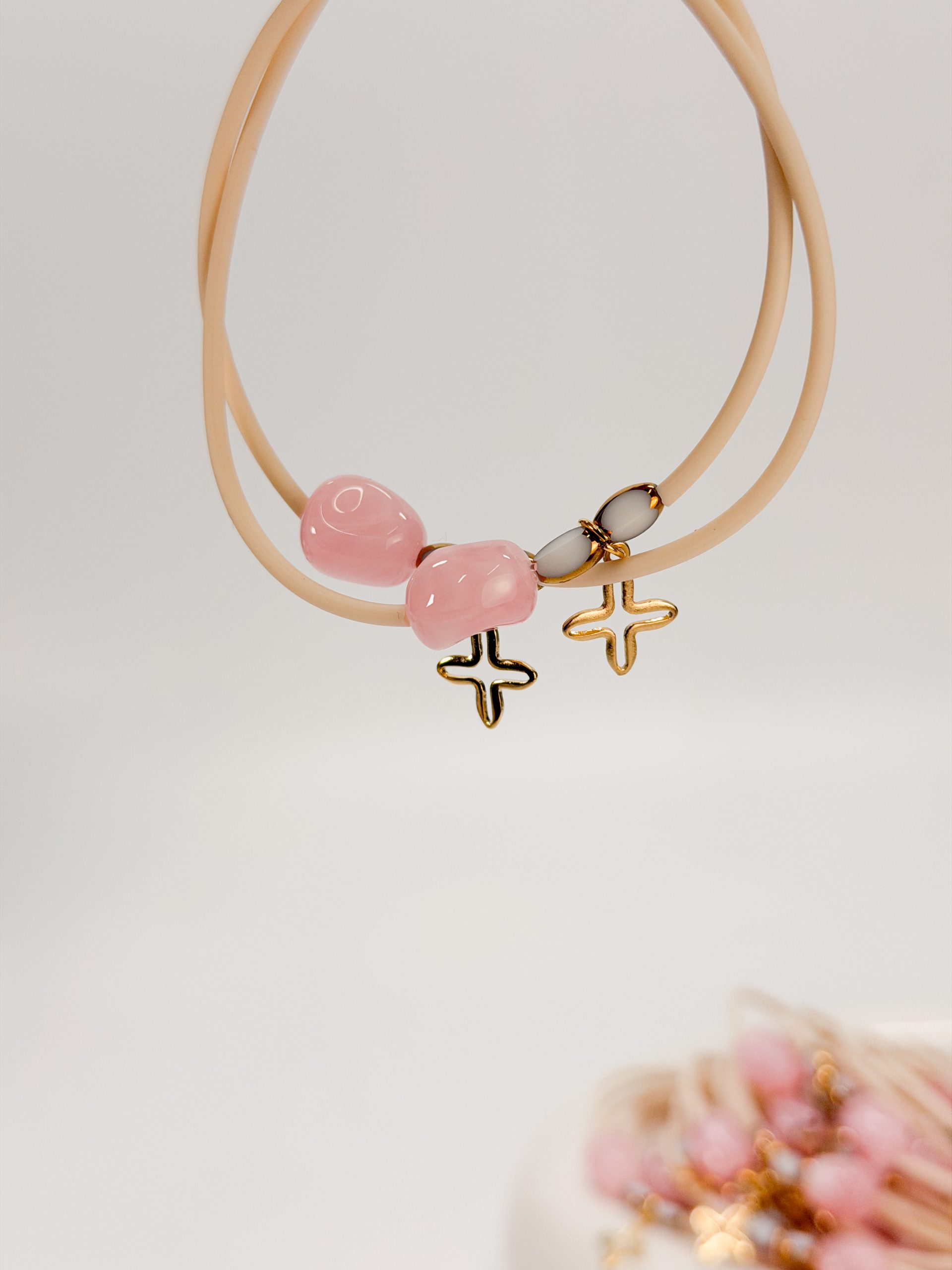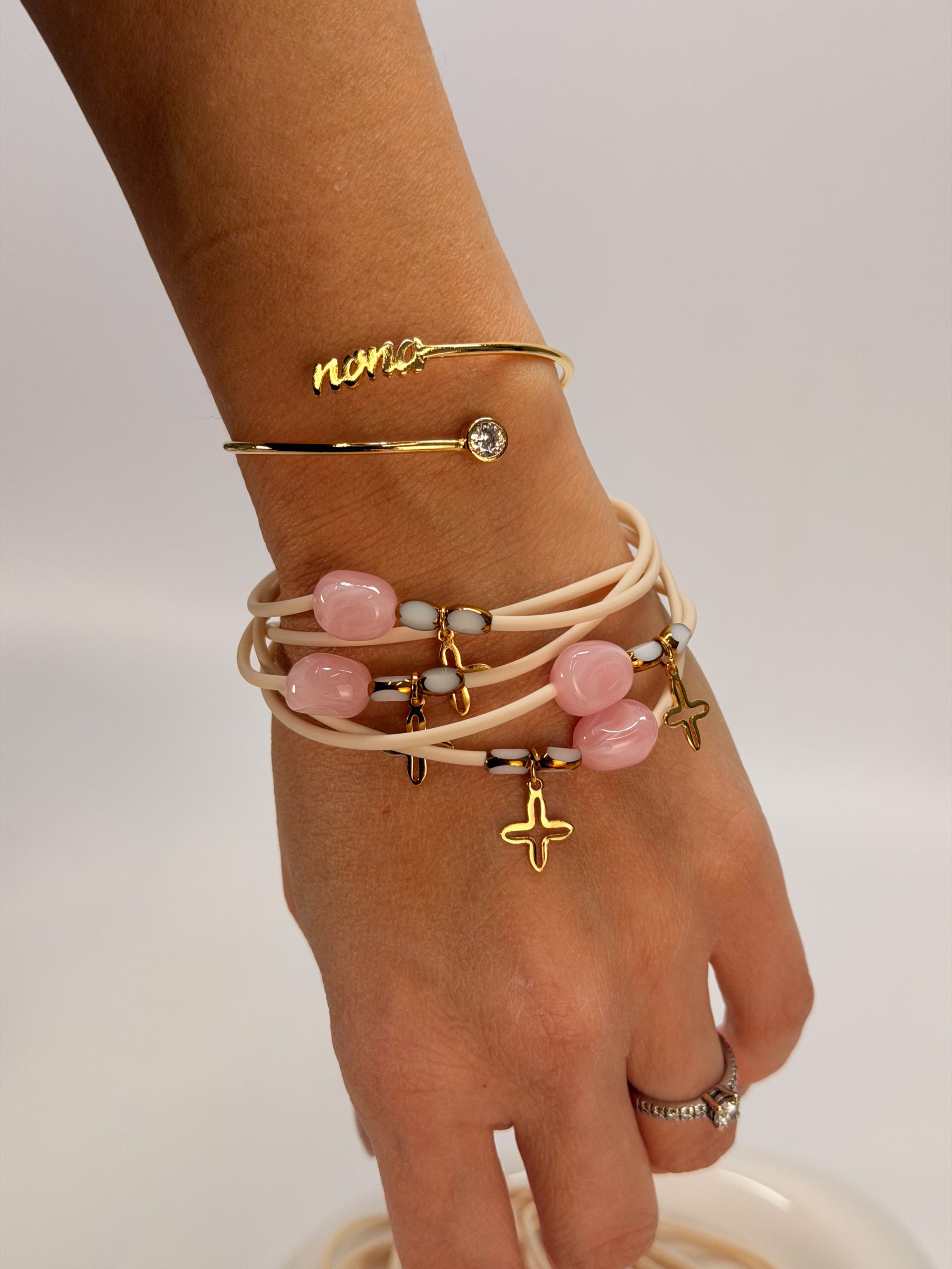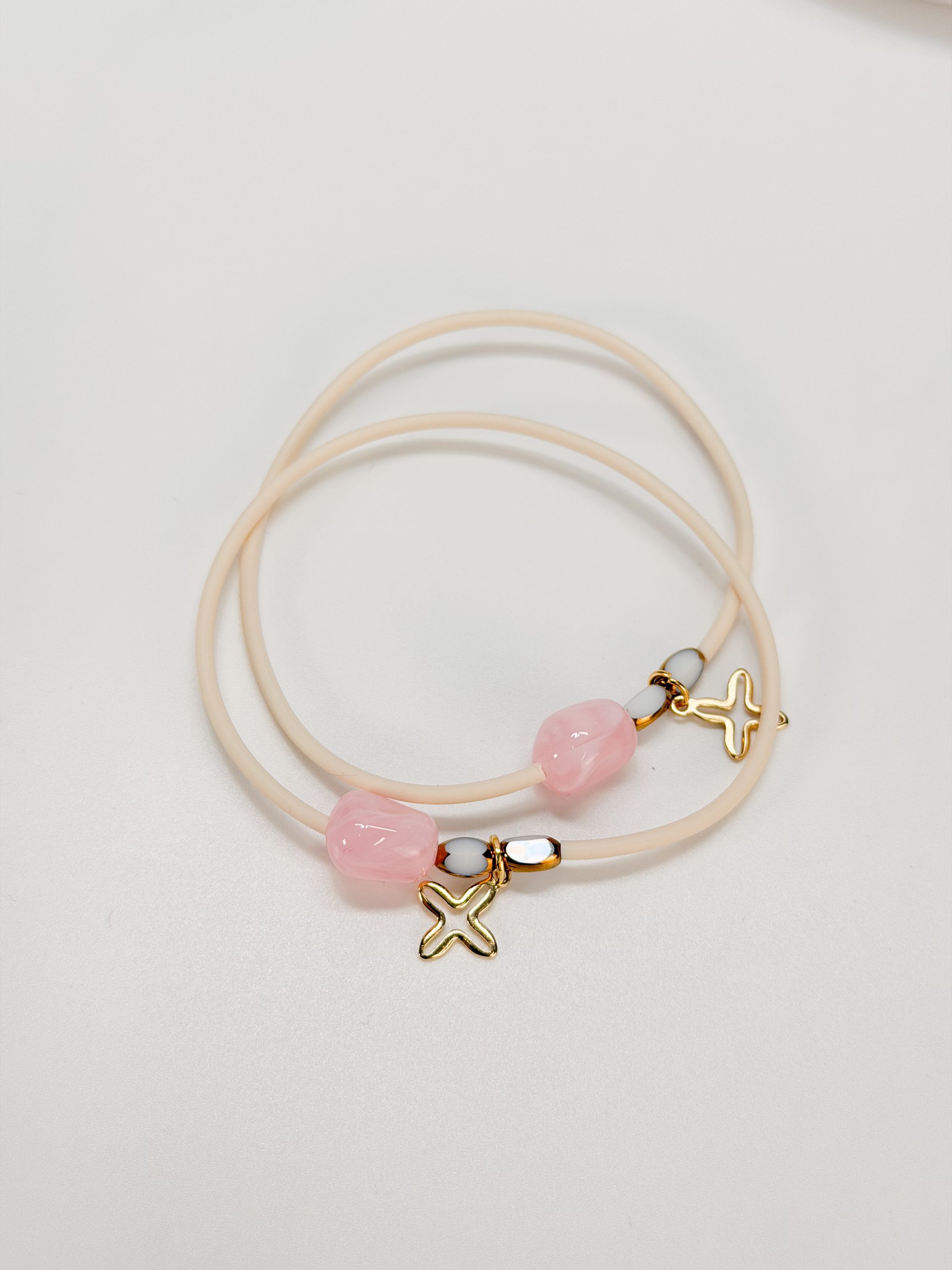 Μαρτυρικό βραχιόλι με καουτσούκ εκρού κορδόνι,ροζ ακρυλική χάντρα,stainless steel σταυρό και δίχρωμες χάντρες σε λευκή-χρυσή απόχρωση.