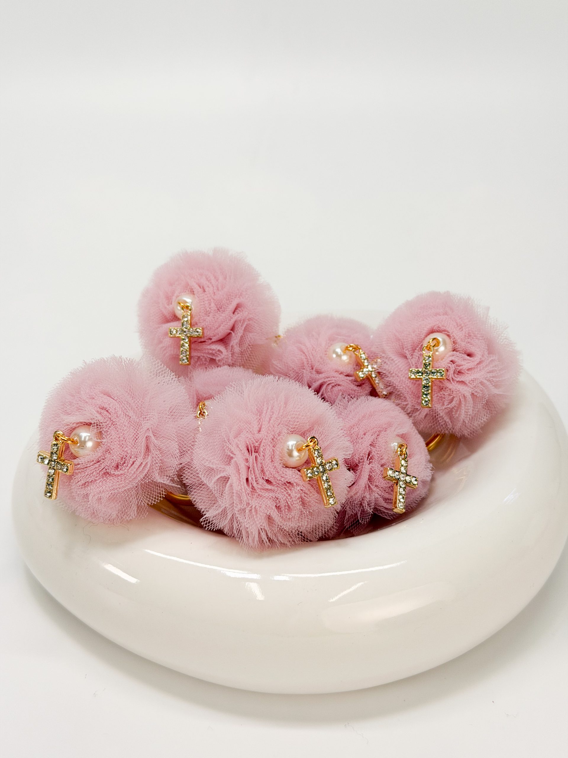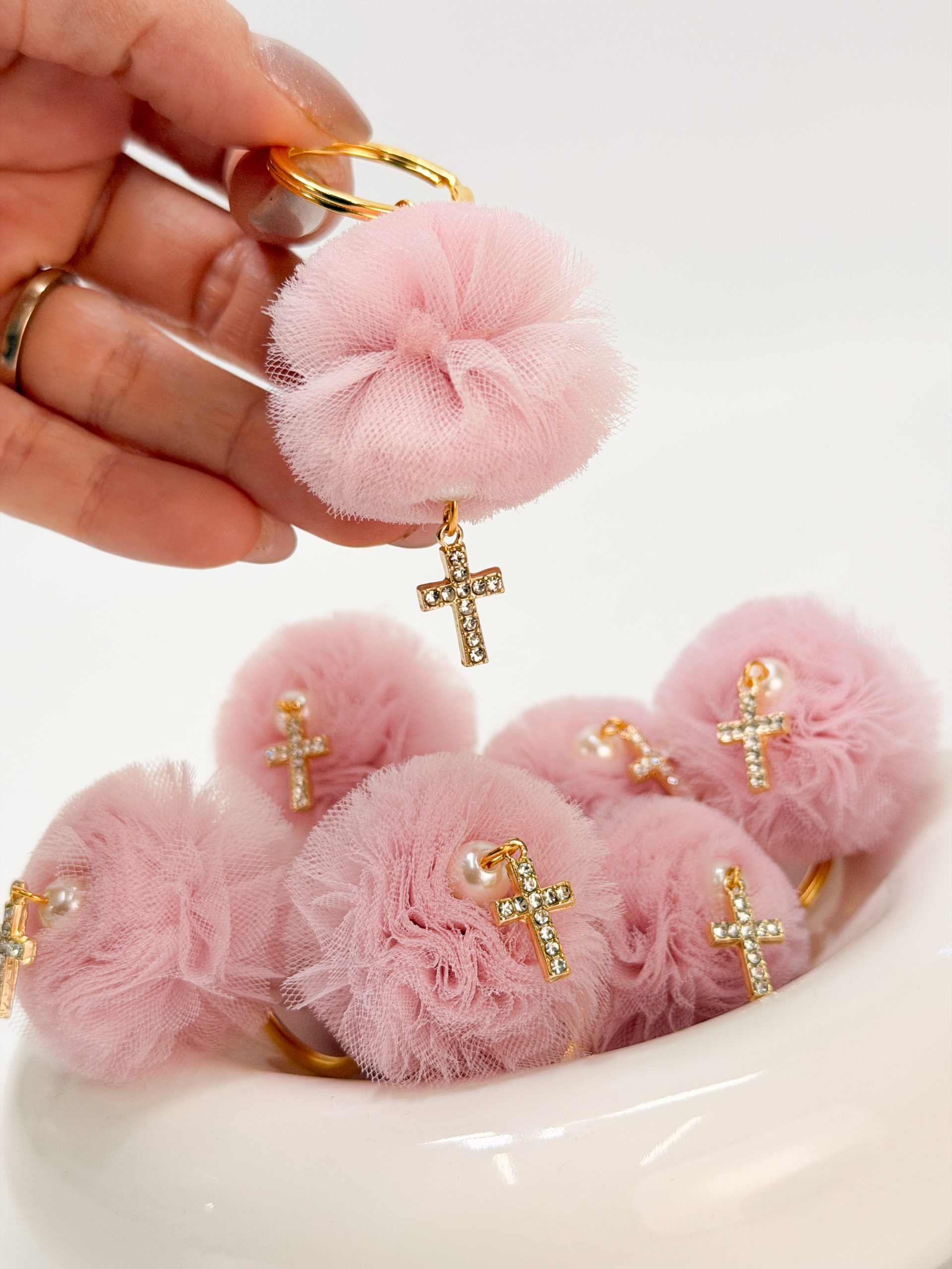 Μαρτυρικό μπρελόκ με ροζ τούλινη φούντα,πέρλα και επιχρυσωμένο σταυρό με στρας.