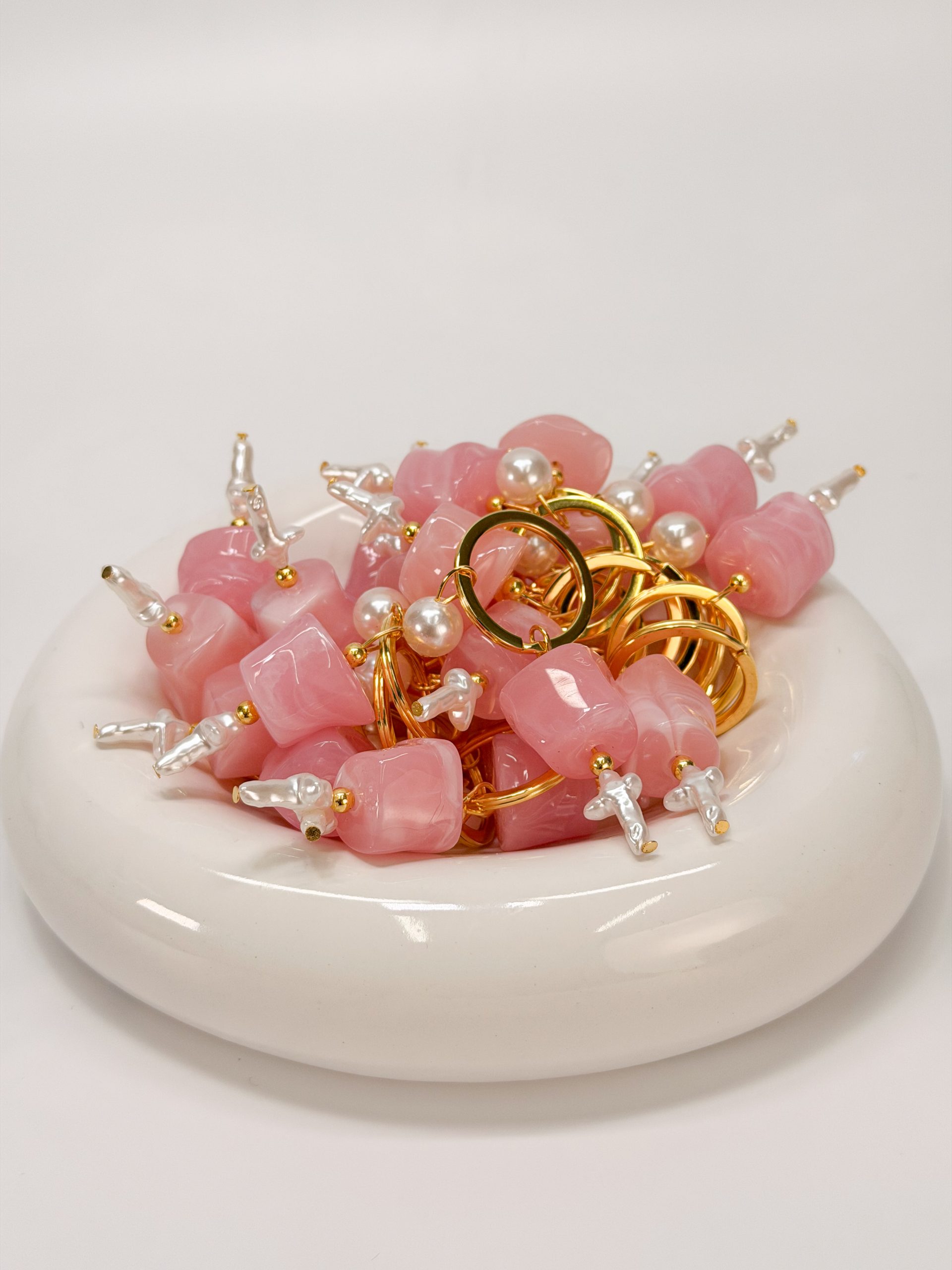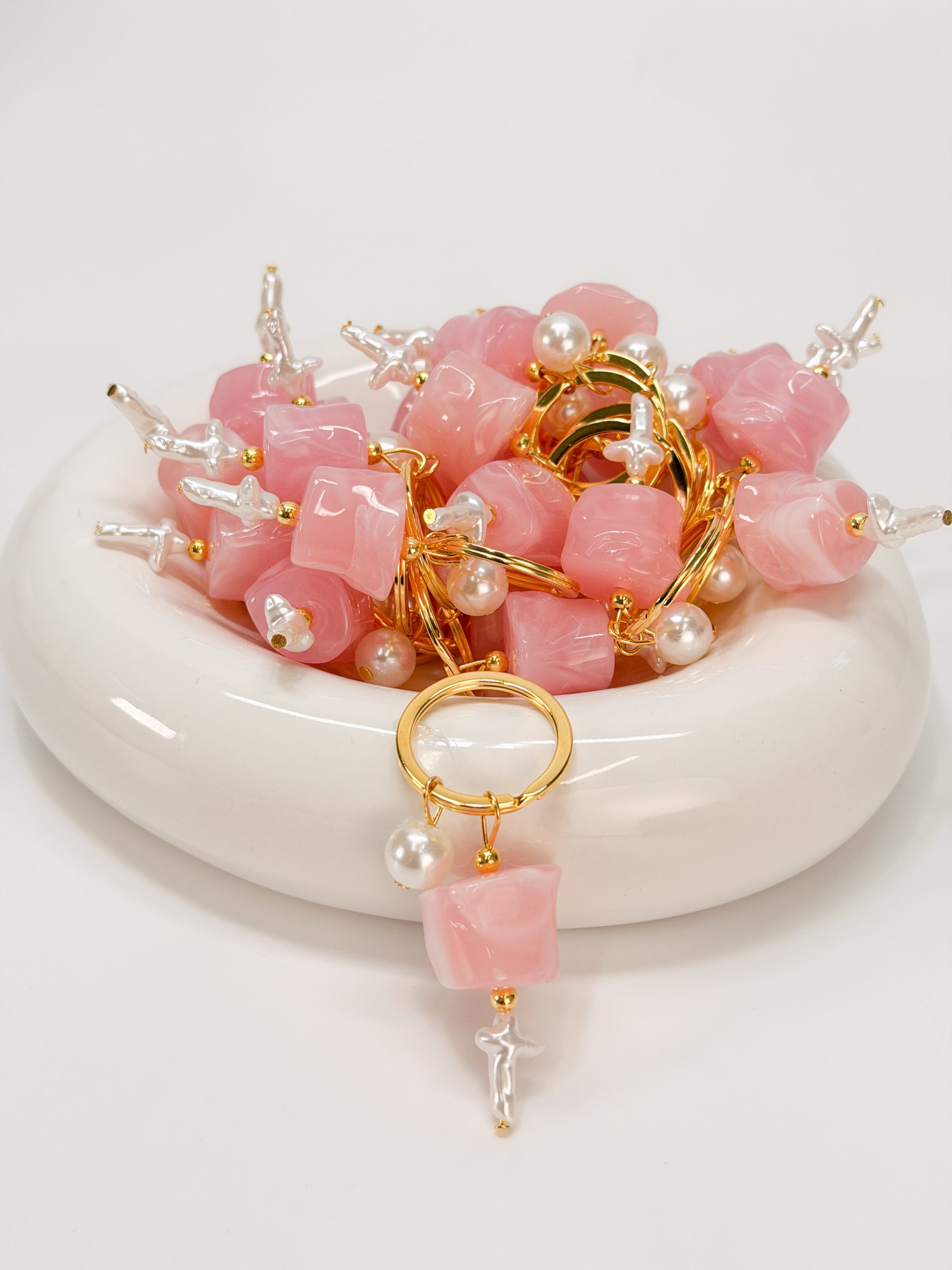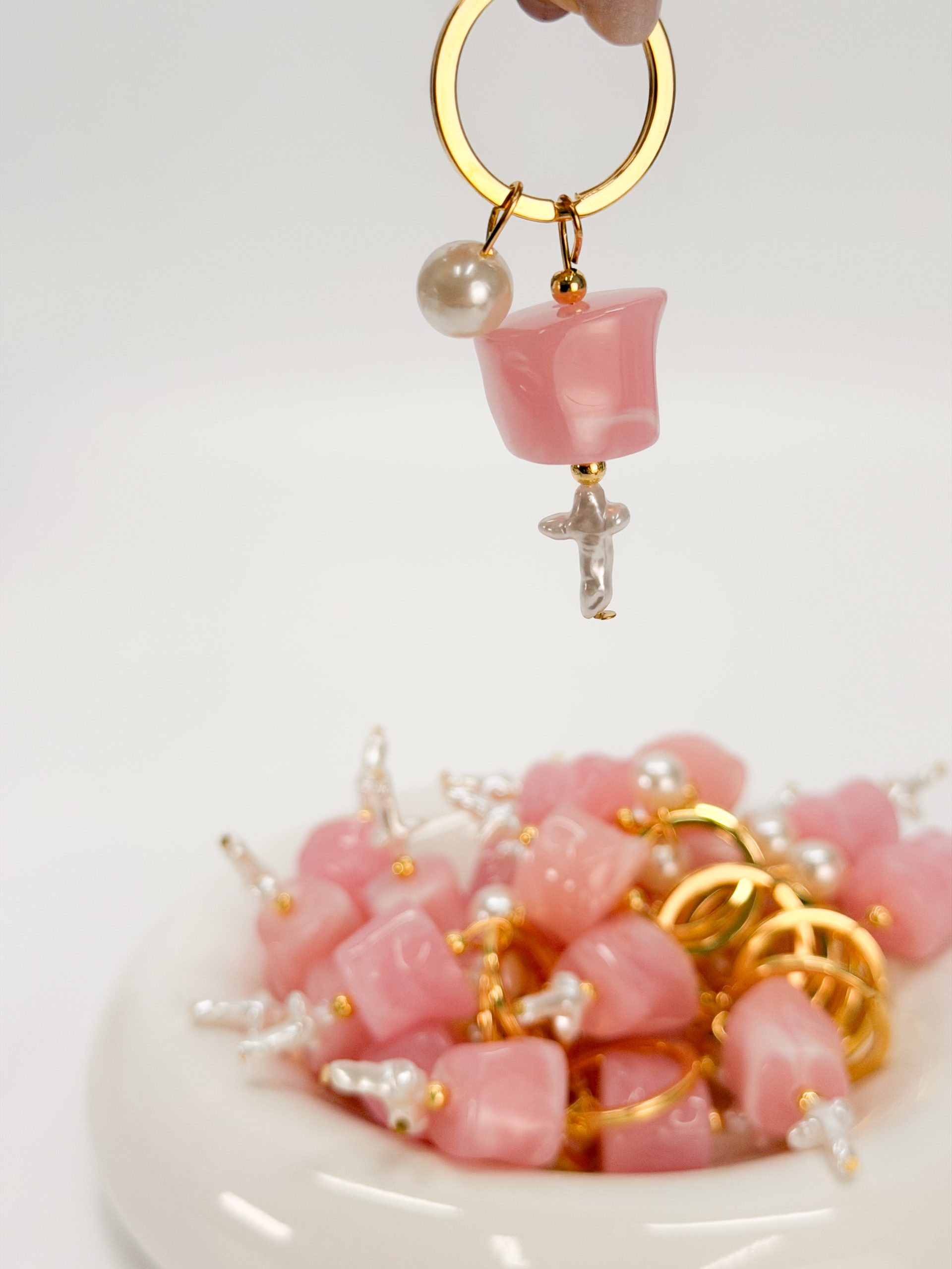 Μαρτυρικό μπρελόκ με ροζ ακρυλική μεγάλη χάντρα, λευκή πέρλα και σταυρό περλέ.