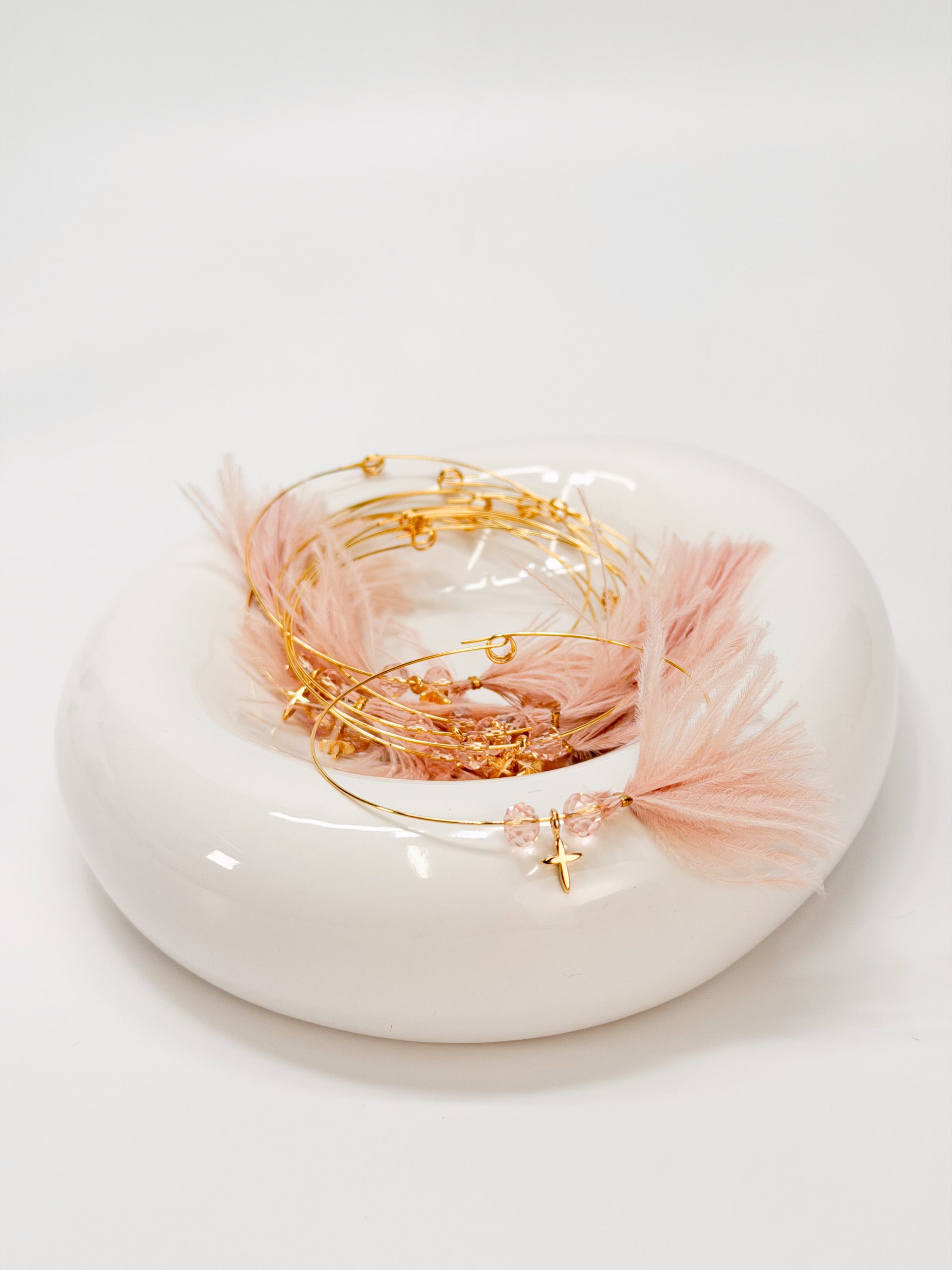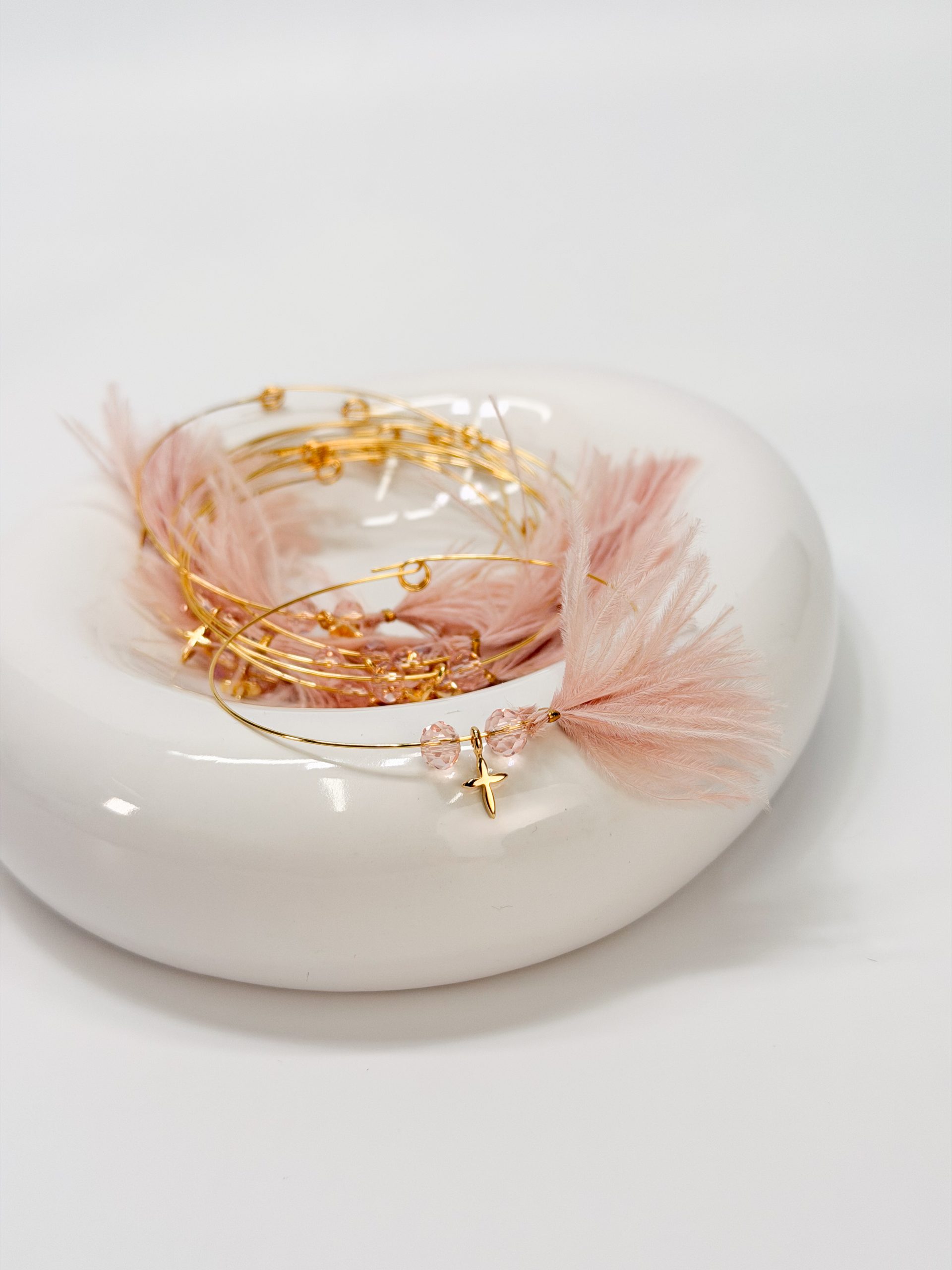 Μαρτυρικό βραχιόλι με memory wire,ροζ κρύσταλλα,επιχρυσωμένο σταυρό και σάπιο μήλο φτερό.