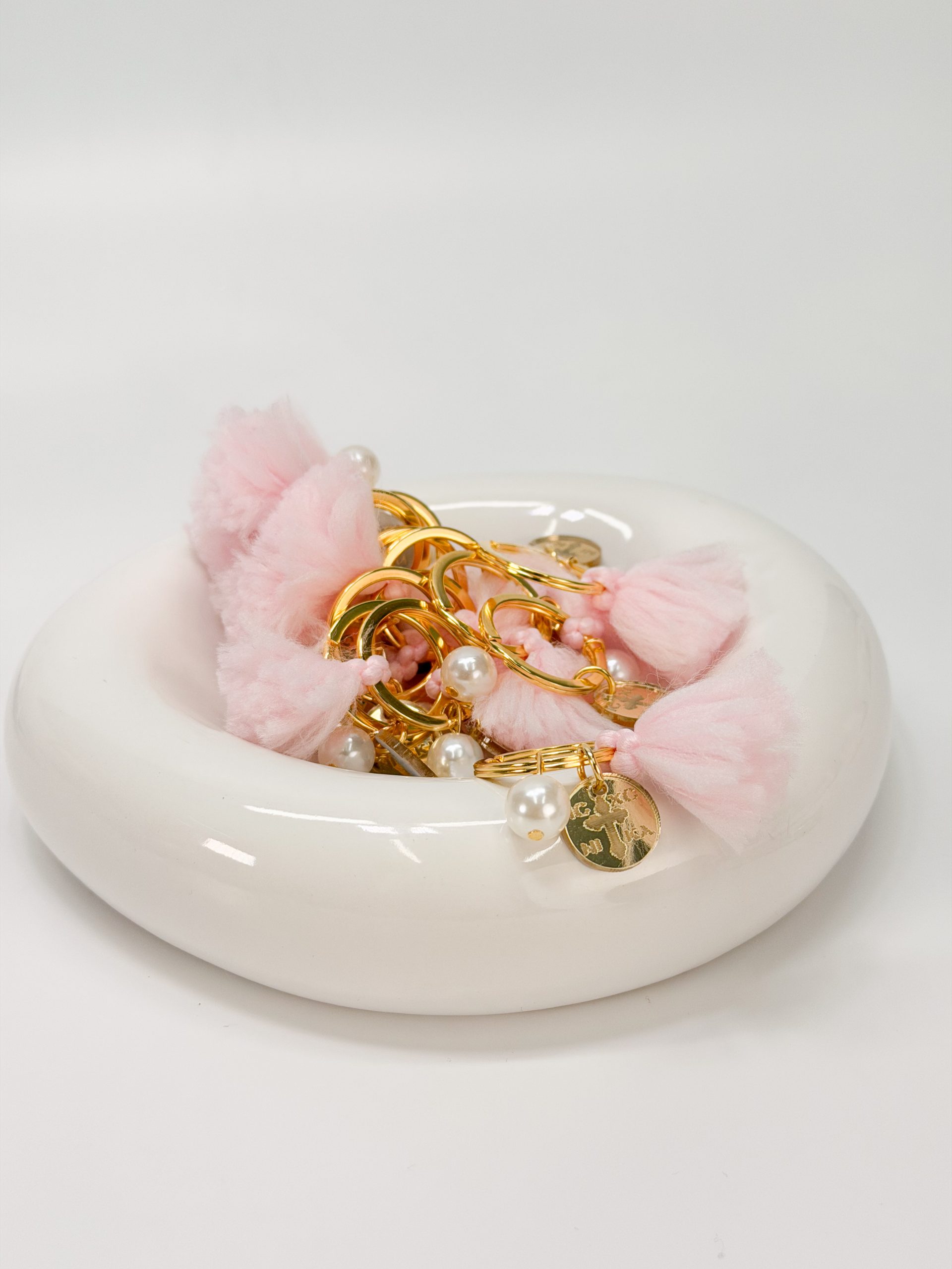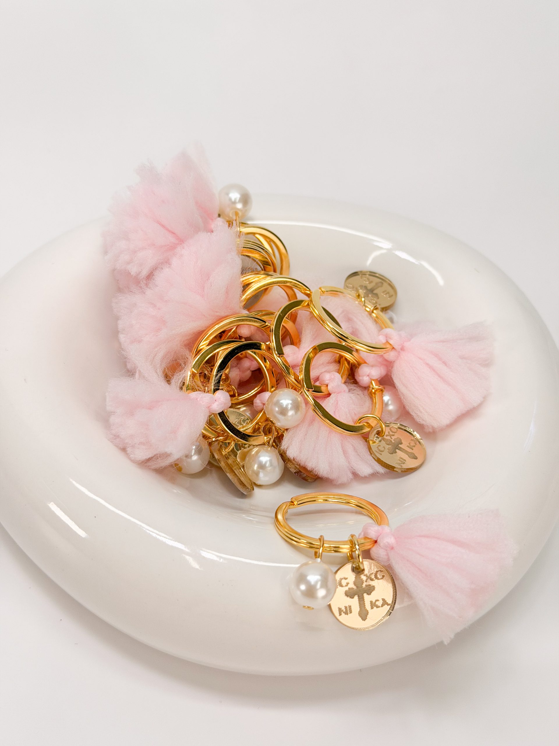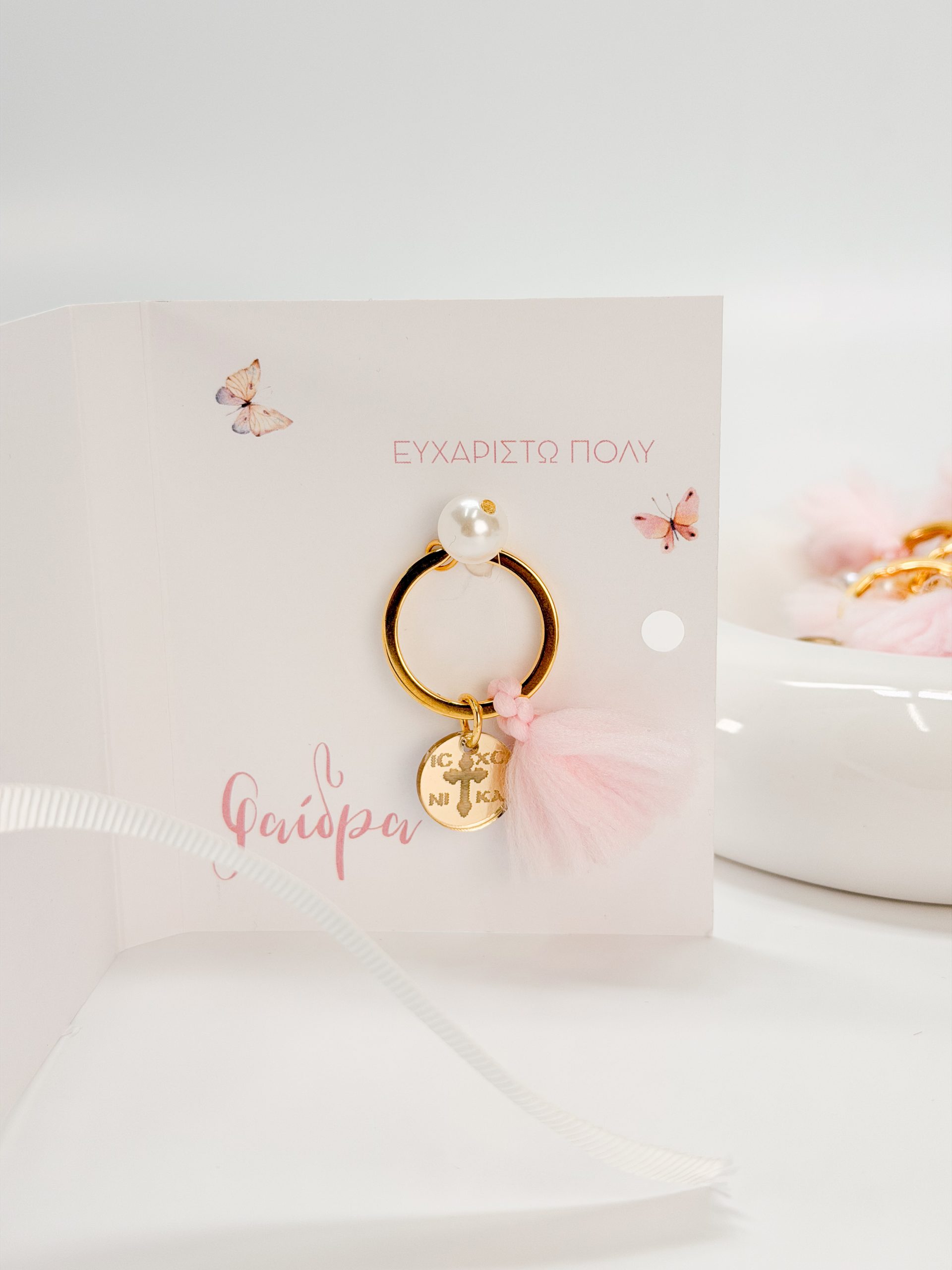 Μαρτυρικό μπρελόκ με ροζ φούντα,πέρλα και σταυρό κωνσταντινάτο plexiglass.