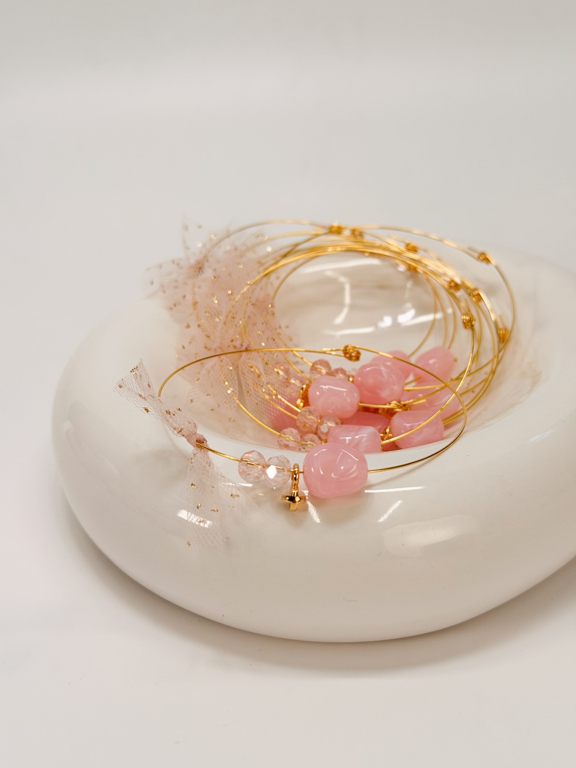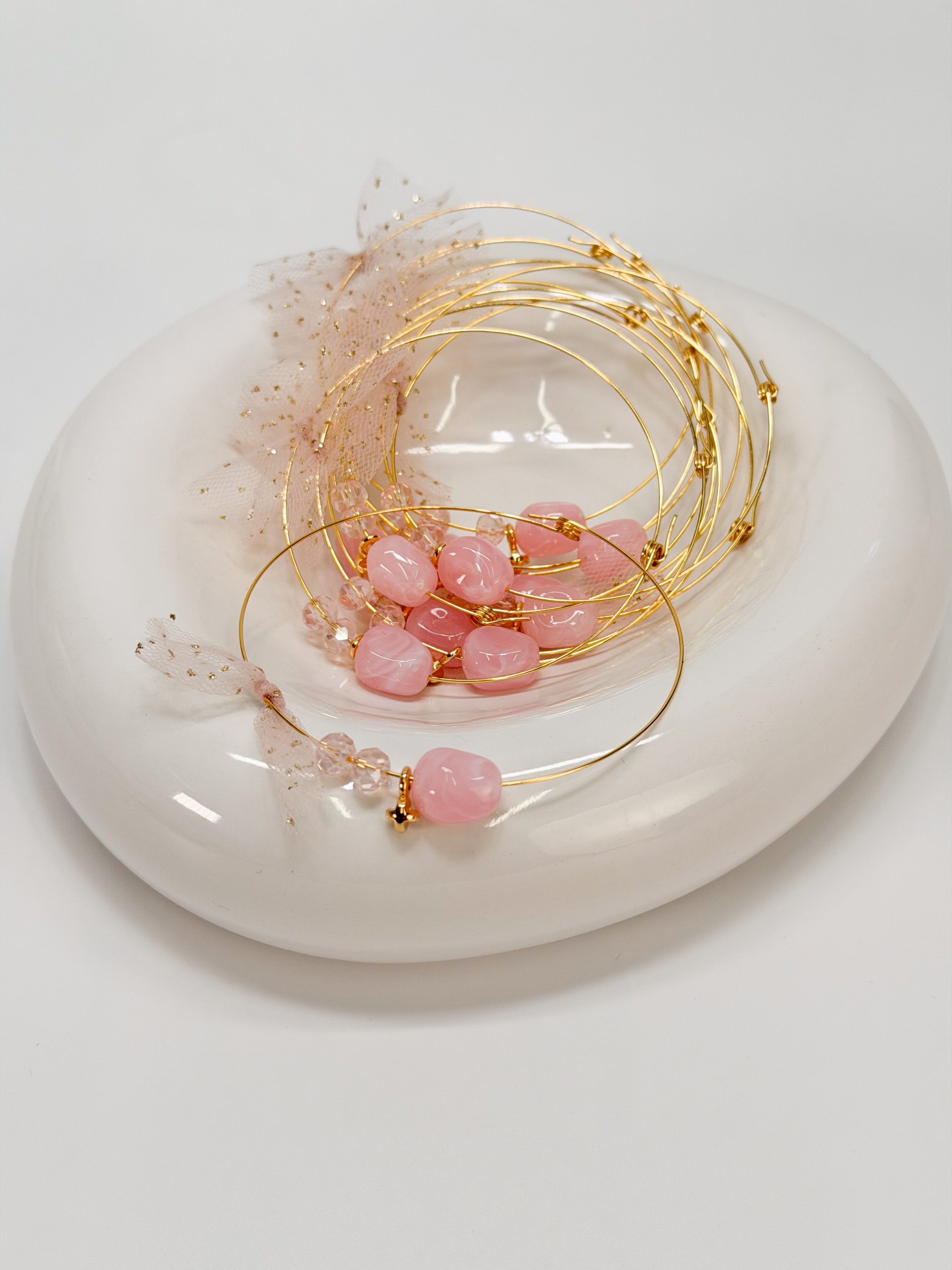 Βραχιόλι μαρτυρικό με memory wire,ροζ χάντρα,κρύσταλλα ροζ, φιογκάκι με δίχρωμη τρέσα ροζ με χρυσα flakes και επιχρυσωμένο σταυρό.