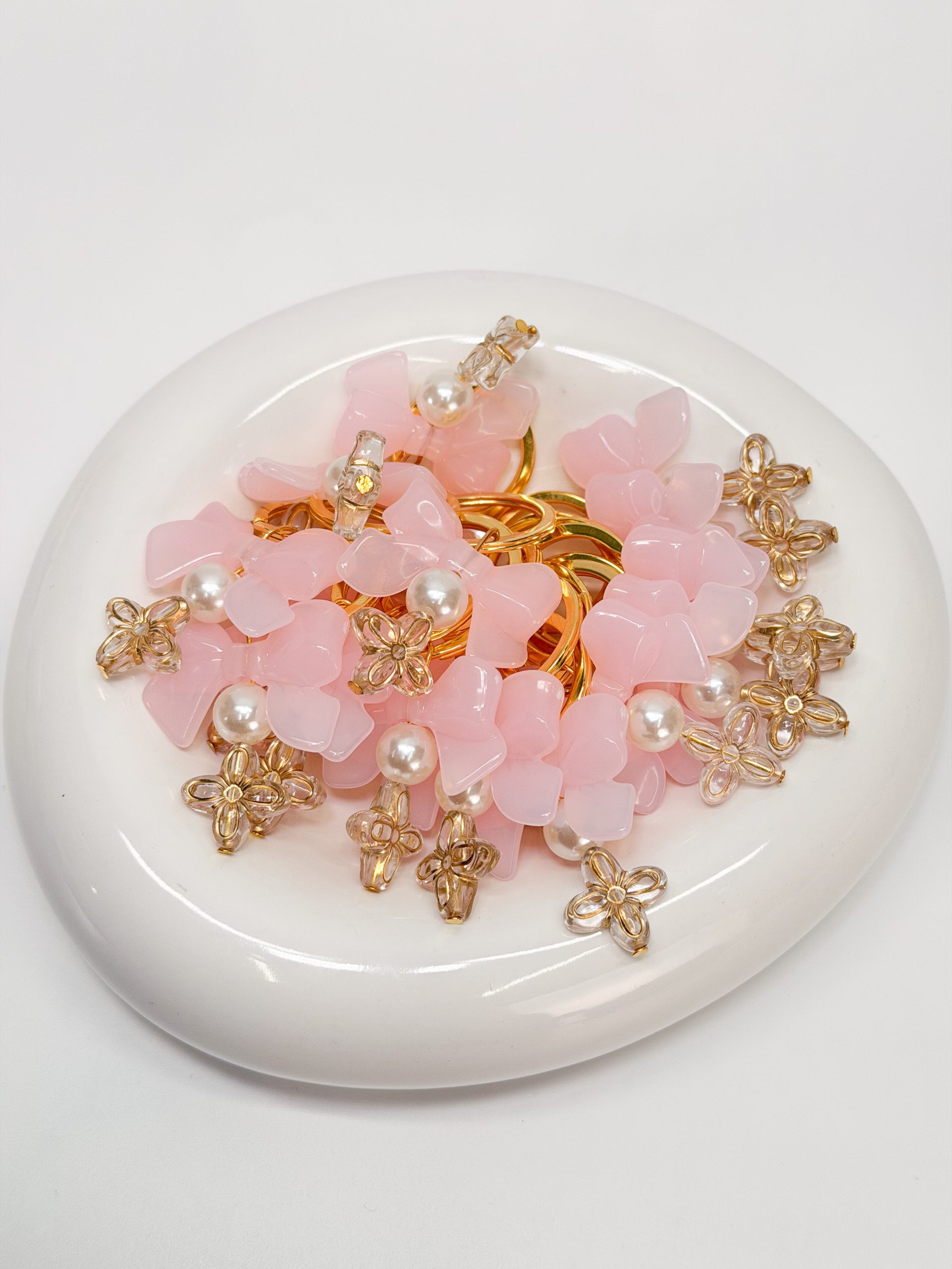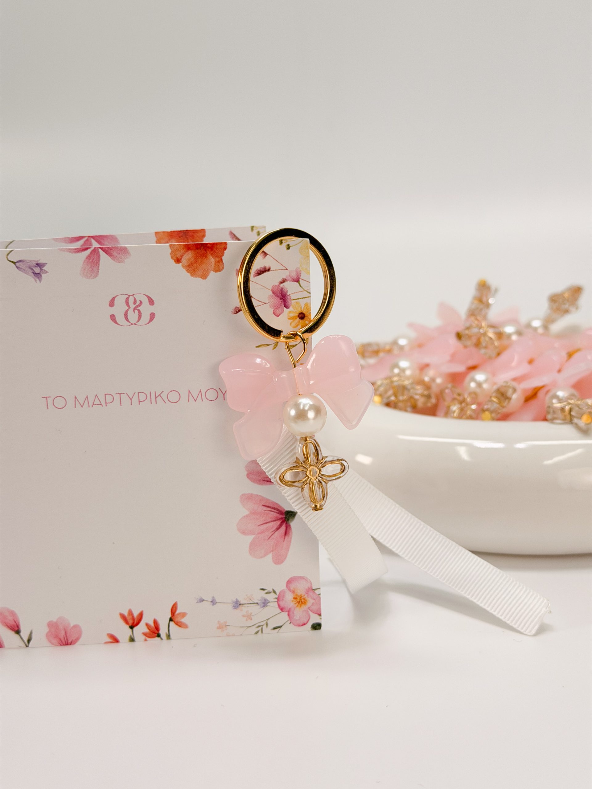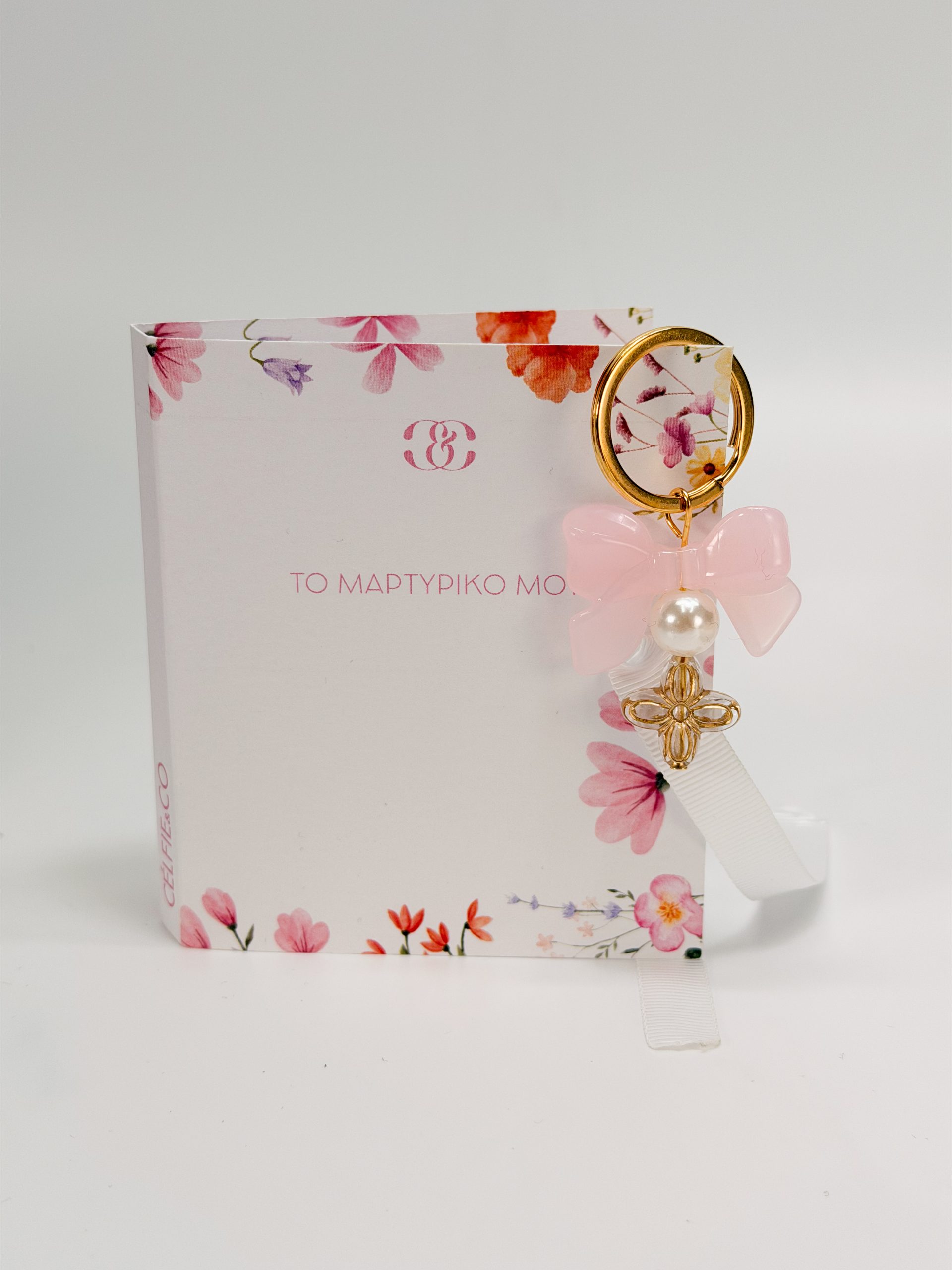 Μαρτυρικό μπρελοκ με χάντρα φιογκάκι,πέρλα και σταυρό σε σχήμα λουλουδιού.